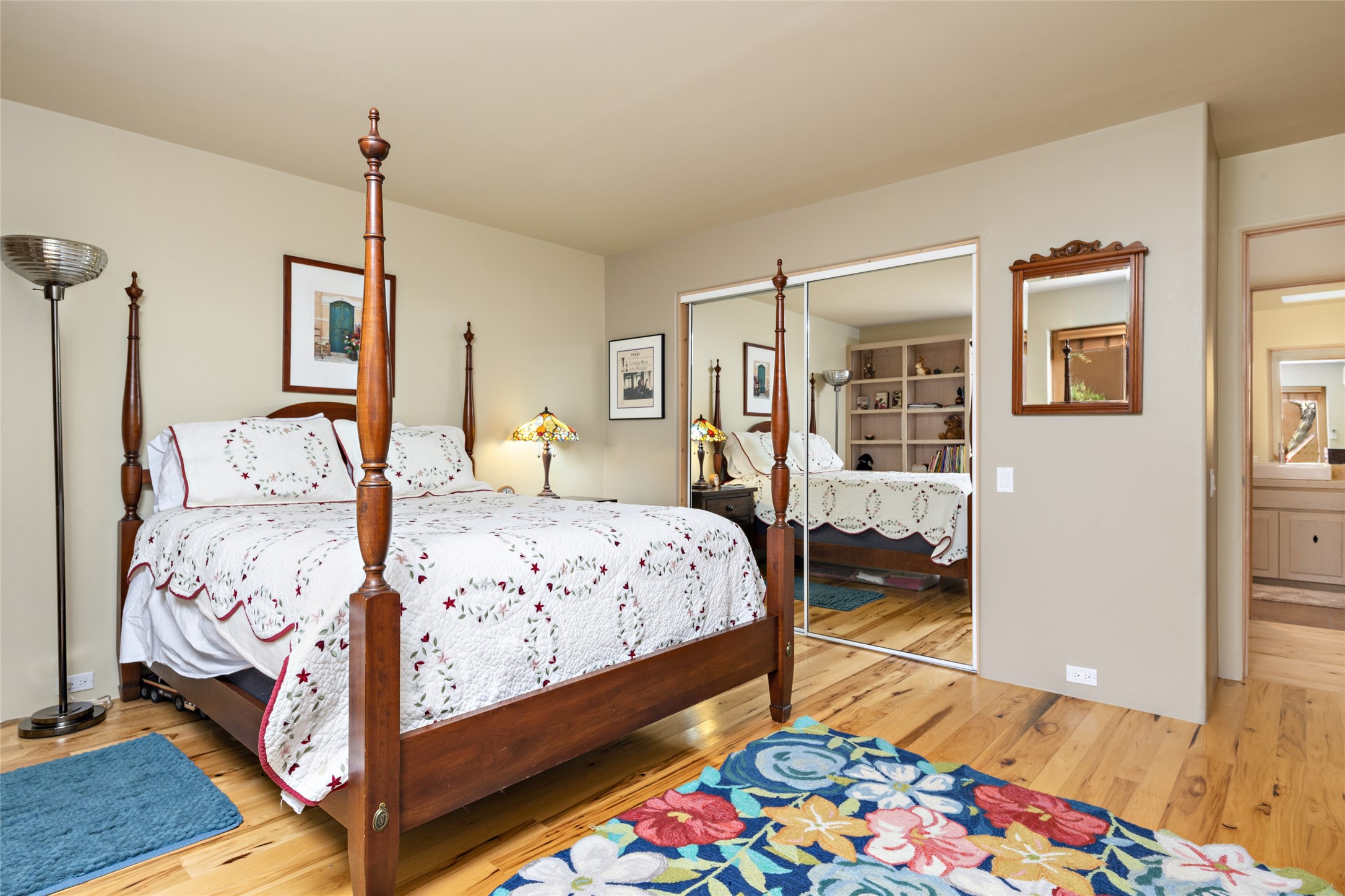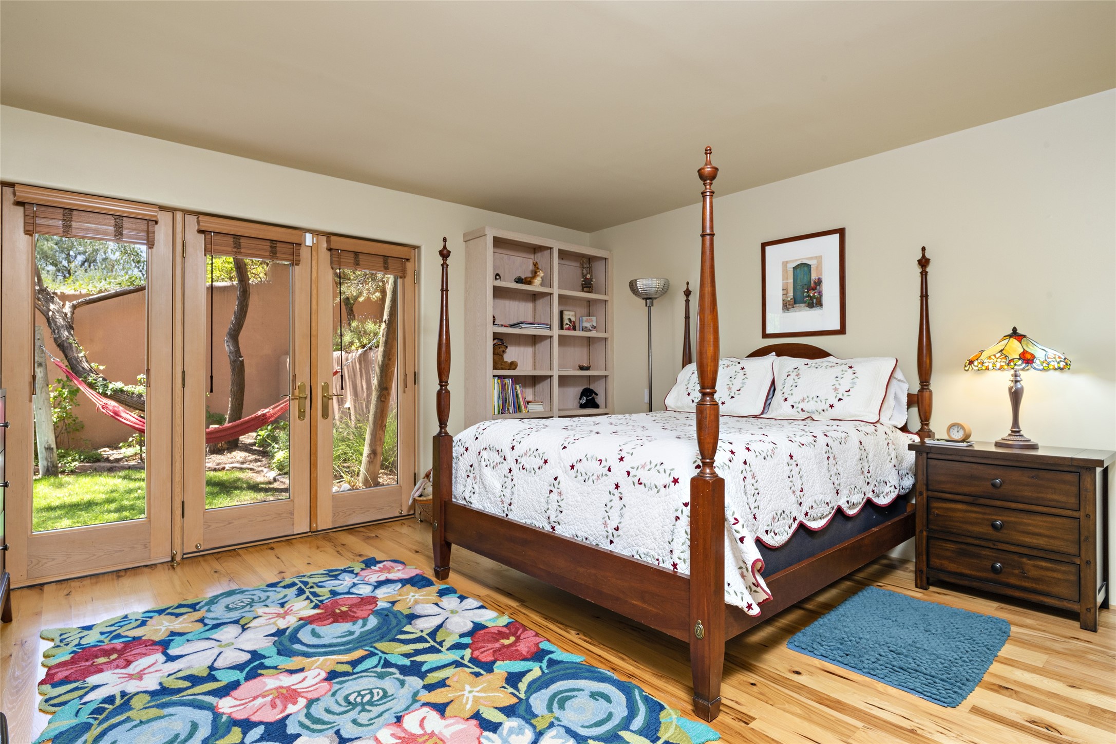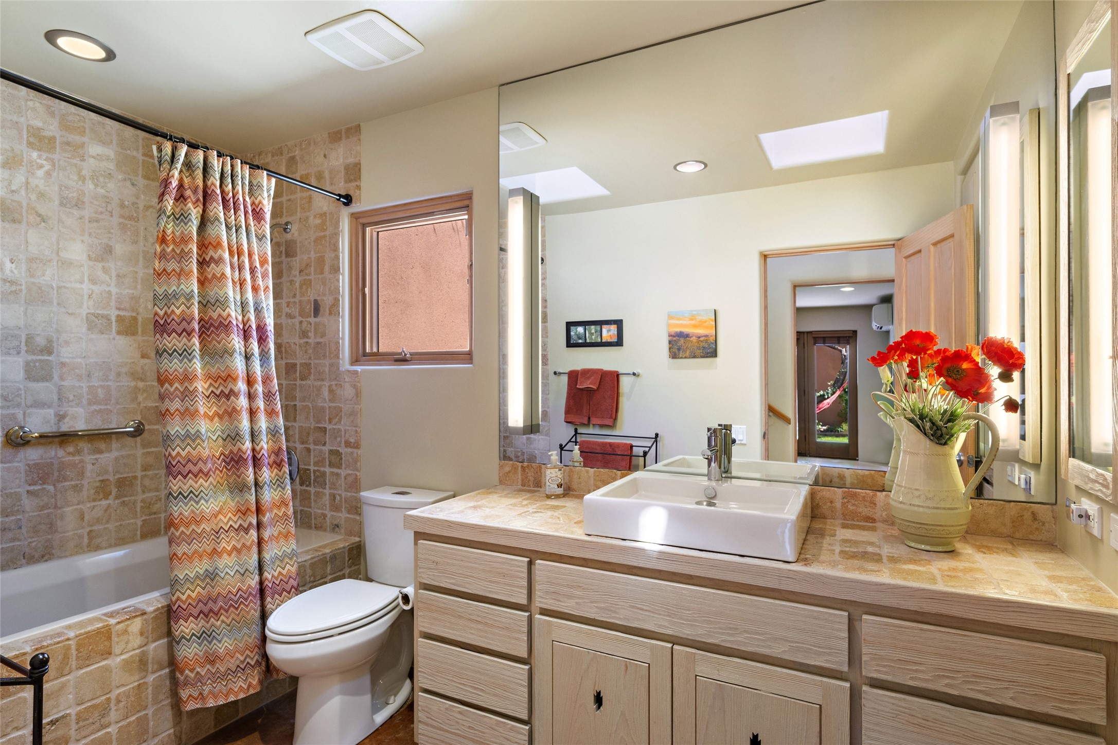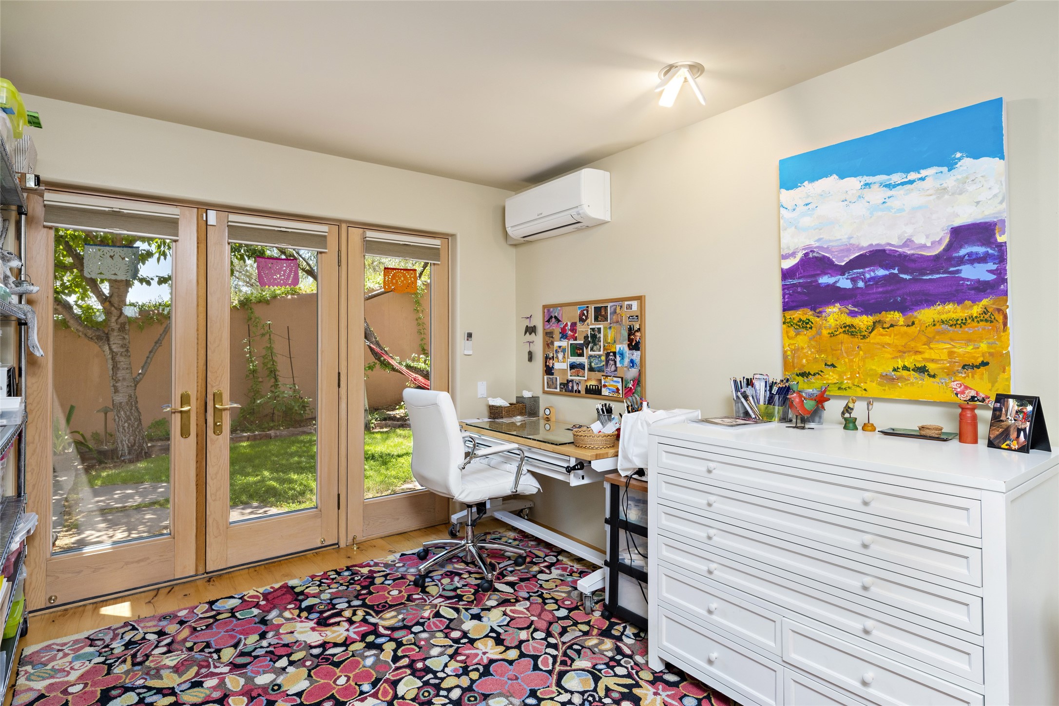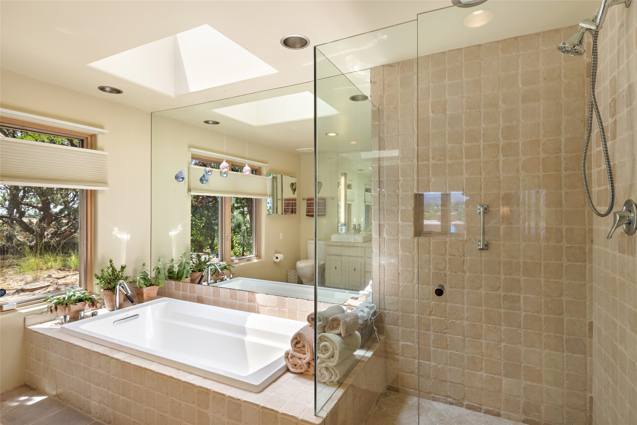 Hold your breath! You will be awed by the views, and enchanted by the gardens of this delightful, in-town property. The house was built by Michael Hurlocker, a Santa Fe builder, as his personal residence. He is well-known for his dedication to high quality design and construction. The light-filled interior is of gracious, ample proportions with many French doors leading to the gardens. Truly a home for easy living and entertaining in the spacious living and dining areas. The room-sized outside portal is pure magic, with grape and wisteria vines overhead and a view to the Sangre de Cristo Mountains to the east. A comfortable bay window seat graces the well-designed kitchen which has lots of counter space and cabinets. The primary suite is quietly situated at the top of the house, with large bedroom and splendid view deck, roomy bathroom and super-big walk-in closet. Two guest bedrooms both have French doors to the outside and are separately located from the main bedroom suite. One is currently used as a studio. And now for the bonus features - A home office with double doors in the main core of the house and a large storage room off the oversized, two-car garage. Landscape lighting has recently been installed and the gardens are on drip and sprinkler irrigation. Conveniently located in Las Lomas subdivision on 0.54 acres, this home is a delight, as also seen in the magical evening photographs!