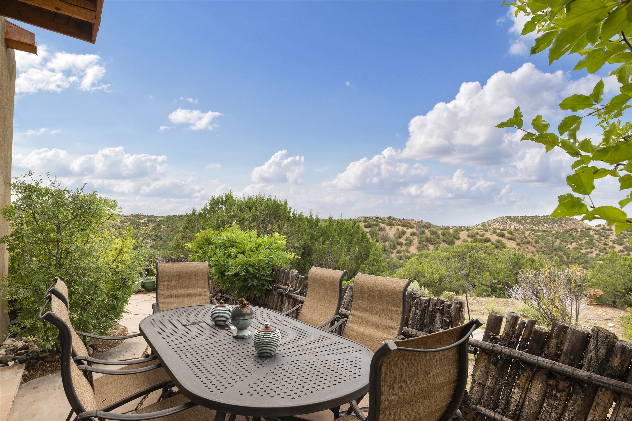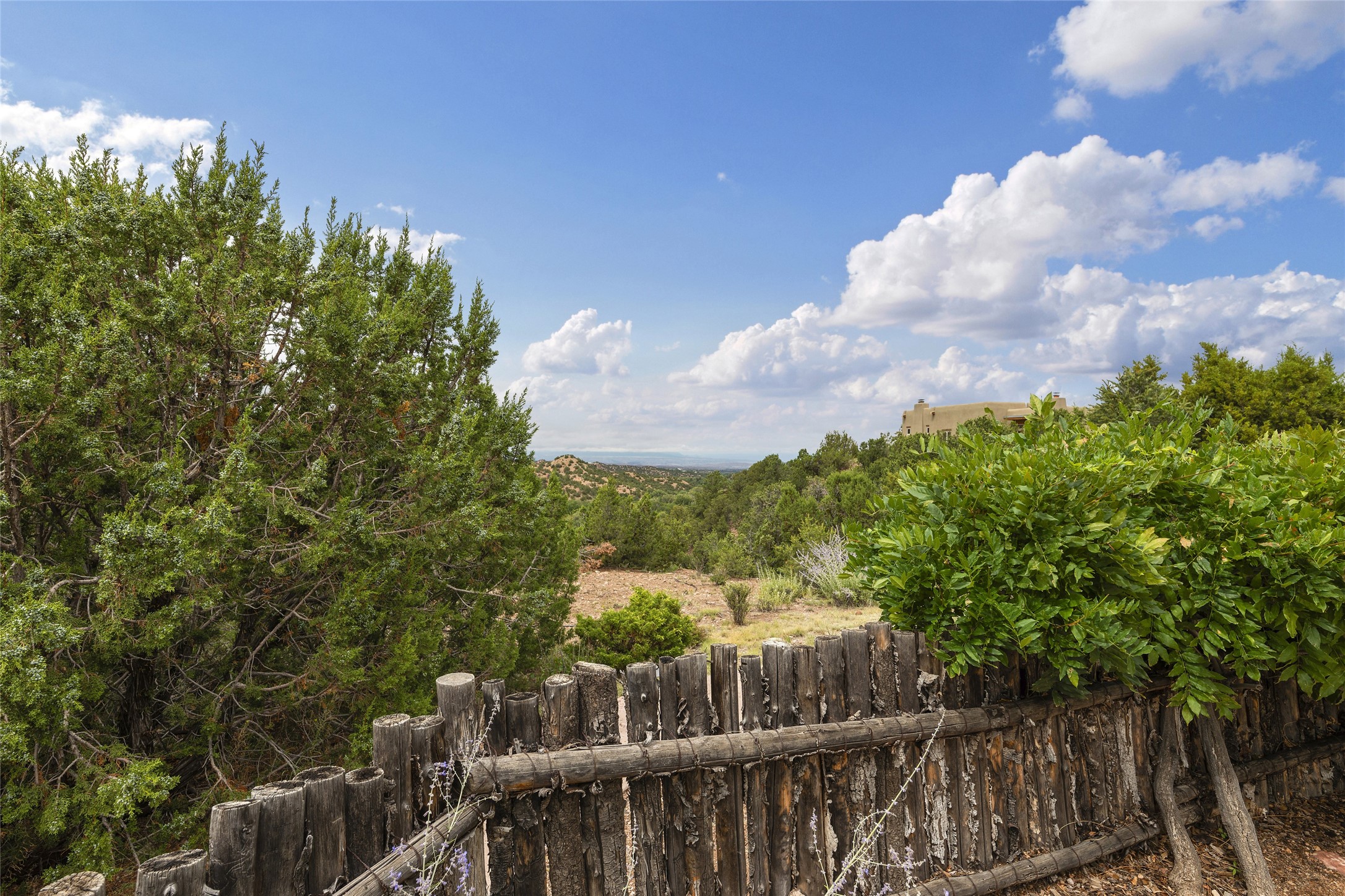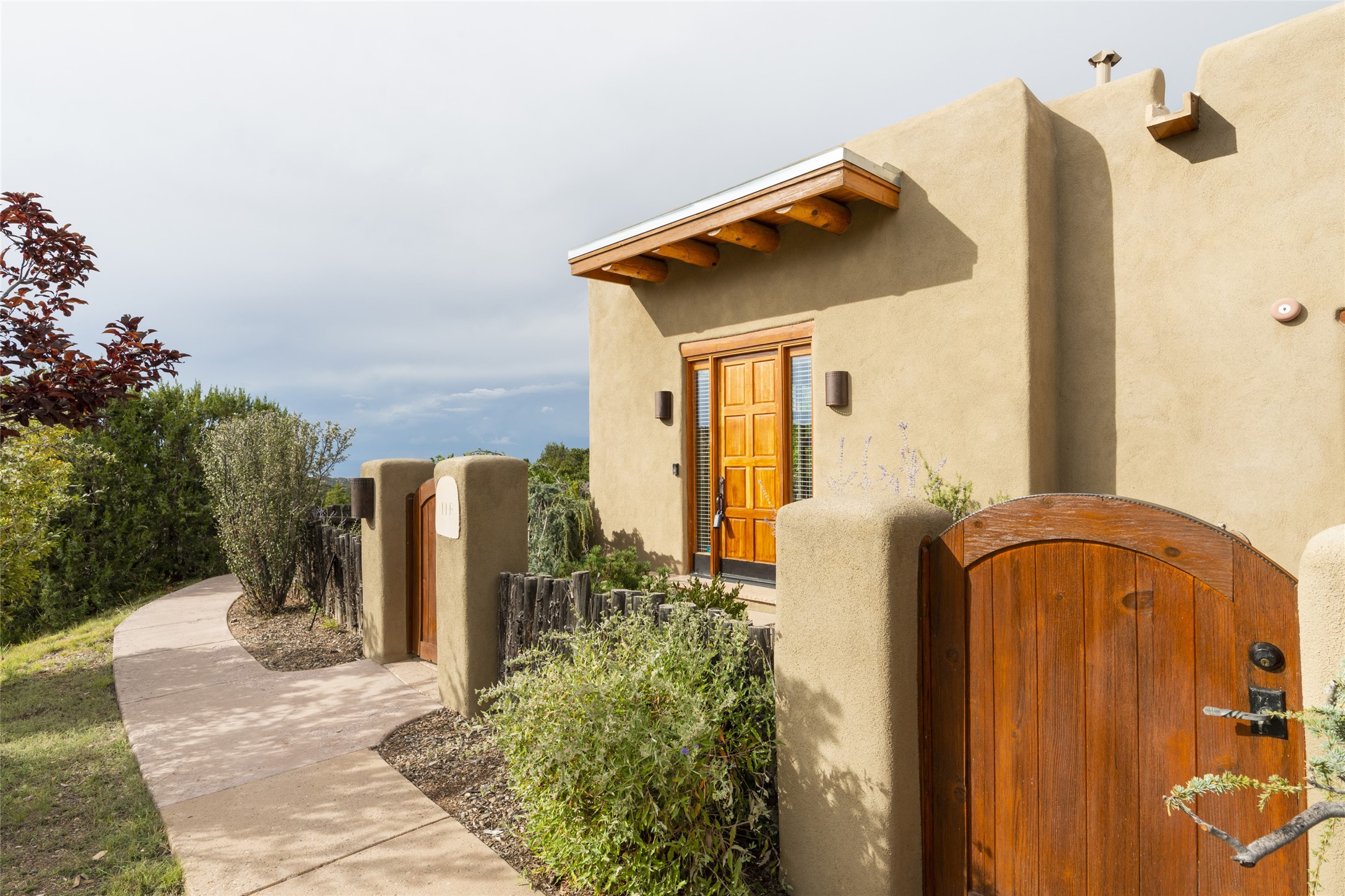 Timeless Santa Fe design, in this Bishop's Lodge Villa, which is currently the only one on the market. Numerous possibilities -full time residence, 2nd home, or vacation rental opportunities. As you walk up to the Villa, from the private gated parking area, you will notice the rolling hills to the east and west. Custom front gate leads to the wrap around coyote fenced courtyards. Spacious outdoor areas with flagstone patios. Oversized front door with grand entry. Living room features include large fireplace with flagstone hearth, built-in custom bookshelves and cabinets, as well as sliding doors that lead to an outdoor patio. Generous U-shaped kitchen with pantry, storage and bar counter seating, ideal for entertaining. Kitchen opens to expansive dining area, with beautiful natural light throughout. Two of the bedroom suites have a kiva fireplace. All 3 bedrooms have private bathrooms and separate outdoor patios. One ensuite has a steam shower and jetted tub. Traditional Santa Fe architectural elements throughout. High ceilings including tongue/groove with beams, corbels, plaster walls, wood & tile flooring, granite countertops, custom doors, and beam trimmed windows. Serene mountain views & lush natural landscaping. Within the cluster of villas is also a private pool. A pristine & charming neighborhood just north of downtown Santa Fe. This very private property, in beautiful Santa Fe is sure to not disappoint. Owners attentiveness to detail has this Villa move-in ready!