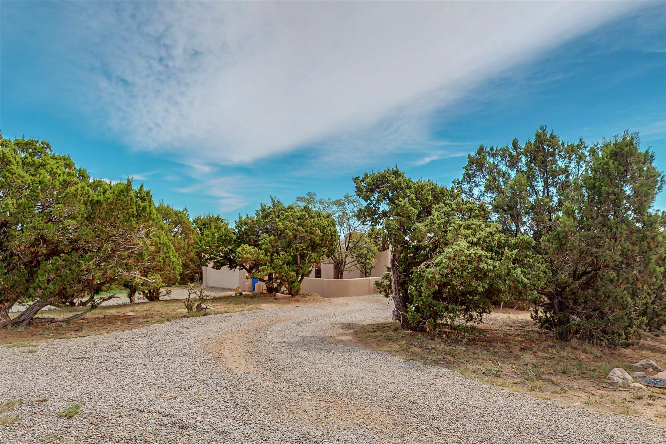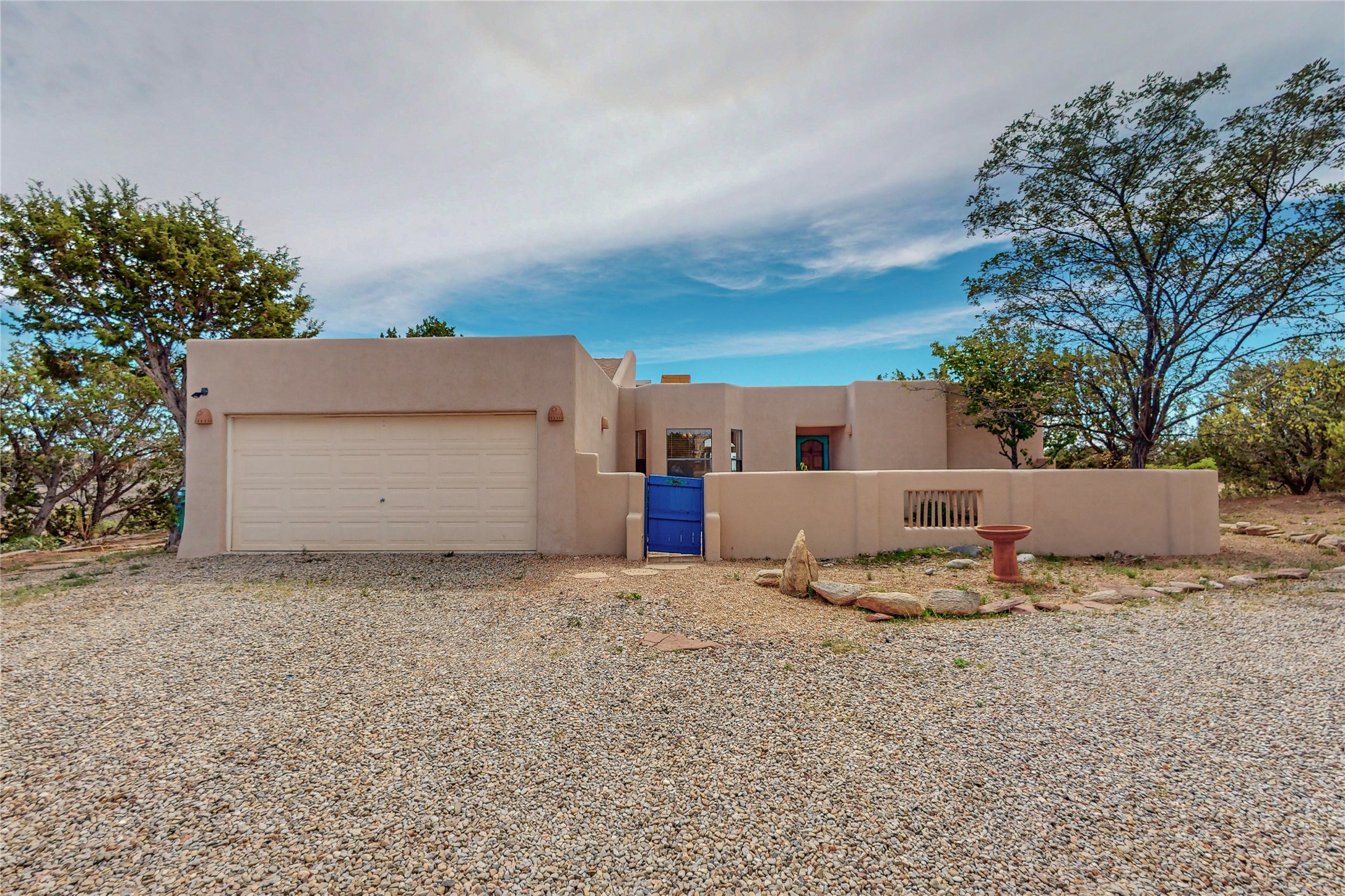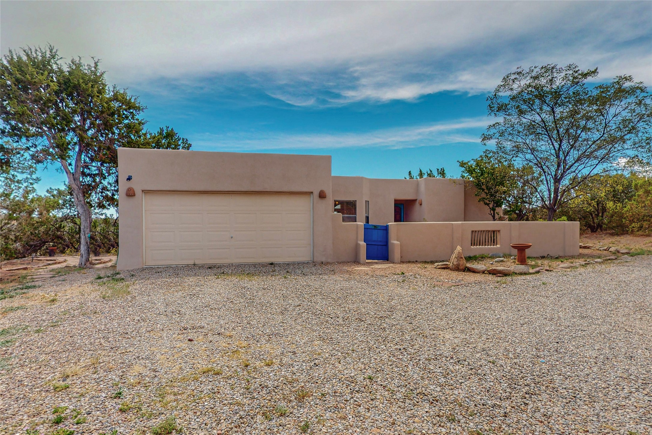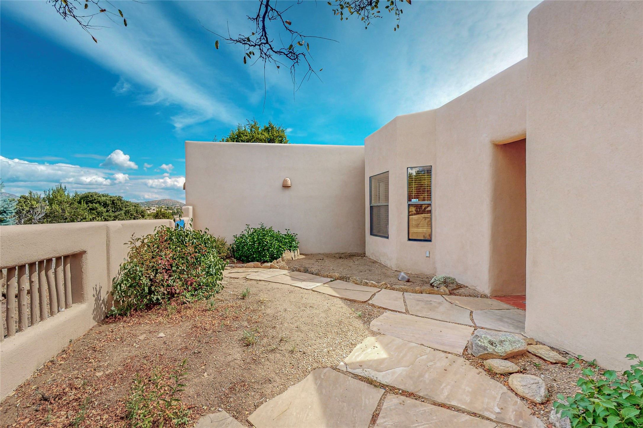 A rare exceptionally semi-private location with no thru streets and minimal ambient noise. Lot backs to a large greenbelt with direct access to social paths and the rail trail. East side of lot borders a retired historic railroad spur that runs between the Santa Fe Railyard and Lamy. The spur and subsequent train cars are occasionally used for slow-roll excursions and Hollywood movie sets (Oppenheimer). The east side of the home also features a flagstone patio with lovely views. The quaint home offers a super bright and light open flow passive solar design with high ceilings adding to spacious feel. Flexible floor plan. Great separation between owner's suite and the 2 guest bedrooms. Livingroom with corner kiva fireplace can be converted back to gas. Freshly painted throughout the interior; the canales, stucco and overhangs newly maintained. All appliances are newer, along with chef sink. New lighting in kitchen, foyer, & bathrooms.Three mini-splits were installed in 2021 for extra heating and cooling. There is a 2-car garage with circular driveway and guest parking. A large wood deck spans the length of the home. All this plus Eldorado amenities, Senior Center, Library, local shopping and only minutes into Santa Fe.