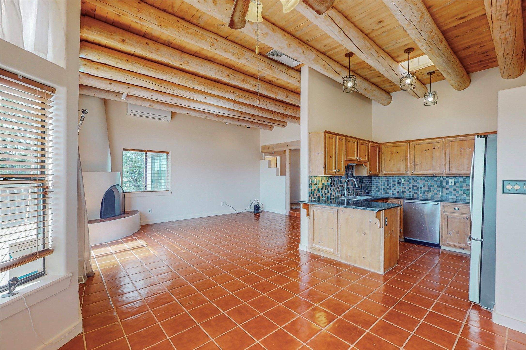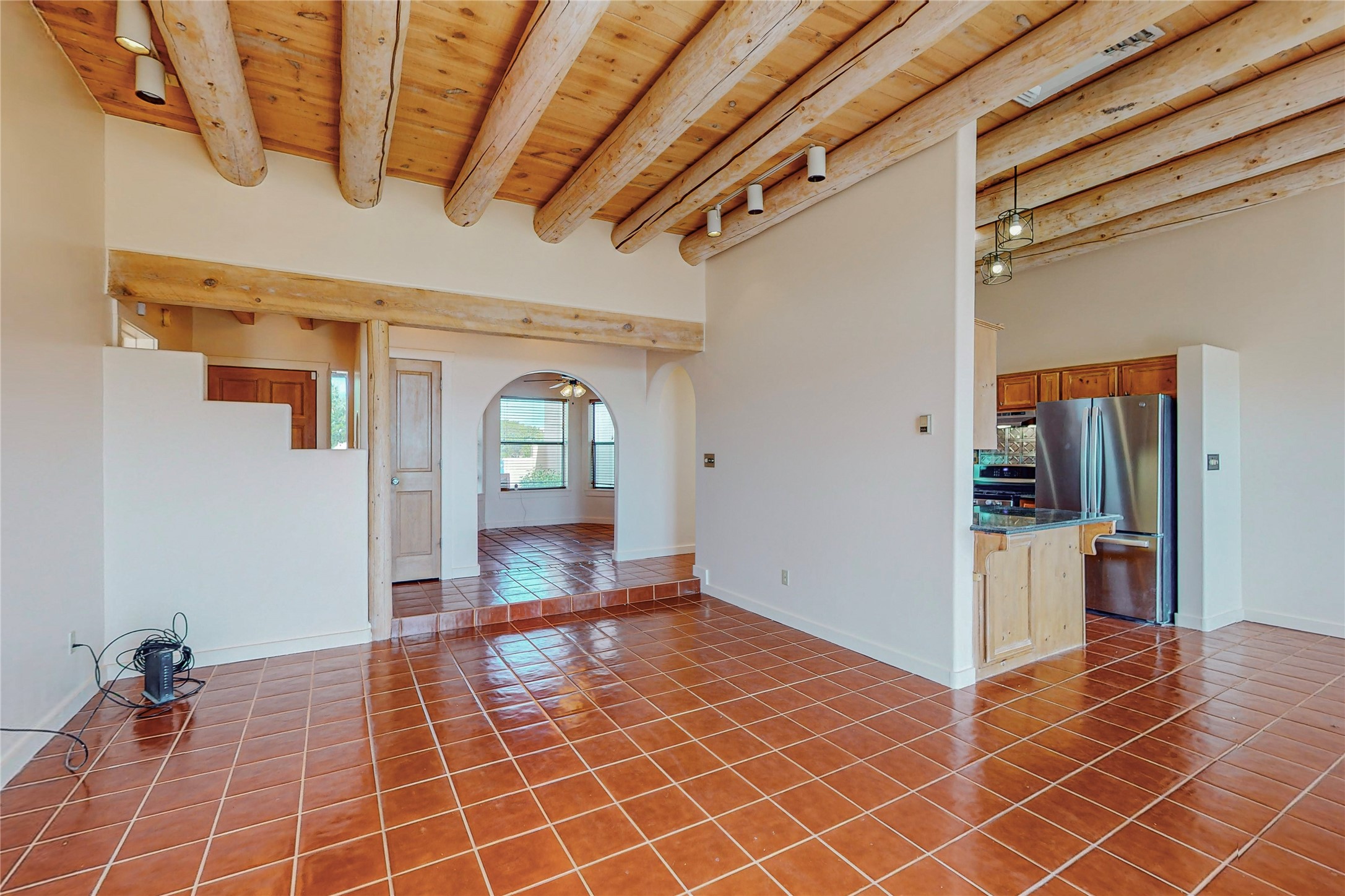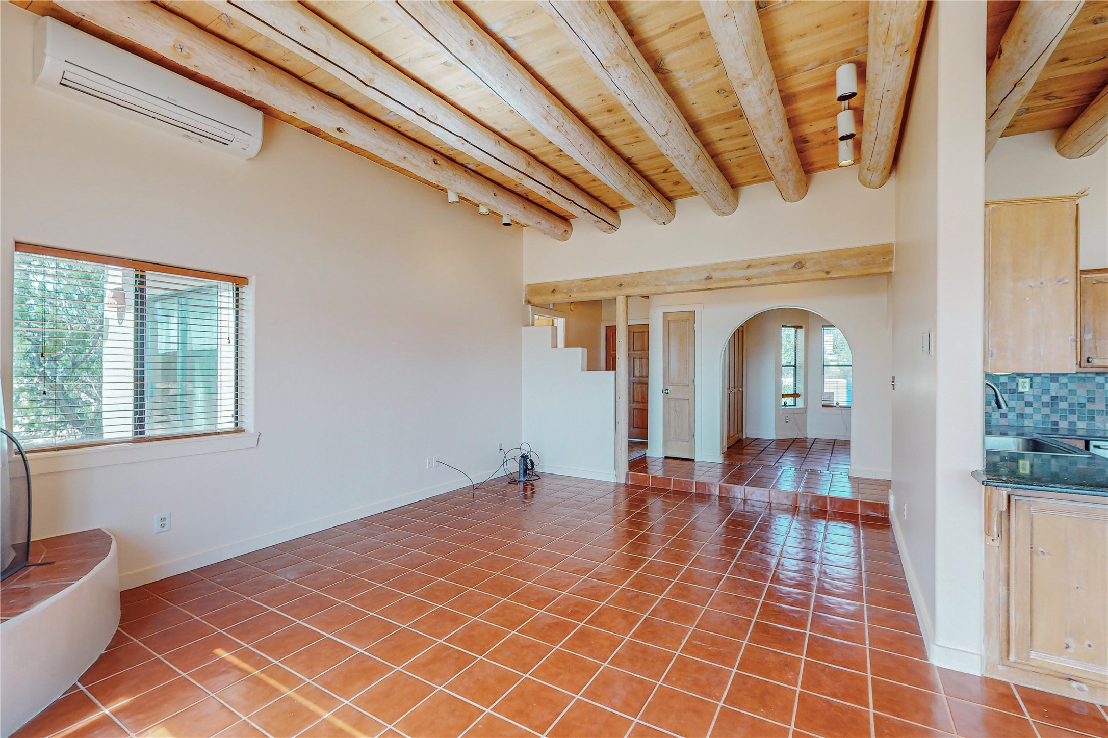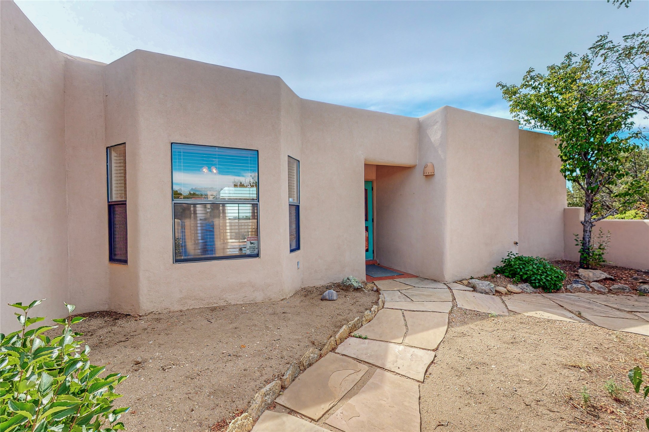 A rare exceptionally semi-private location with no thru streets and minimal ambient noise. Lot backs to a large greenbelt with direct access to social paths and the rail trail. East side of lot borders a retired historic railroad spur that runs between the Santa Fe Railyard and Lamy. The spur and subsequent train cars are occasionally used for slow-roll excursions and Hollywood movie sets (Oppenheimer). The east side of the home also features a flagstone patio with lovely views. The quaint home offers a super bright and light open flow passive solar design with high ceilings adding to spacious feel. Flexible floor plan. Great separation between owner's suite and the 2 guest bedrooms. Livingroom with corner kiva fireplace can be converted back to gas. Freshly painted throughout the interior; the canales, stucco and overhangs newly maintained. All appliances are newer, along with chef sink. New lighting in kitchen, foyer, & bathrooms.Three mini-splits were installed in 2021 for extra heating and cooling. There is a 2-car garage with circular driveway and guest parking. A large wood deck spans the length of the home. All this plus Eldorado amenities, Senior Center, Library, local shopping and only minutes into Santa Fe.