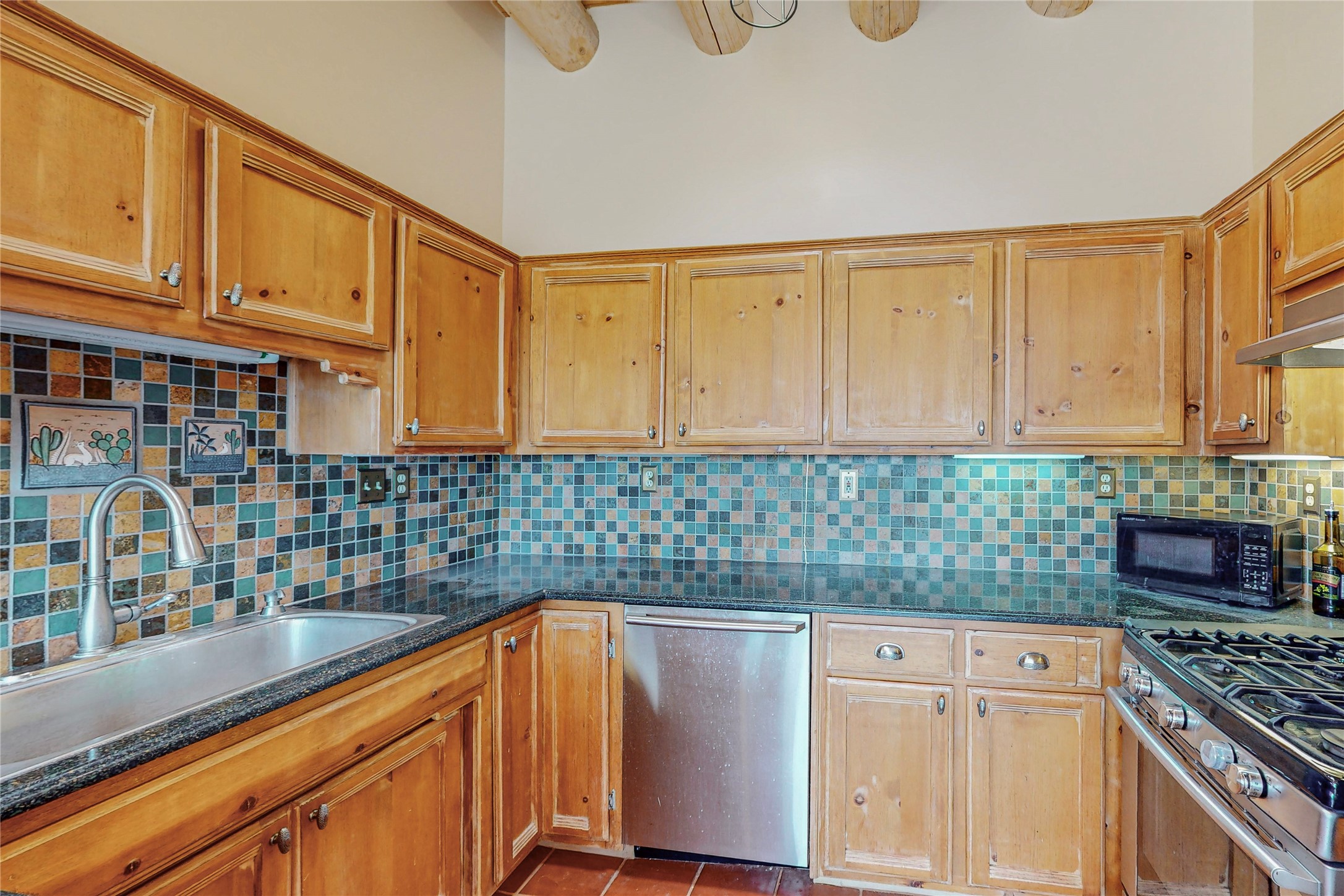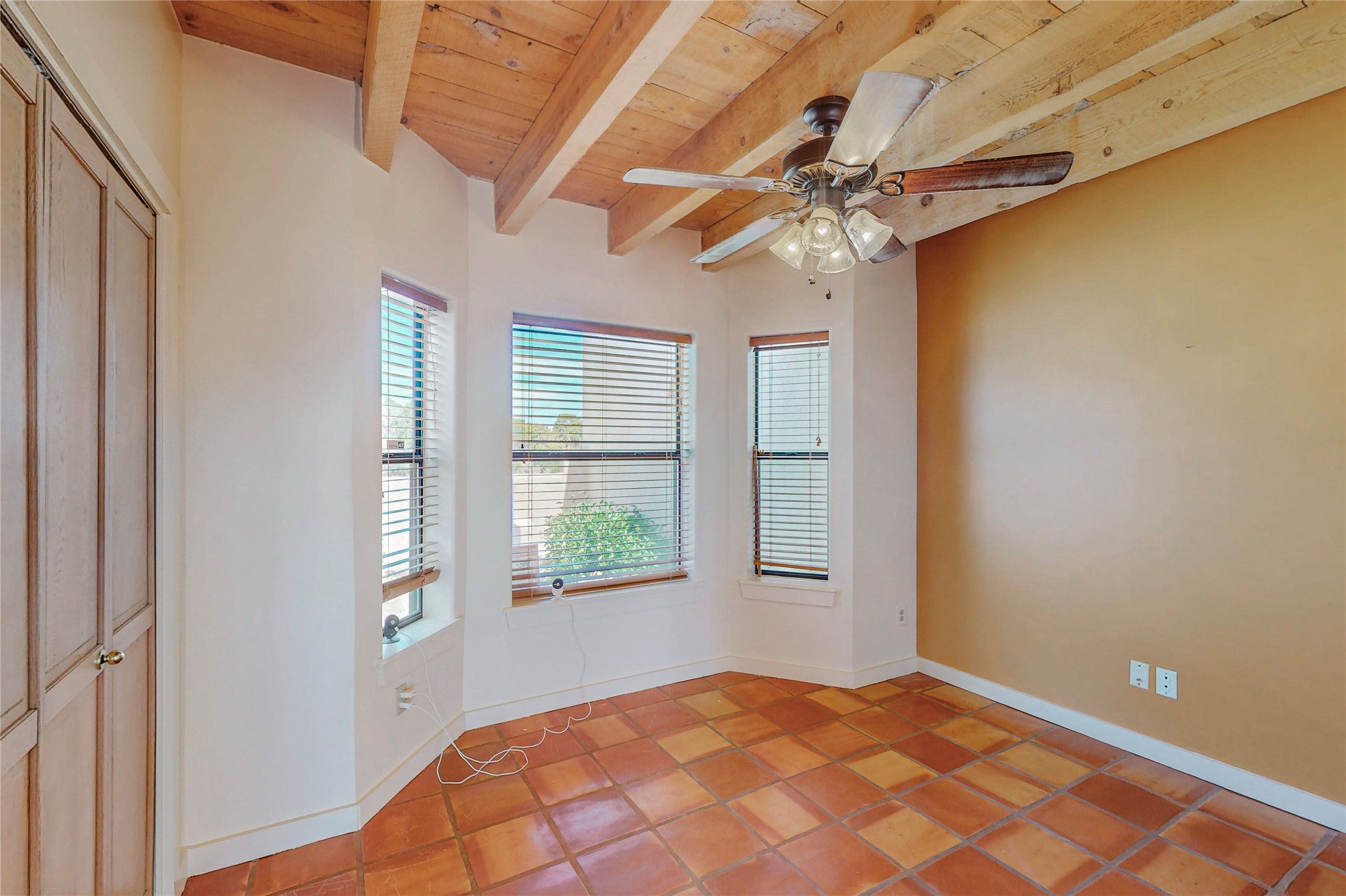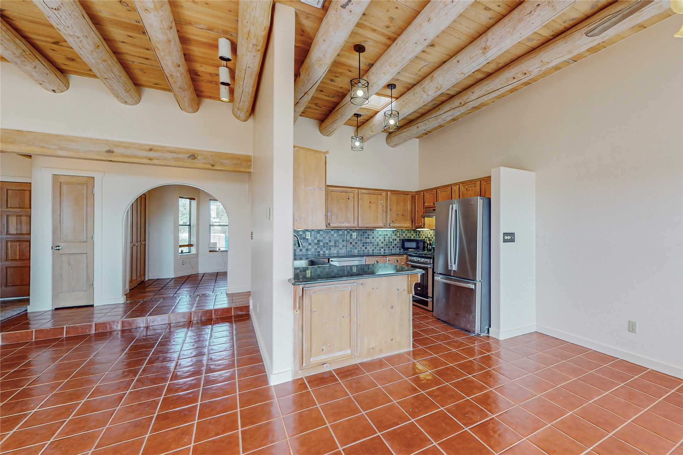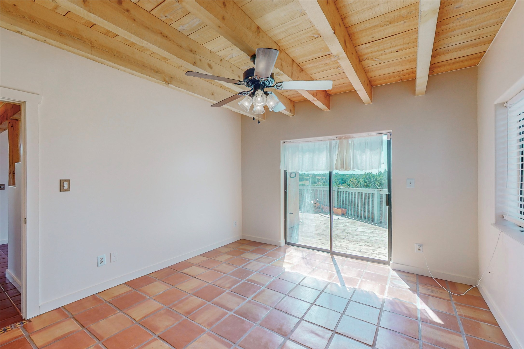 A rare exceptionally semi-private location with no thru streets and minimal ambient noise. Lot backs to a large greenbelt with direct access to social paths and the rail trail. East side of lot borders a retired historic railroad spur that runs between the Santa Fe Railyard and Lamy. The spur and subsequent train cars are occasionally used for slow-roll excursions and Hollywood movie sets (Oppenheimer). The east side of the home also features a flagstone patio with lovely views. The quaint home offers a super bright and light open flow passive solar design with high ceilings adding to spacious feel. Flexible floor plan. Great separation between owner's suite and the 2 guest bedrooms. Livingroom with corner kiva fireplace can be converted back to gas. Freshly painted throughout the interior; the canales, stucco and overhangs newly maintained. All appliances are newer, along with chef sink. New lighting in kitchen, foyer, & bathrooms.Three mini-splits were installed in 2021 for extra heating and cooling. There is a 2-car garage with circular driveway and guest parking. A large wood deck spans the length of the home. All this plus Eldorado amenities, Senior Center, Library, local shopping and only minutes into Santa Fe.