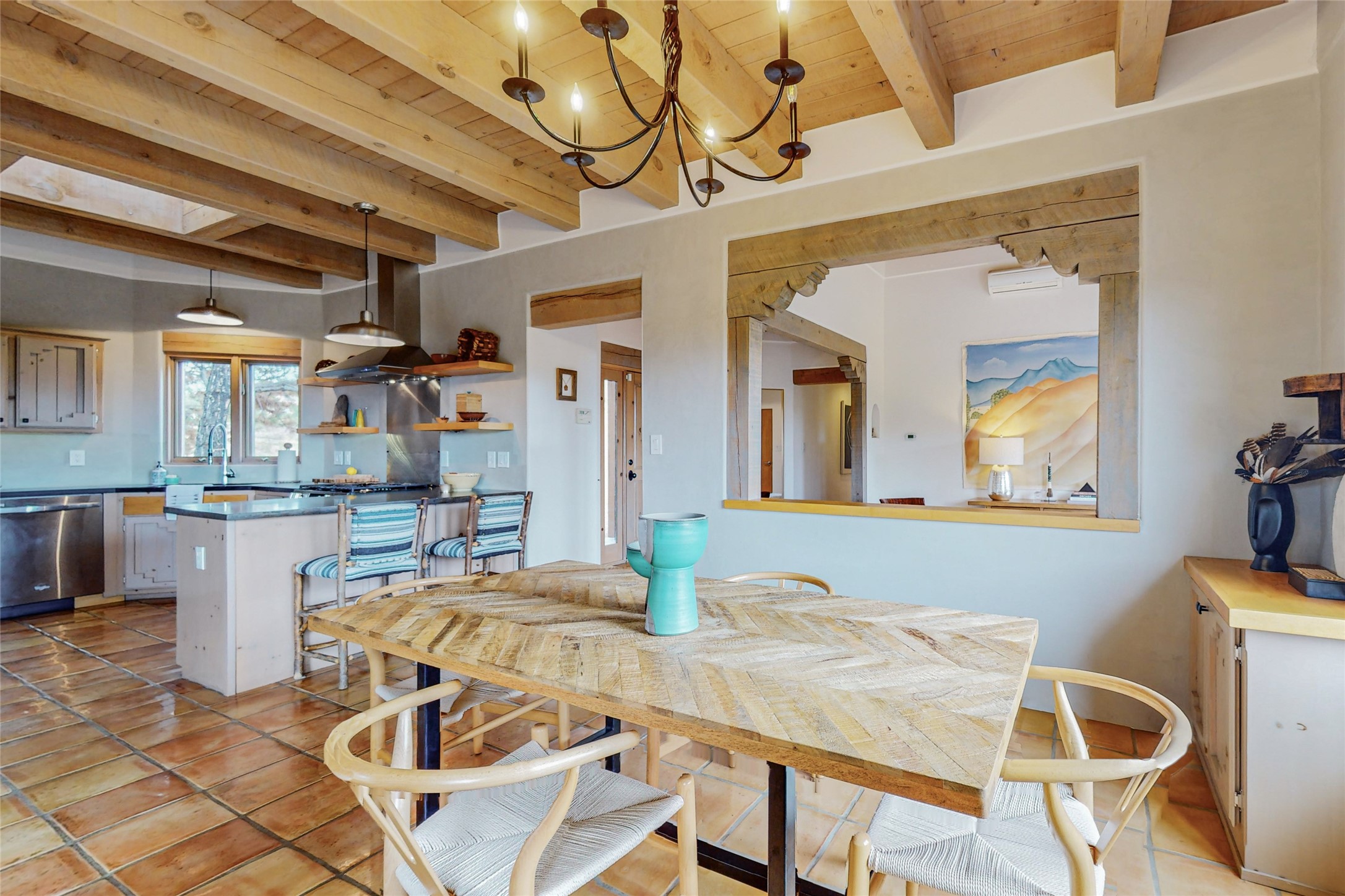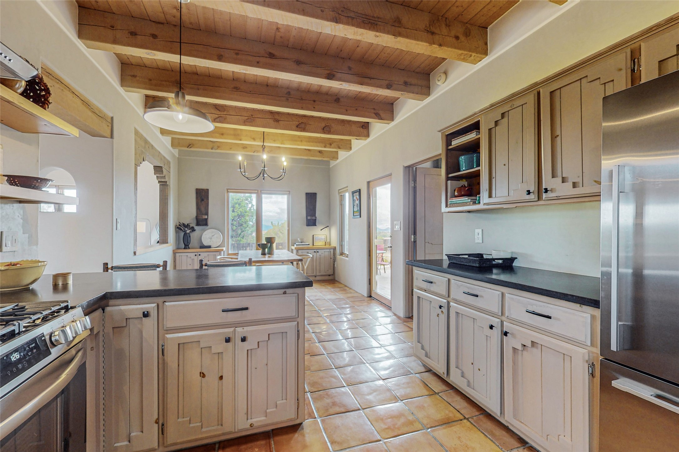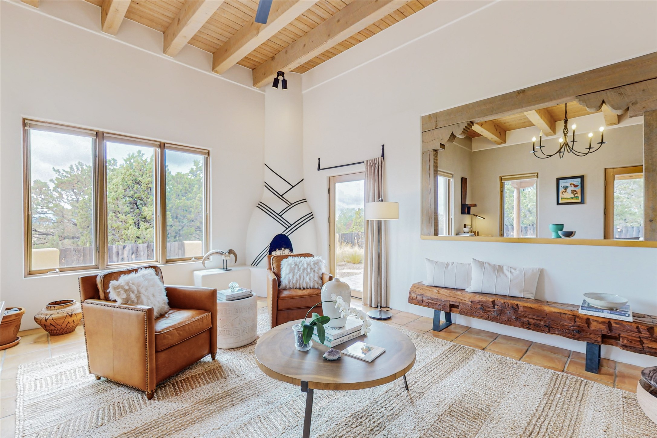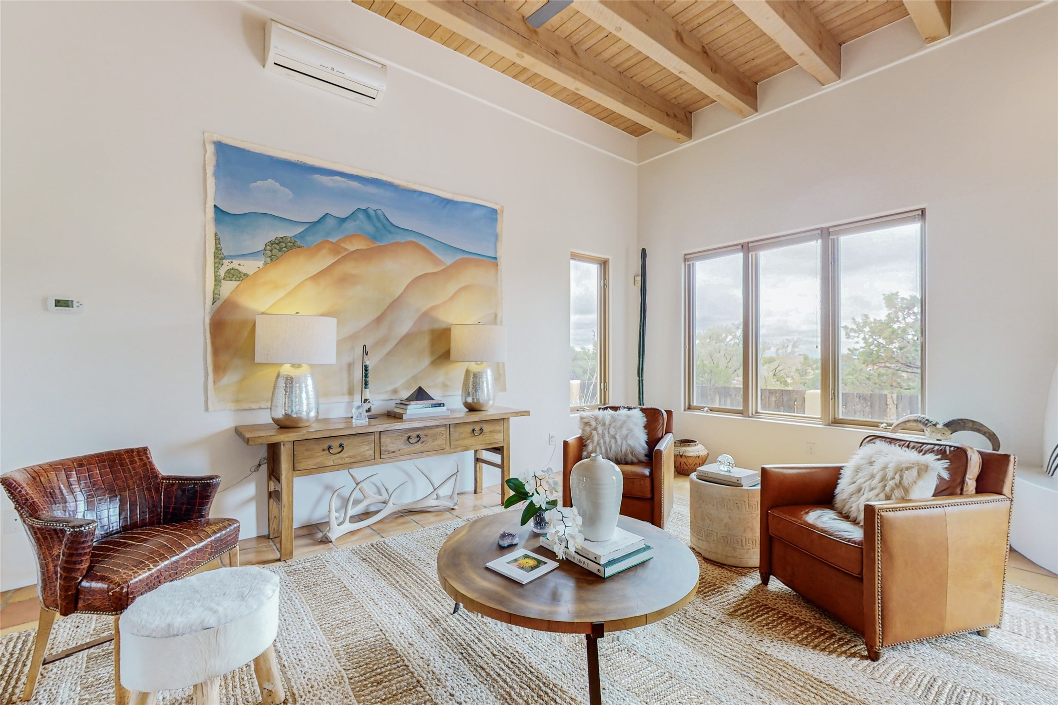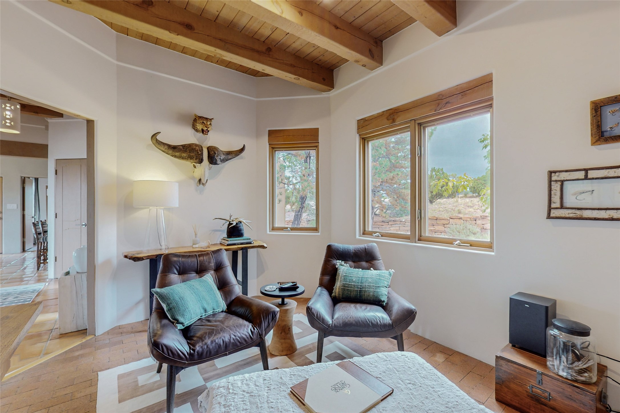 This stunning Eldorado property offers privacy, views and a fabulous floorplan. Just 5 minutes from the Agora center which has shopping and services and 15 minutes from downtown Santa Fe, its ideal location is close to walking trails and the Eldorado fitness facilities. The elevated ceilings feature wood beams in the public spaces as well as the primary bedroom and den. There is warm brick and tile flooring throughout, hand plastered walls in the kitchen / dining and views out of almost every window. The primary suite, which is separate from the guest bedrooms, has direct access to the covered patio, a welcoming 5 fixture bathroom with a Japanese soaking tub and a real walk-in closet. Many updates and custom touches abound including exterior metal gates, outdoor sconce lighting and the hand painted kiva fireplace. There are brand new and slightly used appliances in the kitchen as well as custom concrete countertops and a generous pantry! Luxuriate outside under a well-lit covered patio that offers beautiful views towards the Ortiz and Sandia mountain ranges and ample space for entertaining. With 6 years left on a transferrable roof warranty, in-floor radiant heat, a cozy den / 4th bedroom plus an oversized 2 car garage, this property leaves little to be desired. Come see how high design in the high desert can elevate your lifestyle!