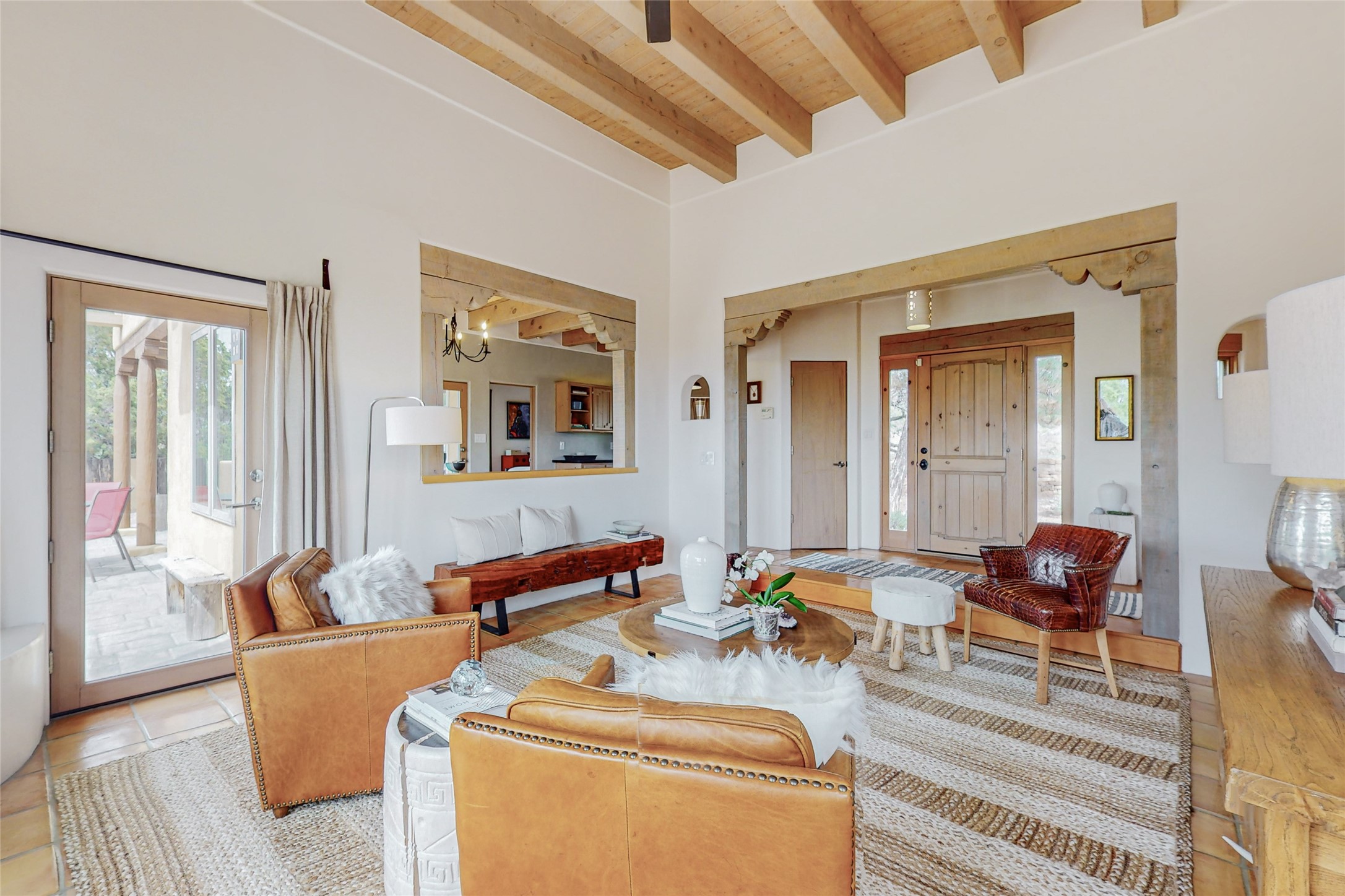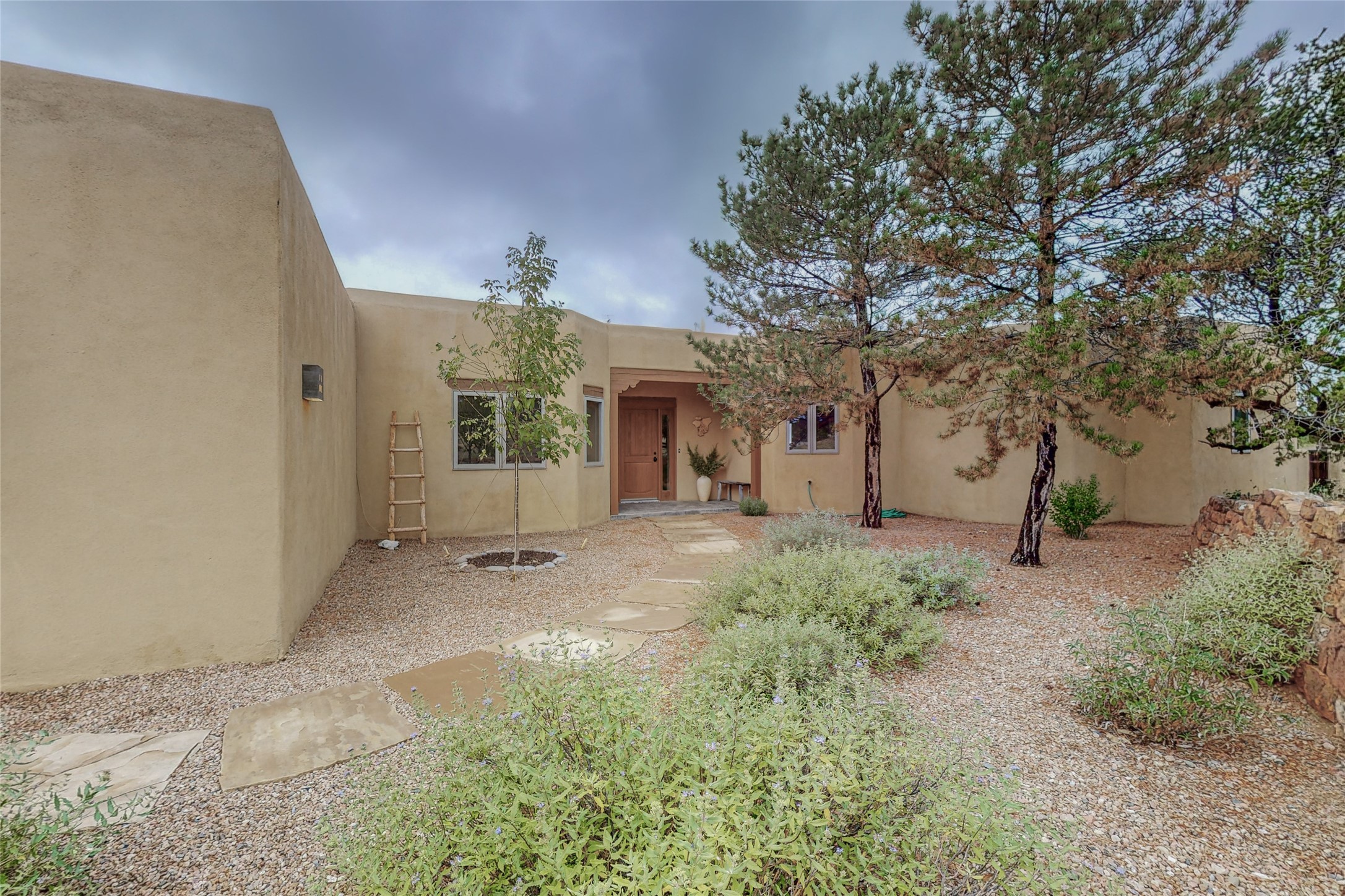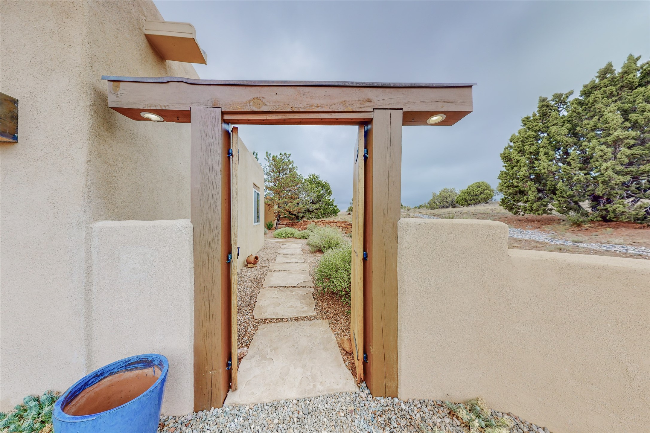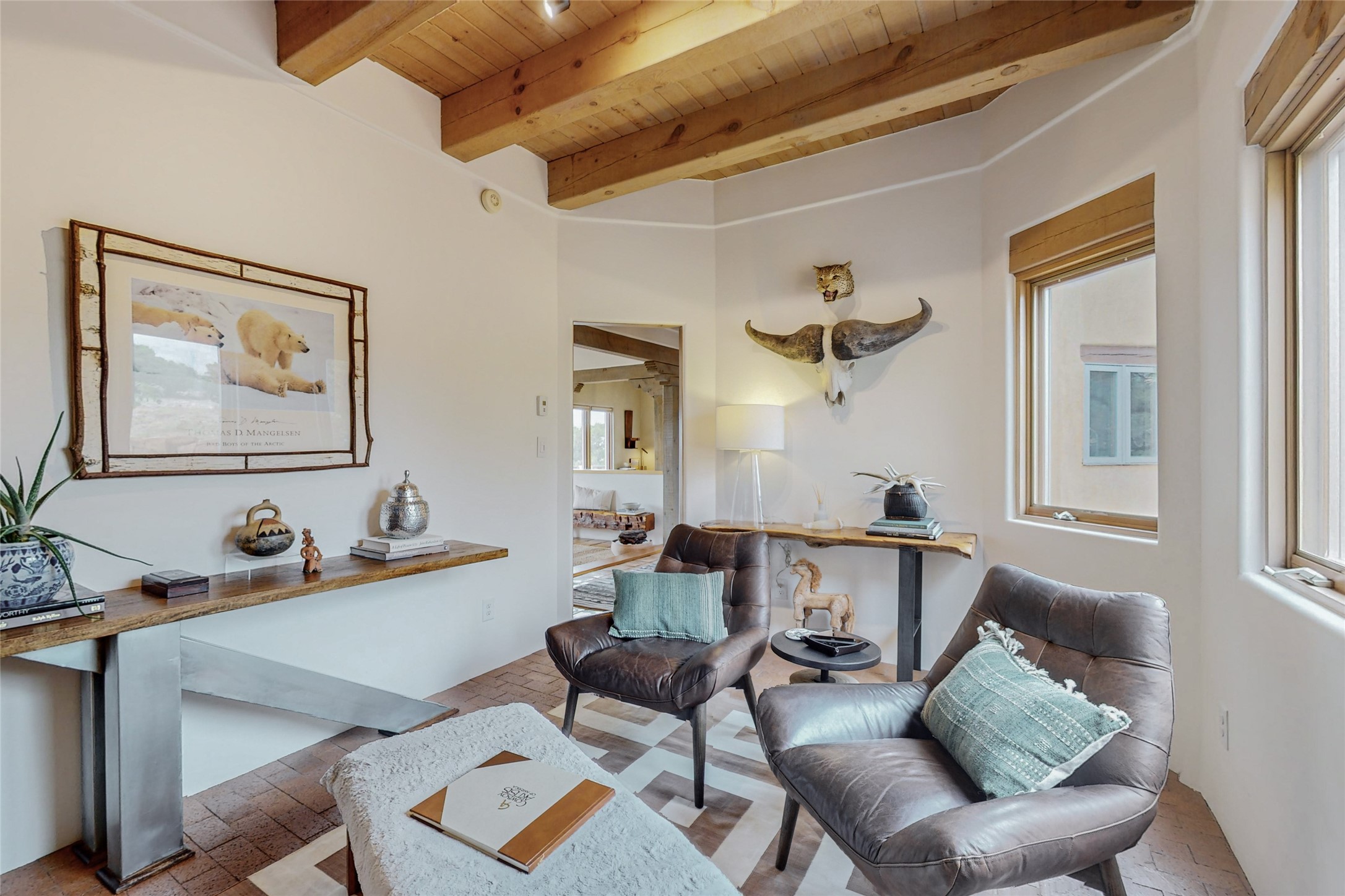 This stunning Eldorado property offers privacy, views and a fabulous floorplan. Just 5 minutes from the Agora center which has shopping and services and 15 minutes from downtown Santa Fe, its ideal location is close to walking trails and the Eldorado fitness facilities. The elevated ceilings feature wood beams in the public spaces as well as the primary bedroom and den. There is warm brick and tile flooring throughout, hand plastered walls in the kitchen / dining and views out of almost every window. The primary suite, which is separate from the guest bedrooms, has direct access to the covered patio, a welcoming 5 fixture bathroom with a Japanese soaking tub and a real walk-in closet. Many updates and custom touches abound including exterior metal gates, outdoor sconce lighting and the hand painted kiva fireplace. There are brand new and slightly used appliances in the kitchen as well as custom concrete countertops and a generous pantry! Luxuriate outside under a well-lit covered patio that offers beautiful views towards the Ortiz and Sandia mountain ranges and ample space for entertaining. With 6 years left on a transferrable roof warranty, in-floor radiant heat, a cozy den / 4th bedroom plus an oversized 2 car garage, this property leaves little to be desired. Come see how high design in the high desert can elevate your lifestyle!