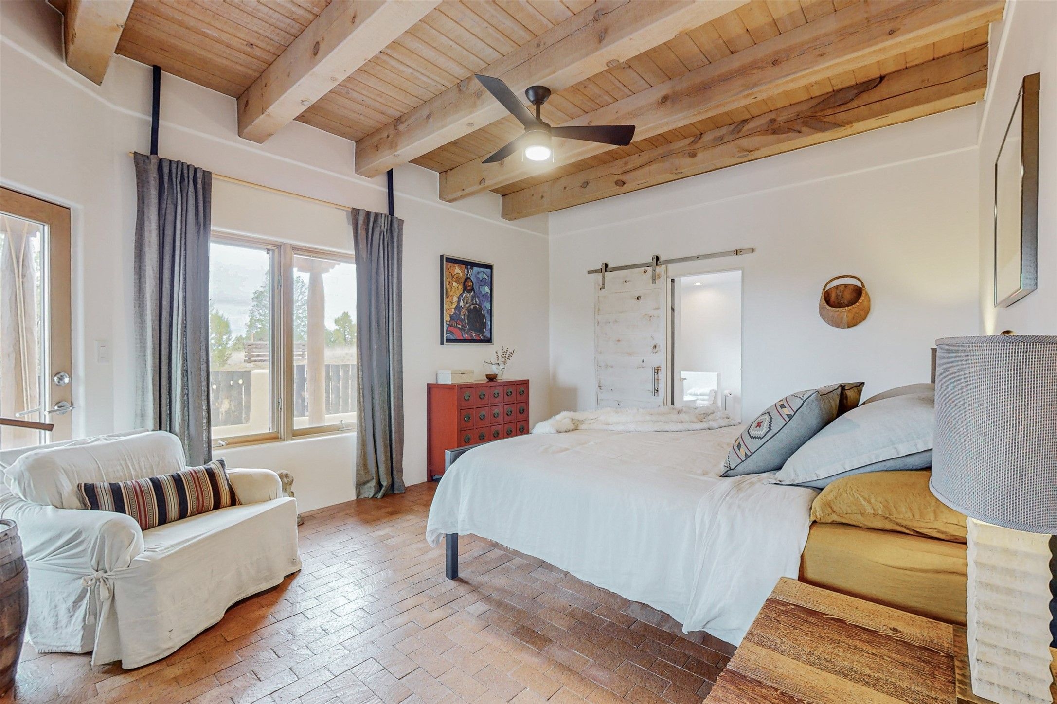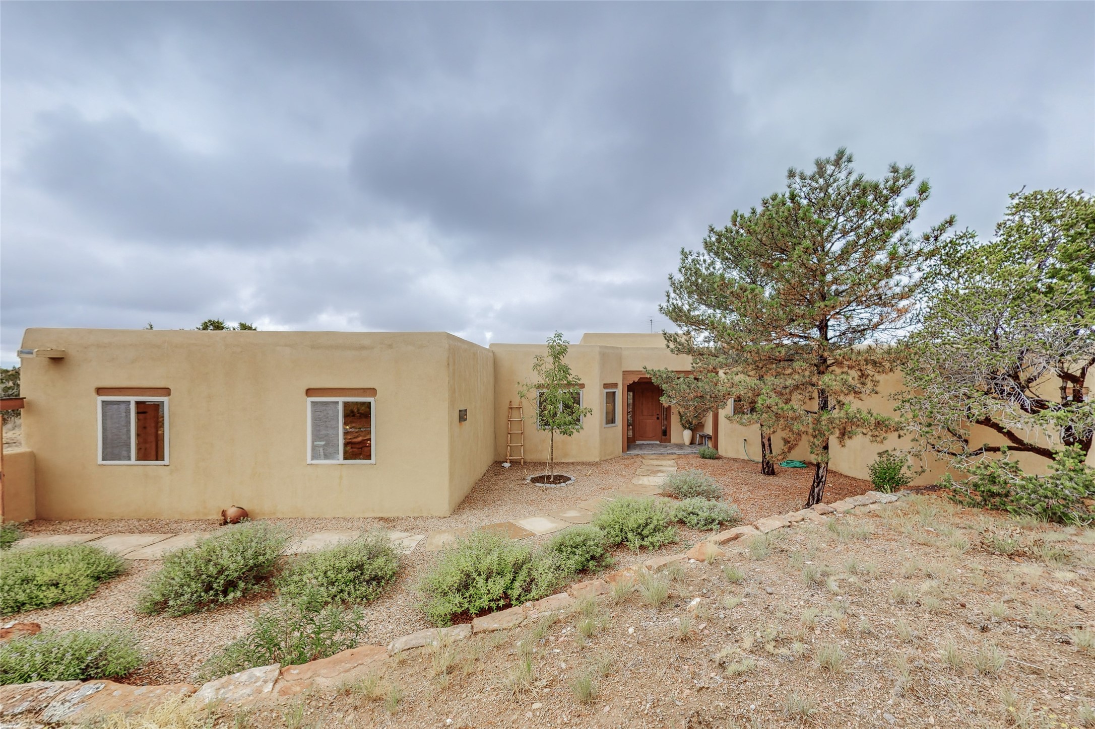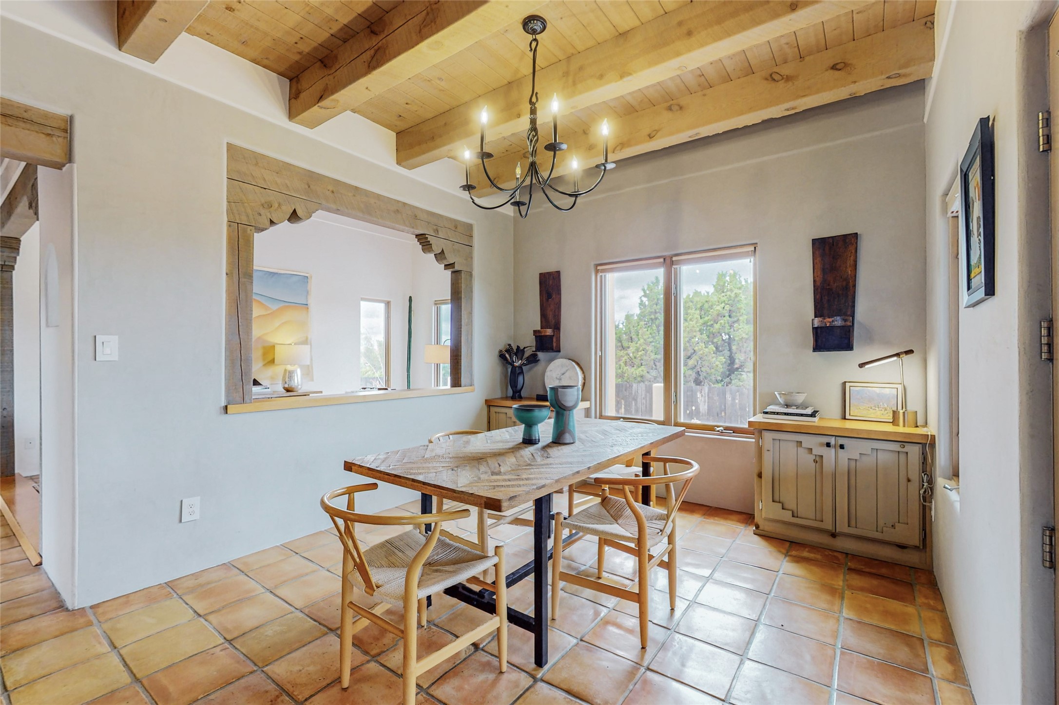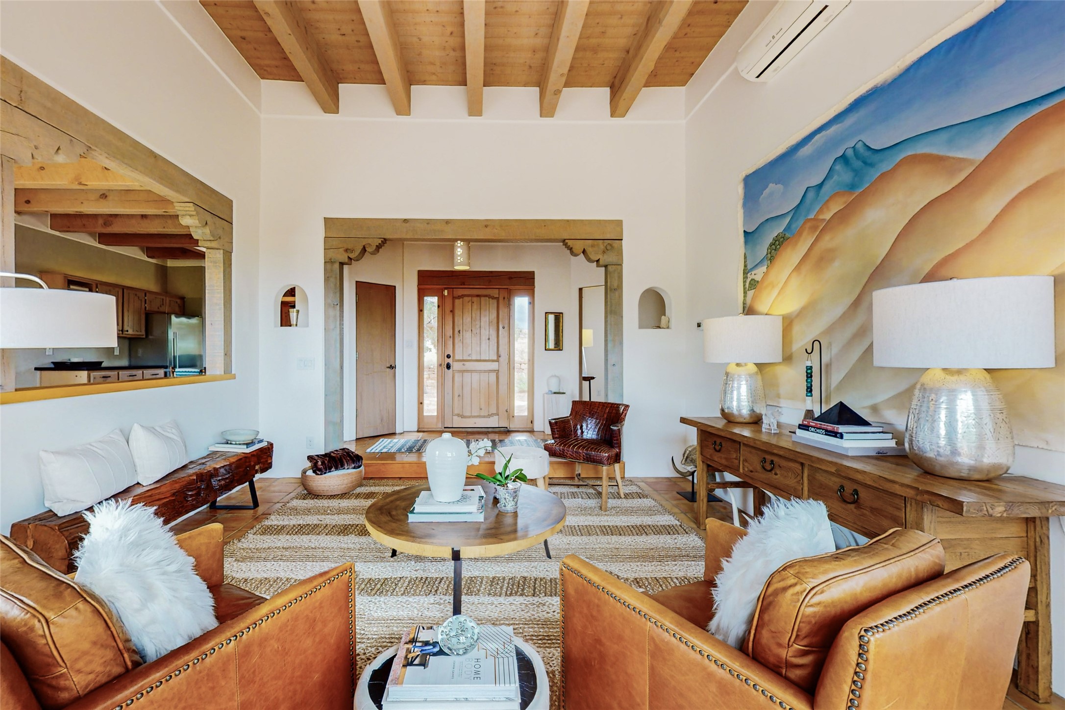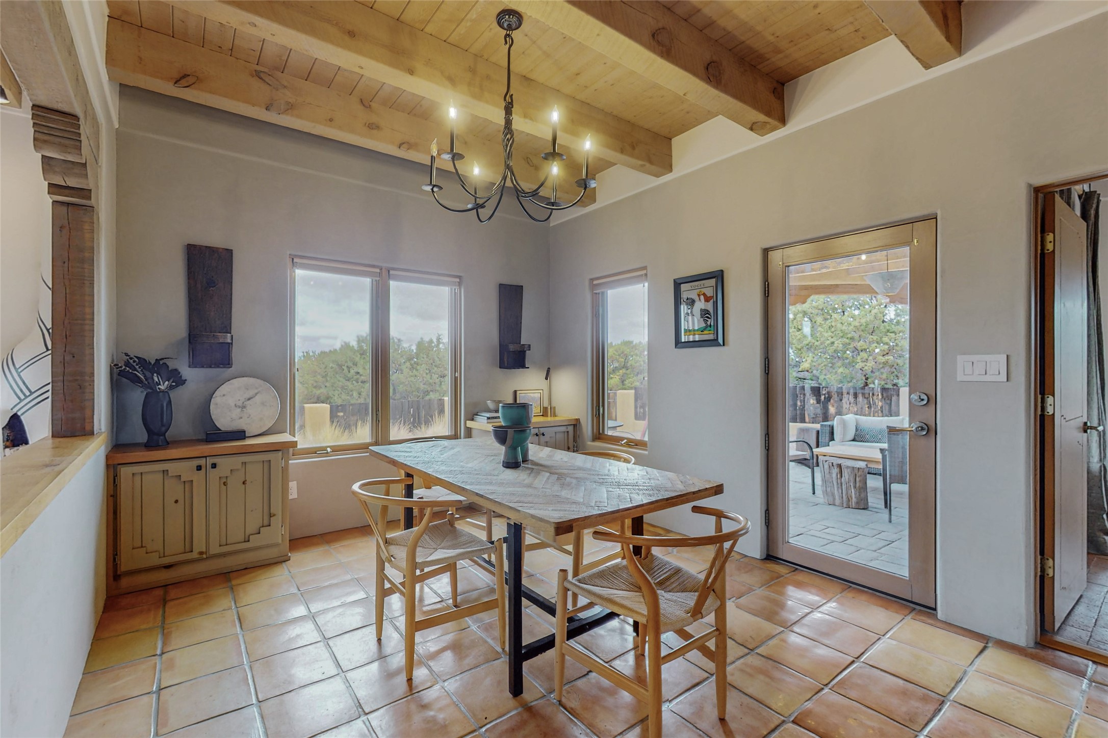 This stunning Eldorado property offers privacy, views and a fabulous floorplan. Just 5 minutes from the Agora center which has shopping and services and 15 minutes from downtown Santa Fe, its ideal location is close to walking trails and the Eldorado fitness facilities. The elevated ceilings feature wood beams in the public spaces as well as the primary bedroom and den. There is warm brick and tile flooring throughout, hand plastered walls in the kitchen / dining and views out of almost every window. The primary suite, which is separate from the guest bedrooms, has direct access to the covered patio, a welcoming 5 fixture bathroom with a Japanese soaking tub and a real walk-in closet. Many updates and custom touches abound including exterior metal gates, outdoor sconce lighting and the hand painted kiva fireplace. There are brand new and slightly used appliances in the kitchen as well as custom concrete countertops and a generous pantry! Luxuriate outside under a well-lit covered patio that offers beautiful views towards the Ortiz and Sandia mountain ranges and ample space for entertaining. With 6 years left on a transferrable roof warranty, in-floor radiant heat, a cozy den / 4th bedroom plus an oversized 2 car garage, this property leaves little to be desired. Come see how high design in the high desert can elevate your lifestyle!