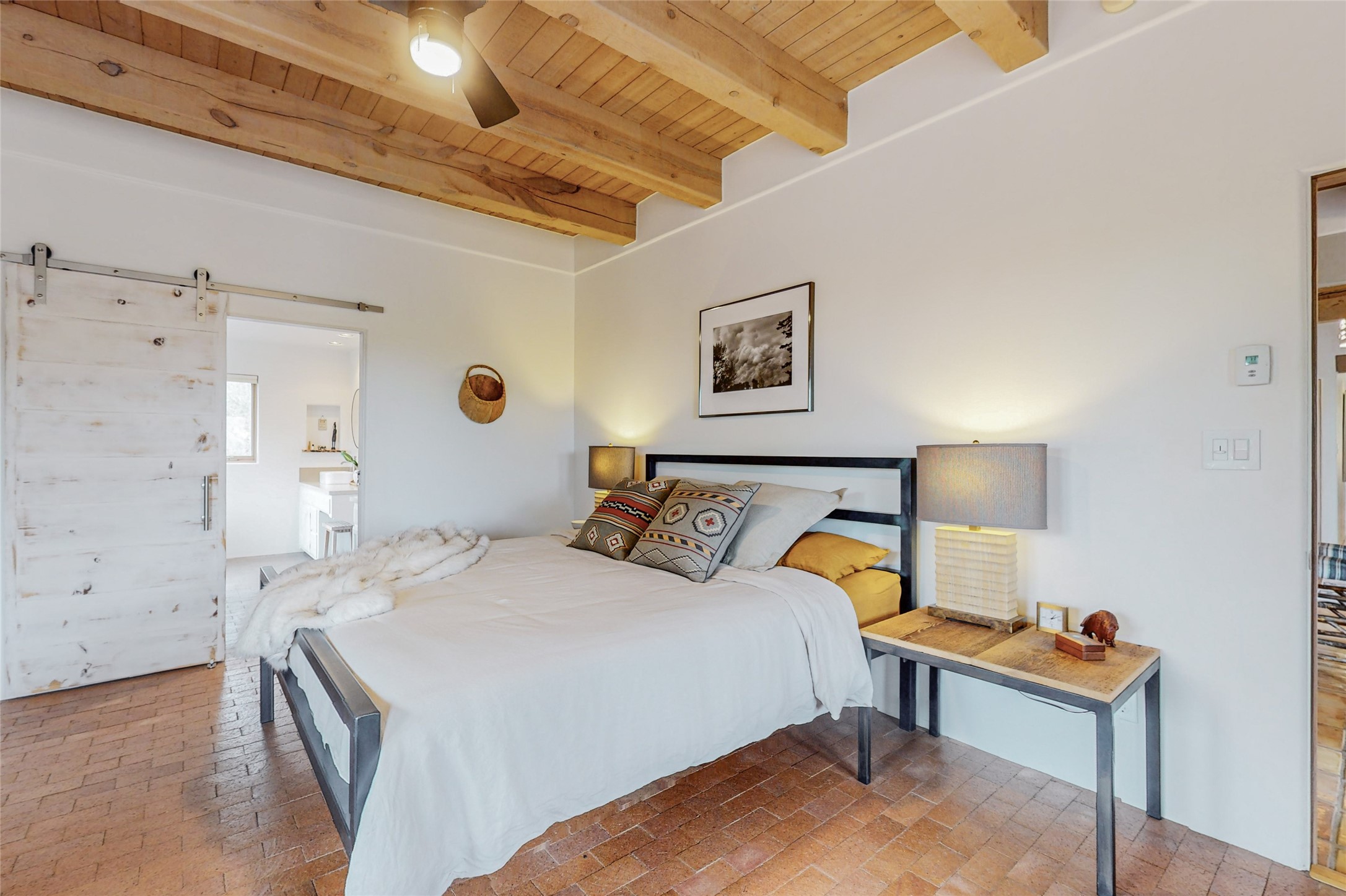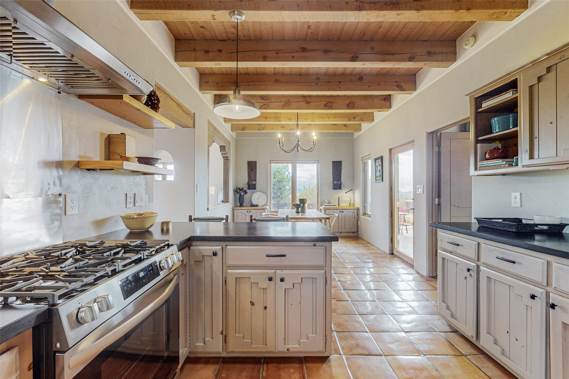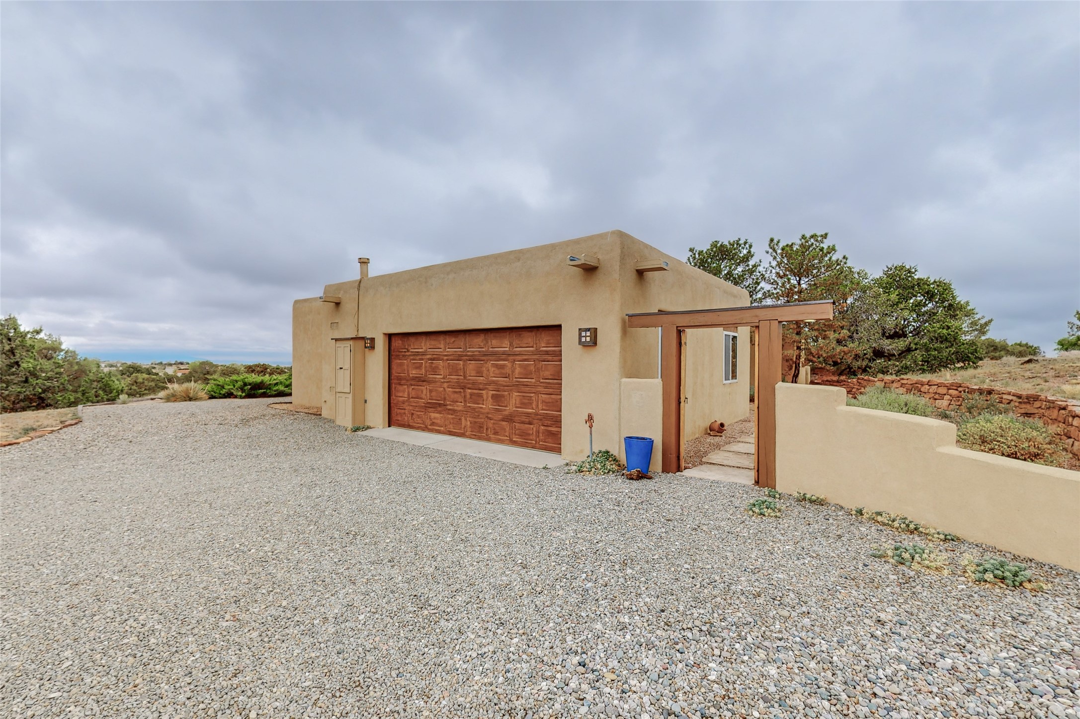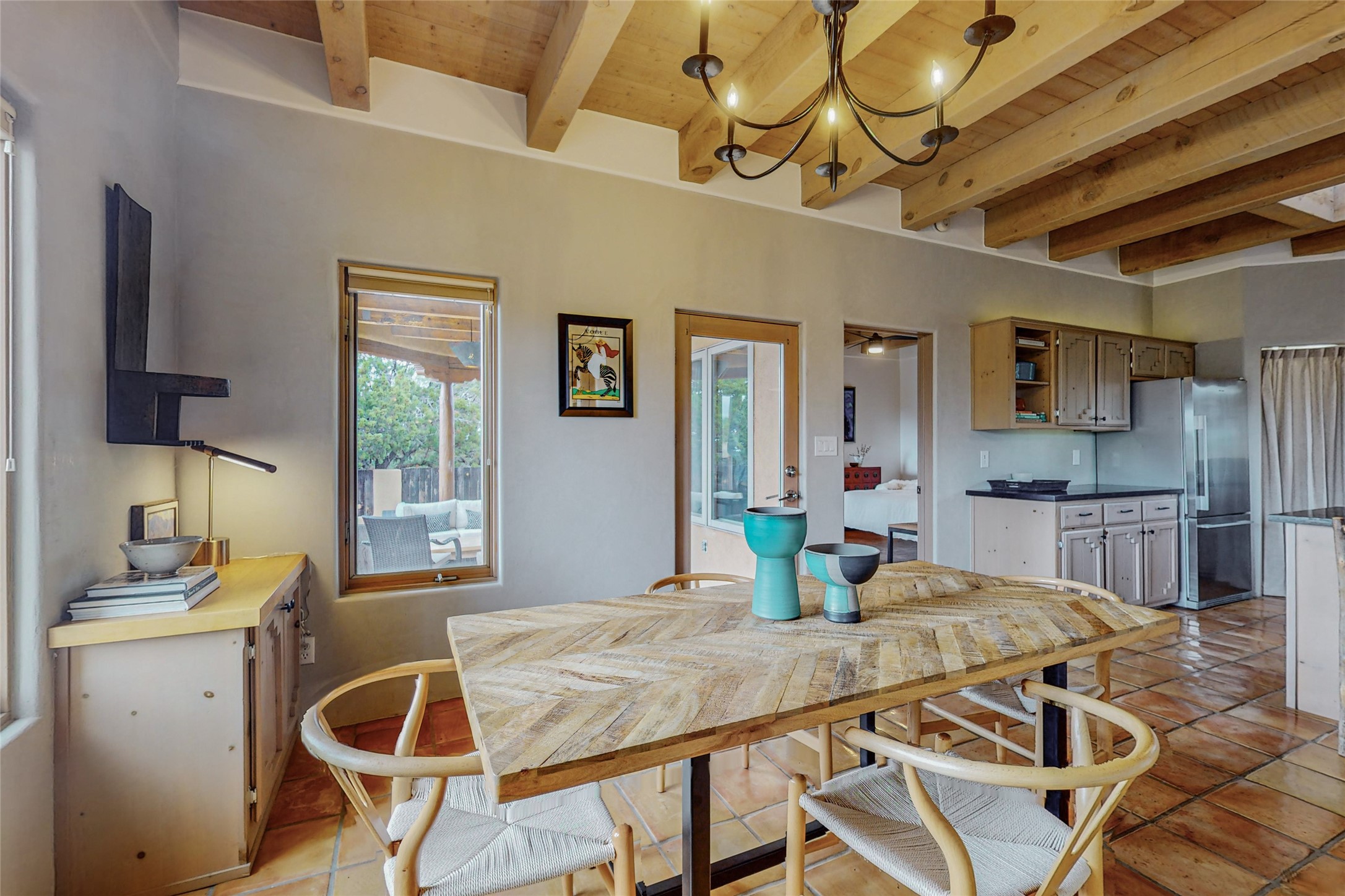 This stunning Eldorado property offers privacy, views and a fabulous floorplan. Just 5 minutes from the Agora center which has shopping and services and 15 minutes from downtown Santa Fe, its ideal location is close to walking trails and the Eldorado fitness facilities. The elevated ceilings feature wood beams in the public spaces as well as the primary bedroom and den. There is warm brick and tile flooring throughout, hand plastered walls in the kitchen / dining and views out of almost every window. The primary suite, which is separate from the guest bedrooms, has direct access to the covered patio, a welcoming 5 fixture bathroom with a Japanese soaking tub and a real walk-in closet. Many updates and custom touches abound including exterior metal gates, outdoor sconce lighting and the hand painted kiva fireplace. There are brand new and slightly used appliances in the kitchen as well as custom concrete countertops and a generous pantry! Luxuriate outside under a well-lit covered patio that offers beautiful views towards the Ortiz and Sandia mountain ranges and ample space for entertaining. With 6 years left on a transferrable roof warranty, in-floor radiant heat, a cozy den / 4th bedroom plus an oversized 2 car garage, this property leaves little to be desired. Come see how high design in the high desert can elevate your lifestyle!