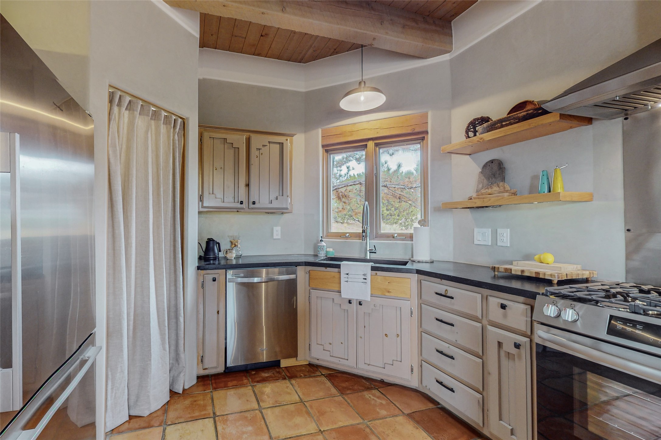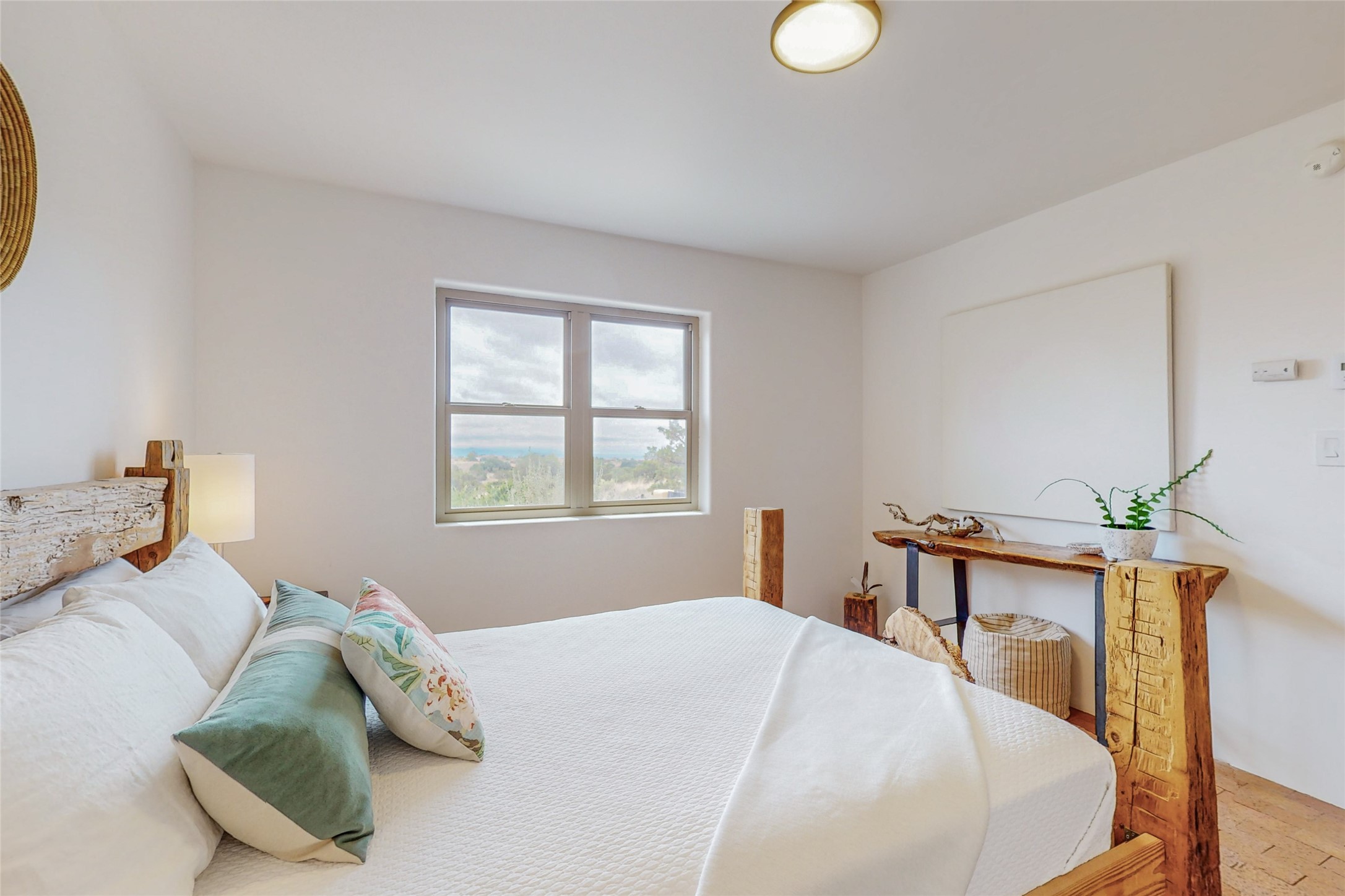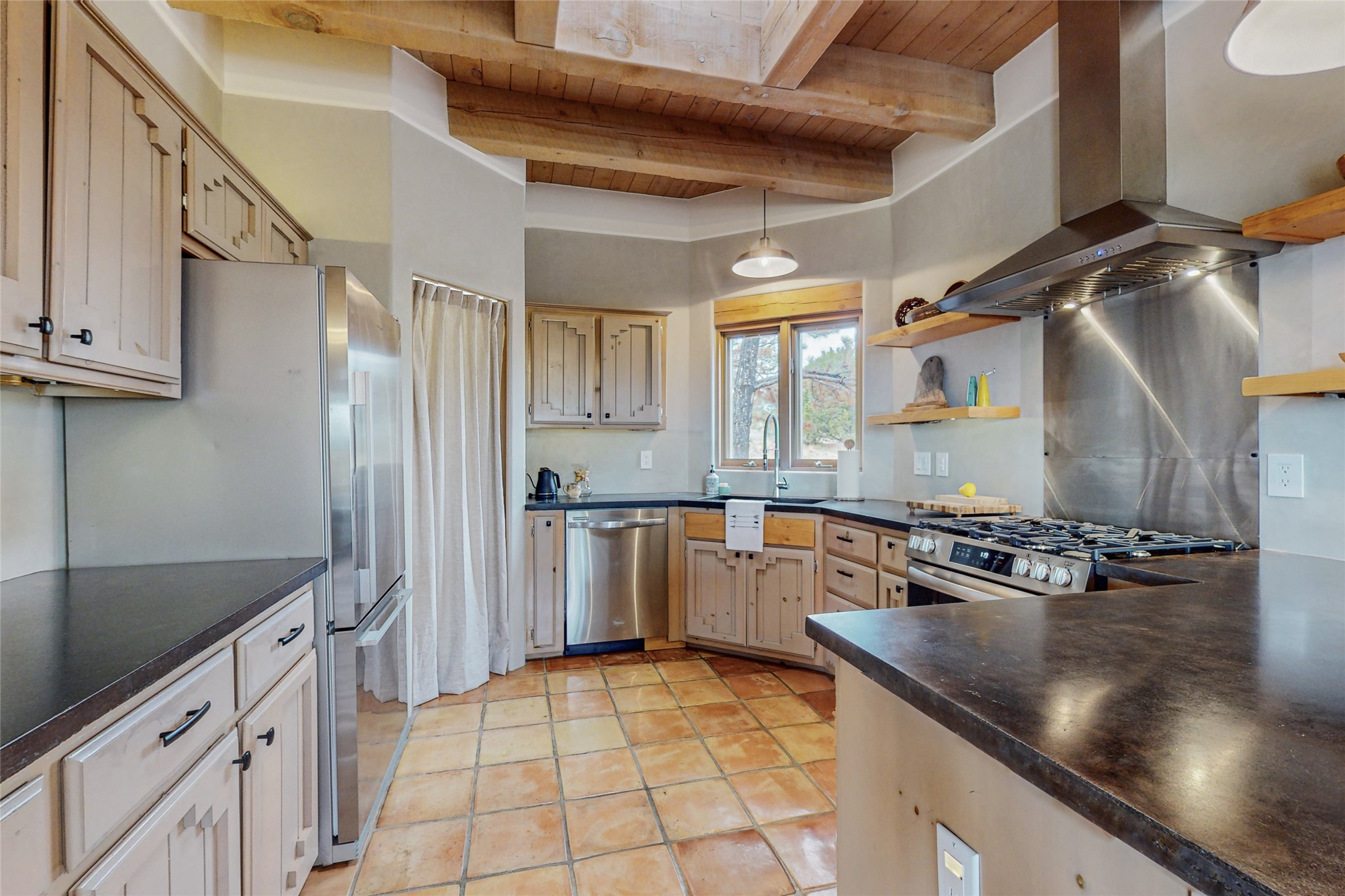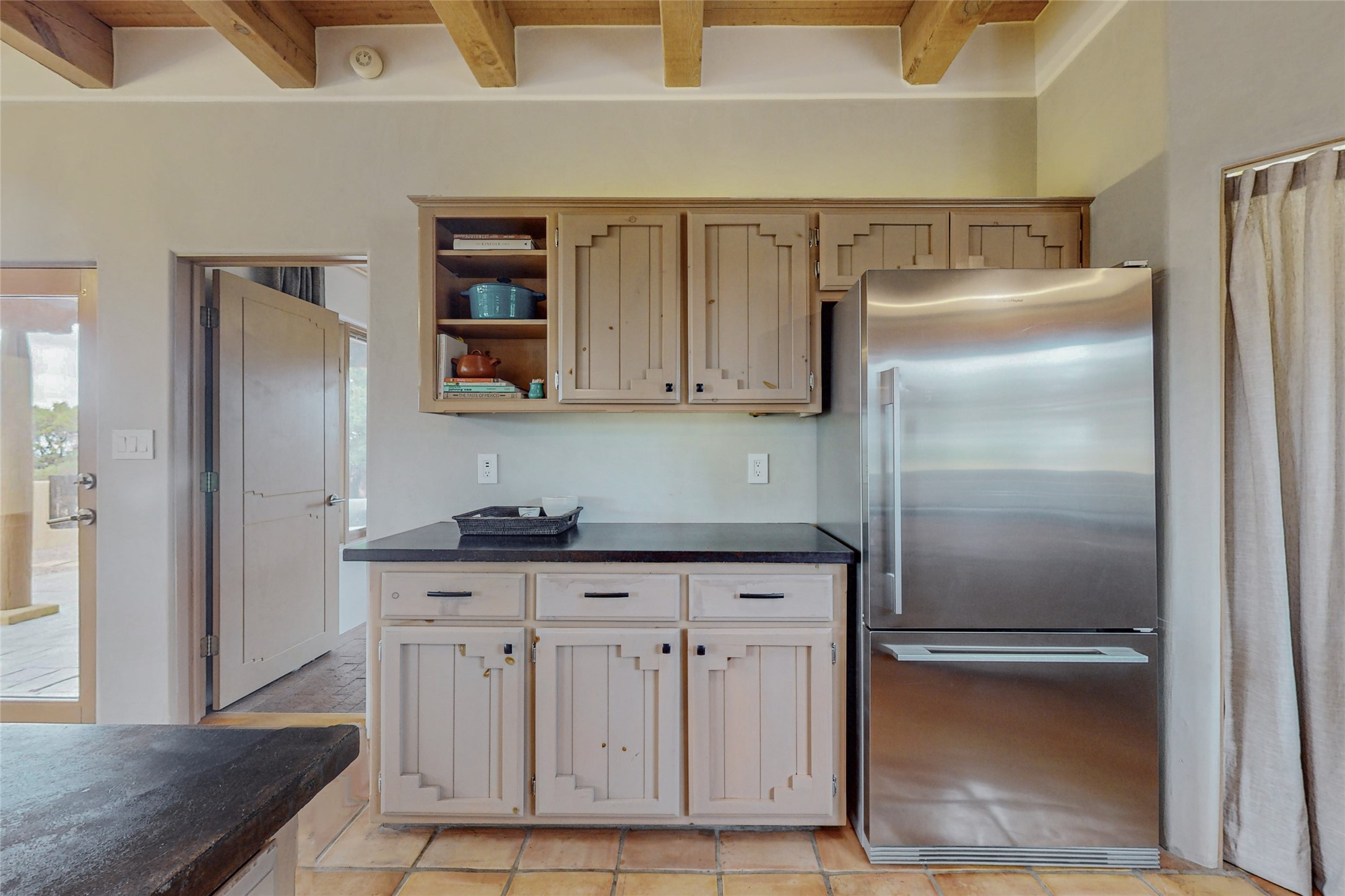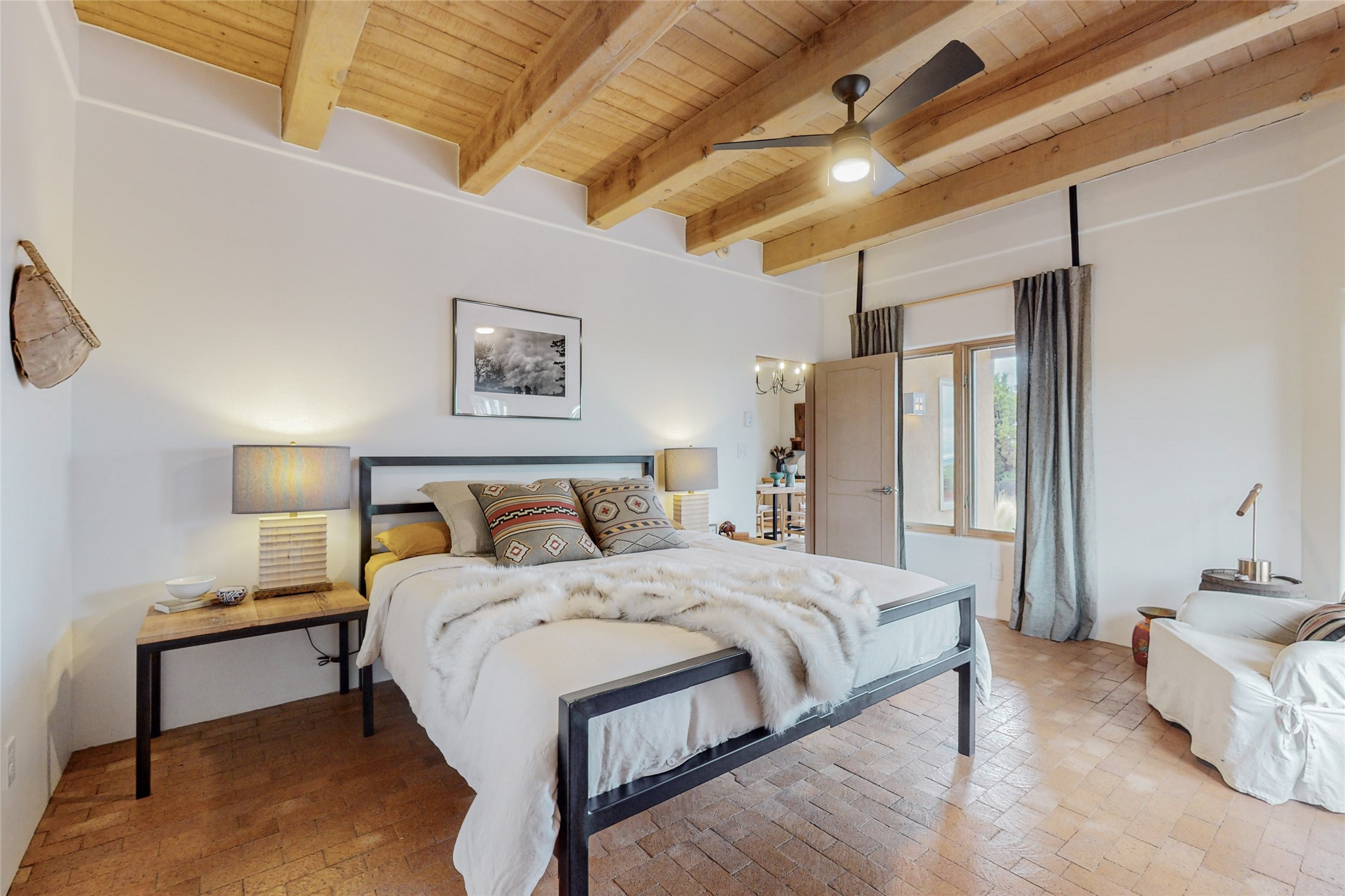 This stunning Eldorado property offers privacy, views and a fabulous floorplan. Just 5 minutes from the Agora center which has shopping and services and 15 minutes from downtown Santa Fe, its ideal location is close to walking trails and the Eldorado fitness facilities. The elevated ceilings feature wood beams in the public spaces as well as the primary bedroom and den. There is warm brick and tile flooring throughout, hand plastered walls in the kitchen / dining and views out of almost every window. The primary suite, which is separate from the guest bedrooms, has direct access to the covered patio, a welcoming 5 fixture bathroom with a Japanese soaking tub and a real walk-in closet. Many updates and custom touches abound including exterior metal gates, outdoor sconce lighting and the hand painted kiva fireplace. There are brand new and slightly used appliances in the kitchen as well as custom concrete countertops and a generous pantry! Luxuriate outside under a well-lit covered patio that offers beautiful views towards the Ortiz and Sandia mountain ranges and ample space for entertaining. With 6 years left on a transferrable roof warranty, in-floor radiant heat, a cozy den / 4th bedroom plus an oversized 2 car garage, this property leaves little to be desired. Come see how high design in the high desert can elevate your lifestyle!