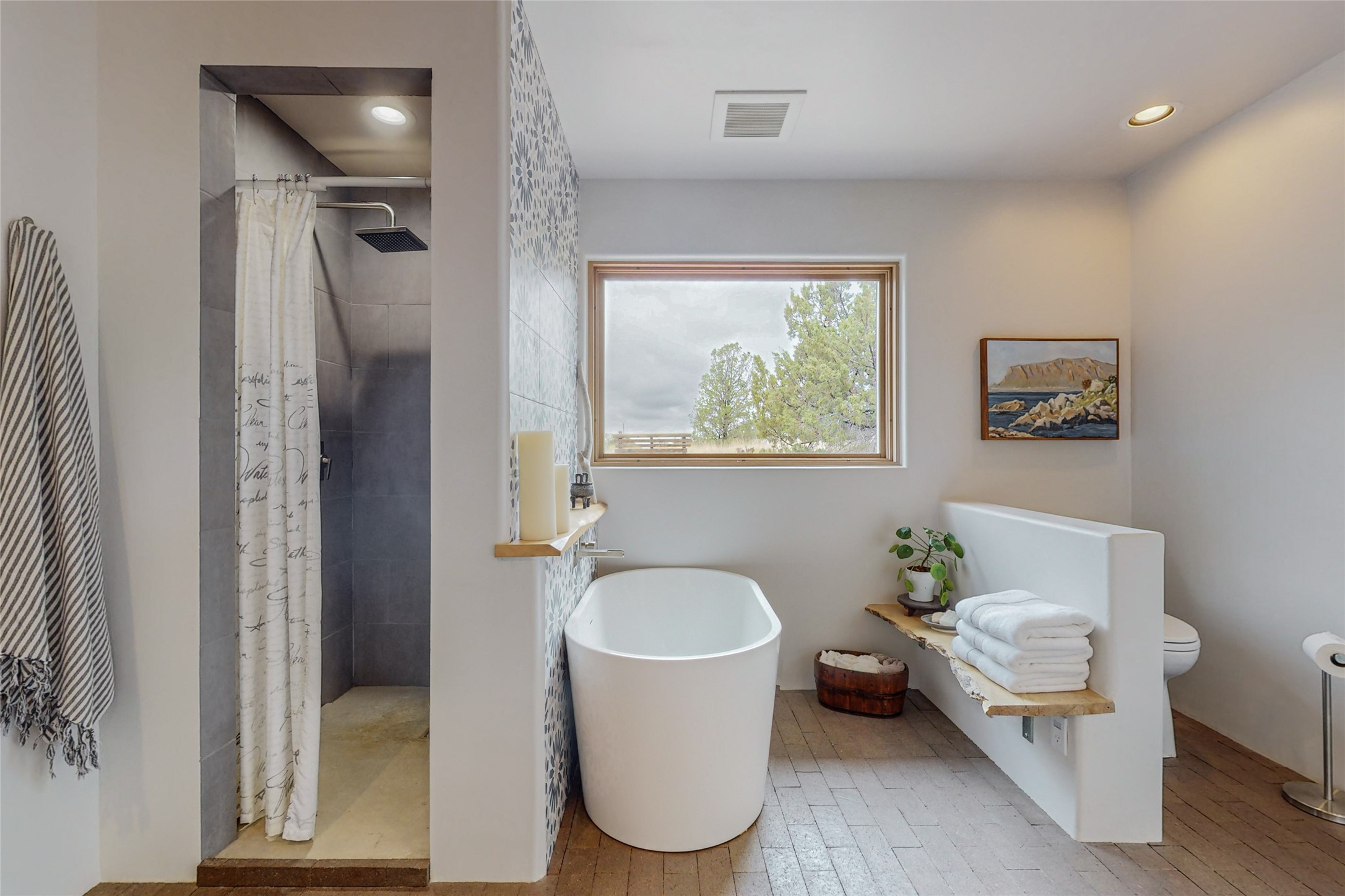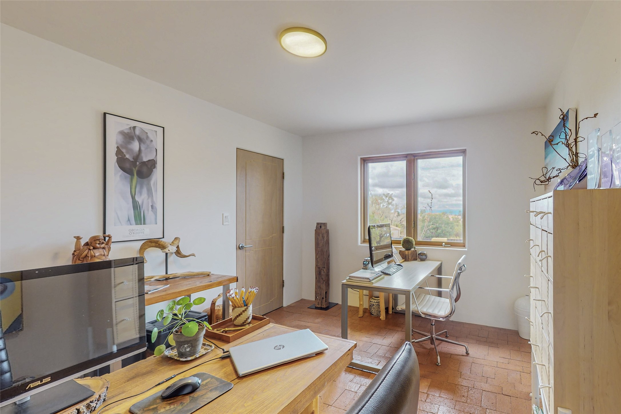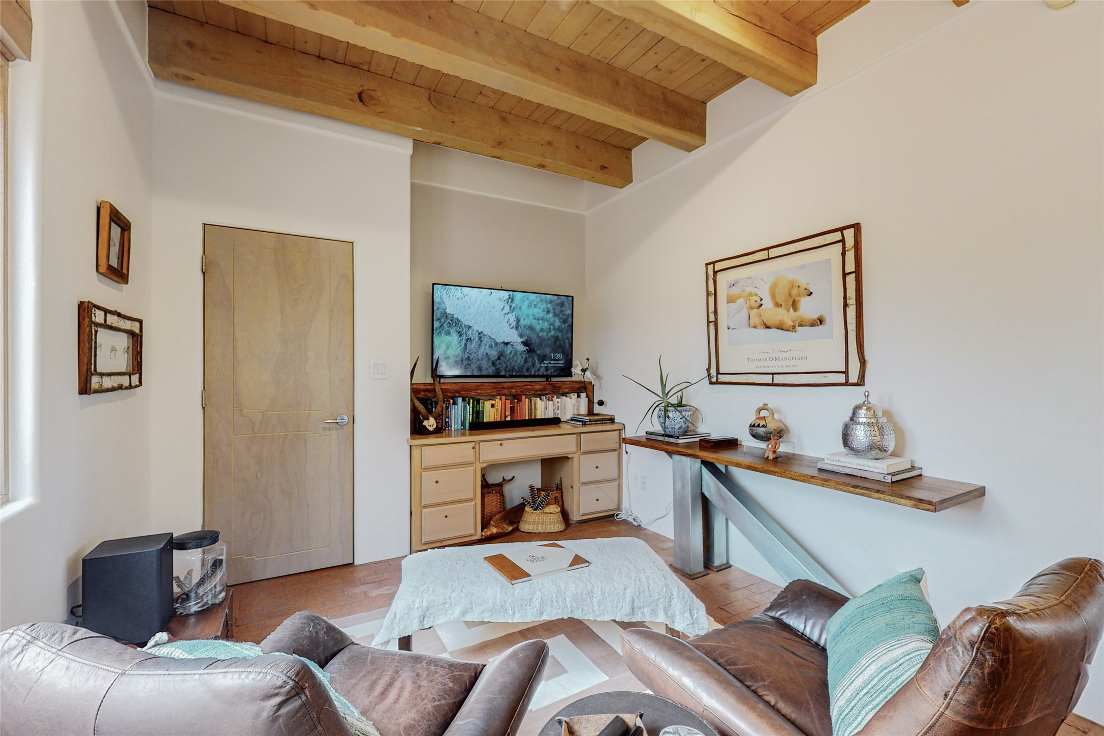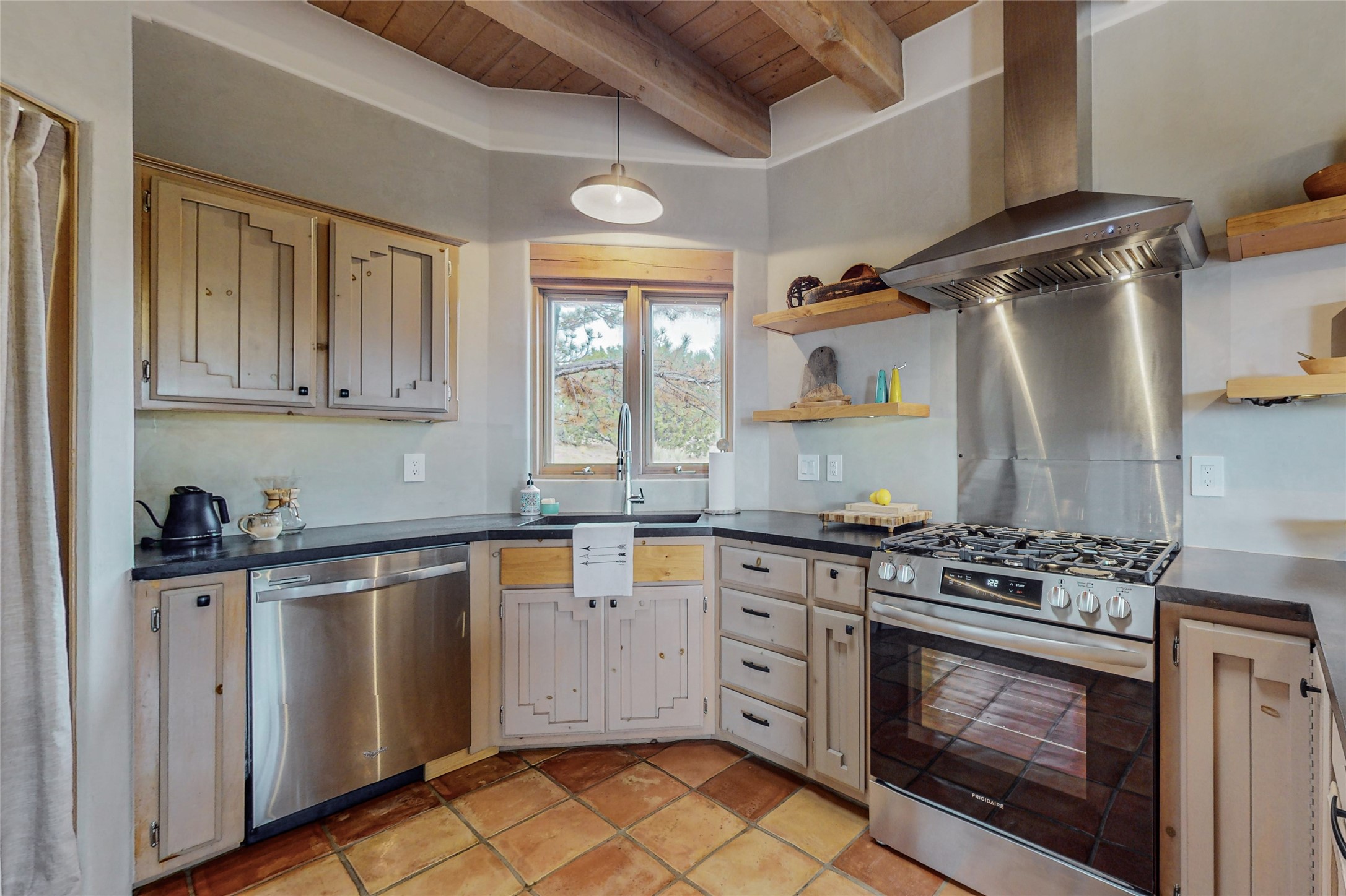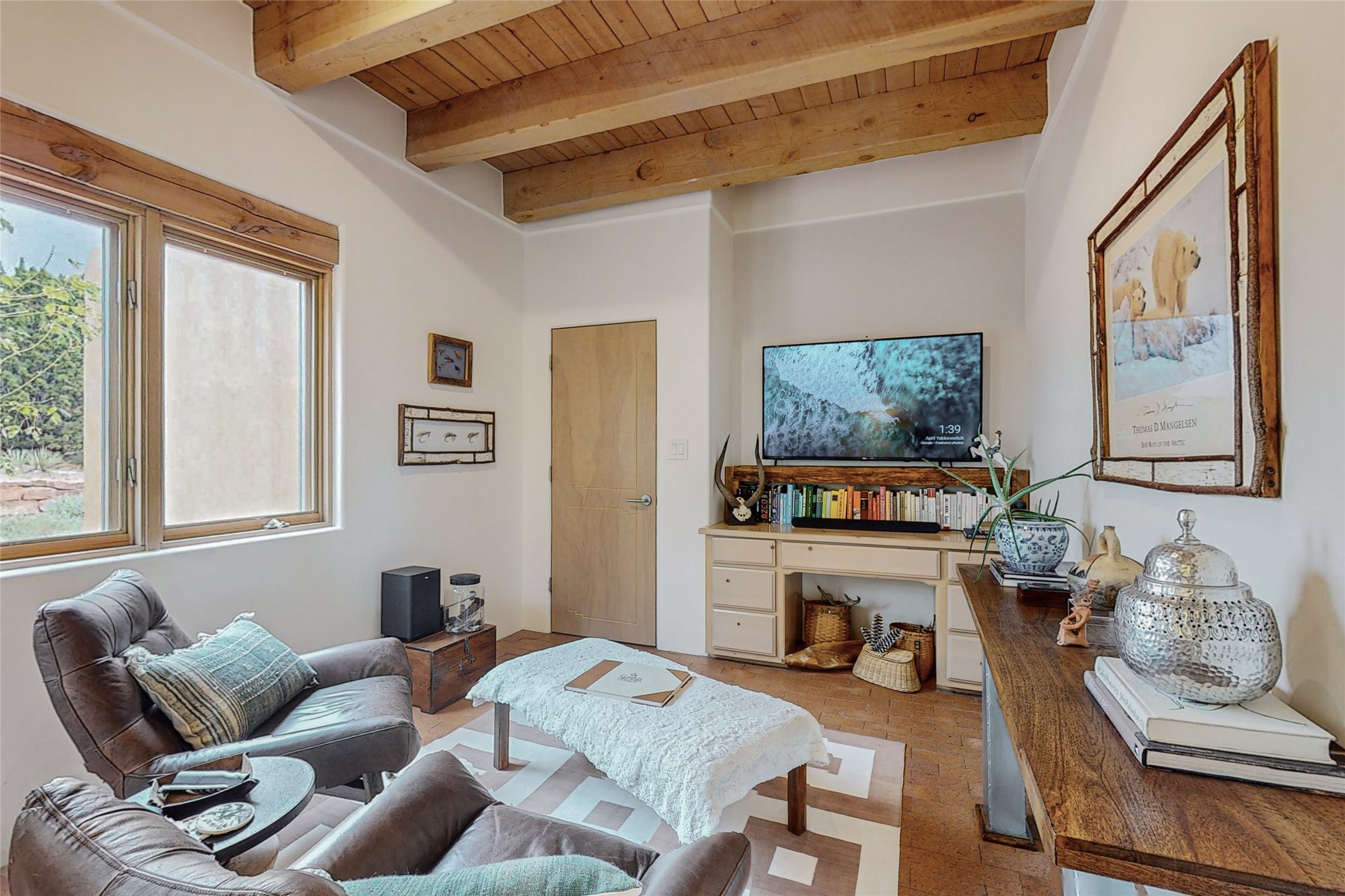 This stunning Eldorado property offers privacy, views and a fabulous floorplan. Just 5 minutes from the Agora center which has shopping and services and 15 minutes from downtown Santa Fe, its ideal location is close to walking trails and the Eldorado fitness facilities. The elevated ceilings feature wood beams in the public spaces as well as the primary bedroom and den. There is warm brick and tile flooring throughout, hand plastered walls in the kitchen / dining and views out of almost every window. The primary suite, which is separate from the guest bedrooms, has direct access to the covered patio, a welcoming 5 fixture bathroom with a Japanese soaking tub and a real walk-in closet. Many updates and custom touches abound including exterior metal gates, outdoor sconce lighting and the hand painted kiva fireplace. There are brand new and slightly used appliances in the kitchen as well as custom concrete countertops and a generous pantry! Luxuriate outside under a well-lit covered patio that offers beautiful views towards the Ortiz and Sandia mountain ranges and ample space for entertaining. With 6 years left on a transferrable roof warranty, in-floor radiant heat, a cozy den / 4th bedroom plus an oversized 2 car garage, this property leaves little to be desired. Come see how high design in the high desert can elevate your lifestyle!