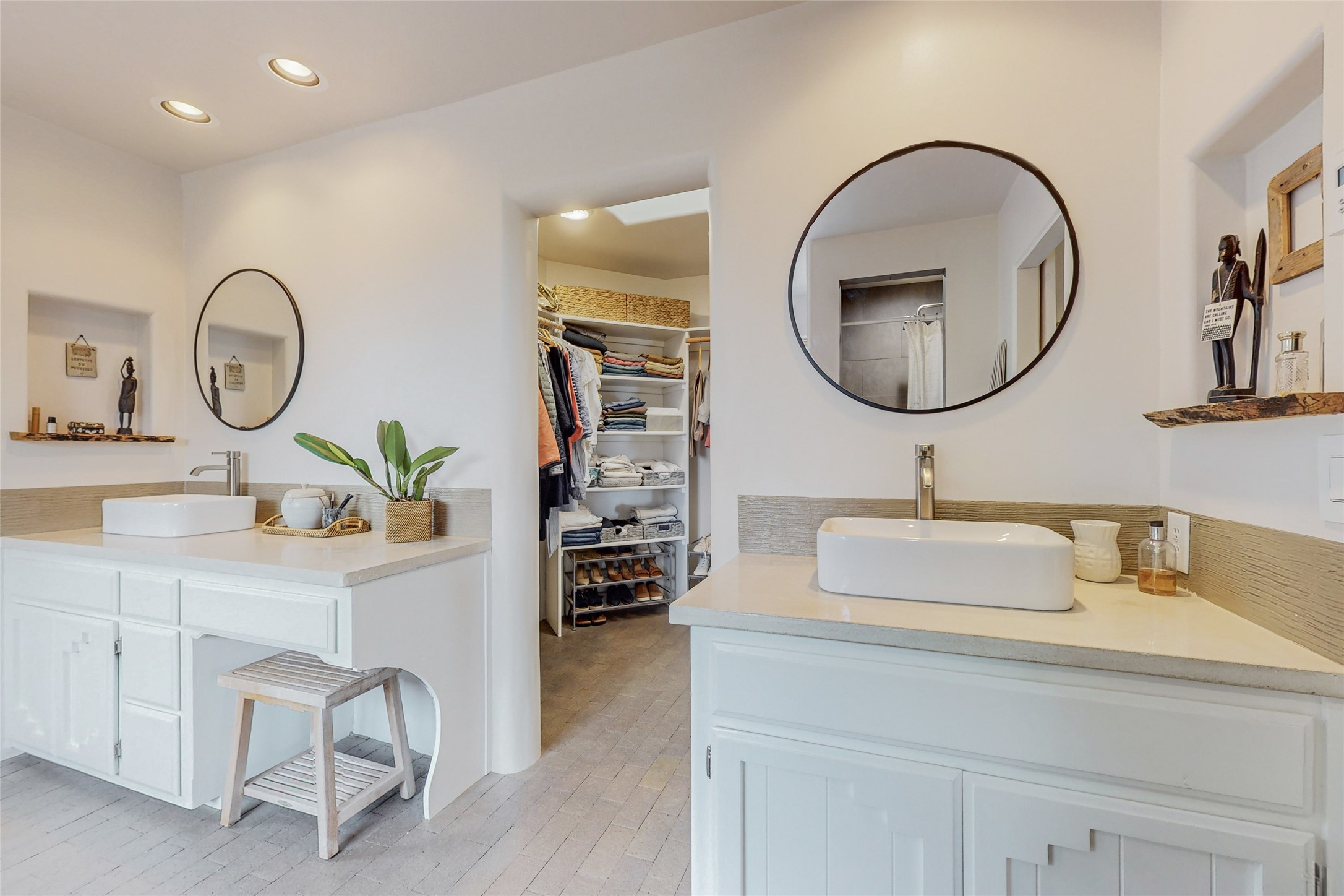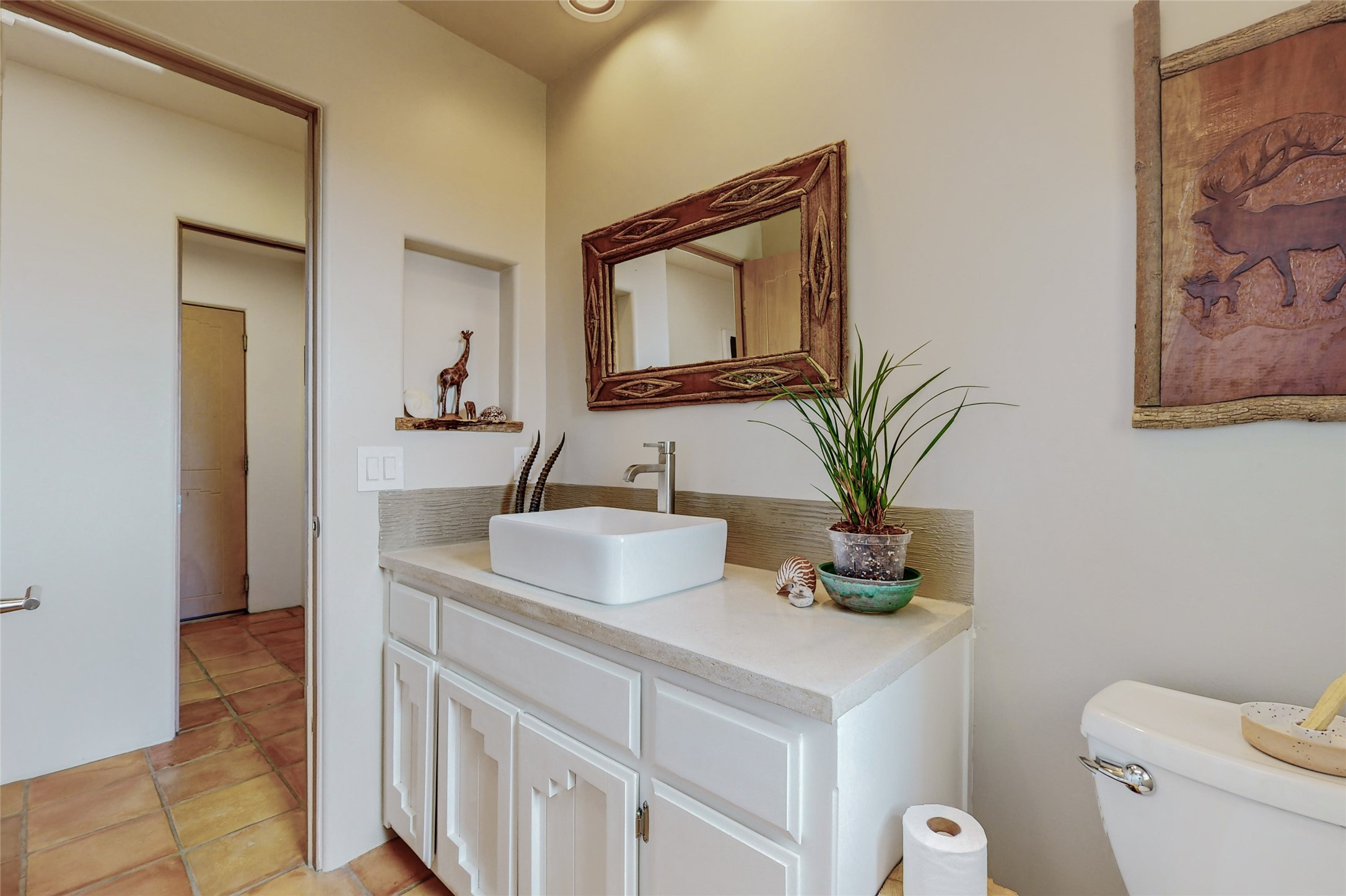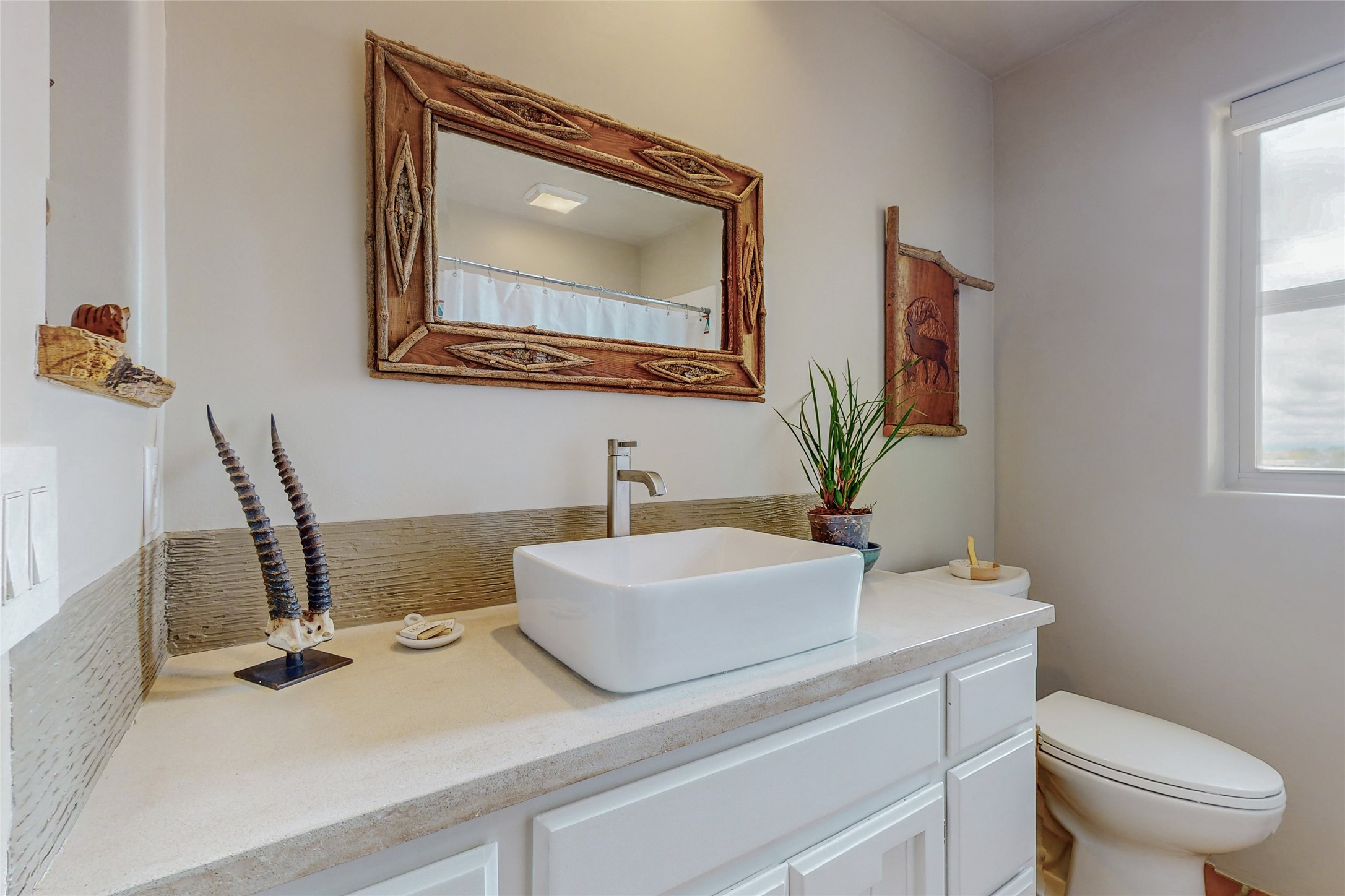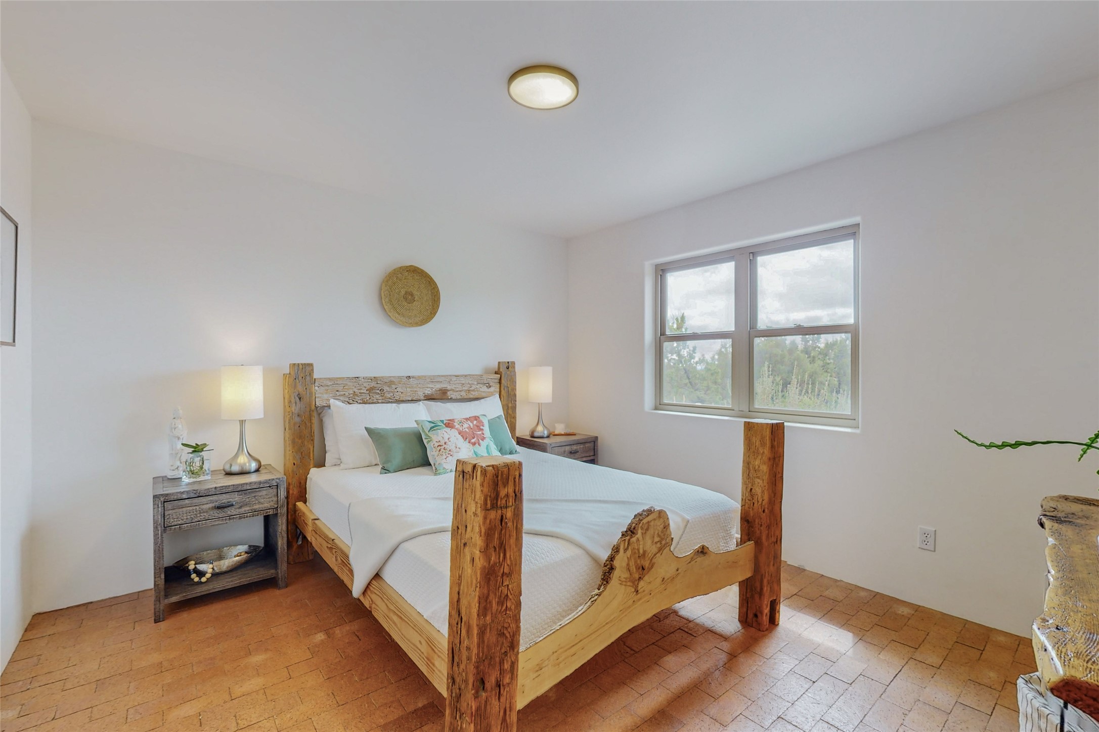 This stunning Eldorado property offers privacy, views and a fabulous floorplan. Just 5 minutes from the Agora center which has shopping and services and 15 minutes from downtown Santa Fe, its ideal location is close to walking trails and the Eldorado fitness facilities. The elevated ceilings feature wood beams in the public spaces as well as the primary bedroom and den. There is warm brick and tile flooring throughout, hand plastered walls in the kitchen / dining and views out of almost every window. The primary suite, which is separate from the guest bedrooms, has direct access to the covered patio, a welcoming 5 fixture bathroom with a Japanese soaking tub and a real walk-in closet. Many updates and custom touches abound including exterior metal gates, outdoor sconce lighting and the hand painted kiva fireplace. There are brand new and slightly used appliances in the kitchen as well as custom concrete countertops and a generous pantry! Luxuriate outside under a well-lit covered patio that offers beautiful views towards the Ortiz and Sandia mountain ranges and ample space for entertaining. With 6 years left on a transferrable roof warranty, in-floor radiant heat, a cozy den / 4th bedroom plus an oversized 2 car garage, this property leaves little to be desired. Come see how high design in the high desert can elevate your lifestyle!