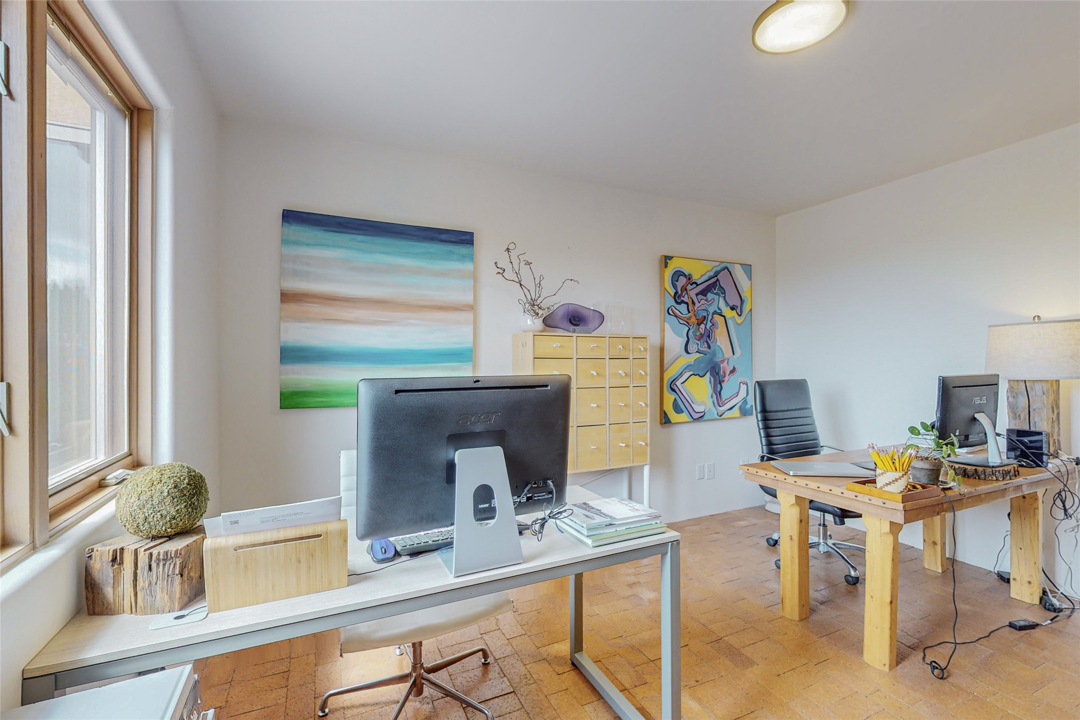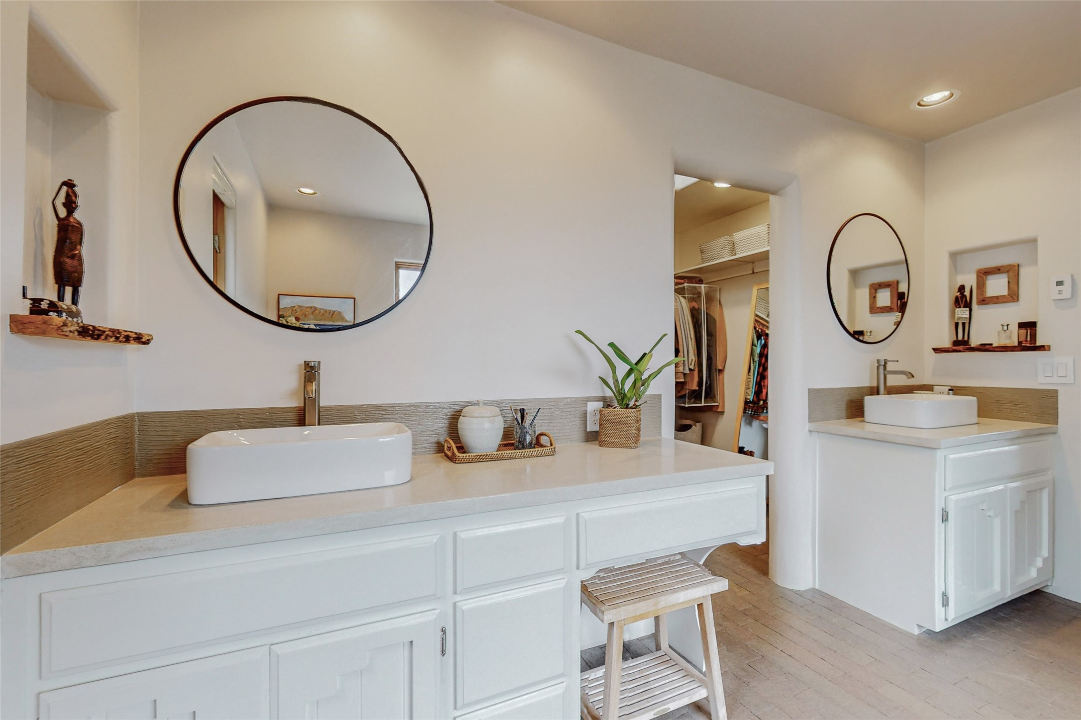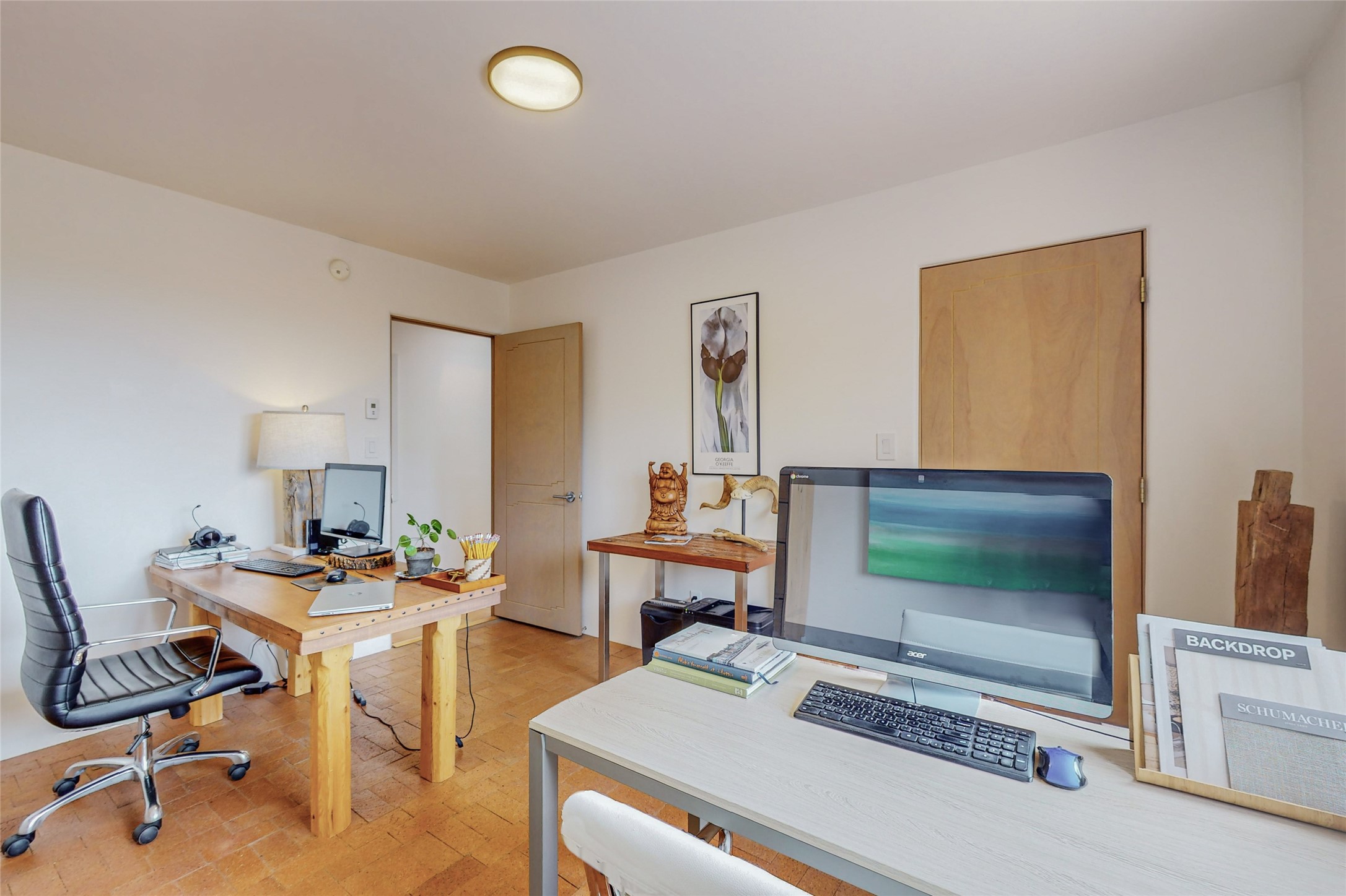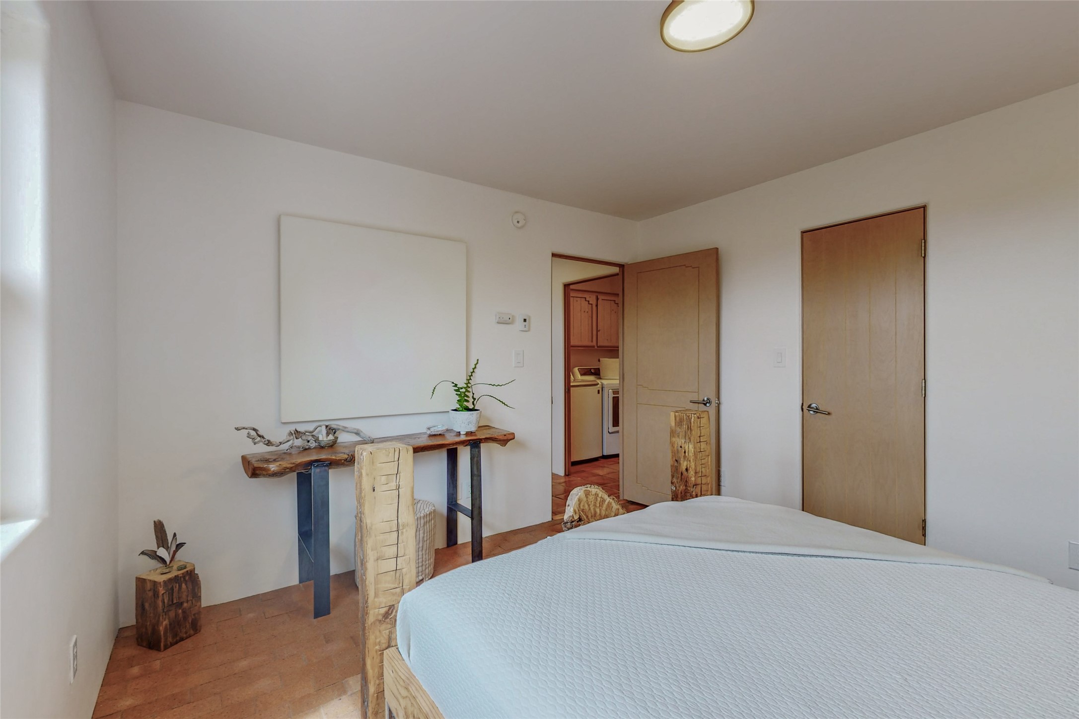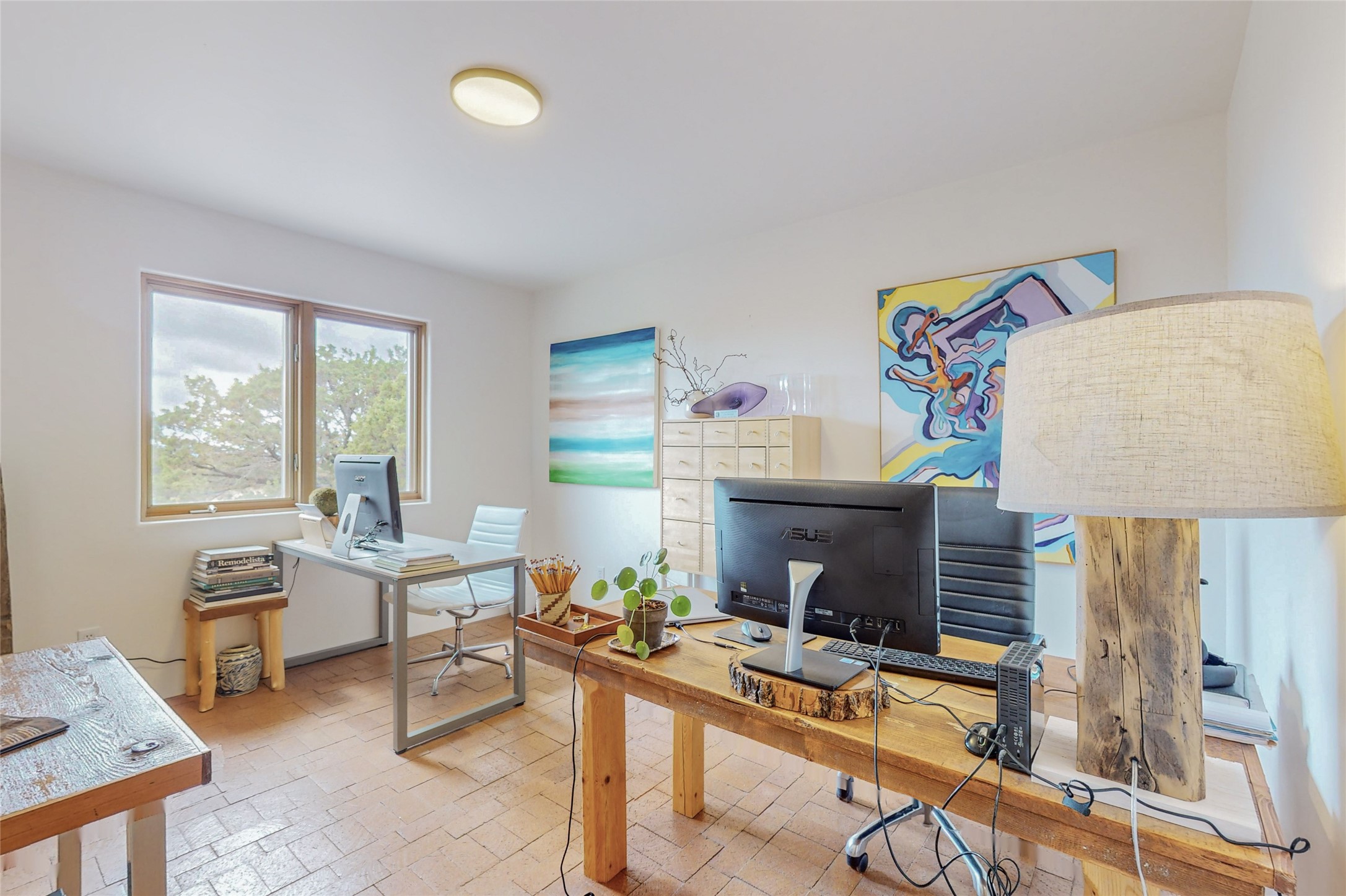 This stunning Eldorado property offers privacy, views and a fabulous floorplan. Just 5 minutes from the Agora center which has shopping and services and 15 minutes from downtown Santa Fe, its ideal location is close to walking trails and the Eldorado fitness facilities. The elevated ceilings feature wood beams in the public spaces as well as the primary bedroom and den. There is warm brick and tile flooring throughout, hand plastered walls in the kitchen / dining and views out of almost every window. The primary suite, which is separate from the guest bedrooms, has direct access to the covered patio, a welcoming 5 fixture bathroom with a Japanese soaking tub and a real walk-in closet. Many updates and custom touches abound including exterior metal gates, outdoor sconce lighting and the hand painted kiva fireplace. There are brand new and slightly used appliances in the kitchen as well as custom concrete countertops and a generous pantry! Luxuriate outside under a well-lit covered patio that offers beautiful views towards the Ortiz and Sandia mountain ranges and ample space for entertaining. With 6 years left on a transferrable roof warranty, in-floor radiant heat, a cozy den / 4th bedroom plus an oversized 2 car garage, this property leaves little to be desired. Come see how high design in the high desert can elevate your lifestyle!