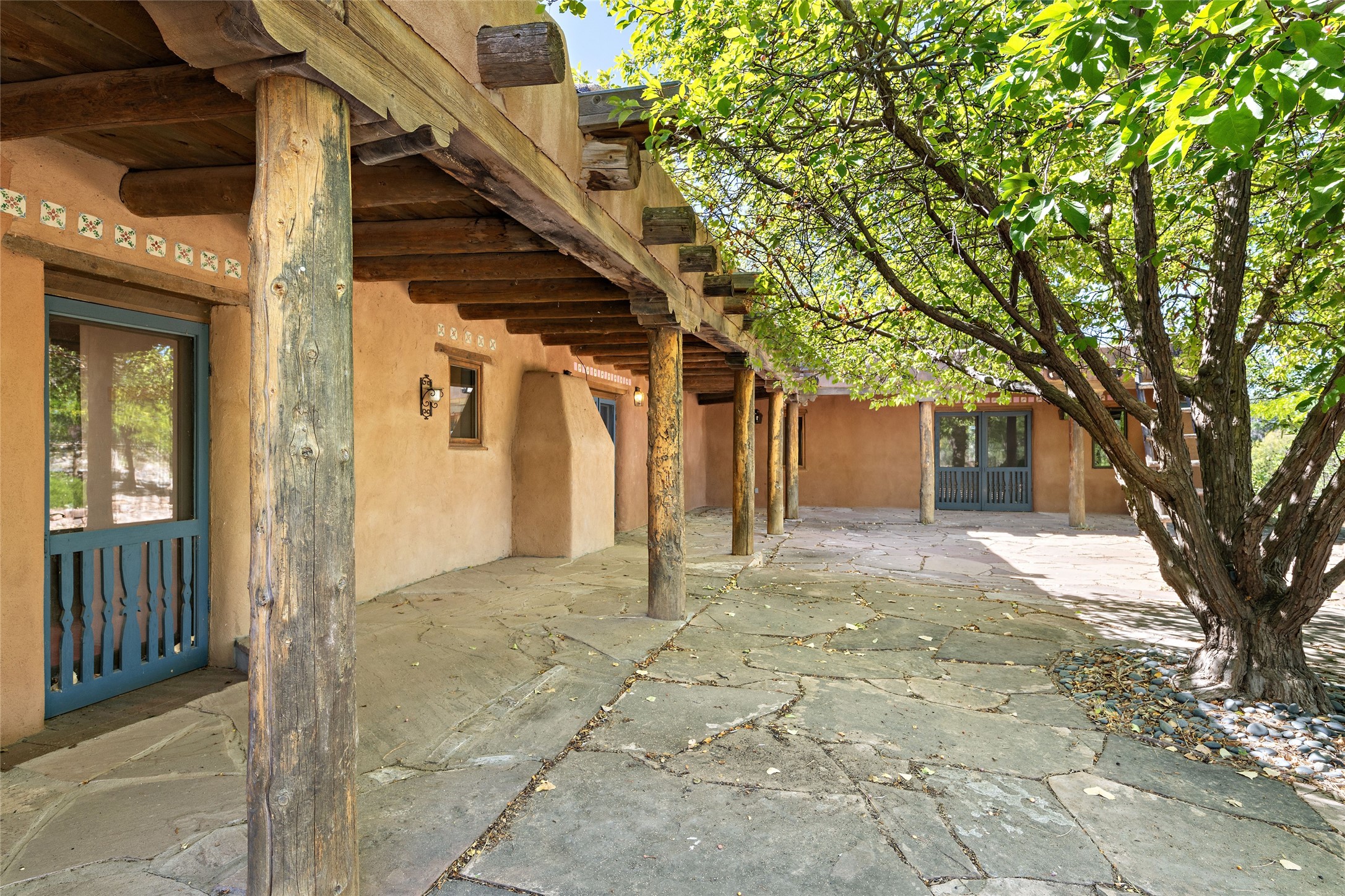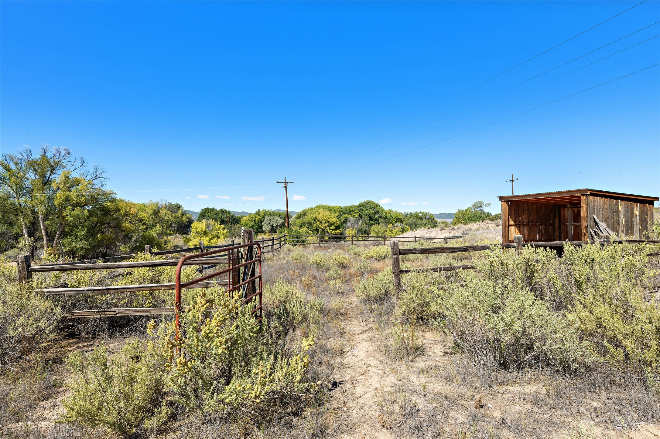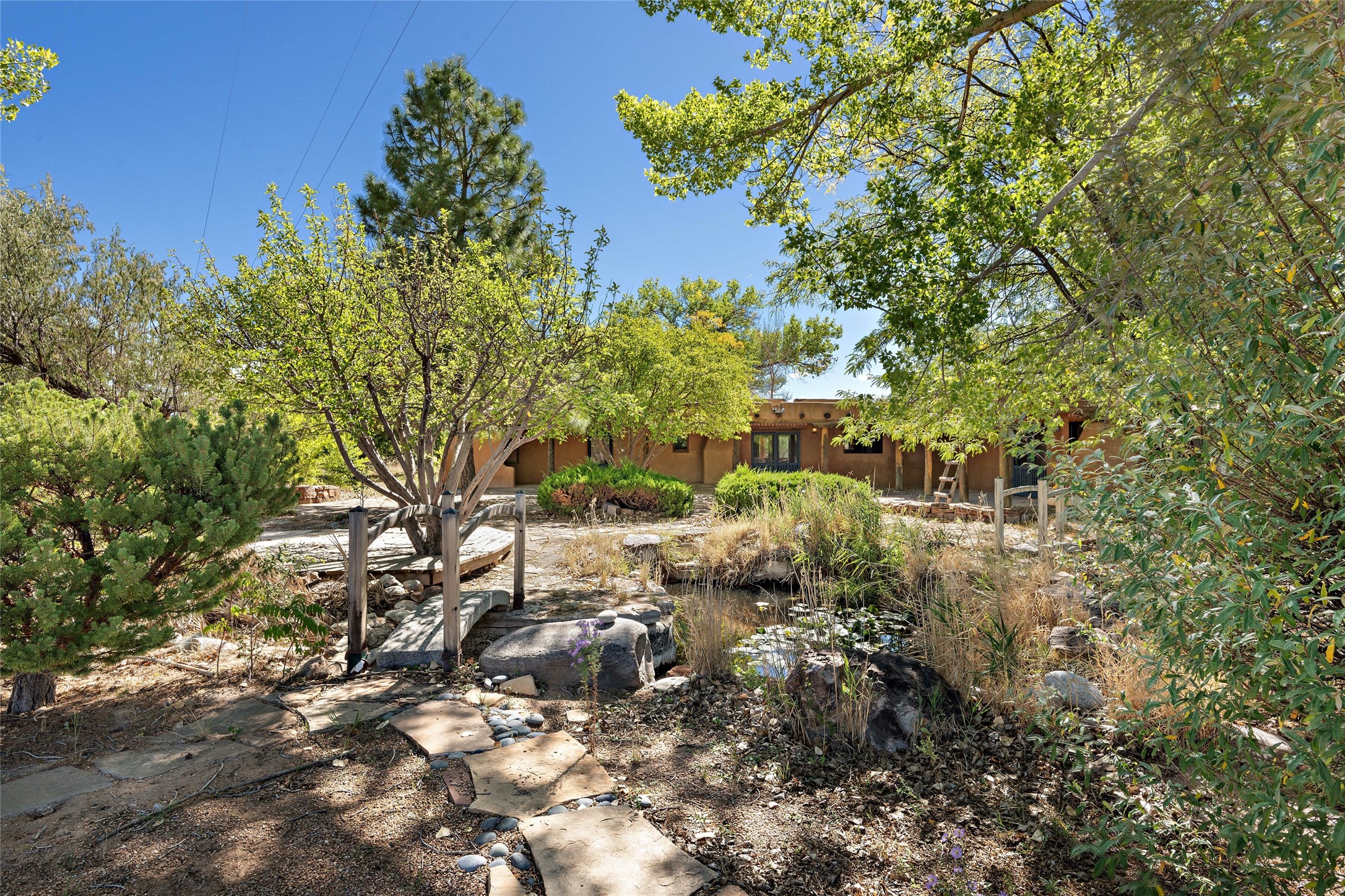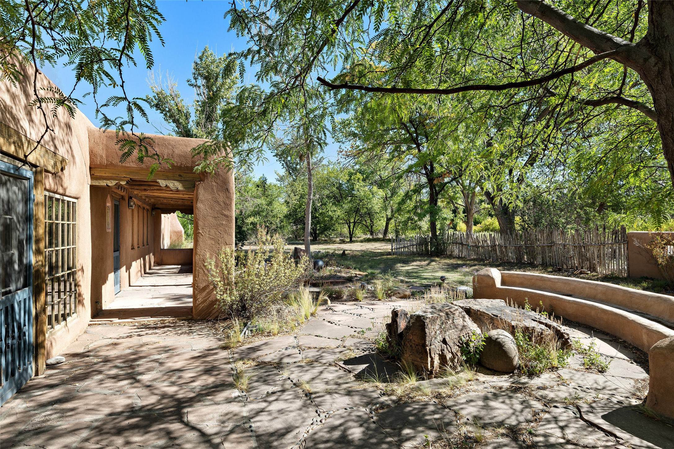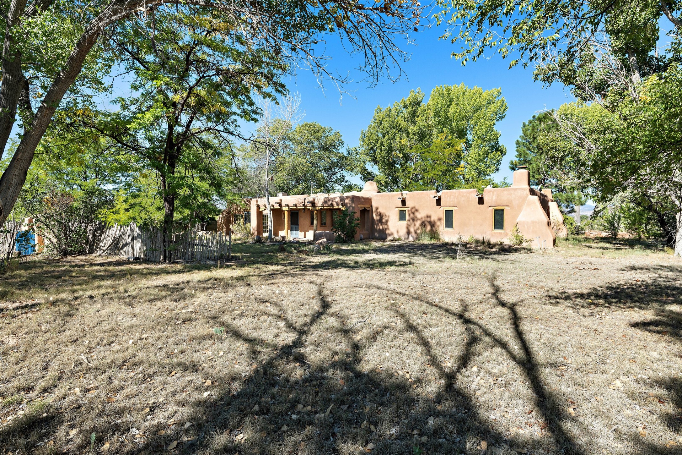 Nestled among old growth trees in a pastoral setting on over five acres, this 1985 classic adobe home has all the charming elements of quintessential Southwestern style, including four kiva fireplaces, expansive front and rear portals, plaster walls, vigas throughout and appealing Mexican tile accents. Located in the Jacona Valley with easy commute to both Los Alamos and Santa Fe, the property is comprised of two legal lots of record and includes run-in barn and corral, and a delightful chapel. The custom front door opens to the great room with open floor plan and kiva fireplace. The ample kitchen with solid wood cabinets, center island and country farm sink has access to the rear portal with outdoor fireplace and extensive flagstone hardscape. From the portal, you can enjoy the lush rear garden area with pond and go over the enchanting bridge to a system of landscaped pathways throughout the grounds. An updated and expansive owner's suite with kiva fireplace has walk-in closets and sauna along with an elegant soaking tub plus shower. In addition to the three bedrooms, there is a large family room with lots of natural light and cozy wood stove. All on one level in a neighborhood of similar homes, this versatile property is truly a gem with lovely outdoor spaces to enjoy year-round. Hoop house for gardening and outdoor storage units convey. Property is held in a trust estate and is being sold "as-is."