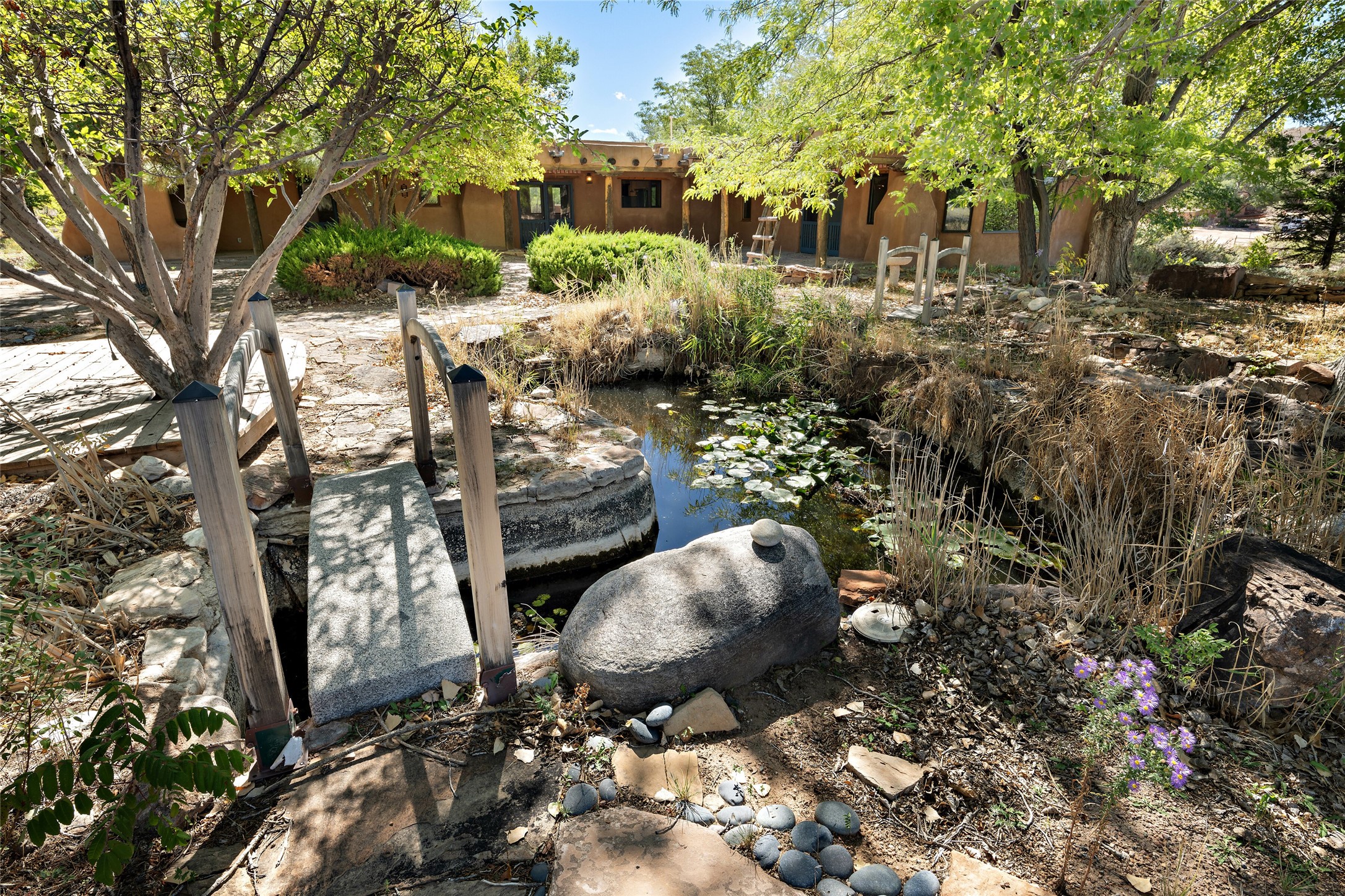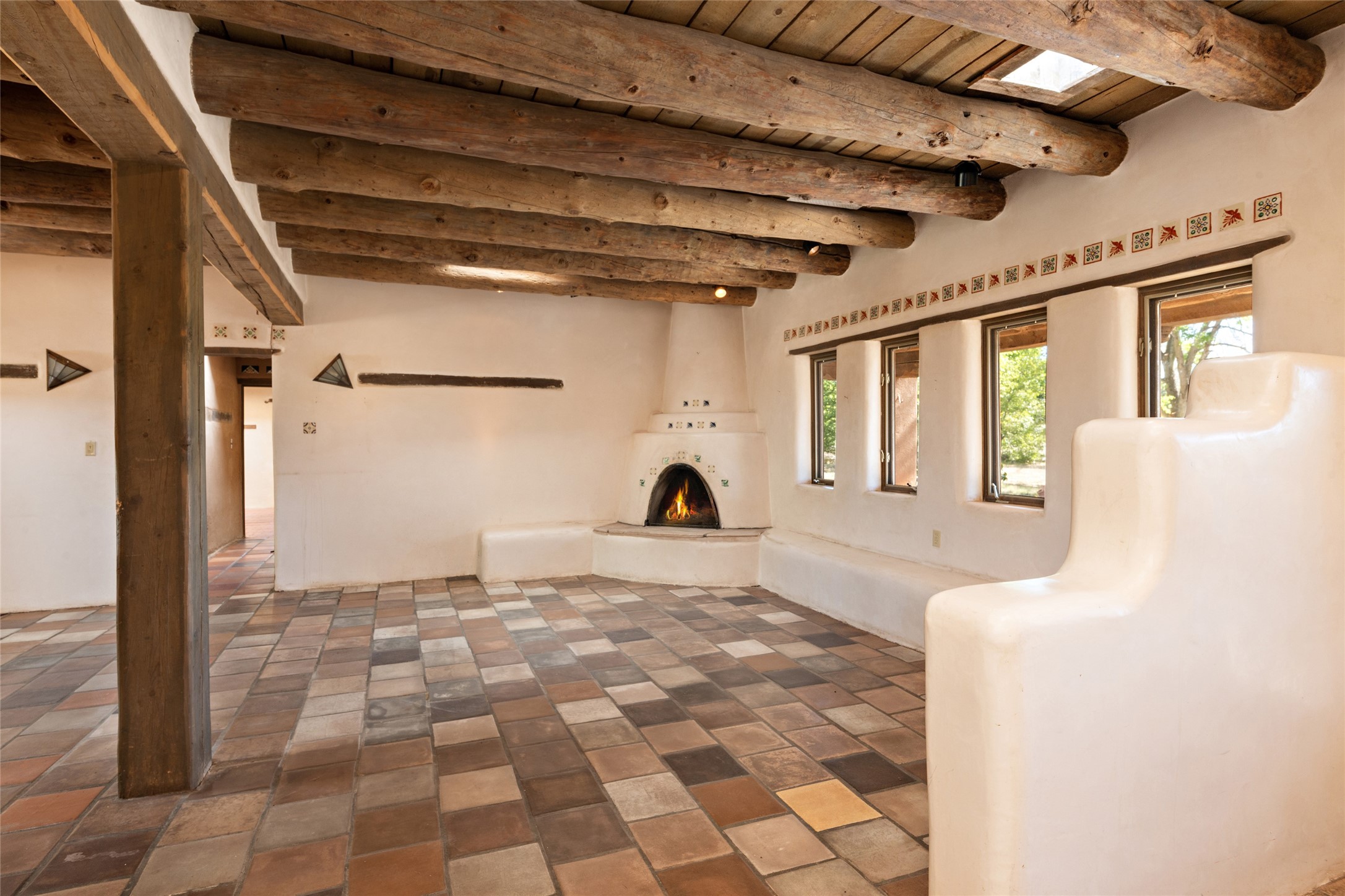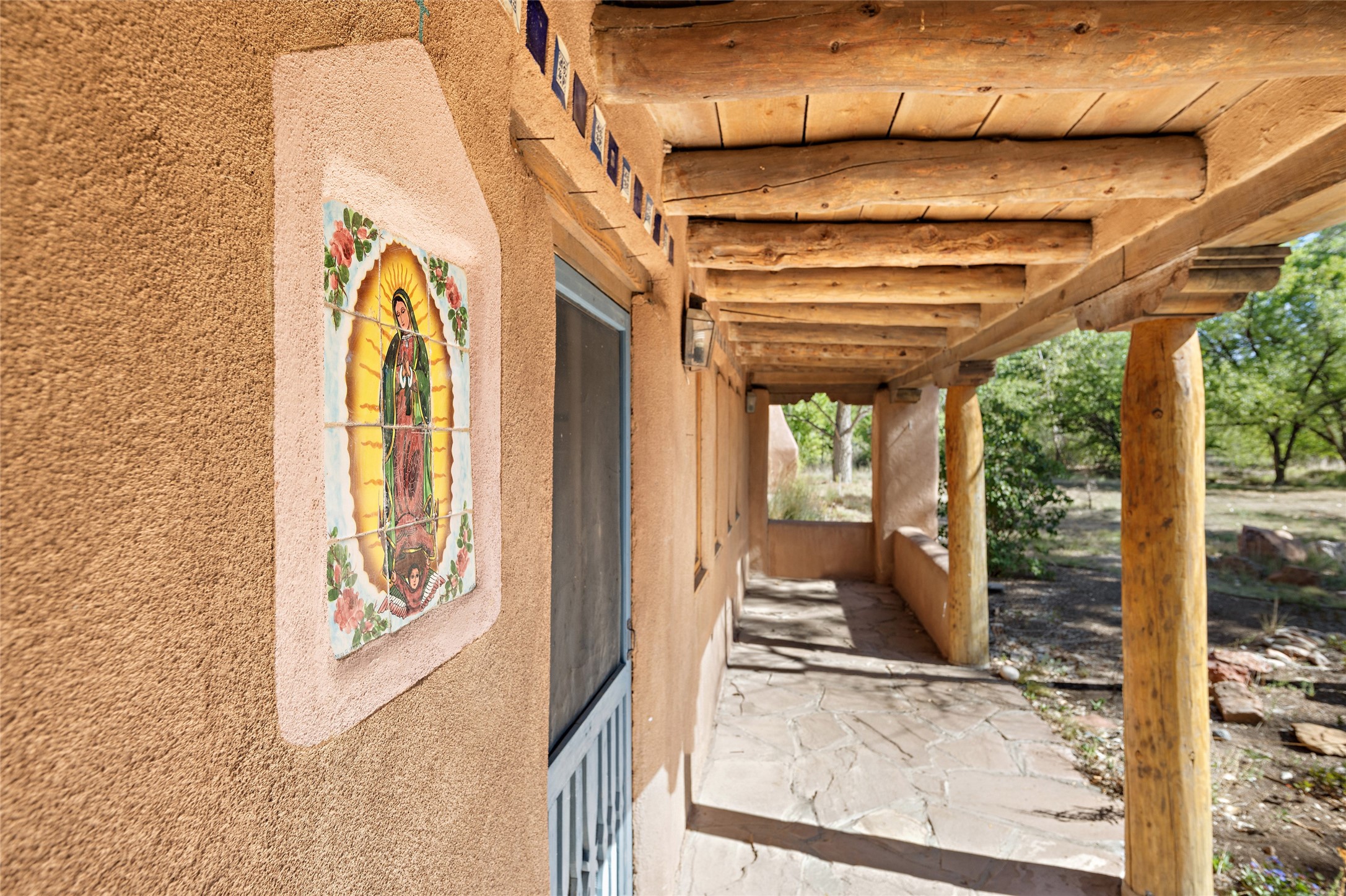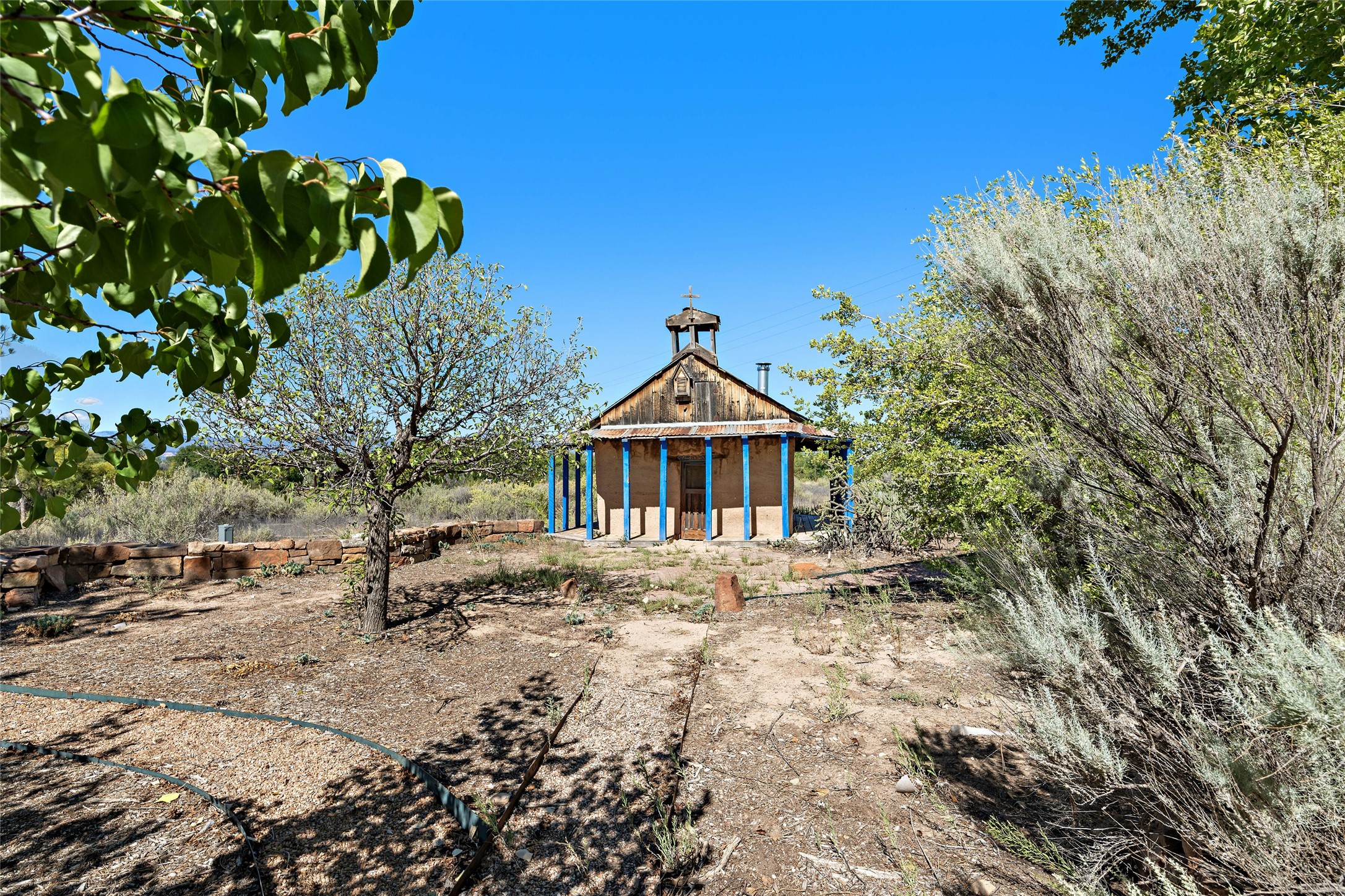 Nestled among old growth trees in a pastoral setting on over five acres, this 1985 classic adobe home has all the charming elements of quintessential Southwestern style, including four kiva fireplaces, expansive front and rear portals, plaster walls, vigas throughout and appealing Mexican tile accents. Located in the Jacona Valley with easy commute to both Los Alamos and Santa Fe, the property is comprised of two legal lots of record and includes run-in barn and corral, and a delightful chapel. The custom front door opens to the great room with open floor plan and kiva fireplace. The ample kitchen with solid wood cabinets, center island and country farm sink has access to the rear portal with outdoor fireplace and extensive flagstone hardscape. From the portal, you can enjoy the lush rear garden area with pond and go over the enchanting bridge to a system of landscaped pathways throughout the grounds. An updated and expansive owner's suite with kiva fireplace has walk-in closets and sauna along with an elegant soaking tub plus shower. In addition to the three bedrooms, there is a large family room with lots of natural light and cozy wood stove. All on one level in a neighborhood of similar homes, this versatile property is truly a gem with lovely outdoor spaces to enjoy year-round. Hoop house for gardening and outdoor storage units convey. Property is held in a trust estate and is being sold "as-is."