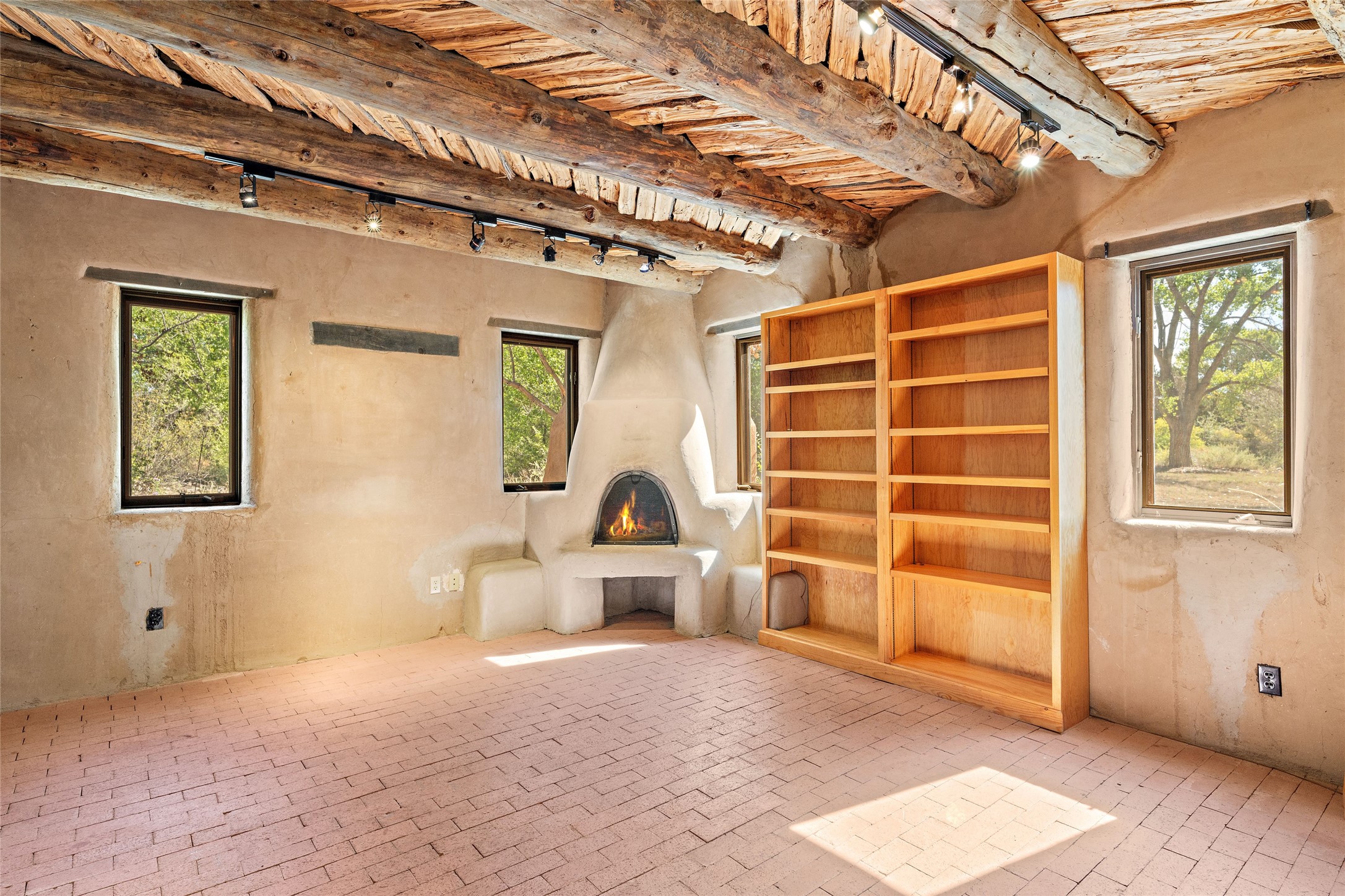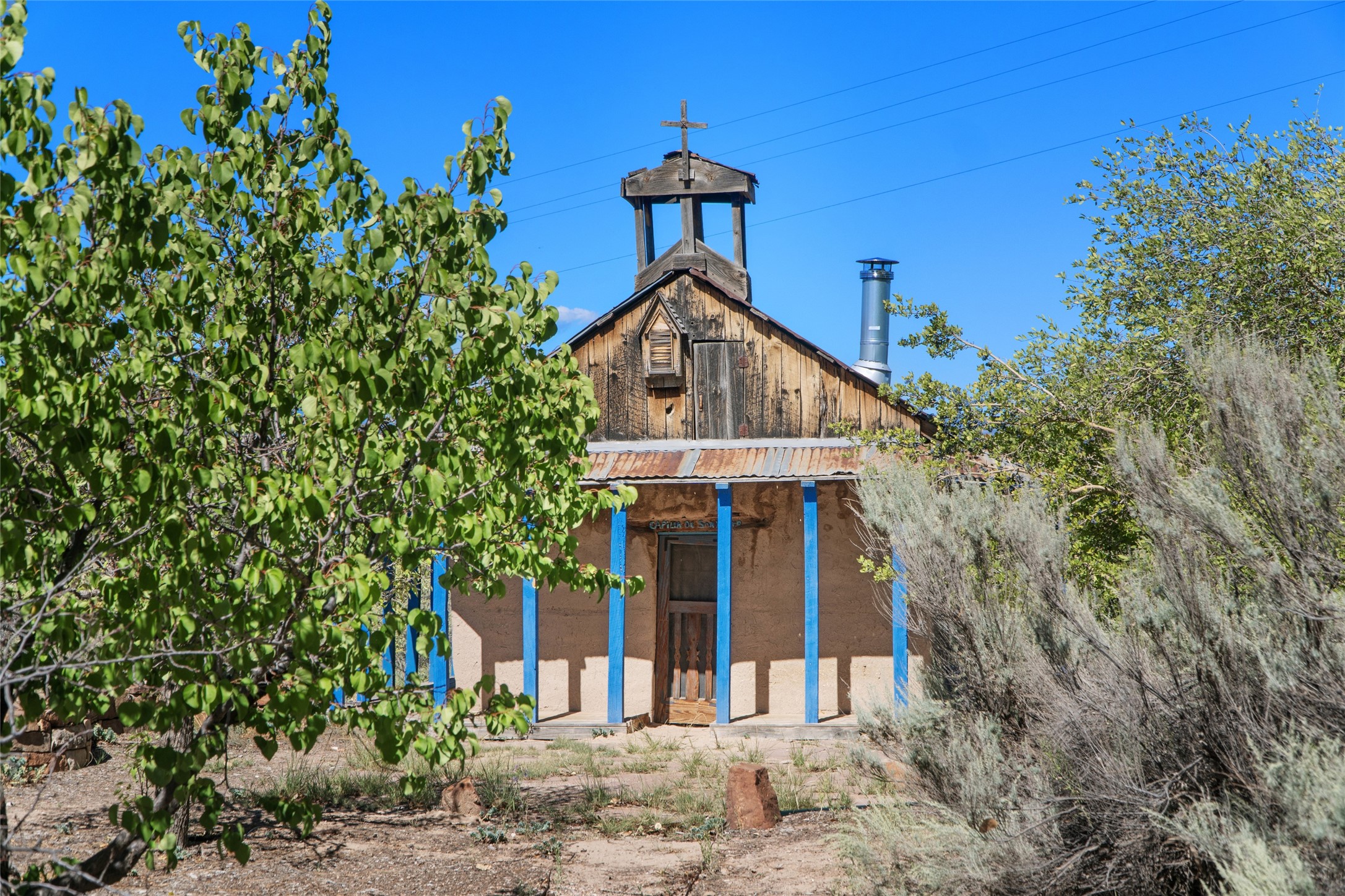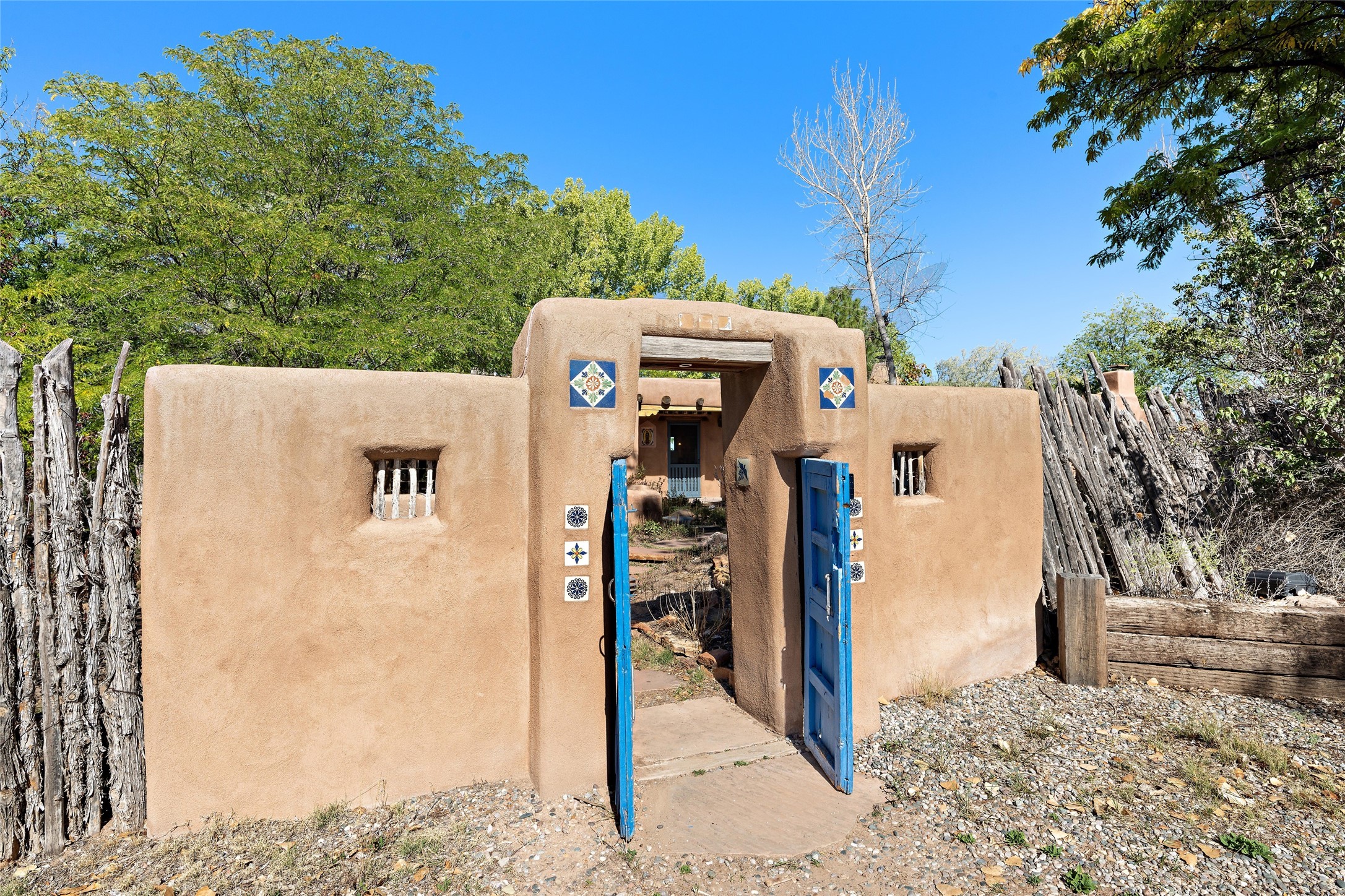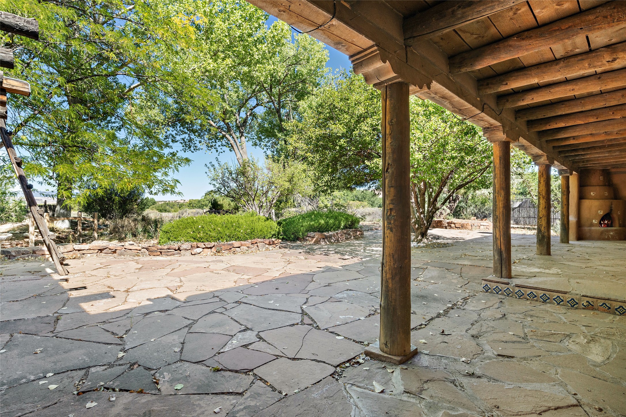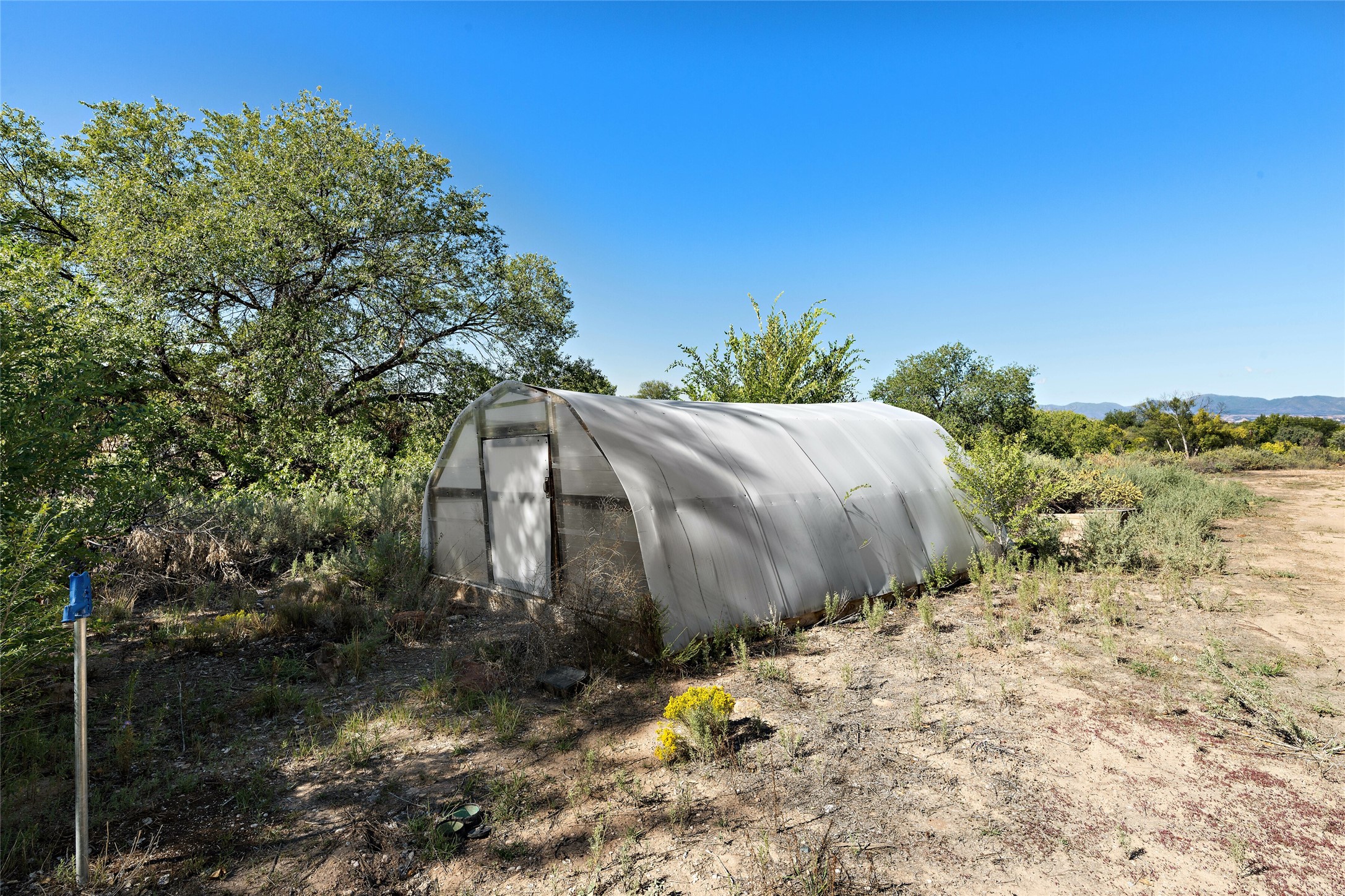 Nestled among old growth trees in a pastoral setting on over five acres, this 1985 classic adobe home has all the charming elements of quintessential Southwestern style, including four kiva fireplaces, expansive front and rear portals, plaster walls, vigas throughout and appealing Mexican tile accents. Located in the Jacona Valley with easy commute to both Los Alamos and Santa Fe, the property is comprised of two legal lots of record and includes run-in barn and corral, and a delightful chapel. The custom front door opens to the great room with open floor plan and kiva fireplace. The ample kitchen with solid wood cabinets, center island and country farm sink has access to the rear portal with outdoor fireplace and extensive flagstone hardscape. From the portal, you can enjoy the lush rear garden area with pond and go over the enchanting bridge to a system of landscaped pathways throughout the grounds. An updated and expansive owner's suite with kiva fireplace has walk-in closets and sauna along with an elegant soaking tub plus shower. In addition to the three bedrooms, there is a large family room with lots of natural light and cozy wood stove. All on one level in a neighborhood of similar homes, this versatile property is truly a gem with lovely outdoor spaces to enjoy year-round. Hoop house for gardening and outdoor storage units convey. Property is held in a trust estate and is being sold "as-is."