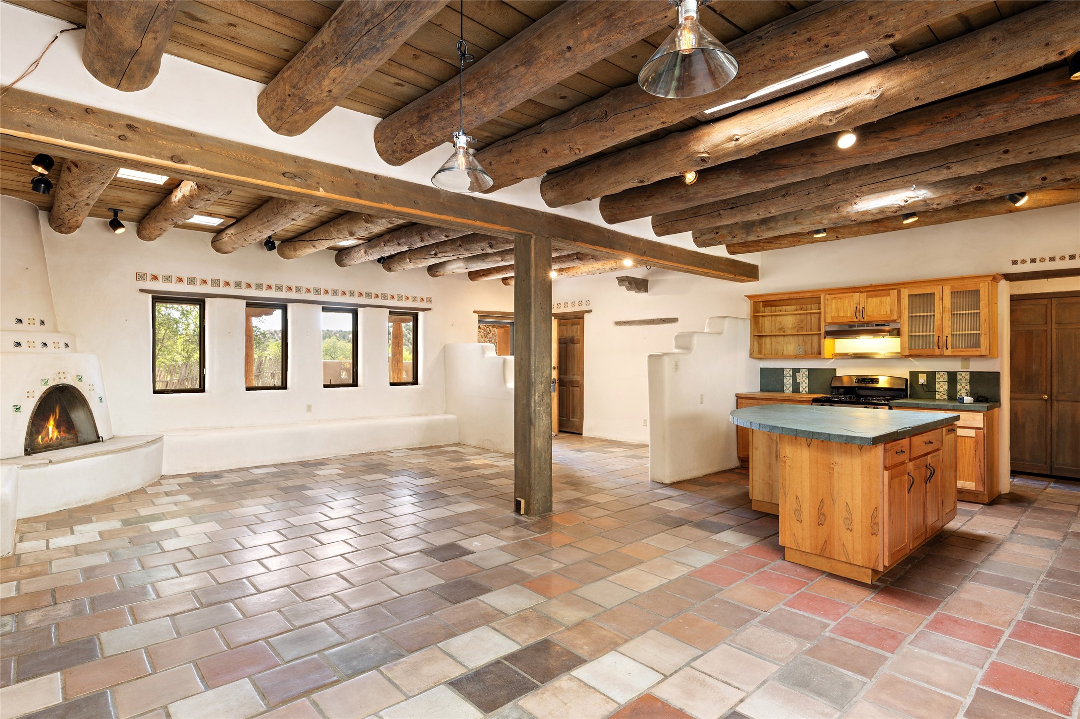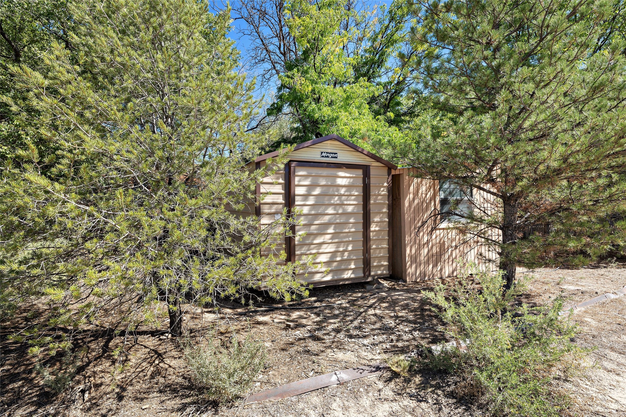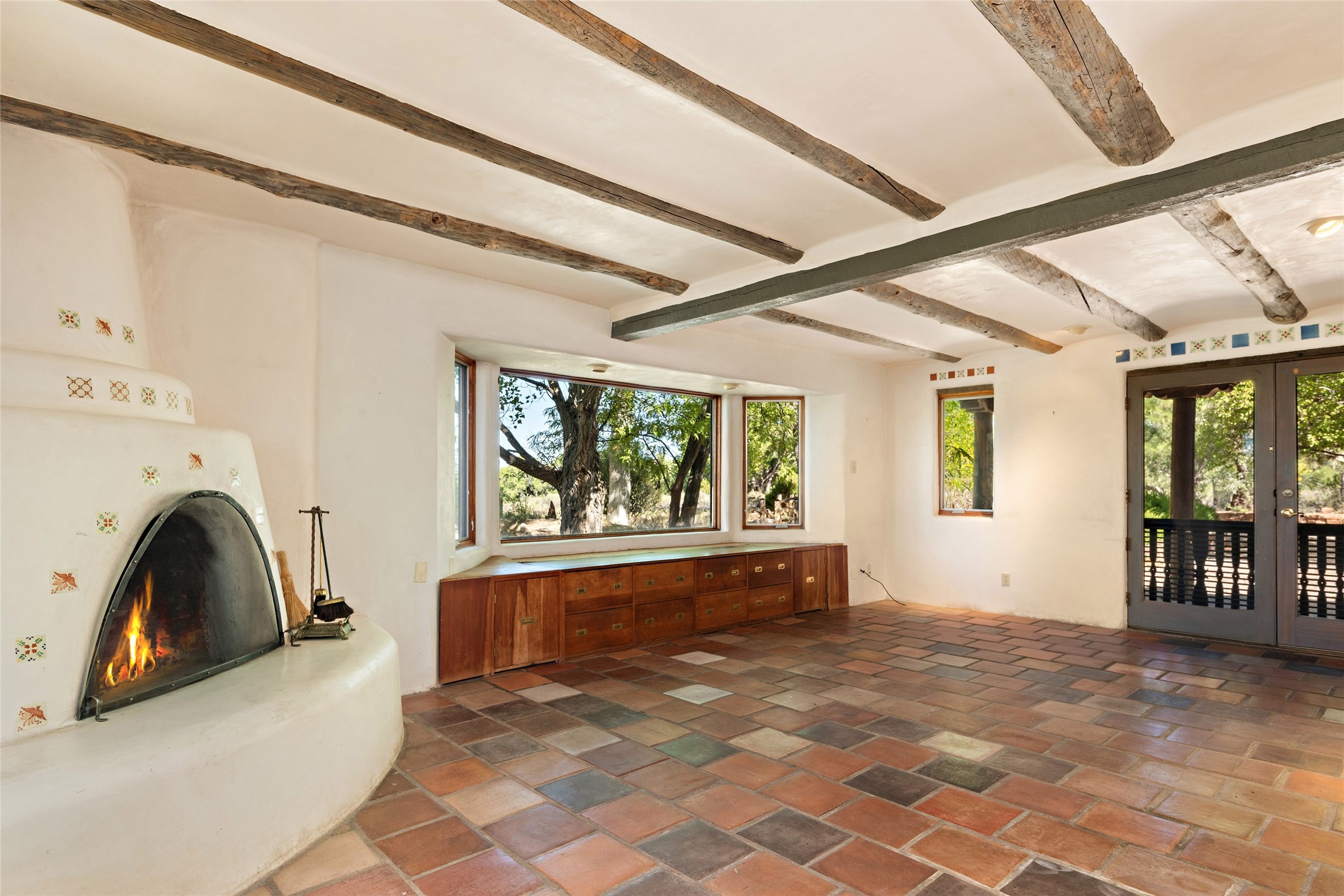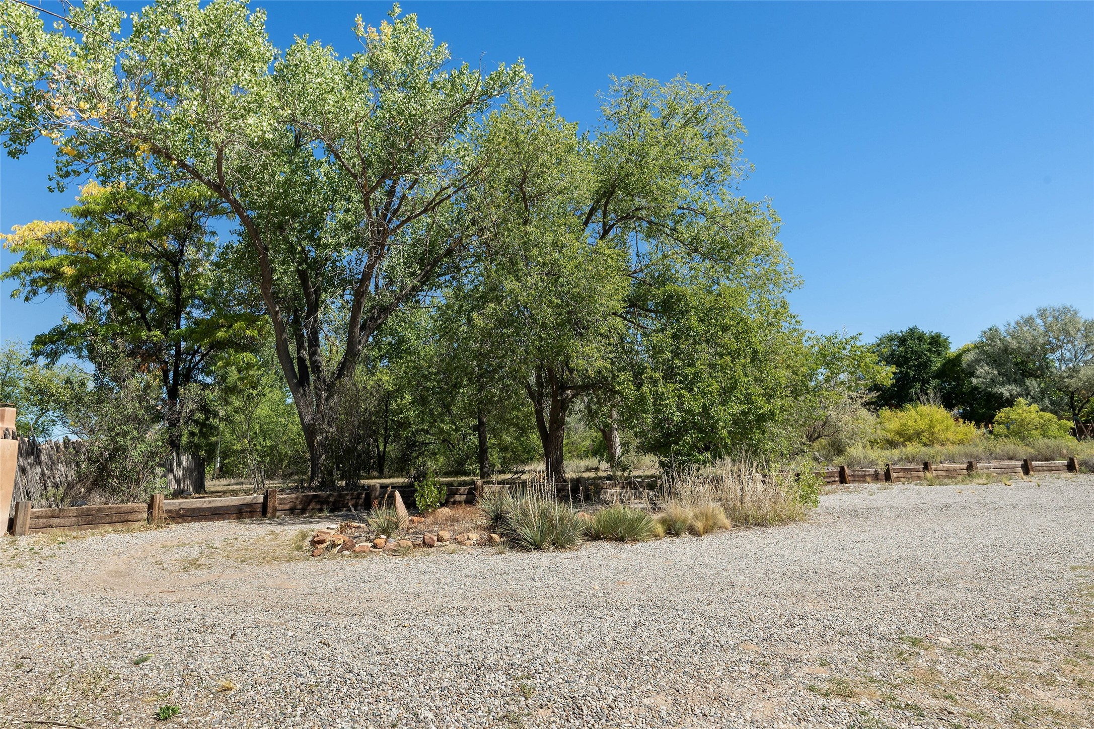 Nestled among old growth trees in a pastoral setting on over five acres, this 1985 classic adobe home has all the charming elements of quintessential Southwestern style, including four kiva fireplaces, expansive front and rear portals, plaster walls, vigas throughout and appealing Mexican tile accents. Located in the Jacona Valley with easy commute to both Los Alamos and Santa Fe, the property is comprised of two legal lots of record and includes run-in barn and corral, and a delightful chapel. The custom front door opens to the great room with open floor plan and kiva fireplace. The ample kitchen with solid wood cabinets, center island and country farm sink has access to the rear portal with outdoor fireplace and extensive flagstone hardscape. From the portal, you can enjoy the lush rear garden area with pond and go over the enchanting bridge to a system of landscaped pathways throughout the grounds. An updated and expansive owner's suite with kiva fireplace has walk-in closets and sauna along with an elegant soaking tub plus shower. In addition to the three bedrooms, there is a large family room with lots of natural light and cozy wood stove. All on one level in a neighborhood of similar homes, this versatile property is truly a gem with lovely outdoor spaces to enjoy year-round. Hoop house for gardening and outdoor storage units convey. Property is held in a trust estate and is being sold "as-is."