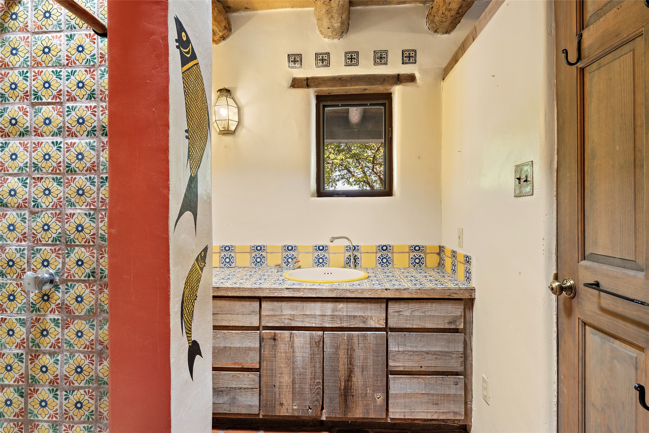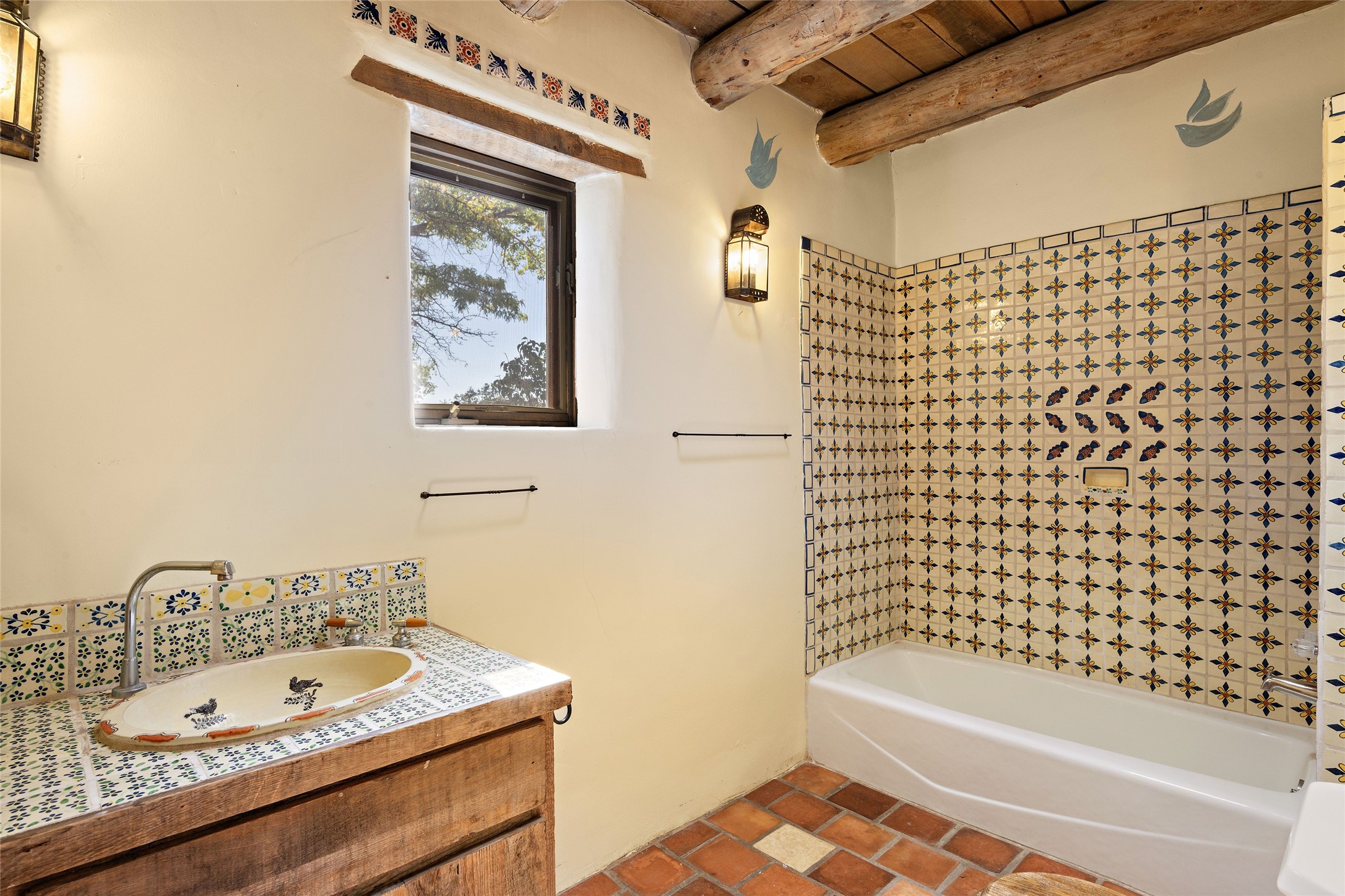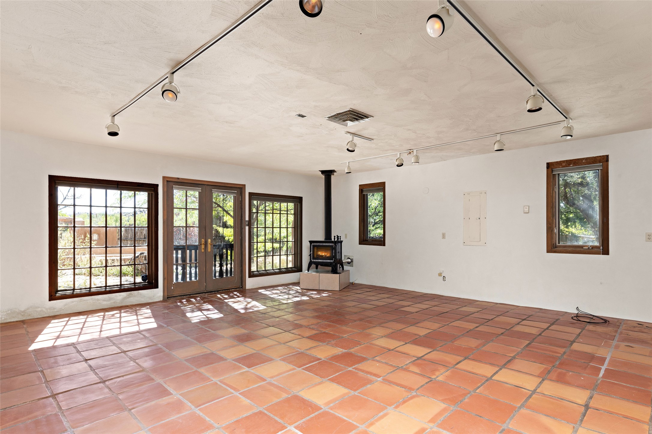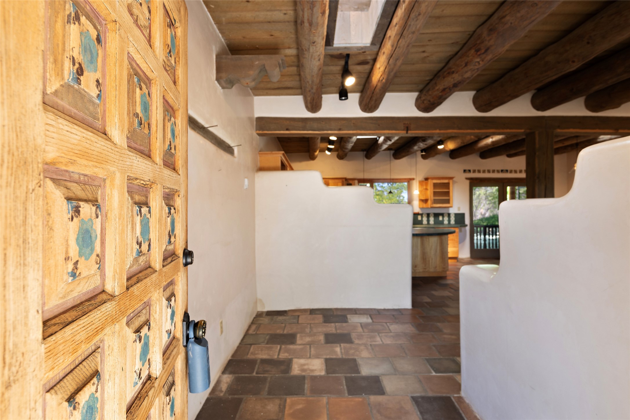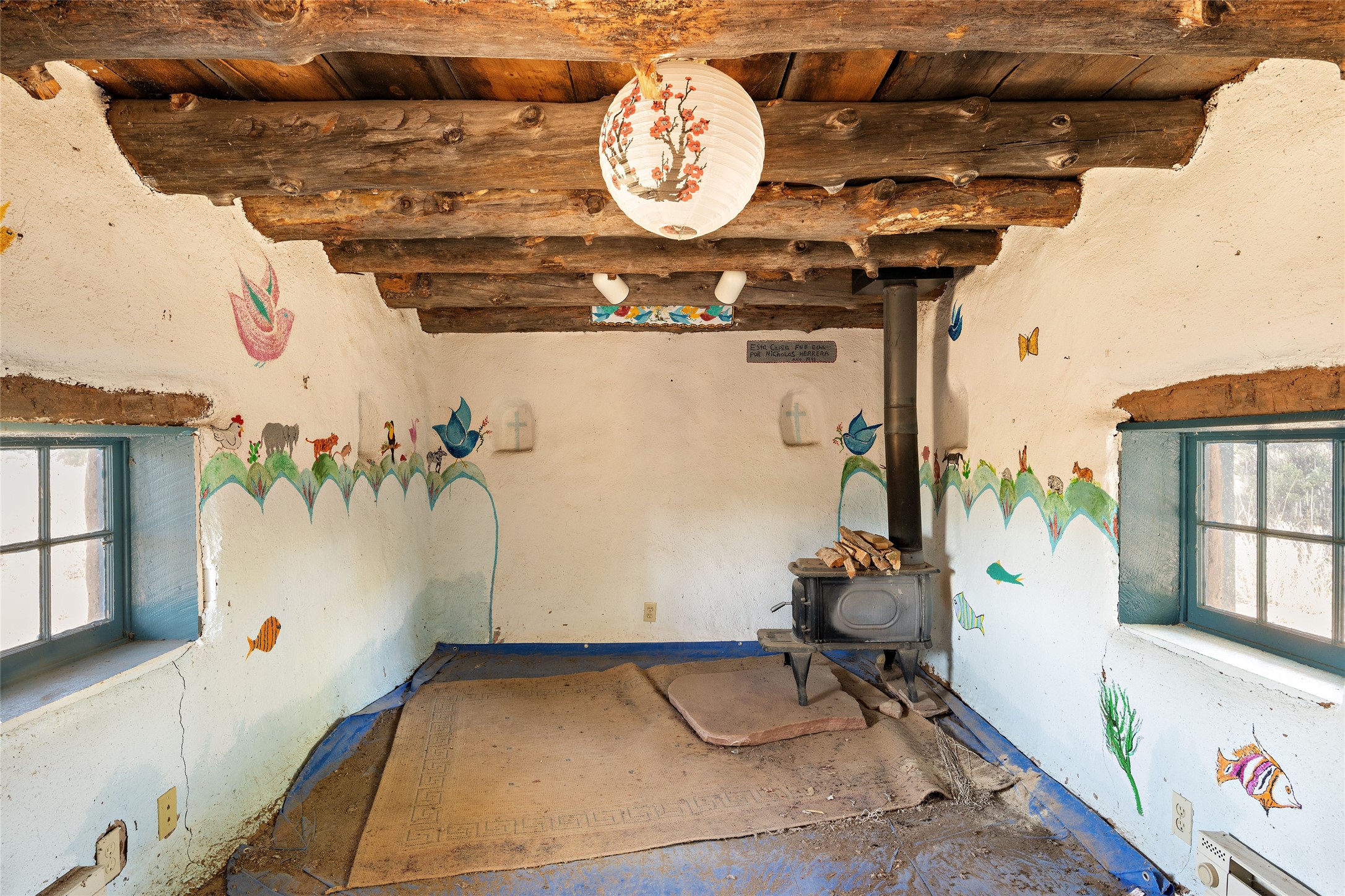 Nestled among old growth trees in a pastoral setting on over five acres, this 1985 classic adobe home has all the charming elements of quintessential Southwestern style, including four kiva fireplaces, expansive front and rear portals, plaster walls, vigas throughout and appealing Mexican tile accents. Located in the Jacona Valley with easy commute to both Los Alamos and Santa Fe, the property is comprised of two legal lots of record and includes run-in barn and corral, and a delightful chapel. The custom front door opens to the great room with open floor plan and kiva fireplace. The ample kitchen with solid wood cabinets, center island and country farm sink has access to the rear portal with outdoor fireplace and extensive flagstone hardscape. From the portal, you can enjoy the lush rear garden area with pond and go over the enchanting bridge to a system of landscaped pathways throughout the grounds. An updated and expansive owner's suite with kiva fireplace has walk-in closets and sauna along with an elegant soaking tub plus shower. In addition to the three bedrooms, there is a large family room with lots of natural light and cozy wood stove. All on one level in a neighborhood of similar homes, this versatile property is truly a gem with lovely outdoor spaces to enjoy year-round. Hoop house for gardening and outdoor storage units convey. Property is held in a trust estate and is being sold "as-is."