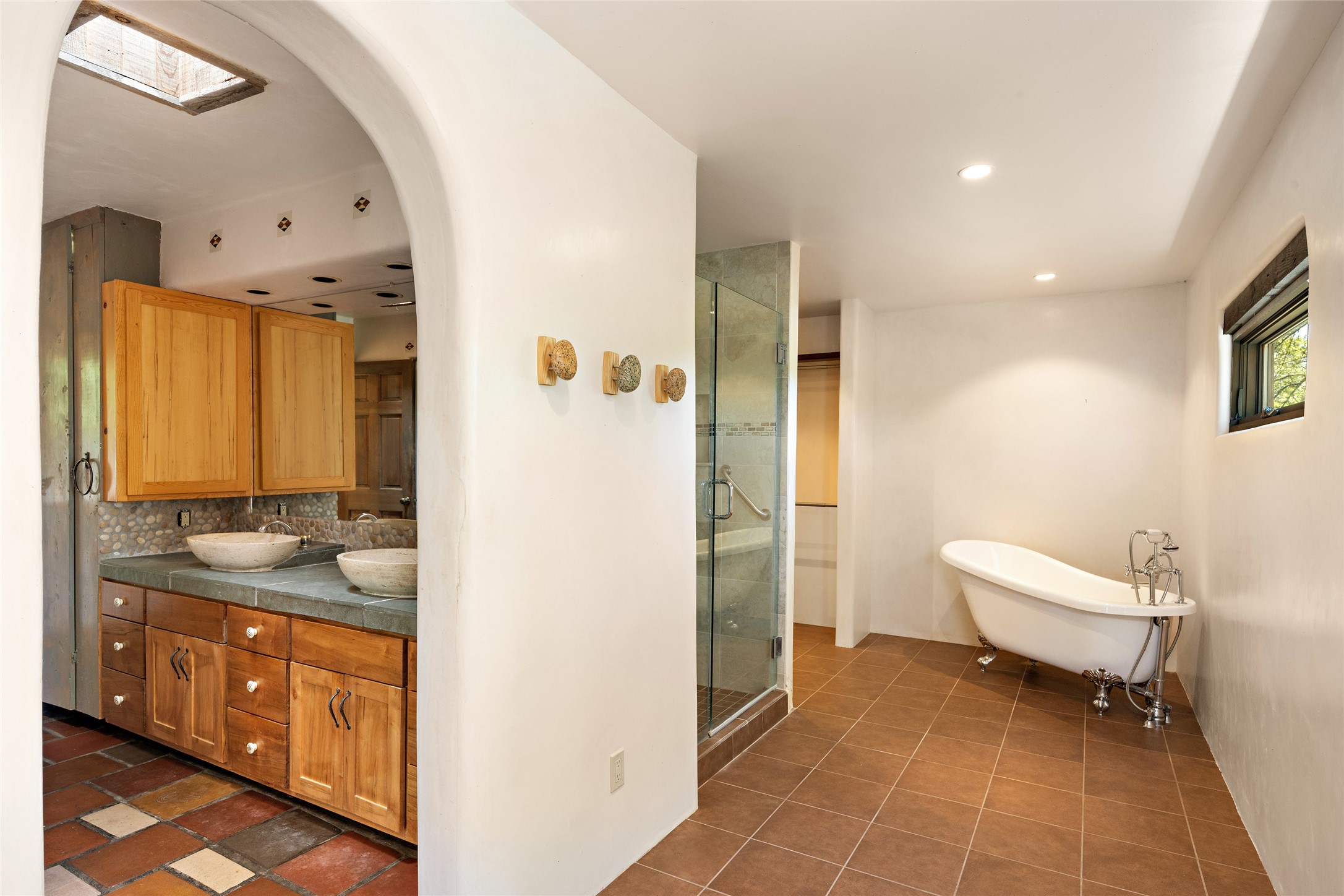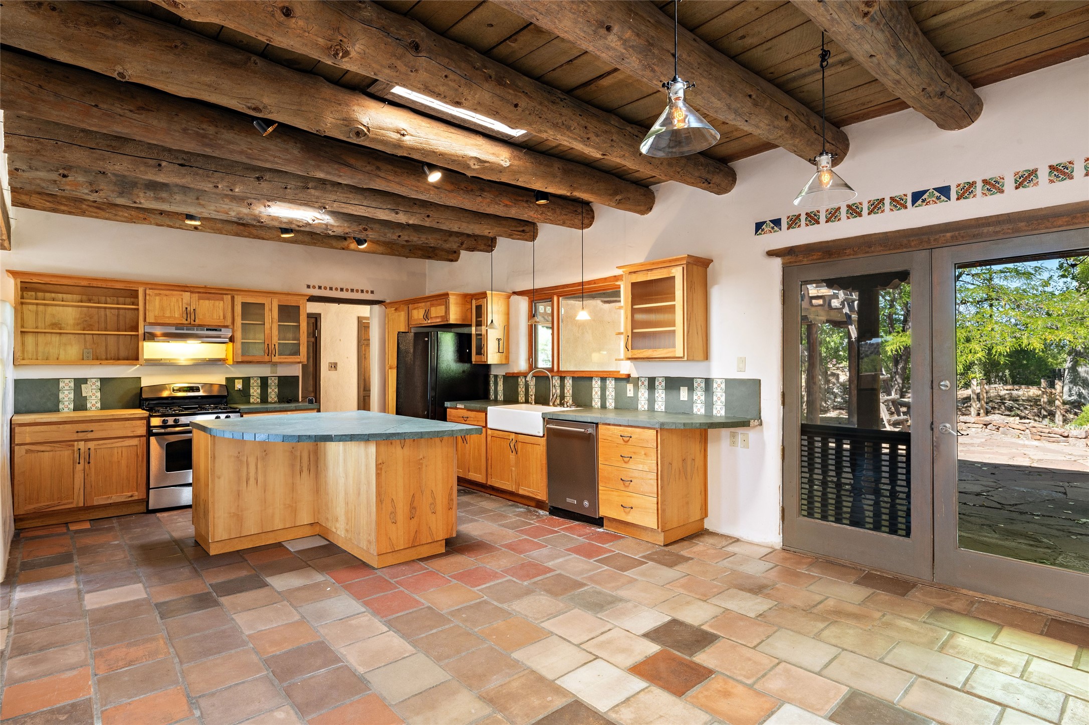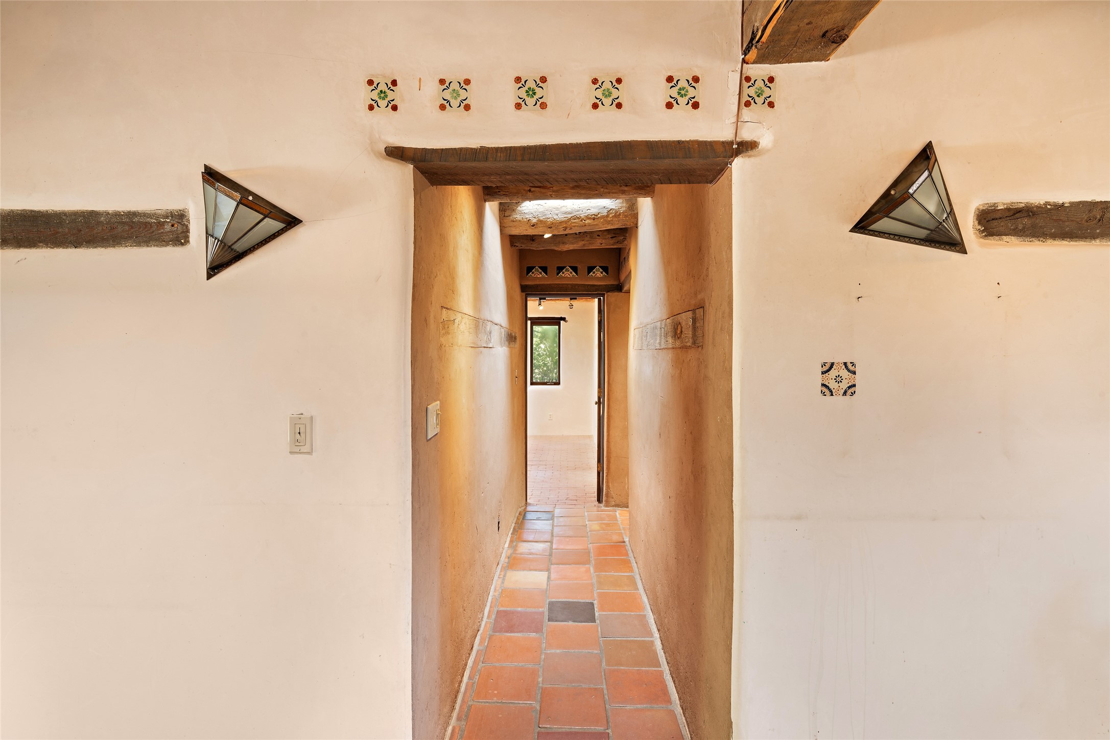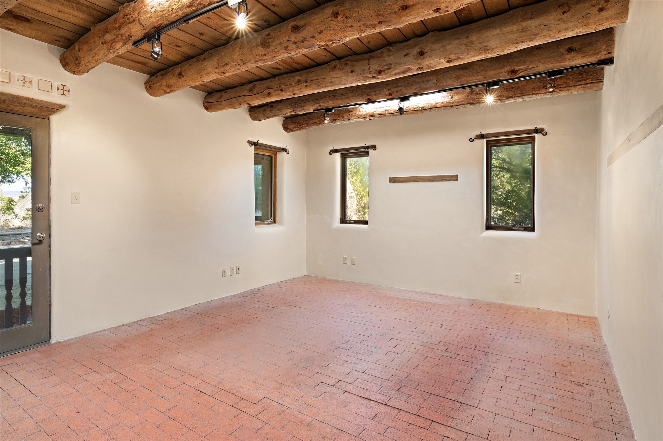 Nestled among old growth trees in a pastoral setting on over five acres, this 1985 classic adobe home has all the charming elements of quintessential Southwestern style, including four kiva fireplaces, expansive front and rear portals, plaster walls, vigas throughout and appealing Mexican tile accents. Located in the Jacona Valley with easy commute to both Los Alamos and Santa Fe, the property is comprised of two legal lots of record and includes run-in barn and corral, and a delightful chapel. The custom front door opens to the great room with open floor plan and kiva fireplace. The ample kitchen with solid wood cabinets, center island and country farm sink has access to the rear portal with outdoor fireplace and extensive flagstone hardscape. From the portal, you can enjoy the lush rear garden area with pond and go over the enchanting bridge to a system of landscaped pathways throughout the grounds. An updated and expansive owner's suite with kiva fireplace has walk-in closets and sauna along with an elegant soaking tub plus shower. In addition to the three bedrooms, there is a large family room with lots of natural light and cozy wood stove. All on one level in a neighborhood of similar homes, this versatile property is truly a gem with lovely outdoor spaces to enjoy year-round. Hoop house for gardening and outdoor storage units convey. Property is held in a trust estate and is being sold "as-is."