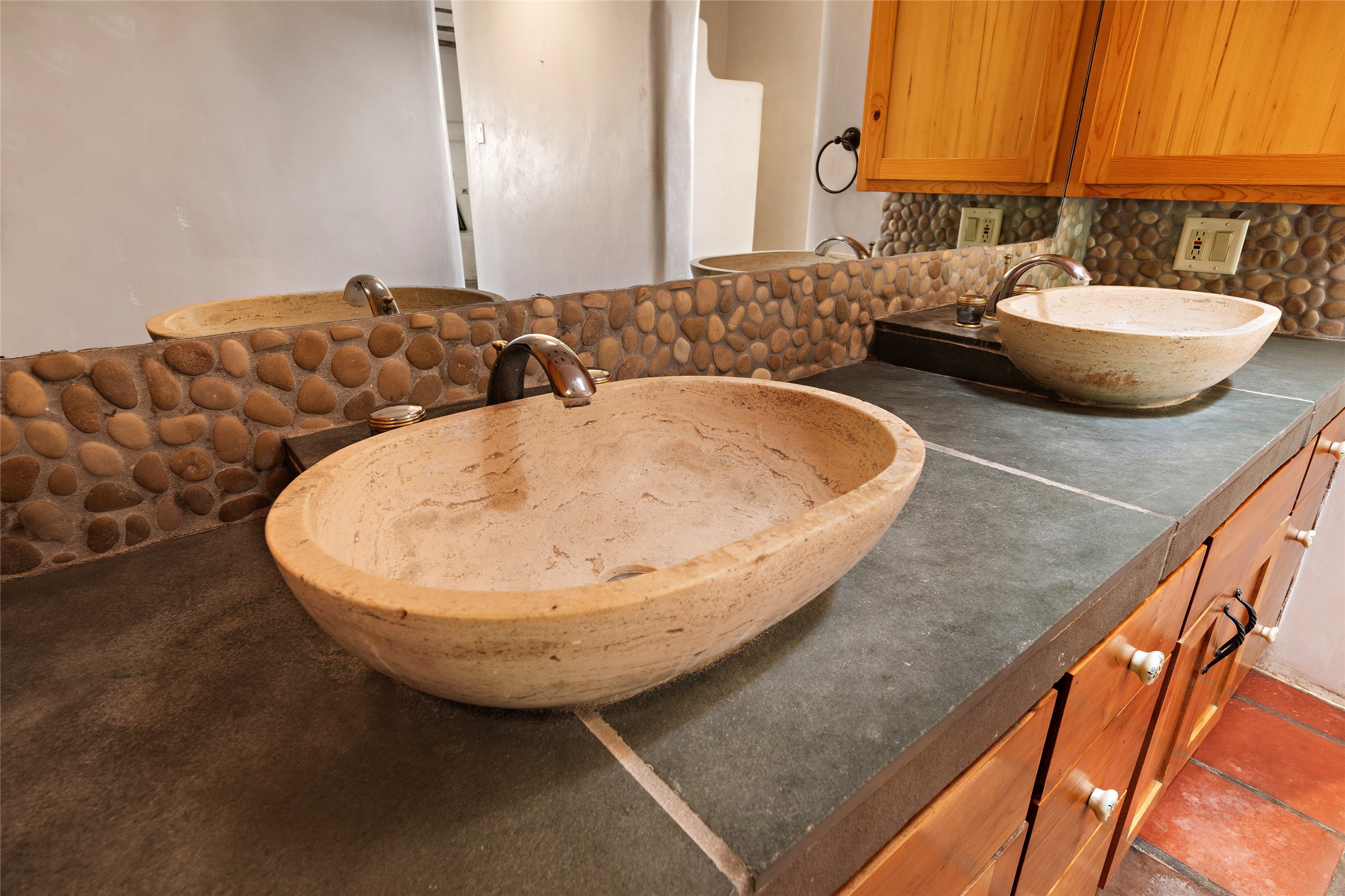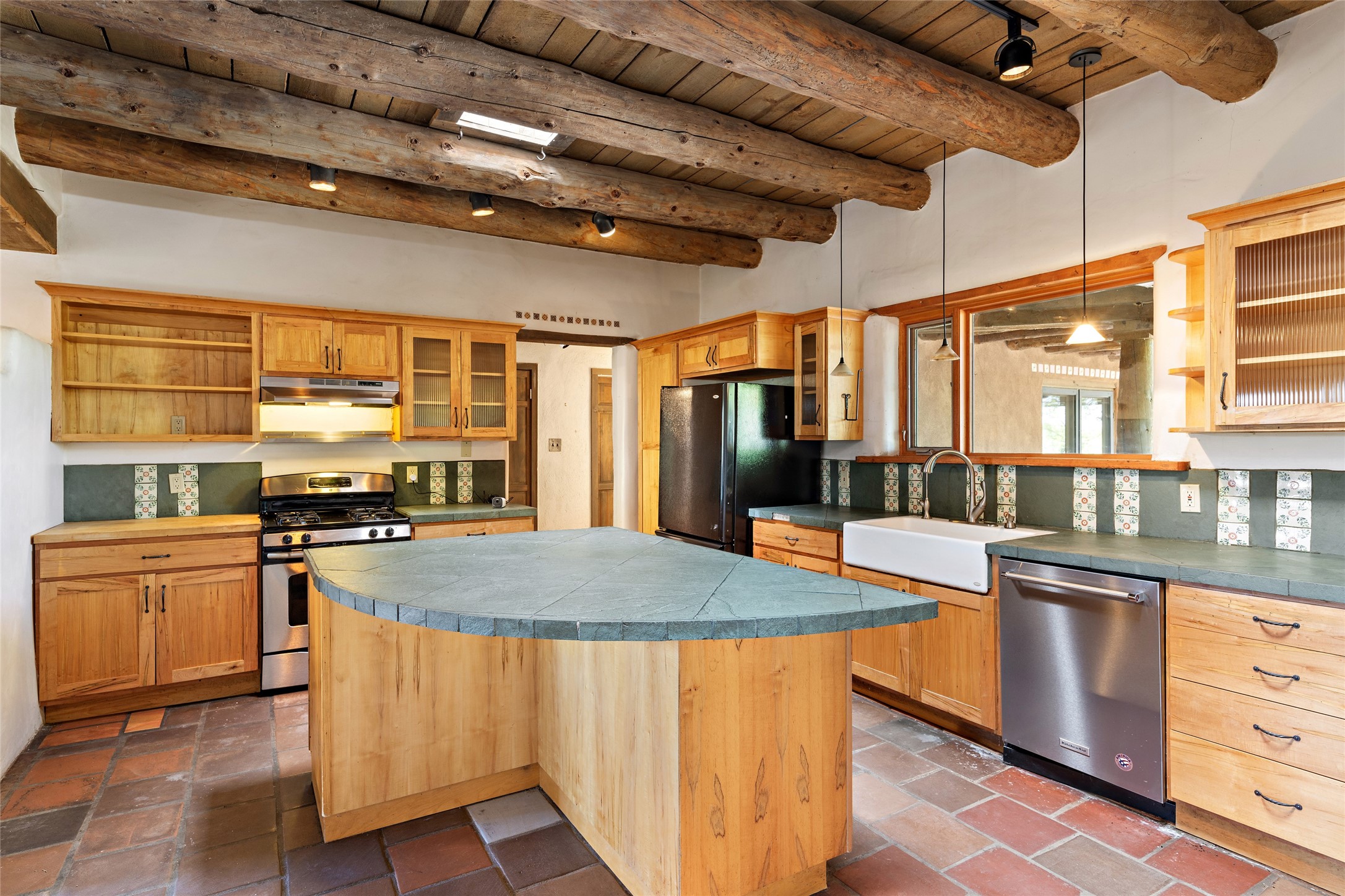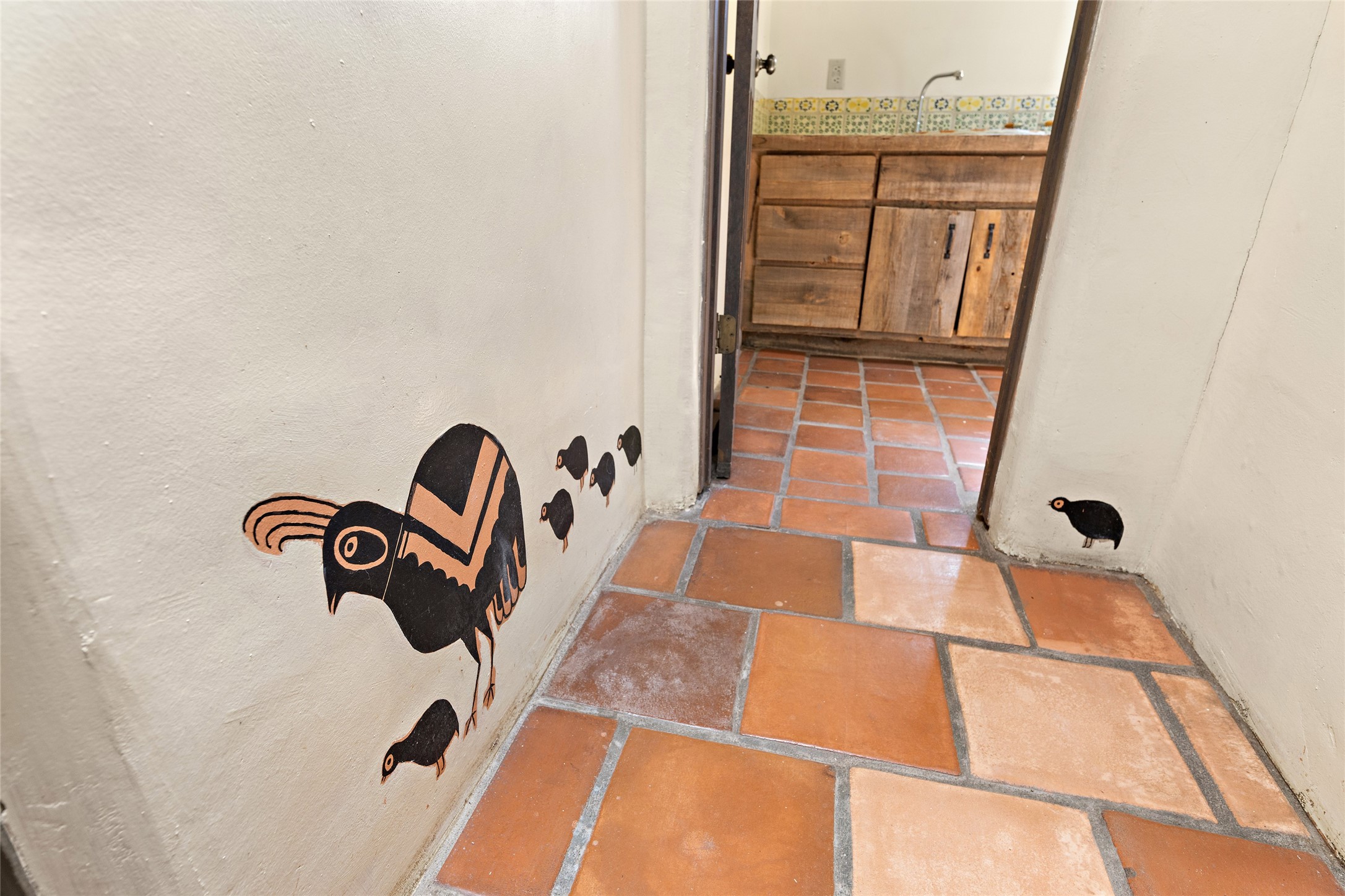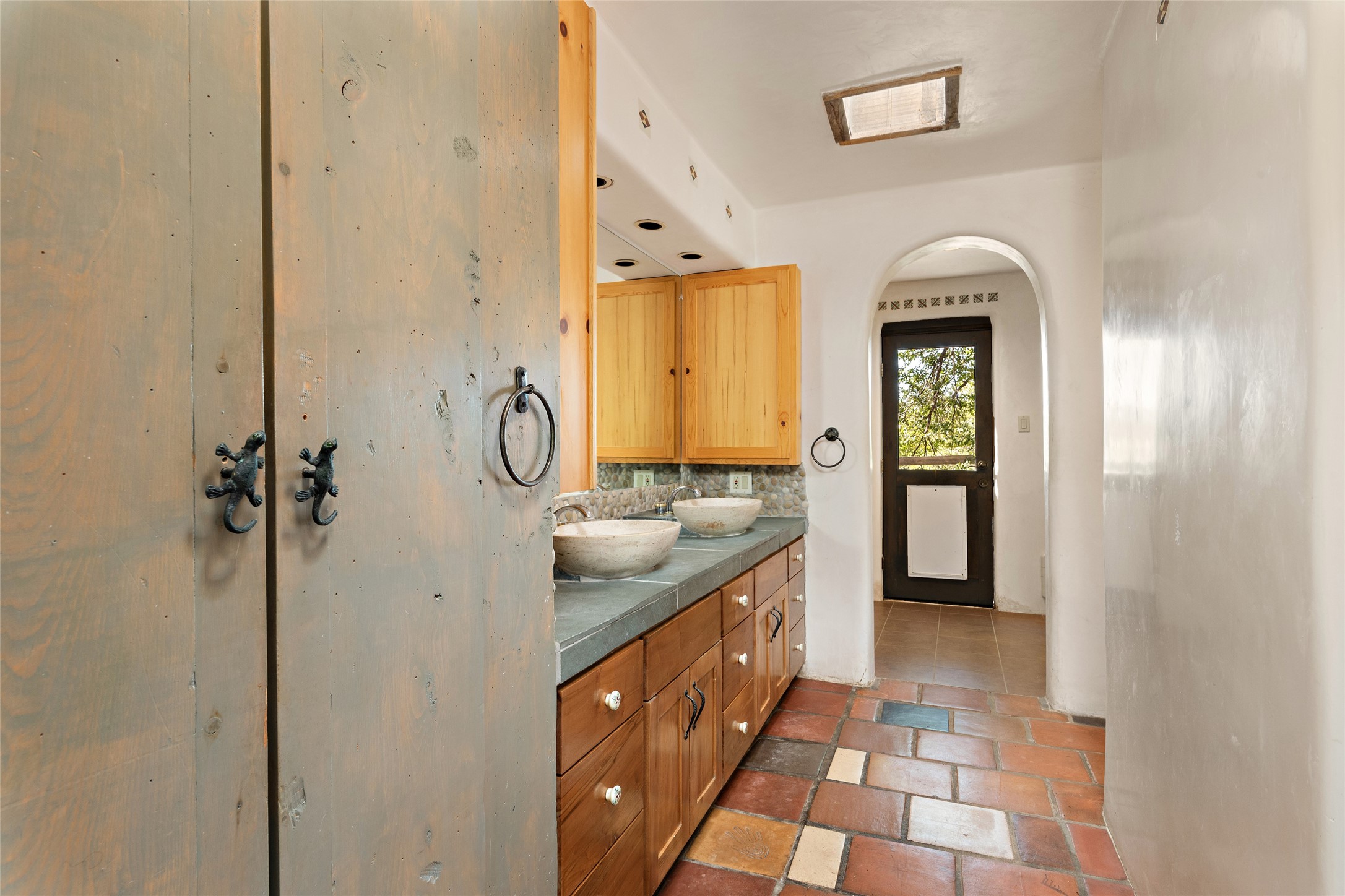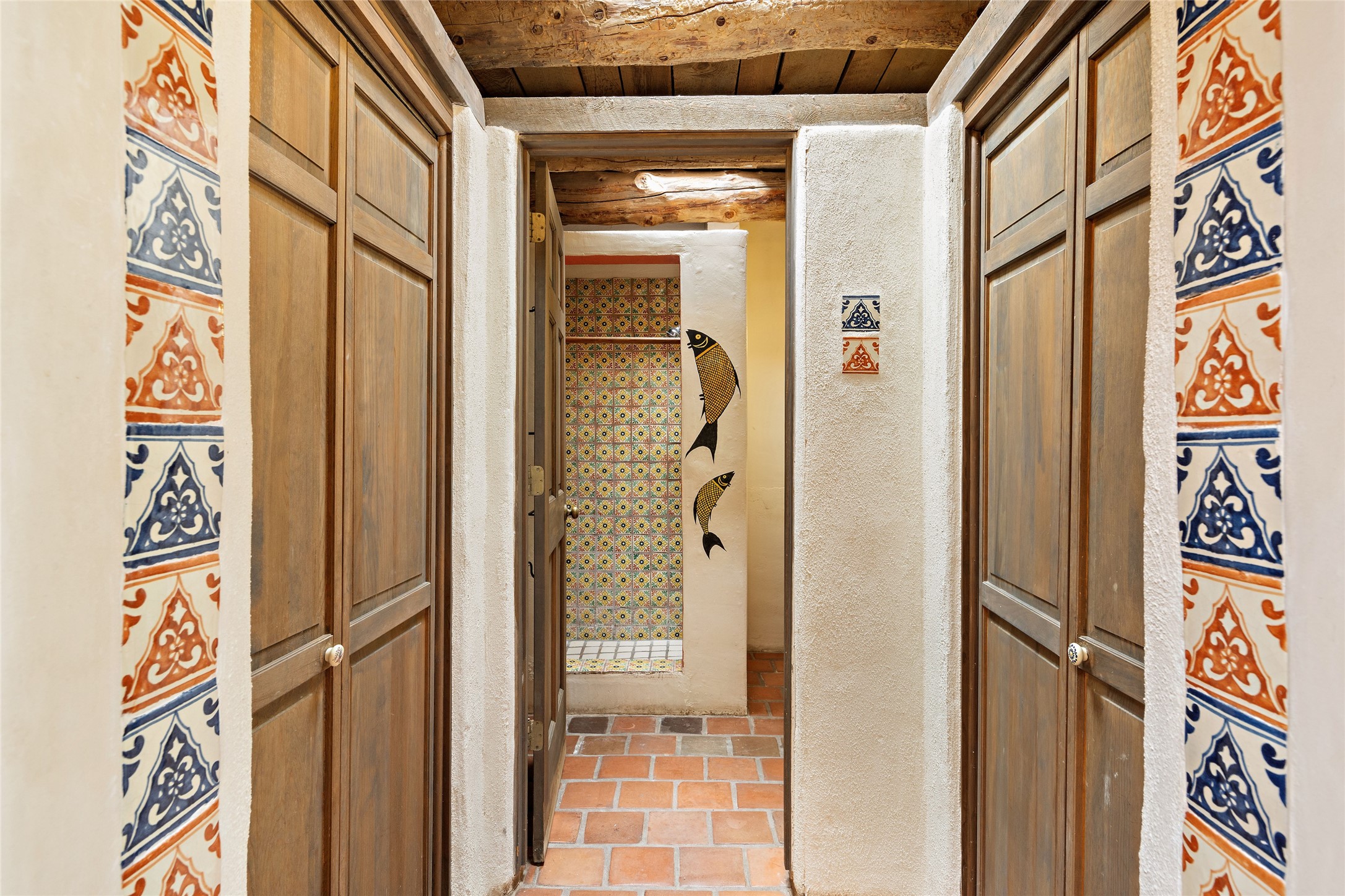 Nestled among old growth trees in a pastoral setting on over five acres, this 1985 classic adobe home has all the charming elements of quintessential Southwestern style, including four kiva fireplaces, expansive front and rear portals, plaster walls, vigas throughout and appealing Mexican tile accents. Located in the Jacona Valley with easy commute to both Los Alamos and Santa Fe, the property is comprised of two legal lots of record and includes run-in barn and corral, and a delightful chapel. The custom front door opens to the great room with open floor plan and kiva fireplace. The ample kitchen with solid wood cabinets, center island and country farm sink has access to the rear portal with outdoor fireplace and extensive flagstone hardscape. From the portal, you can enjoy the lush rear garden area with pond and go over the enchanting bridge to a system of landscaped pathways throughout the grounds. An updated and expansive owner's suite with kiva fireplace has walk-in closets and sauna along with an elegant soaking tub plus shower. In addition to the three bedrooms, there is a large family room with lots of natural light and cozy wood stove. All on one level in a neighborhood of similar homes, this versatile property is truly a gem with lovely outdoor spaces to enjoy year-round. Hoop house for gardening and outdoor storage units convey. Property is held in a trust estate and is being sold "as-is."