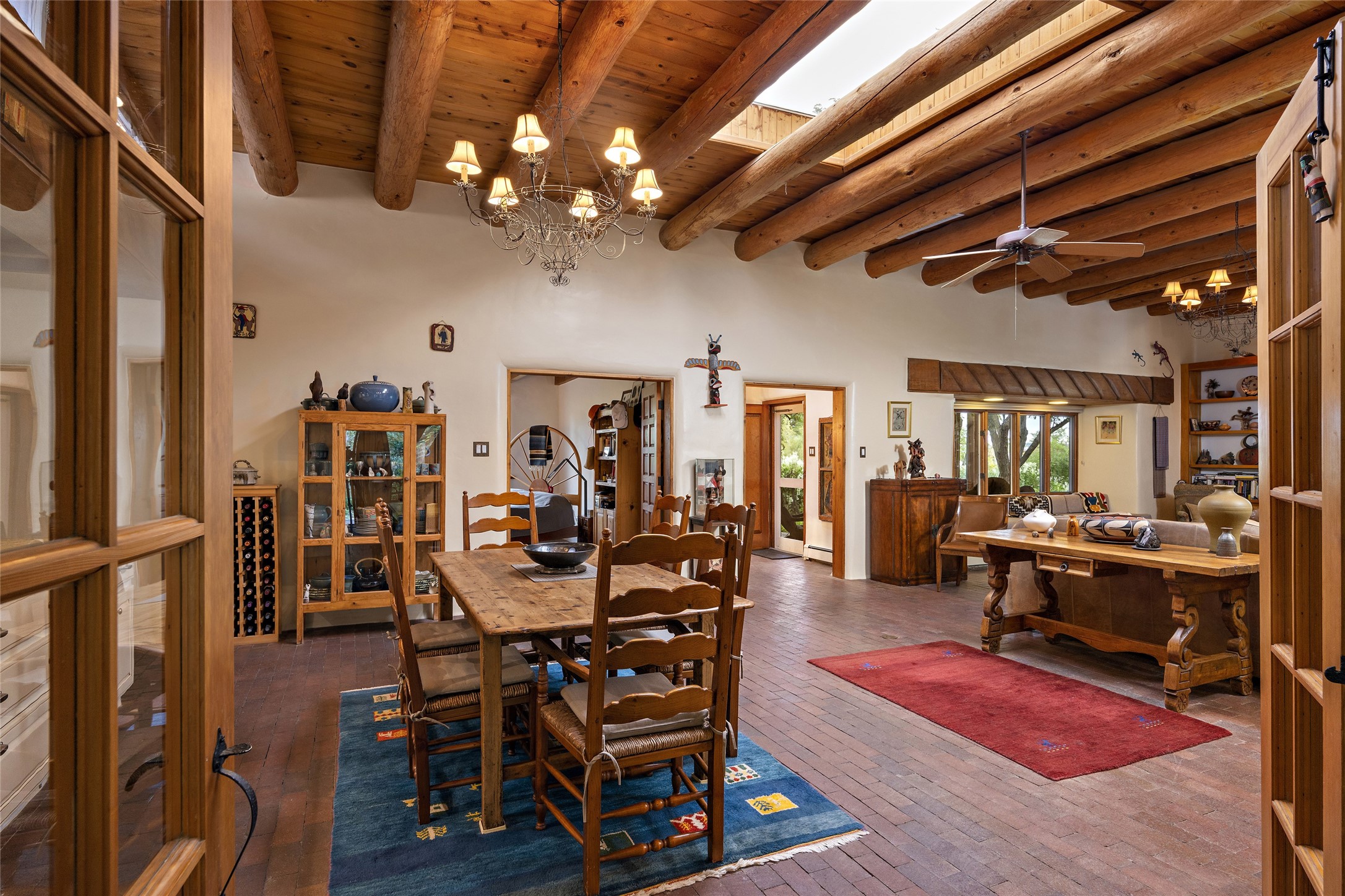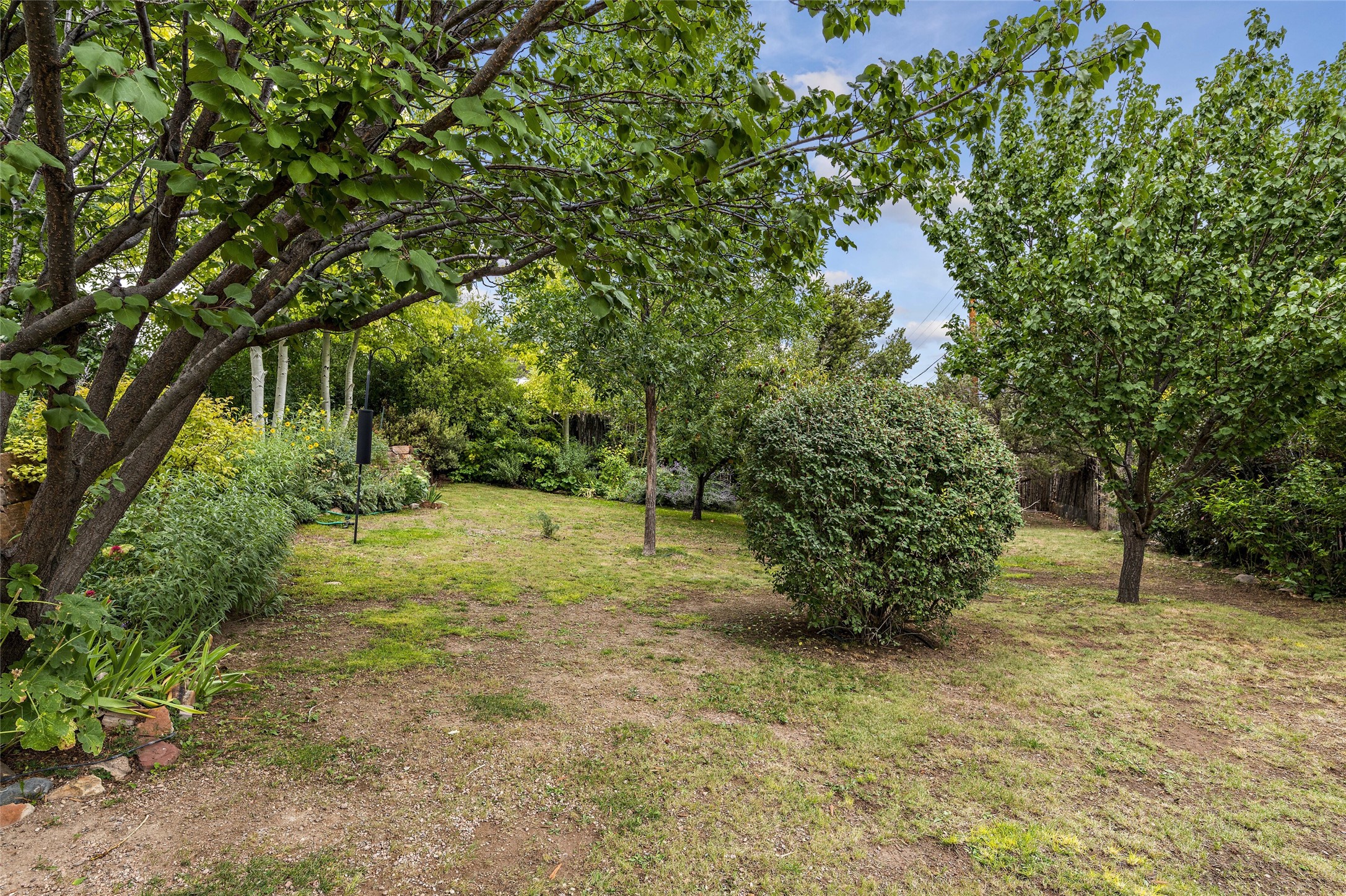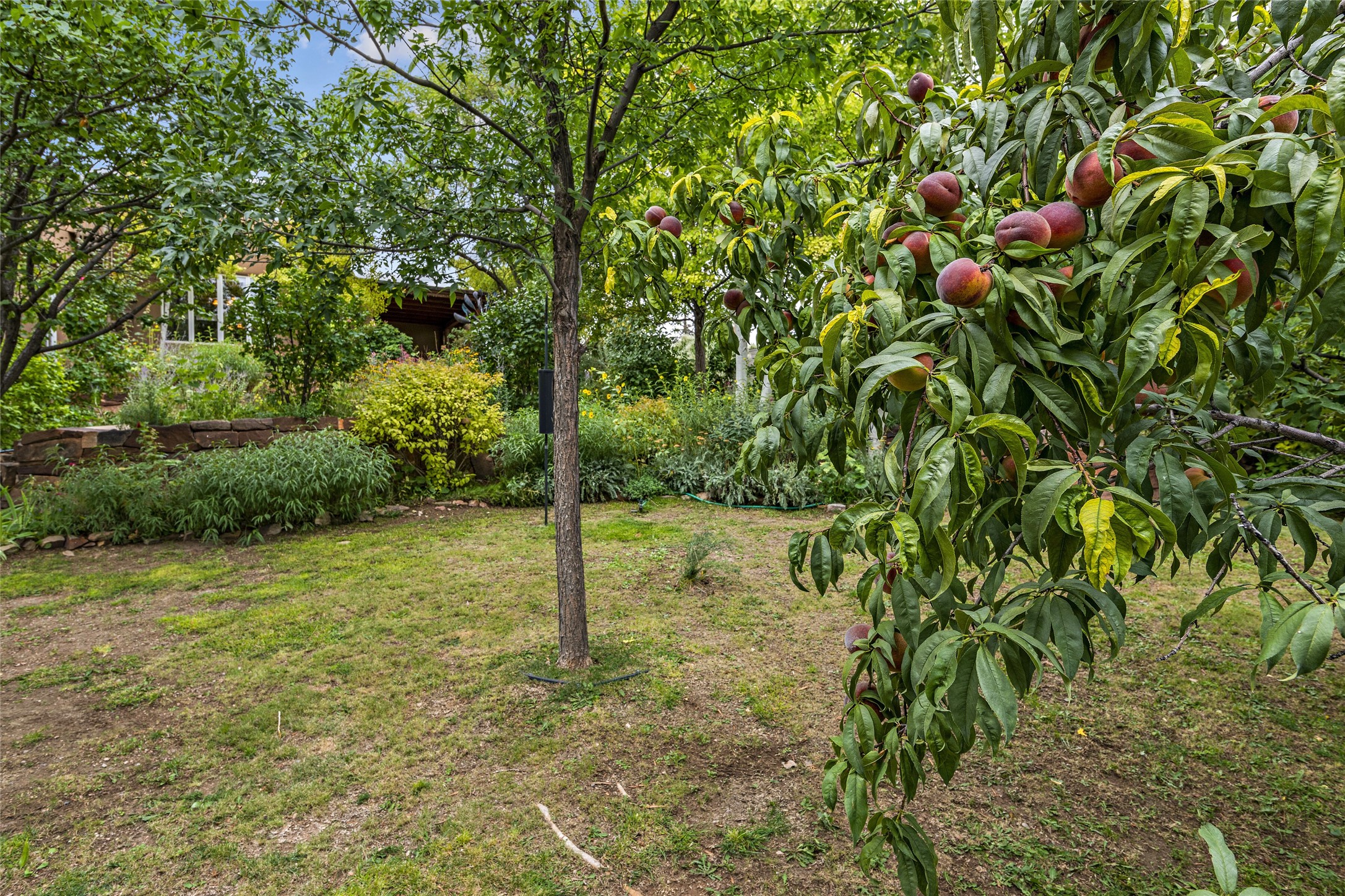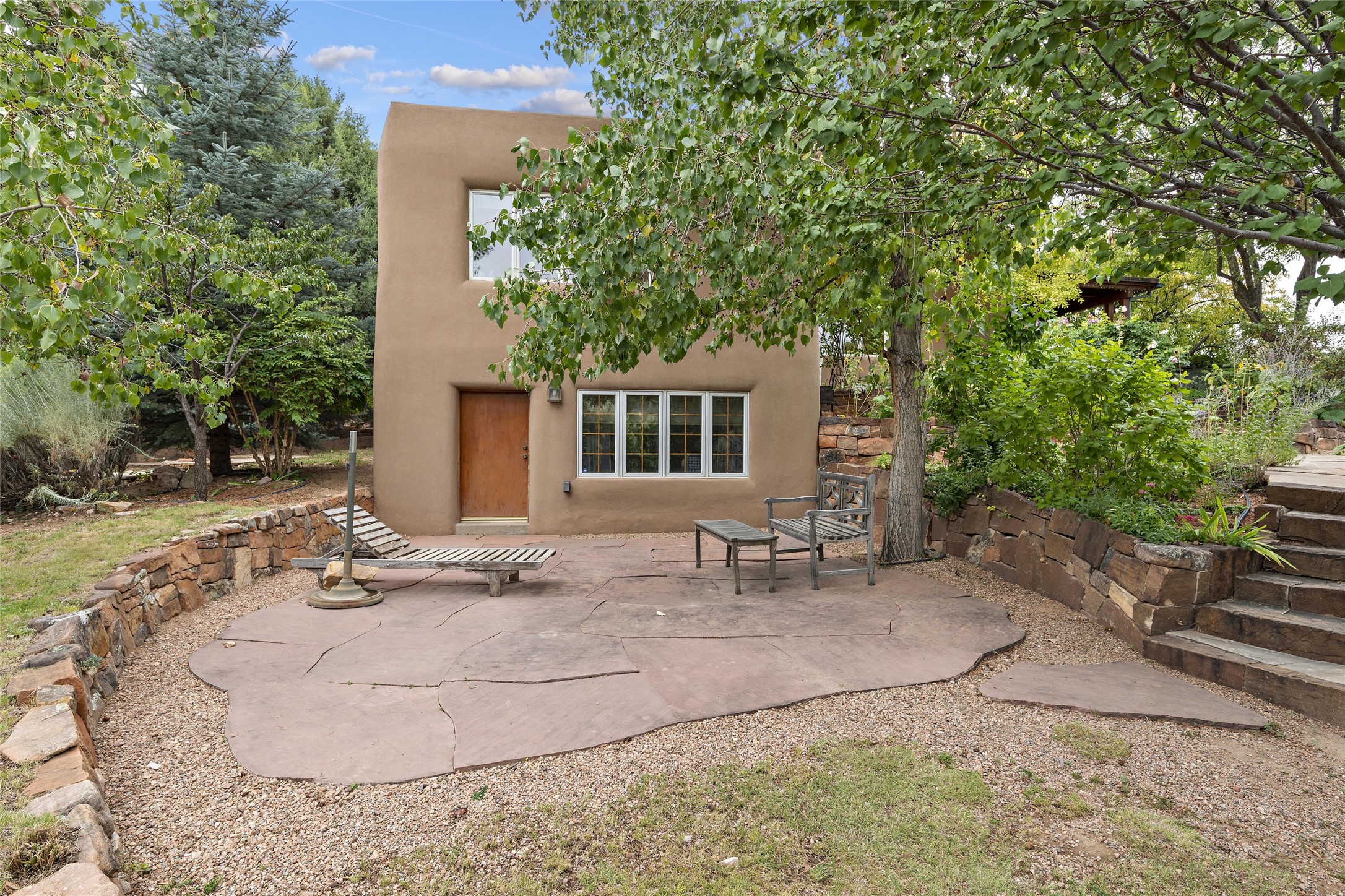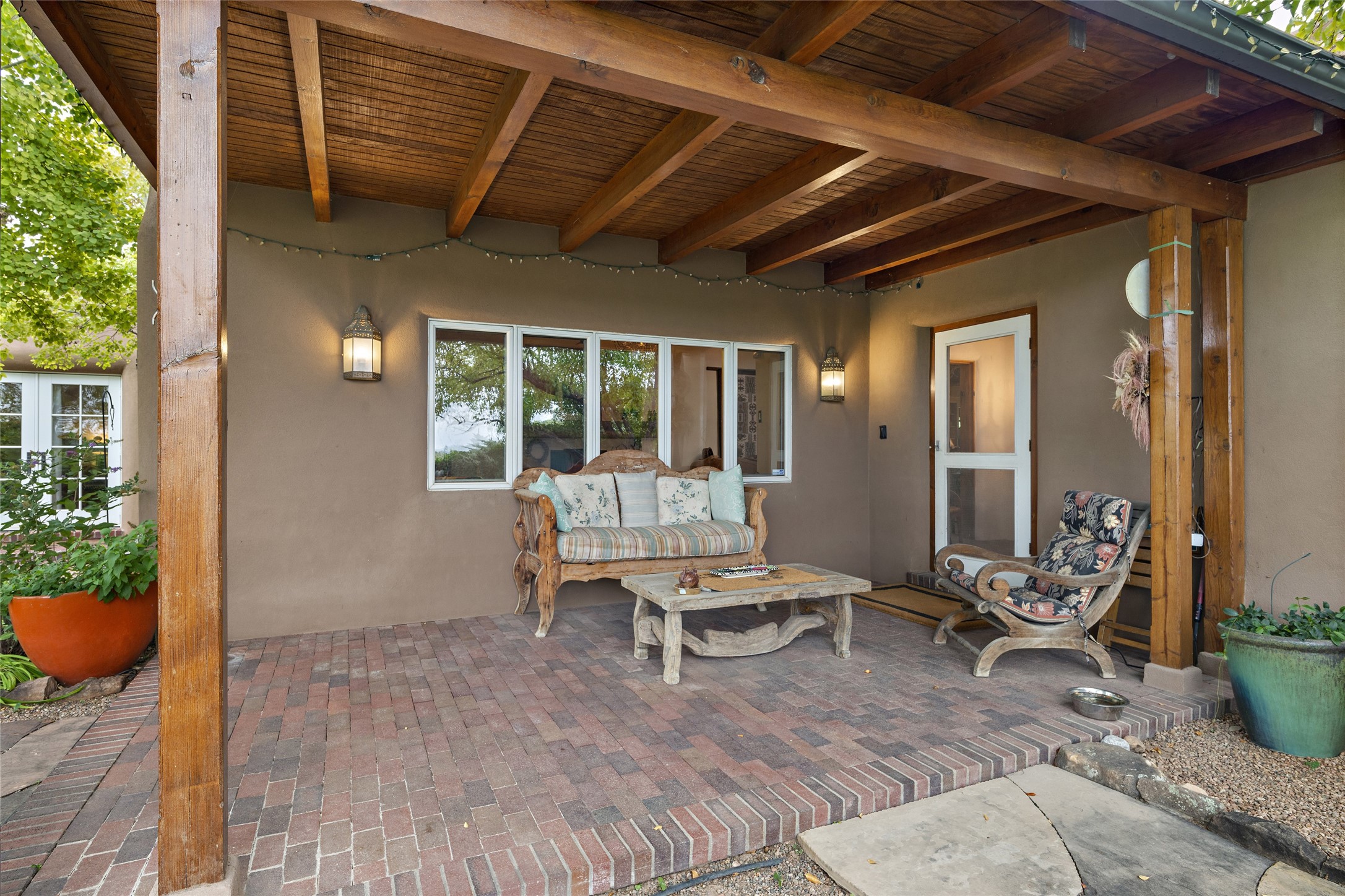 This Adobe home is gracefully tucked away in the heart of Santa Fe's sought-after Historic Eastside, along the enchanting Camino Del Monte Sol. Set within this locale, this property invites you to partake in the rich tapestry of Santa Fe's storied history. This captivating home stands proudly on a generous .56-acre lot, boasting a beautiful landscape adorned with lush vegetation and a diverse array of fruit trees. Imagine waking up to the fragrant scent of peaches, apricots, apples, nectarines, pears, and cherries wafting through your backyard. Irrigation is available on the property, fostering the growth of the beautiful vegetation. There is a large varnished carport for two cars with two additional parking spaces on the property. Step inside, and you'll discover a thoughtfully designed residence that seamlessly combines comfort and elegance. Featuring three bedrooms, including a spacious primary suite, and a total of three bathrooms (one full bath and two 3/4 baths.) Inside, you'll appreciate the brick flooring throughout the open living area and the granite countertops in the chef's kitchen, blending classic Santa Fe style with modern convenience. Evaporative cooling and ceiling fans throughout ensure your comfort during the warmer months. Tall ceilings with vigas add to the sense of spaciousness, while historic charm infuses each room. The fireplace in the living room is perfect to gather around while entertaining. The expansive yard provides endless opportunities for relaxation, outdoor dining, or simply basking in the New Mexico sunshine. Shaded entertaining areas with large portals invite you to savor the outdoors while staying cool. This remarkable home in Santa Fe's historic Eastside is more than just a place to live; it's a gateway to a storied past and a haven for modern living. Don't miss the opportunity to make this exceptional home your own and experience the true essence of Santa Fe's charm and history.