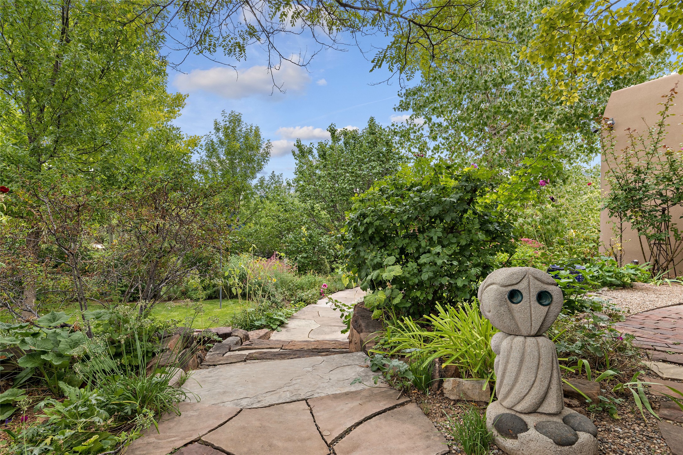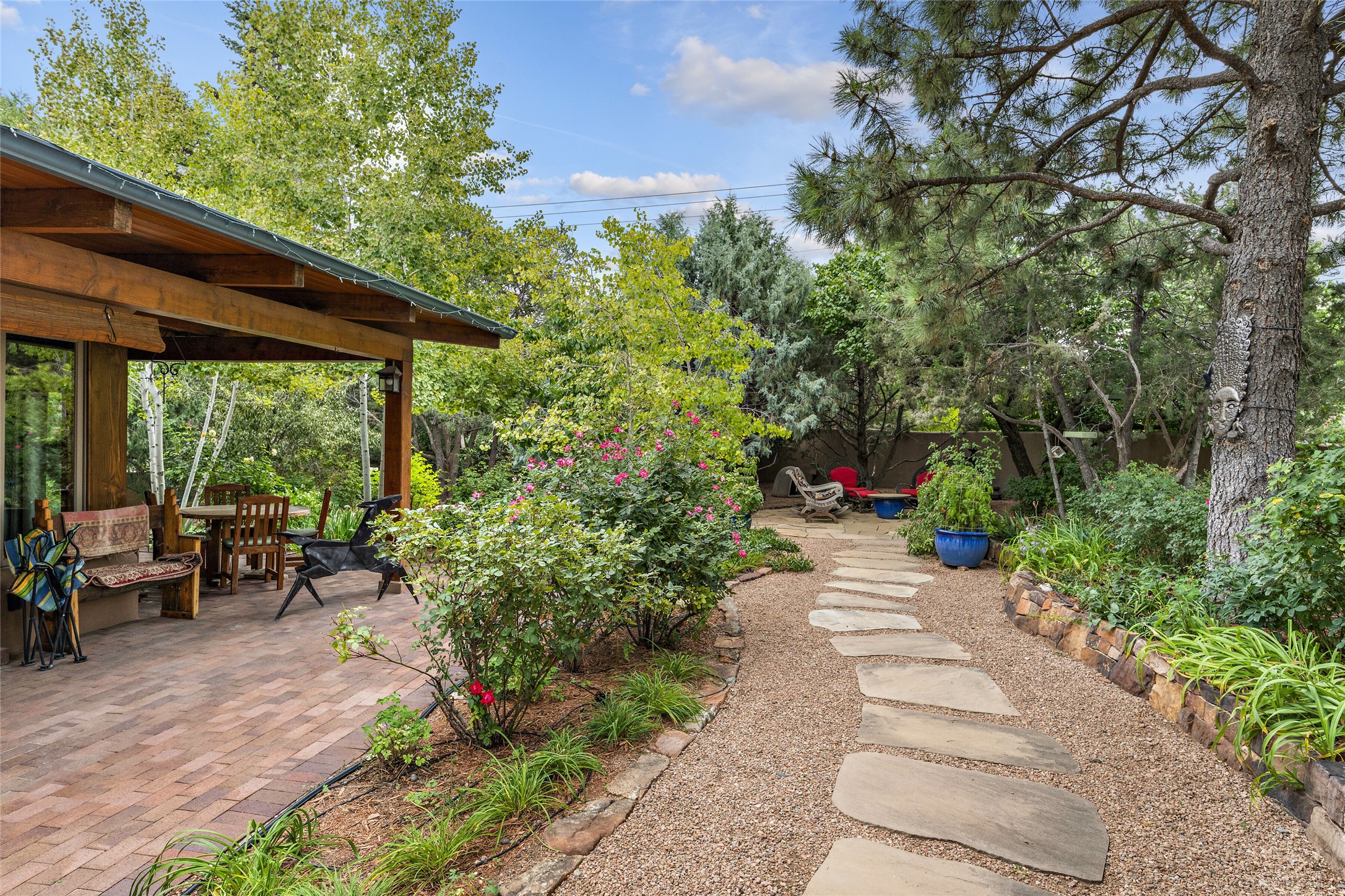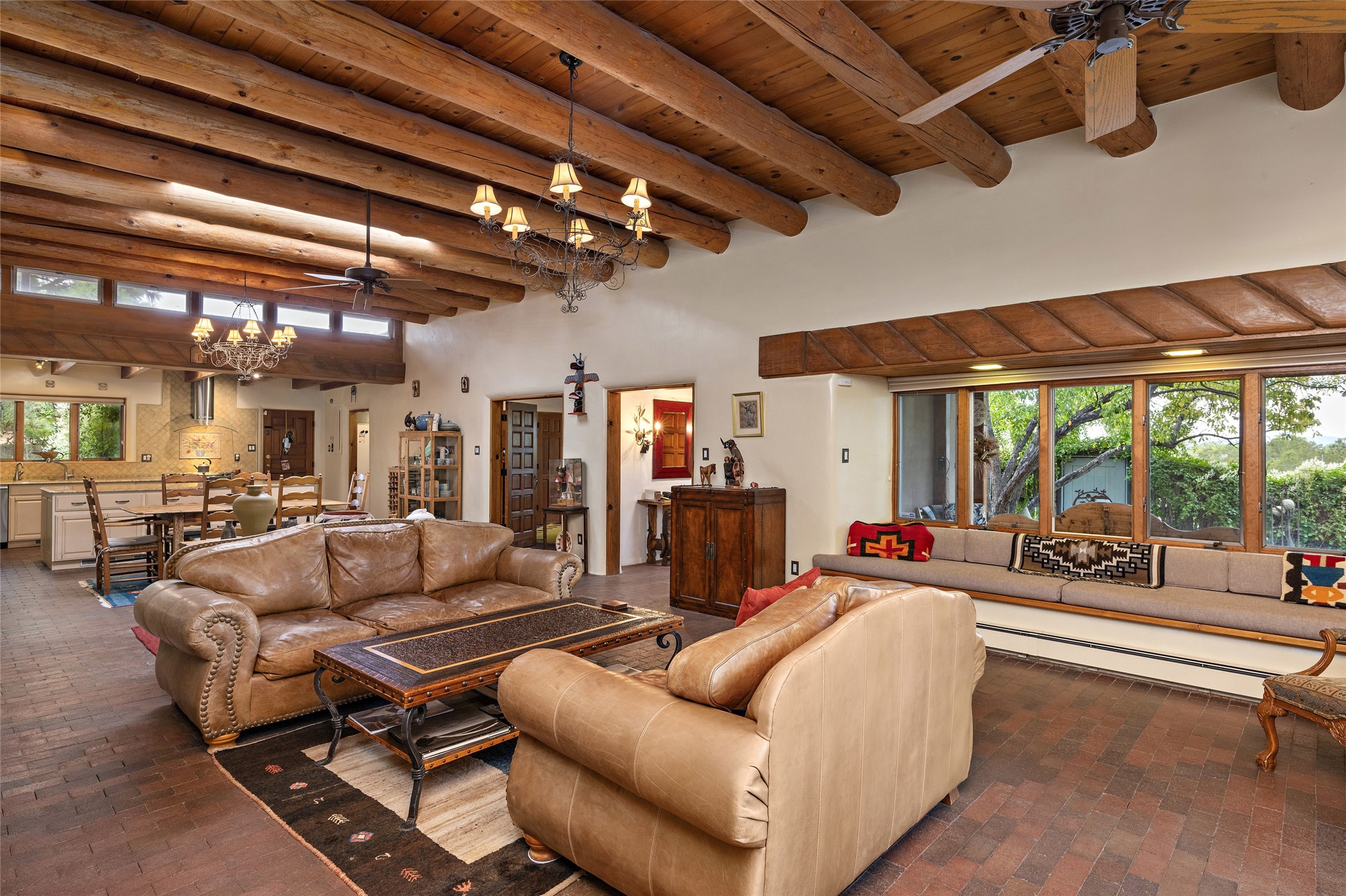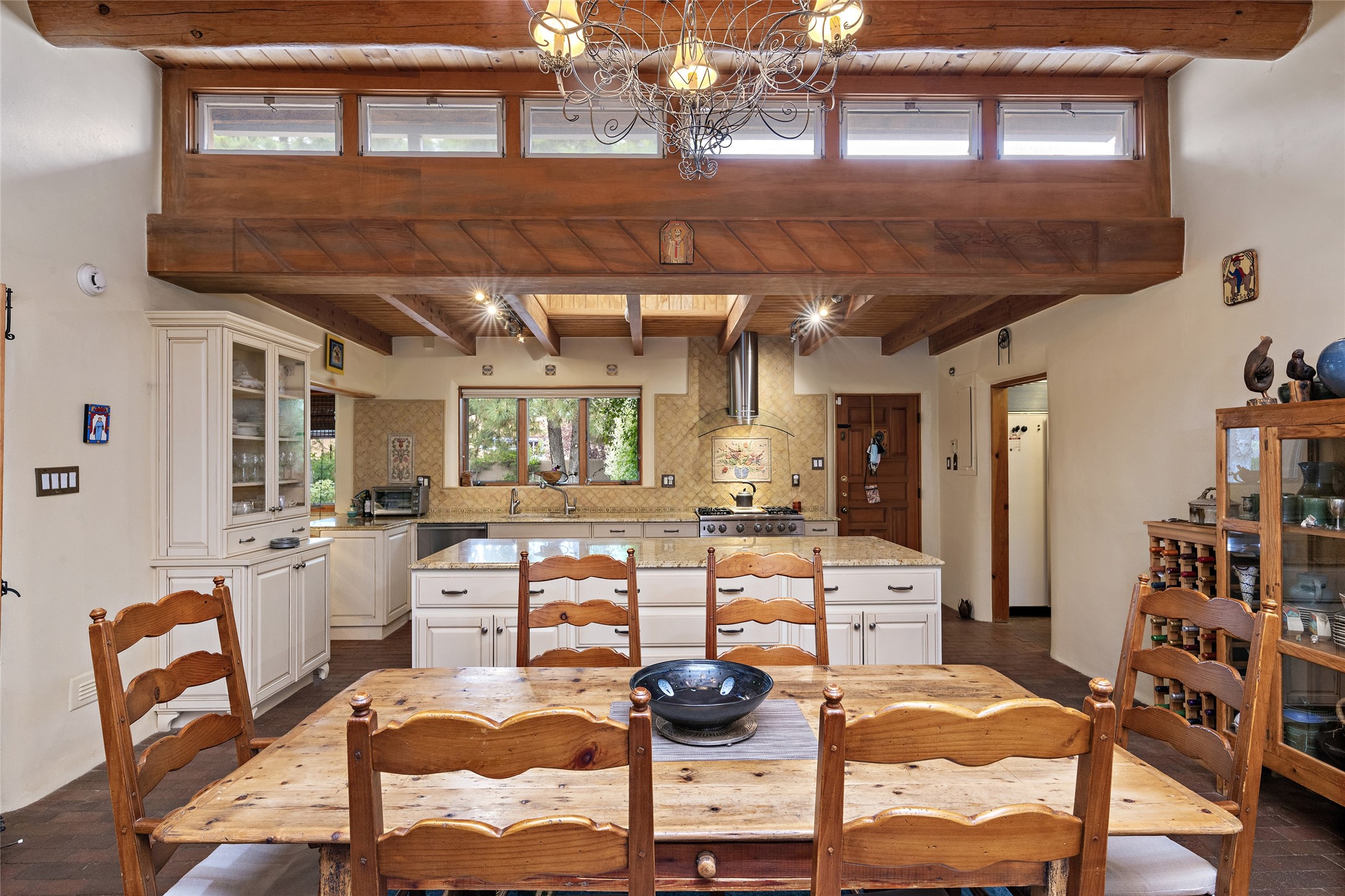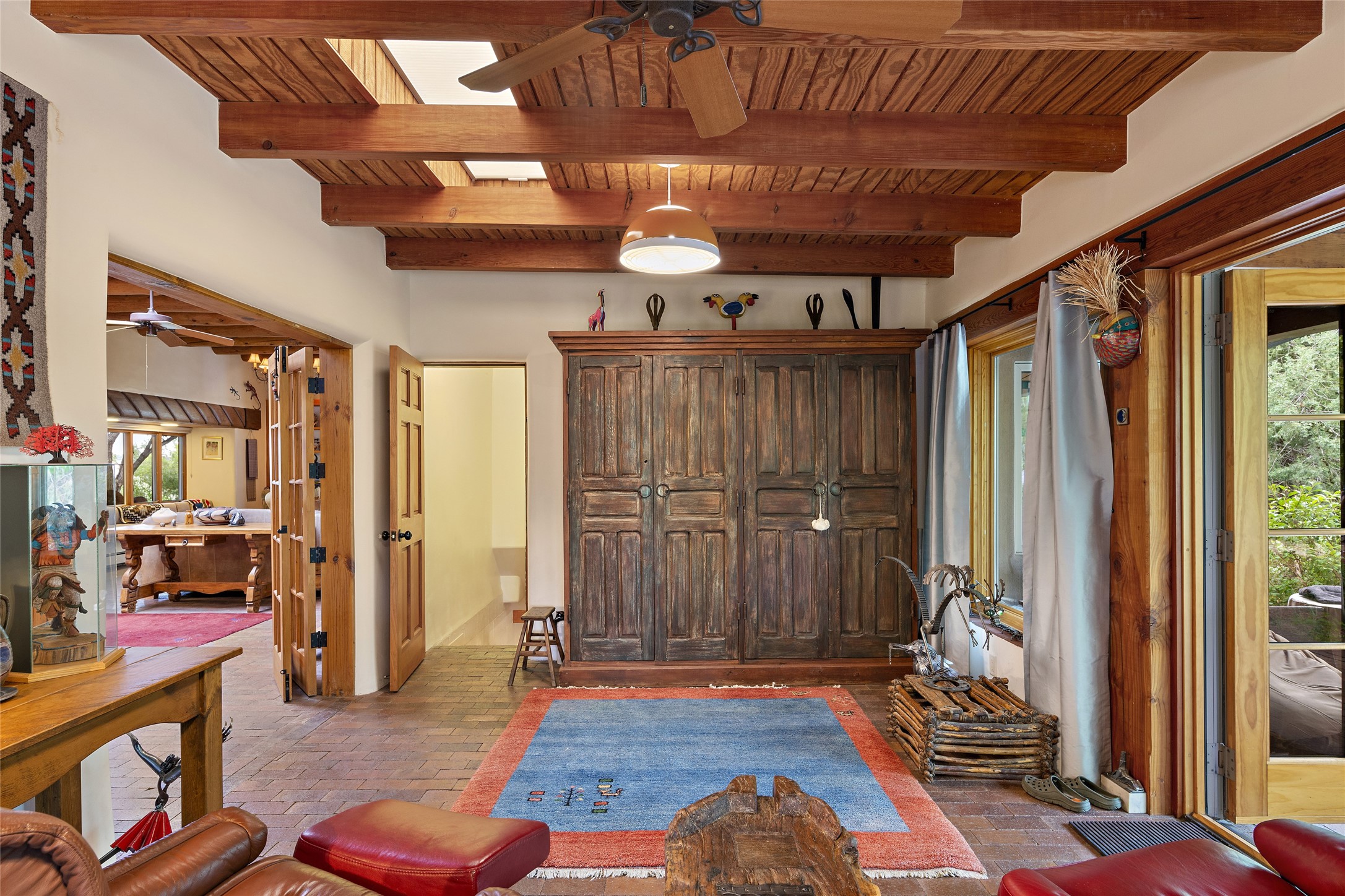 This Adobe home is gracefully tucked away in the heart of Santa Fe's sought-after Historic Eastside, along the enchanting Camino Del Monte Sol. Set within this locale, this property invites you to partake in the rich tapestry of Santa Fe's storied history. This captivating home stands proudly on a generous .56-acre lot, boasting a beautiful landscape adorned with lush vegetation and a diverse array of fruit trees. Imagine waking up to the fragrant scent of peaches, apricots, apples, nectarines, pears, and cherries wafting through your backyard. Irrigation is available on the property, fostering the growth of the beautiful vegetation. There is a large varnished carport for two cars with two additional parking spaces on the property. Step inside, and you'll discover a thoughtfully designed residence that seamlessly combines comfort and elegance. Featuring three bedrooms, including a spacious primary suite, and a total of three bathrooms (one full bath and two 3/4 baths.) Inside, you'll appreciate the brick flooring throughout the open living area and the granite countertops in the chef's kitchen, blending classic Santa Fe style with modern convenience. Evaporative cooling and ceiling fans throughout ensure your comfort during the warmer months. Tall ceilings with vigas add to the sense of spaciousness, while historic charm infuses each room. The fireplace in the living room is perfect to gather around while entertaining. The expansive yard provides endless opportunities for relaxation, outdoor dining, or simply basking in the New Mexico sunshine. Shaded entertaining areas with large portals invite you to savor the outdoors while staying cool. This remarkable home in Santa Fe's historic Eastside is more than just a place to live; it's a gateway to a storied past and a haven for modern living. Don't miss the opportunity to make this exceptional home your own and experience the true essence of Santa Fe's charm and history.