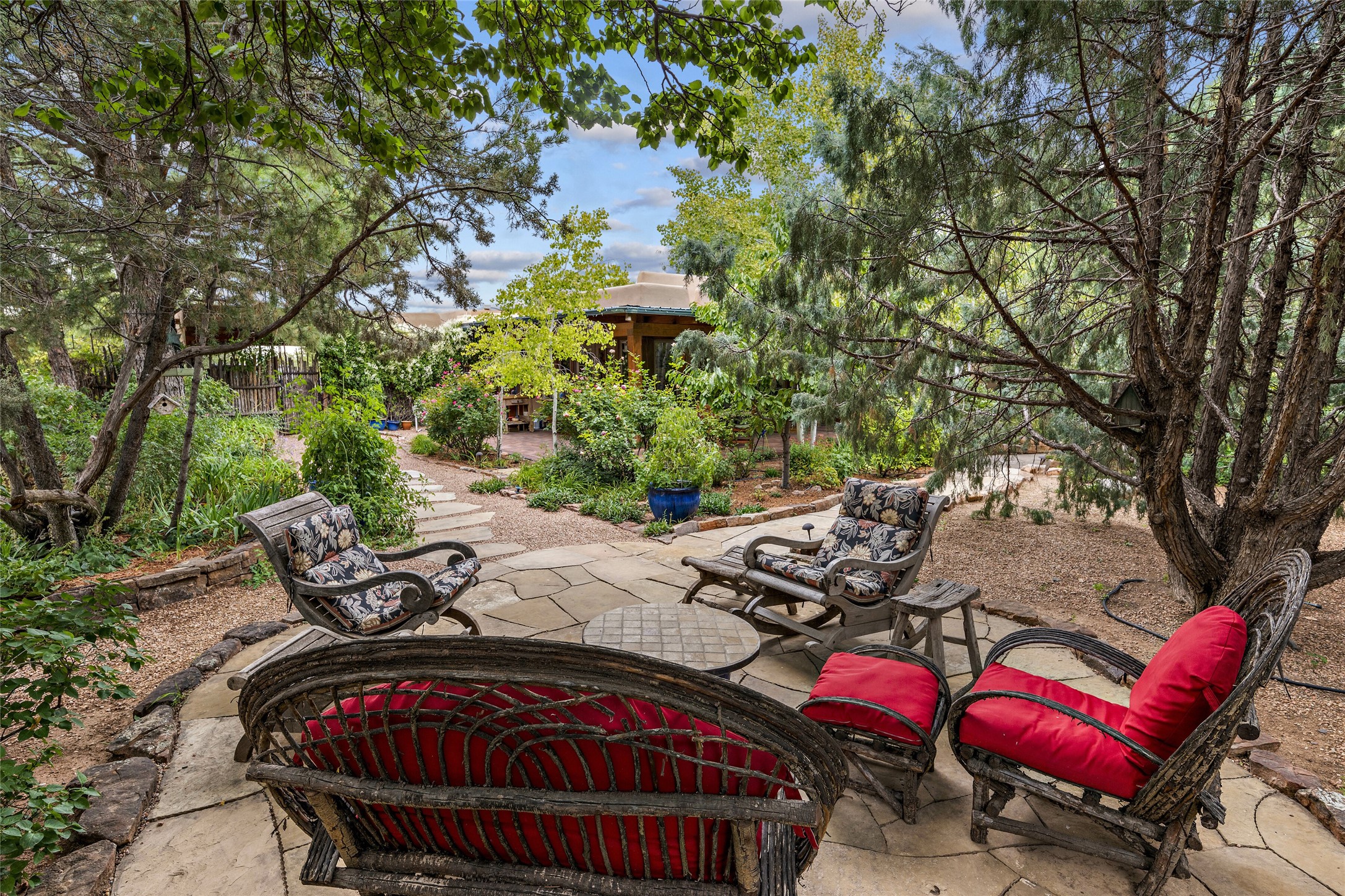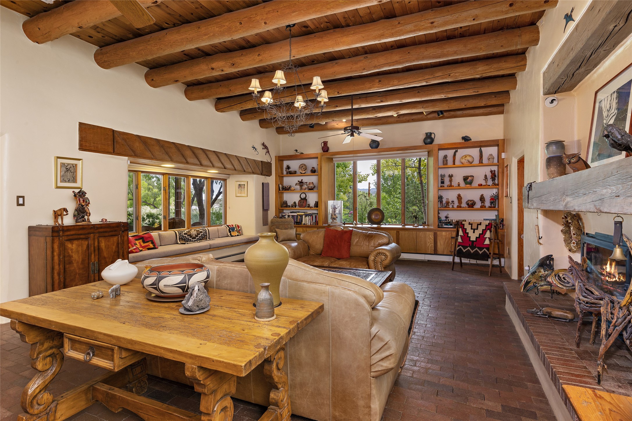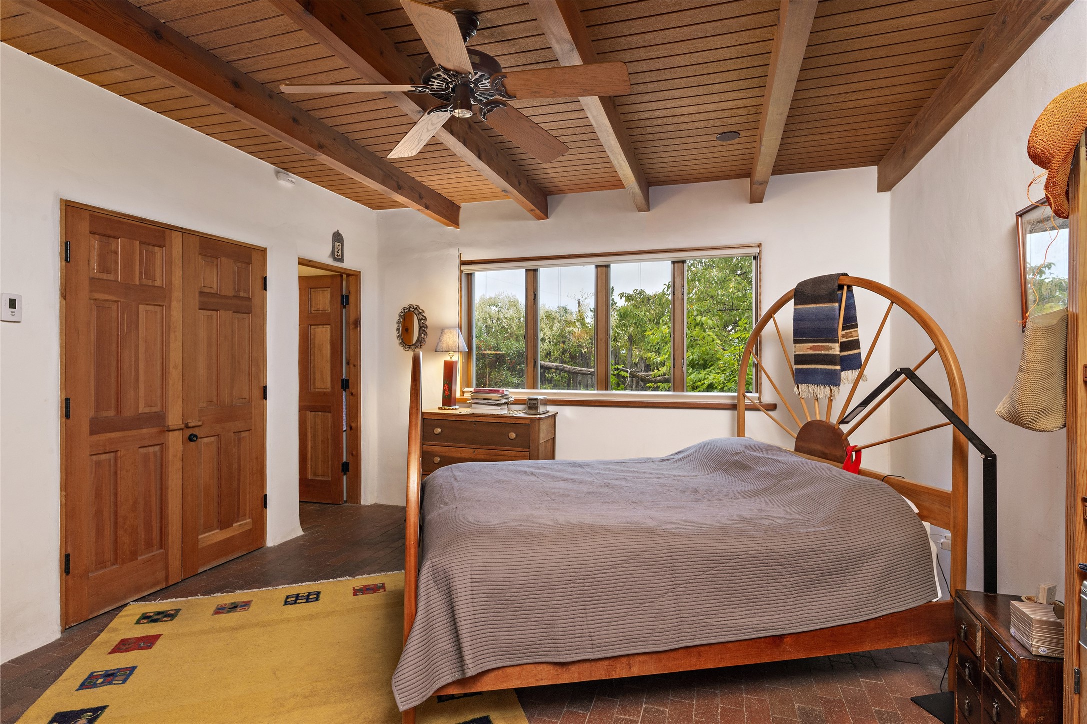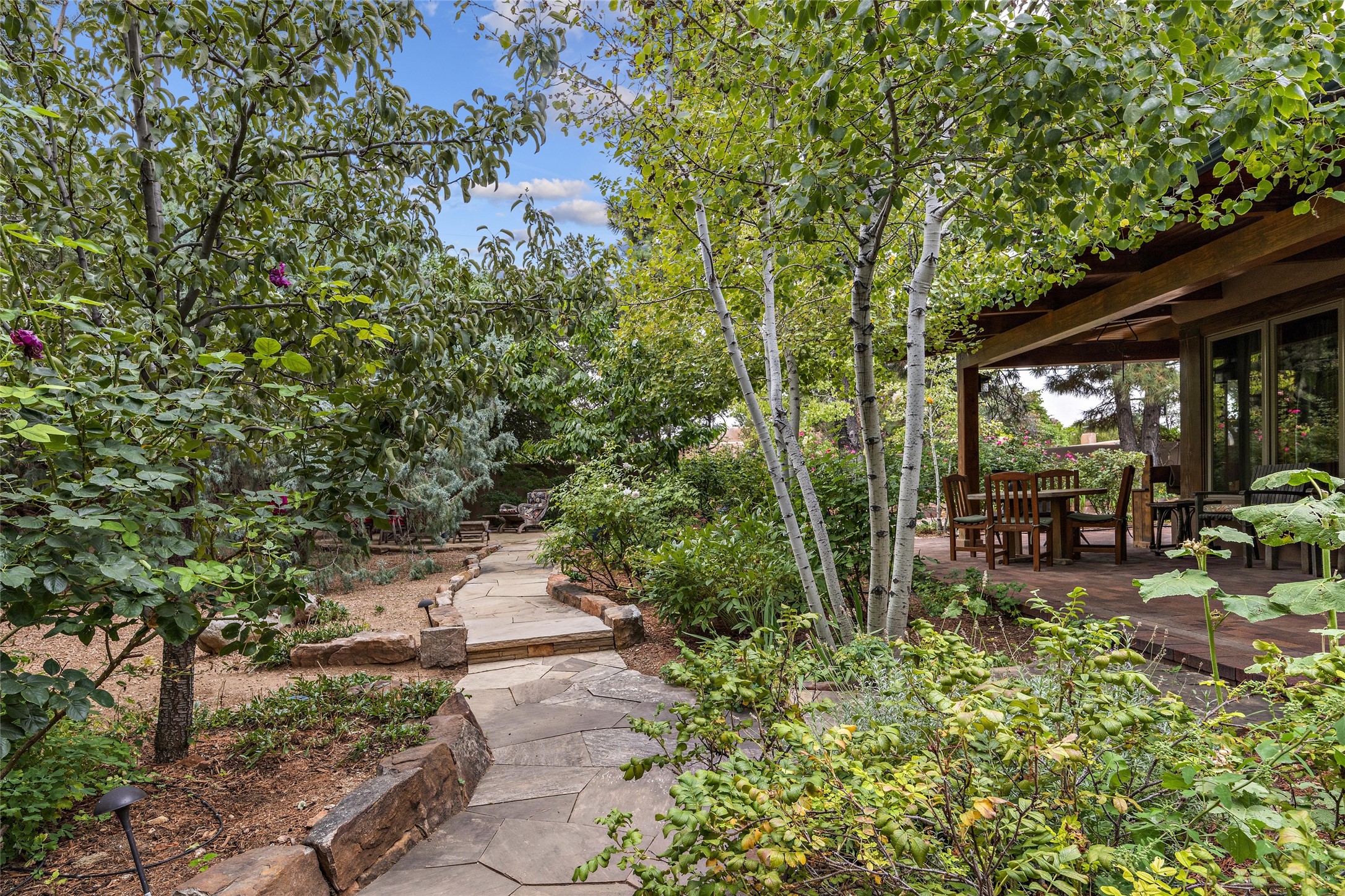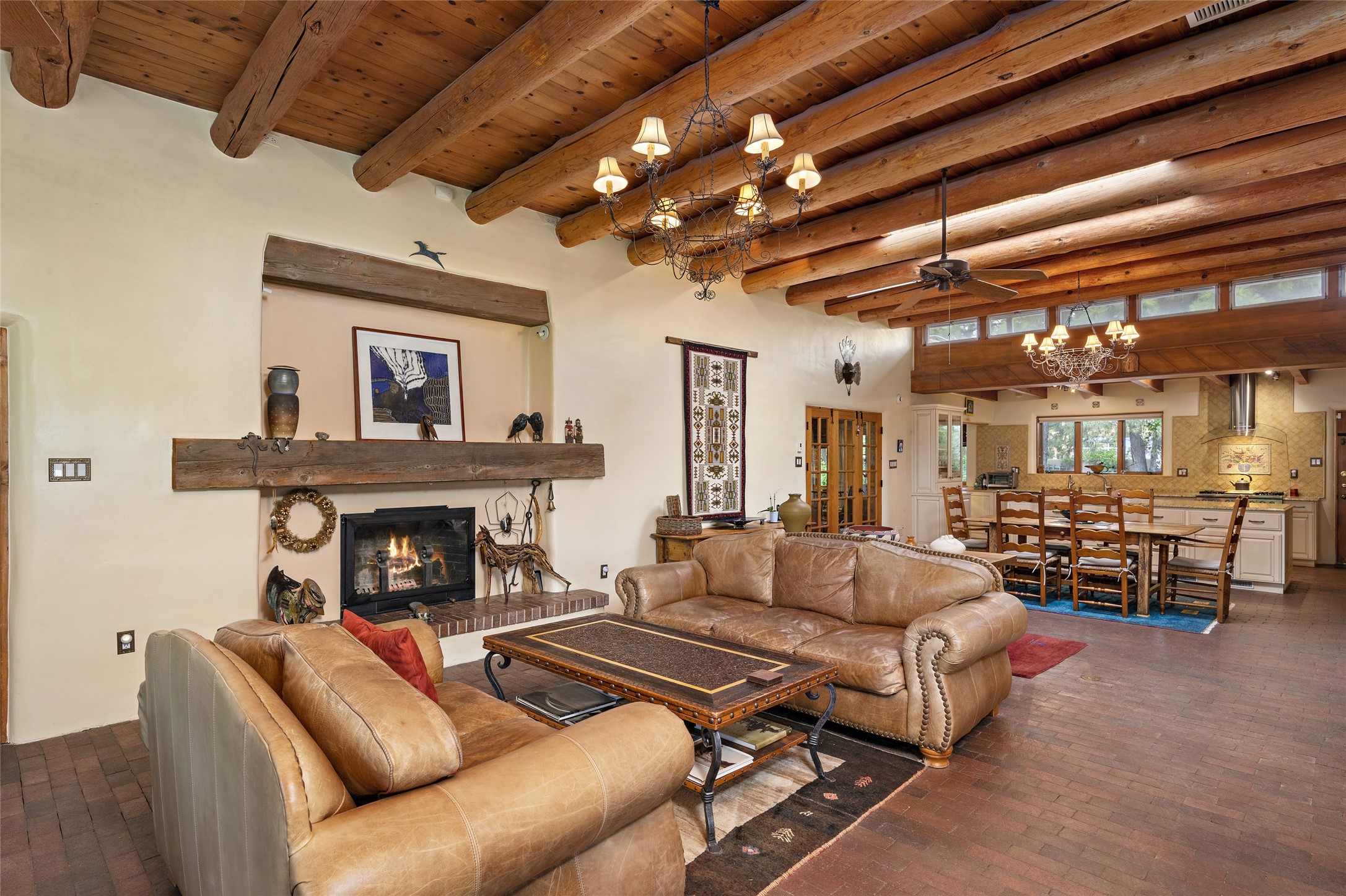 This Adobe home is gracefully tucked away in the heart of Santa Fe's sought-after Historic Eastside, along the enchanting Camino Del Monte Sol. Set within this locale, this property invites you to partake in the rich tapestry of Santa Fe's storied history. This captivating home stands proudly on a generous .56-acre lot, boasting a beautiful landscape adorned with lush vegetation and a diverse array of fruit trees. Imagine waking up to the fragrant scent of peaches, apricots, apples, nectarines, pears, and cherries wafting through your backyard. Irrigation is available on the property, fostering the growth of the beautiful vegetation. There is a large varnished carport for two cars with two additional parking spaces on the property. Step inside, and you'll discover a thoughtfully designed residence that seamlessly combines comfort and elegance. Featuring three bedrooms, including a spacious primary suite, and a total of three bathrooms (one full bath and two 3/4 baths.) Inside, you'll appreciate the brick flooring throughout the open living area and the granite countertops in the chef's kitchen, blending classic Santa Fe style with modern convenience. Evaporative cooling and ceiling fans throughout ensure your comfort during the warmer months. Tall ceilings with vigas add to the sense of spaciousness, while historic charm infuses each room. The fireplace in the living room is perfect to gather around while entertaining. The expansive yard provides endless opportunities for relaxation, outdoor dining, or simply basking in the New Mexico sunshine. Shaded entertaining areas with large portals invite you to savor the outdoors while staying cool. This remarkable home in Santa Fe's historic Eastside is more than just a place to live; it's a gateway to a storied past and a haven for modern living. Don't miss the opportunity to make this exceptional home your own and experience the true essence of Santa Fe's charm and history.