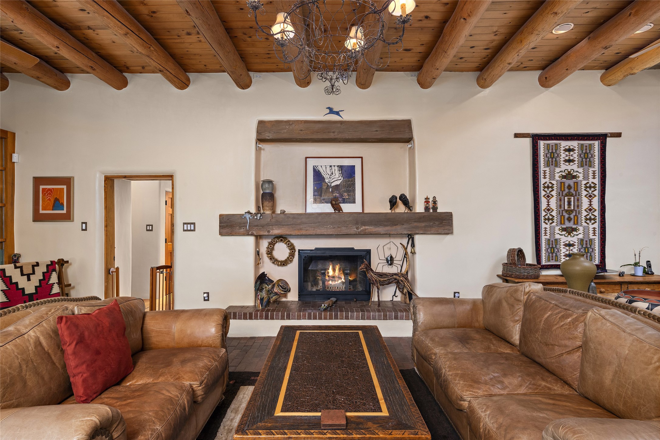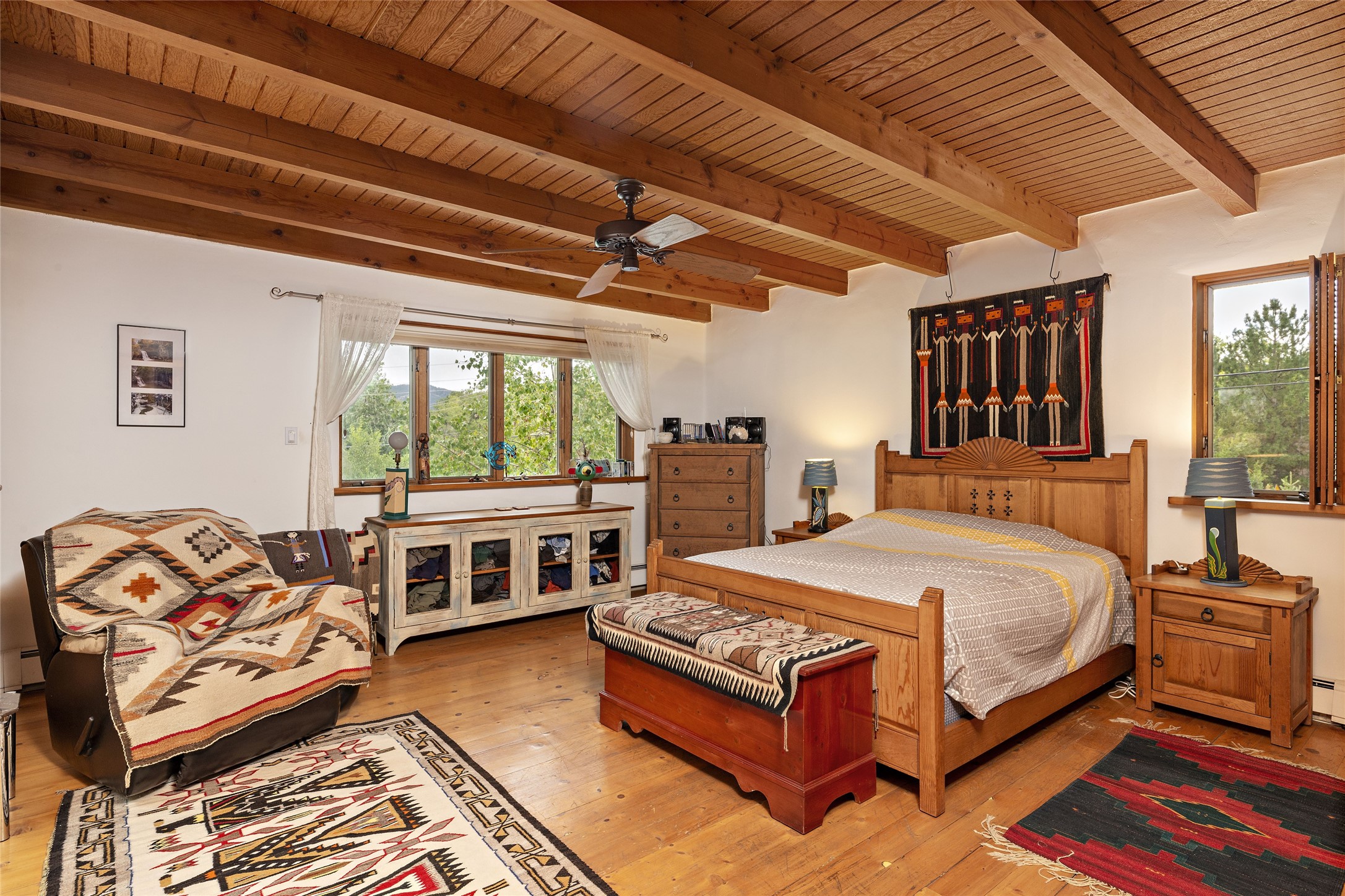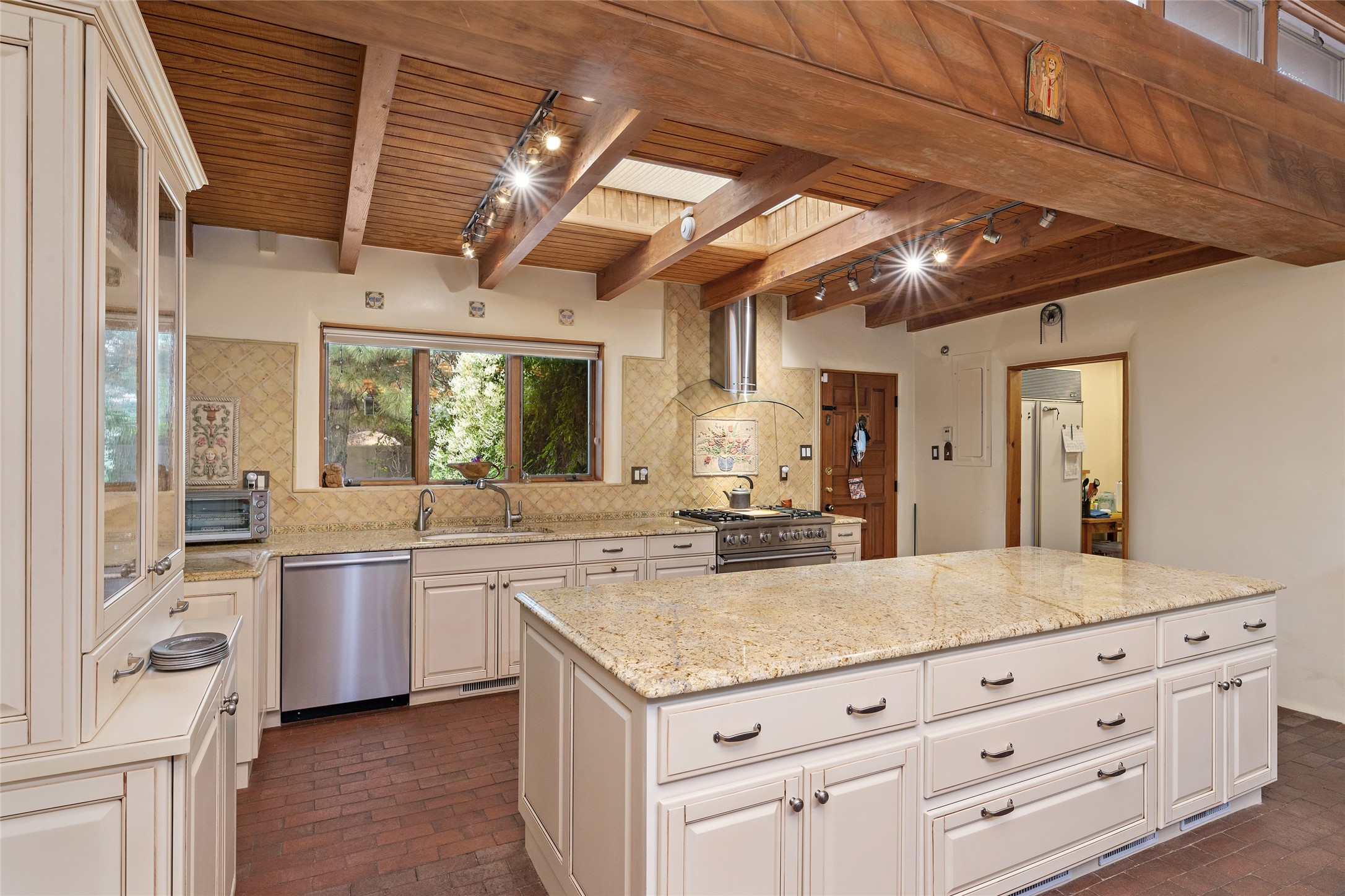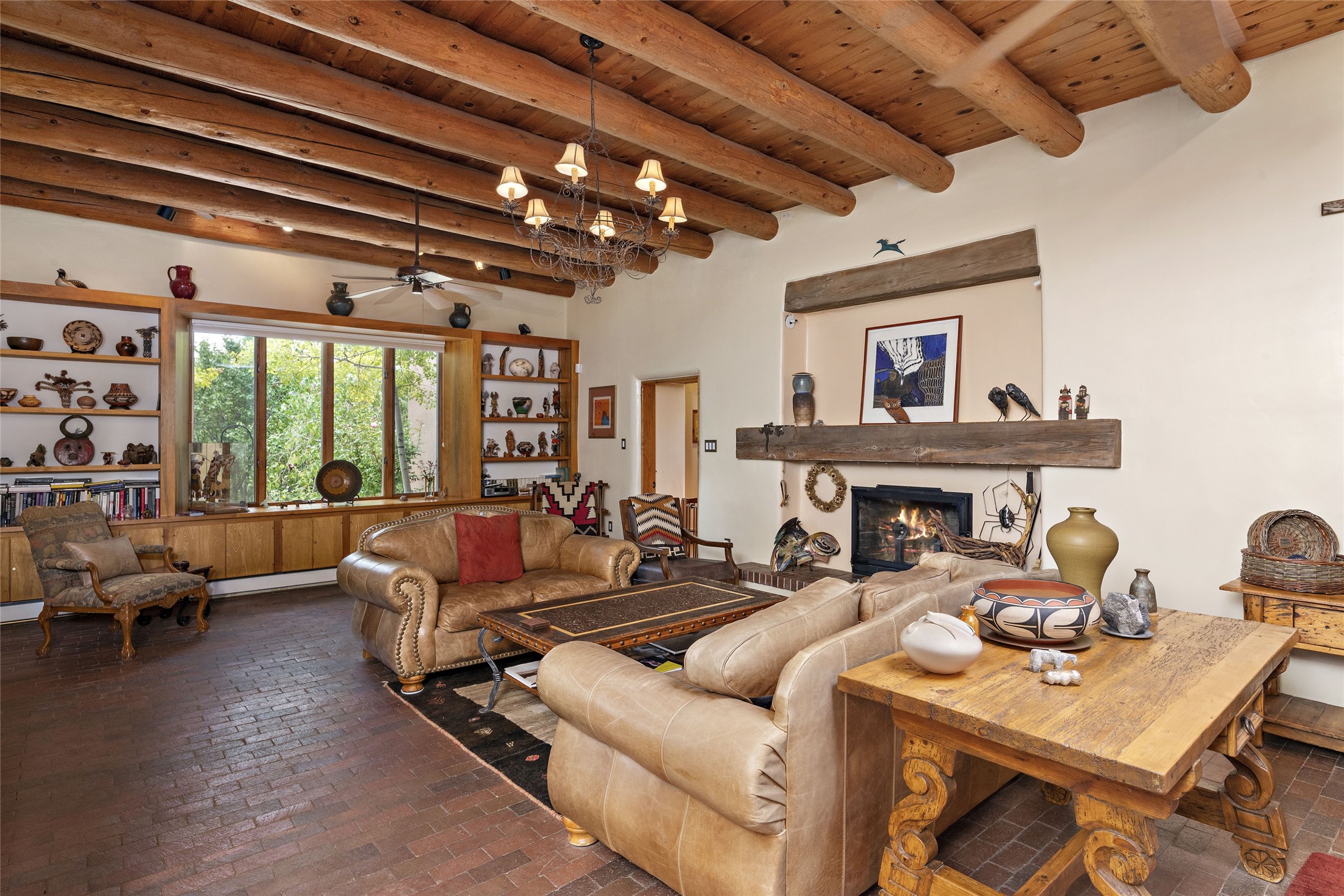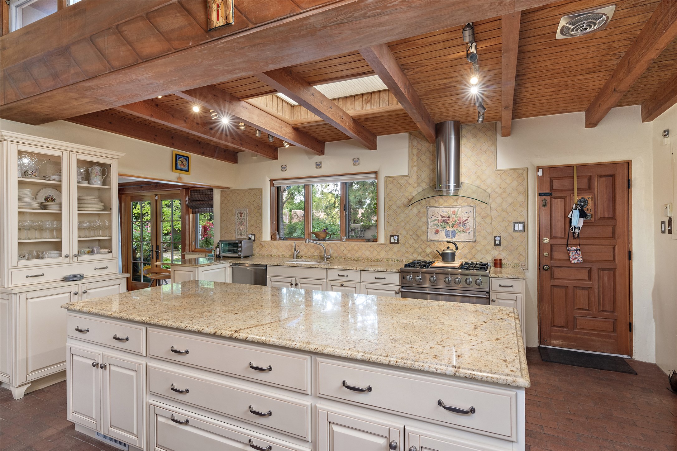 This Adobe home is gracefully tucked away in the heart of Santa Fe's sought-after Historic Eastside, along the enchanting Camino Del Monte Sol. Set within this locale, this property invites you to partake in the rich tapestry of Santa Fe's storied history. This captivating home stands proudly on a generous .56-acre lot, boasting a beautiful landscape adorned with lush vegetation and a diverse array of fruit trees. Imagine waking up to the fragrant scent of peaches, apricots, apples, nectarines, pears, and cherries wafting through your backyard. Irrigation is available on the property, fostering the growth of the beautiful vegetation. There is a large varnished carport for two cars with two additional parking spaces on the property. Step inside, and you'll discover a thoughtfully designed residence that seamlessly combines comfort and elegance. Featuring three bedrooms, including a spacious primary suite, and a total of three bathrooms (one full bath and two 3/4 baths.) Inside, you'll appreciate the brick flooring throughout the open living area and the granite countertops in the chef's kitchen, blending classic Santa Fe style with modern convenience. Evaporative cooling and ceiling fans throughout ensure your comfort during the warmer months. Tall ceilings with vigas add to the sense of spaciousness, while historic charm infuses each room. The fireplace in the living room is perfect to gather around while entertaining. The expansive yard provides endless opportunities for relaxation, outdoor dining, or simply basking in the New Mexico sunshine. Shaded entertaining areas with large portals invite you to savor the outdoors while staying cool. This remarkable home in Santa Fe's historic Eastside is more than just a place to live; it's a gateway to a storied past and a haven for modern living. Don't miss the opportunity to make this exceptional home your own and experience the true essence of Santa Fe's charm and history.