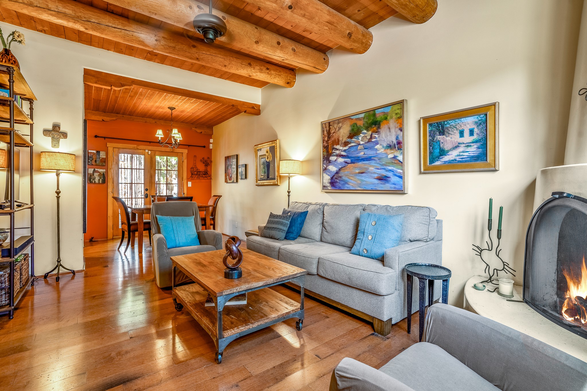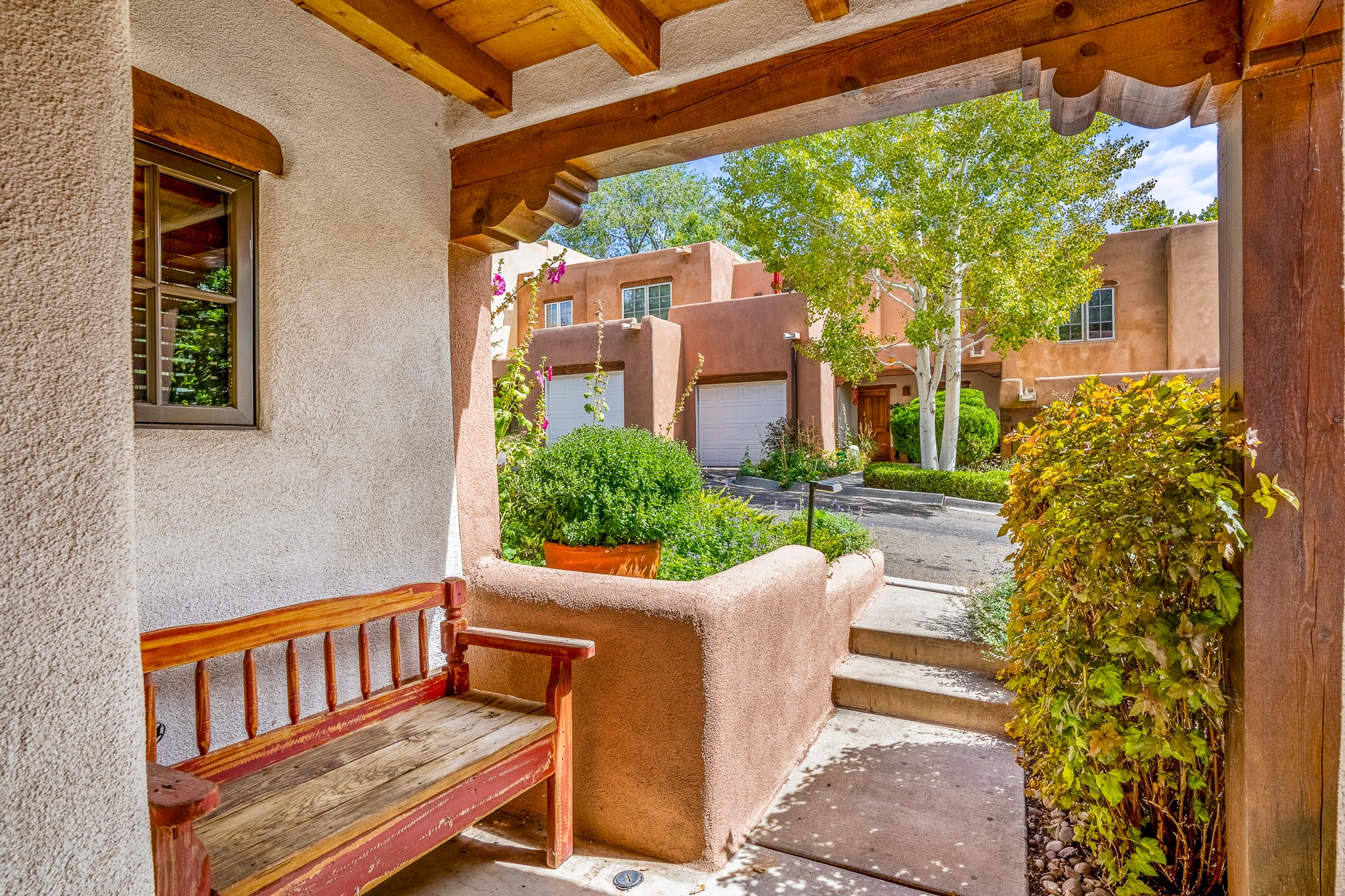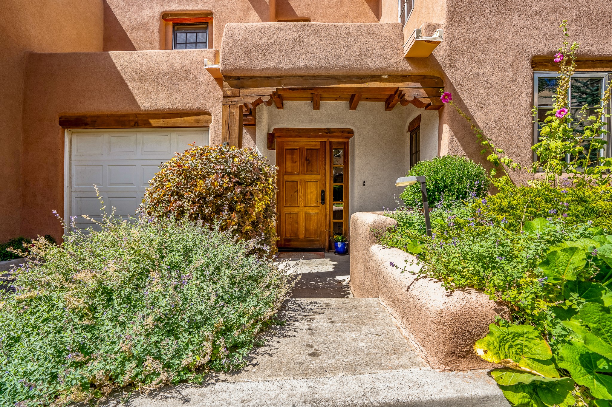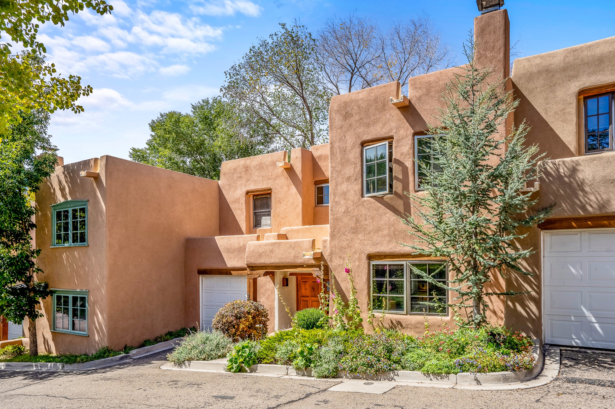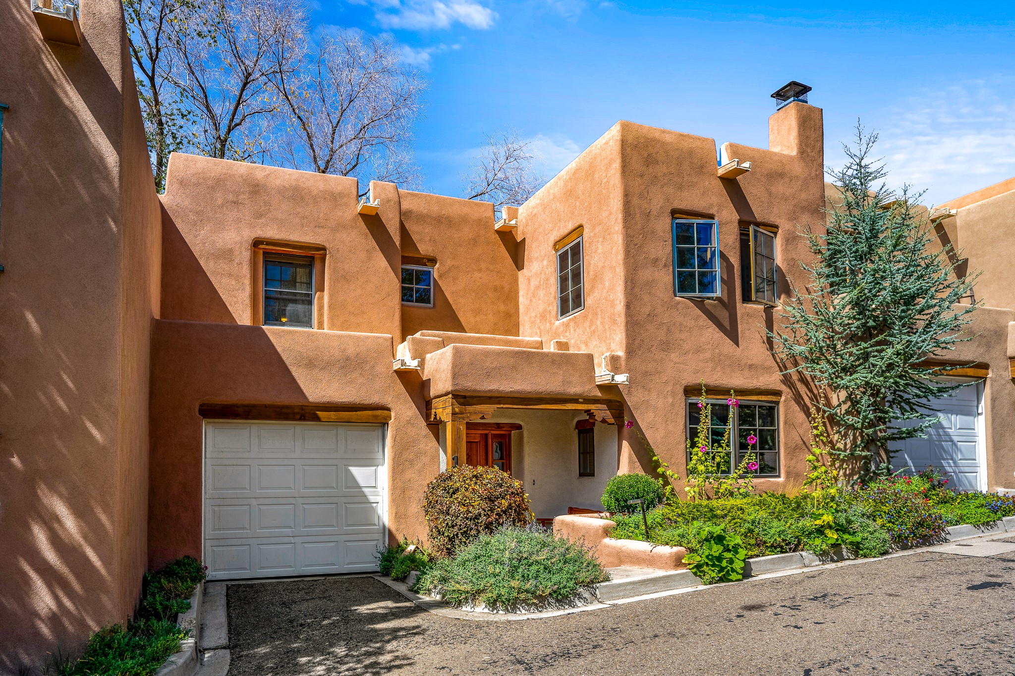 Close to the Santa Fe Plaza, you say? Welcome to the Muralla Compound, a peaceful enclave just off Rosario and a few blocks from the City Different's finest dining and shopping establishments. This modern, stylish condo offers a well-appointed two bedroom, one-and-a-half bathroom layout, complete with a one-car garage in a tranquil compound where convenience is key. Step through a landscaped entry and portal into an open living and dining space. The condo boasts updated, beautiful wood flooring throughout, high ceilings with vigas, a charming wood-burning kiva fireplace and an abundance of natural light. French doors from the dining room lead you onto the secluded rear patio-- an ideal setting for outdoor dining, a cozy seating area, raised garden beds, and a grill. The kitchen has undergone a tasteful transformation featuring a stainless steel appliance package including a four-burner gas range, granite counter tops and back splash. Adjacent to the front entry, there is a convenient powder room for the comfort of your guests. Upstairs, you'll find two nicely proportioned bedrooms with ample storage space, accompanied by a full-bathroom with double vanities. Tucked discreetly into a hallway closet, you'll find a stackable washer and dryer for added convenience.This 1,183 square foot gem has radiant heat and mini-splits to ensure year-round comfort. The entire complex has a new TPO roof, recent stucco work, new chimney liners, and the condo association covers exterior maintenance and common areas. Furthermore, its Commercial zoning permits 7 day+ short term rentals, subject to the necessary permits and approvals. A furniture package can be negotiated if interested. Schedule your visit today and make this condo your Santa Fe get-away or care-free, full-time residence.