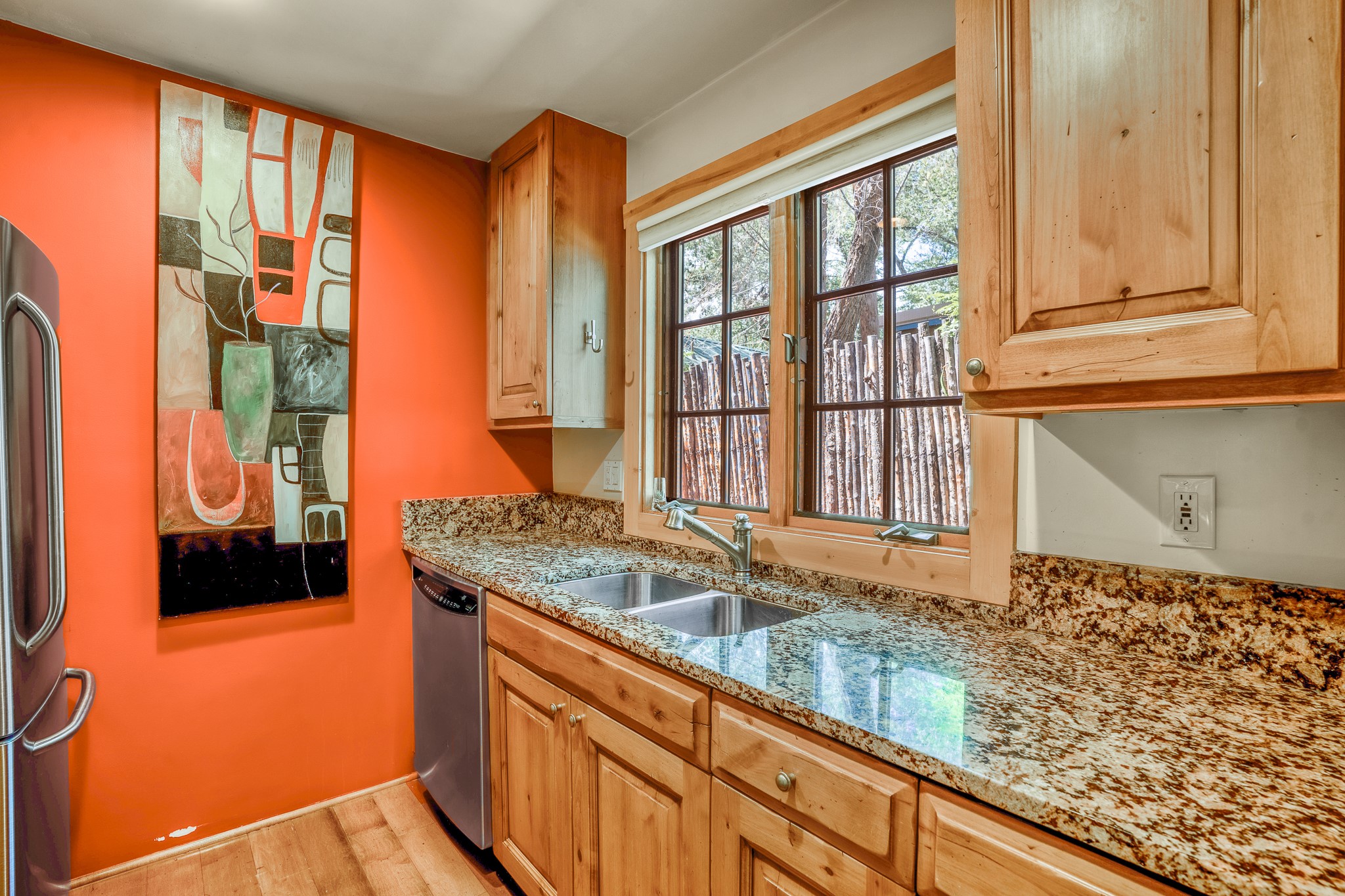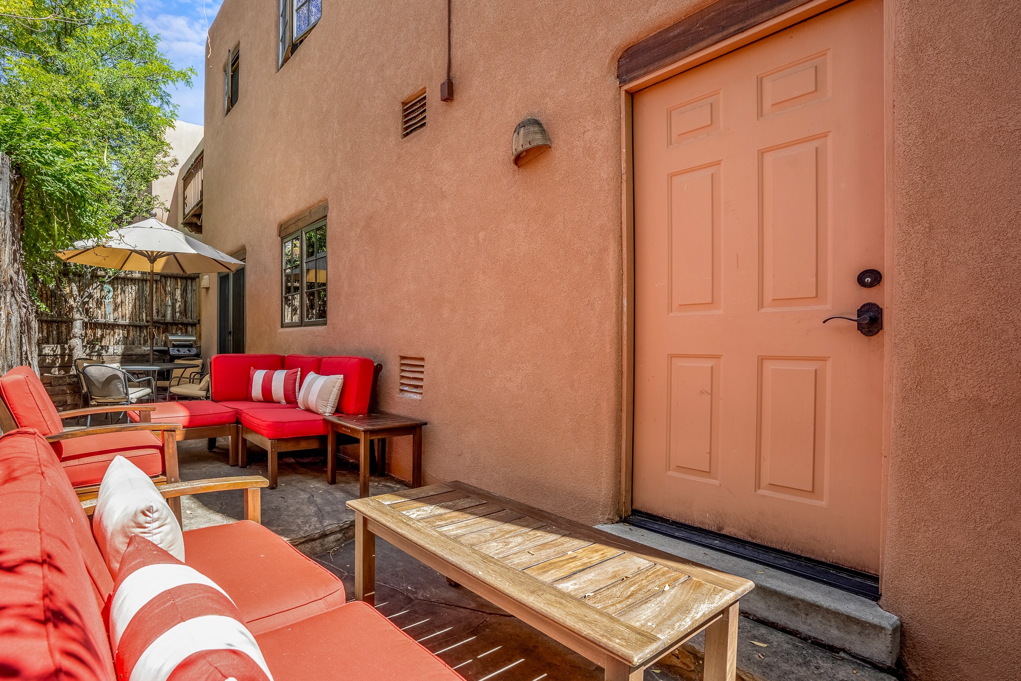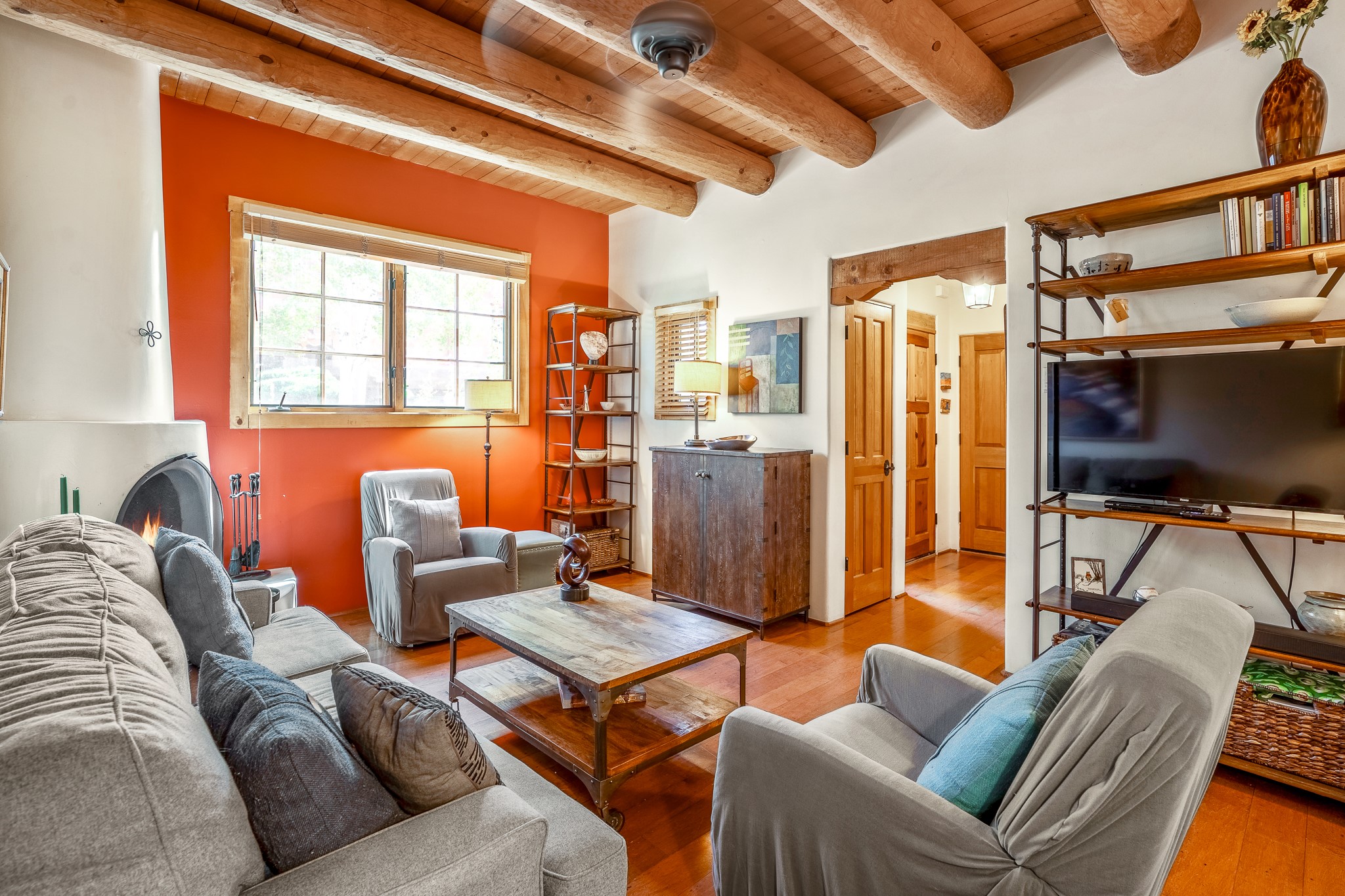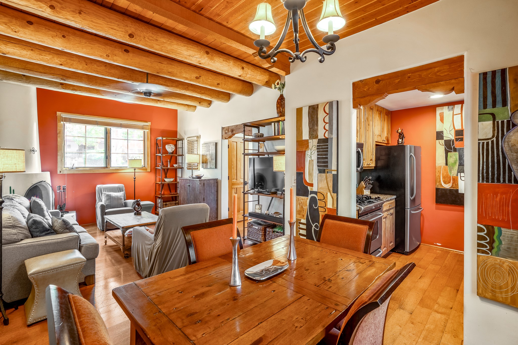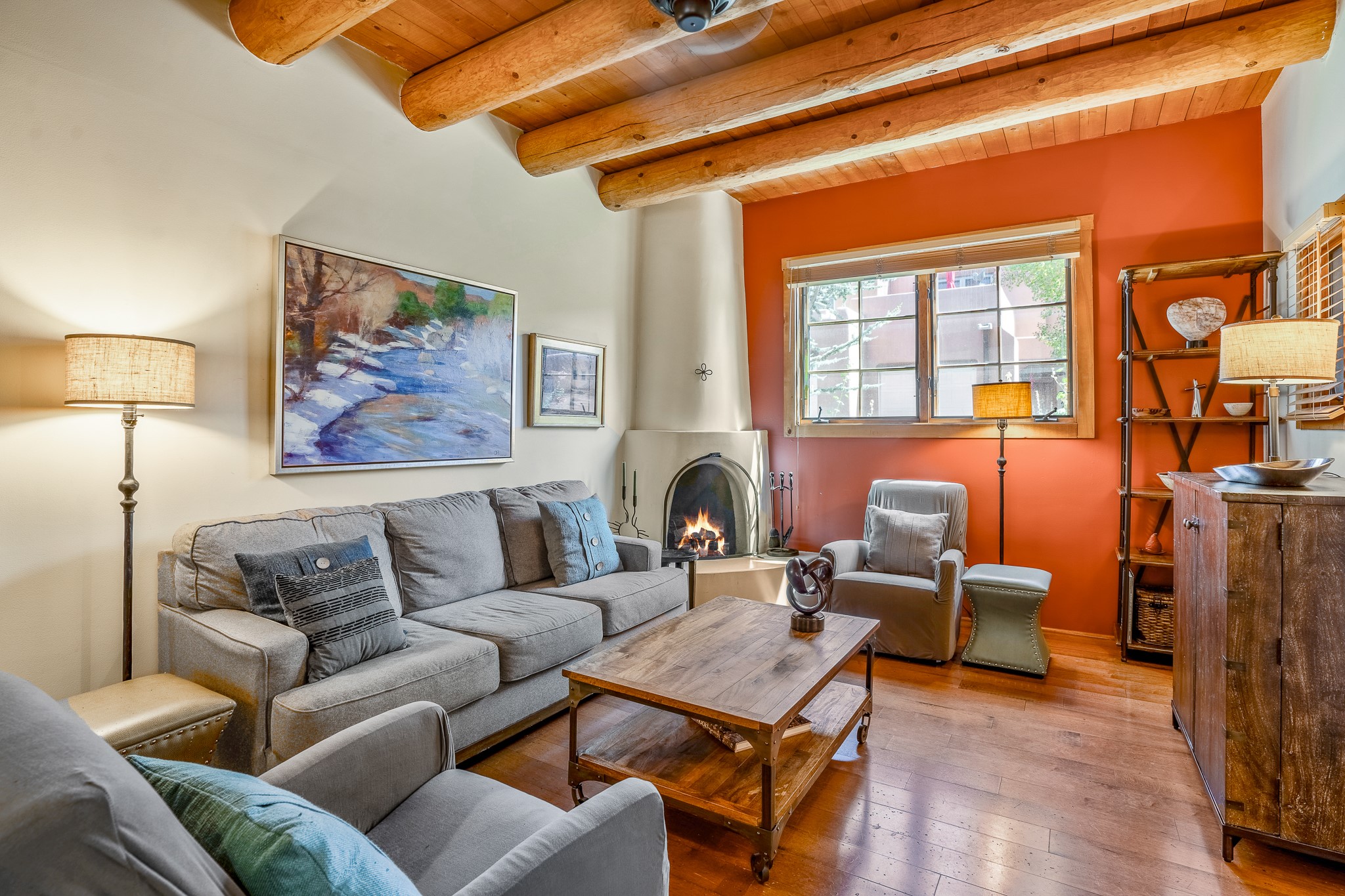 Close to the Santa Fe Plaza, you say? Welcome to the Muralla Compound, a peaceful enclave just off Rosario and a few blocks from the City Different's finest dining and shopping establishments. This modern, stylish condo offers a well-appointed two bedroom, one-and-a-half bathroom layout, complete with a one-car garage in a tranquil compound where convenience is key. Step through a landscaped entry and portal into an open living and dining space. The condo boasts updated, beautiful wood flooring throughout, high ceilings with vigas, a charming wood-burning kiva fireplace and an abundance of natural light. French doors from the dining room lead you onto the secluded rear patio-- an ideal setting for outdoor dining, a cozy seating area, raised garden beds, and a grill. The kitchen has undergone a tasteful transformation featuring a stainless steel appliance package including a four-burner gas range, granite counter tops and back splash. Adjacent to the front entry, there is a convenient powder room for the comfort of your guests. Upstairs, you'll find two nicely proportioned bedrooms with ample storage space, accompanied by a full-bathroom with double vanities. Tucked discreetly into a hallway closet, you'll find a stackable washer and dryer for added convenience.This 1,183 square foot gem has radiant heat and mini-splits to ensure year-round comfort. The entire complex has a new TPO roof, recent stucco work, new chimney liners, and the condo association covers exterior maintenance and common areas. Furthermore, its Commercial zoning permits 7 day+ short term rentals, subject to the necessary permits and approvals. A furniture package can be negotiated if interested. Schedule your visit today and make this condo your Santa Fe get-away or care-free, full-time residence.
