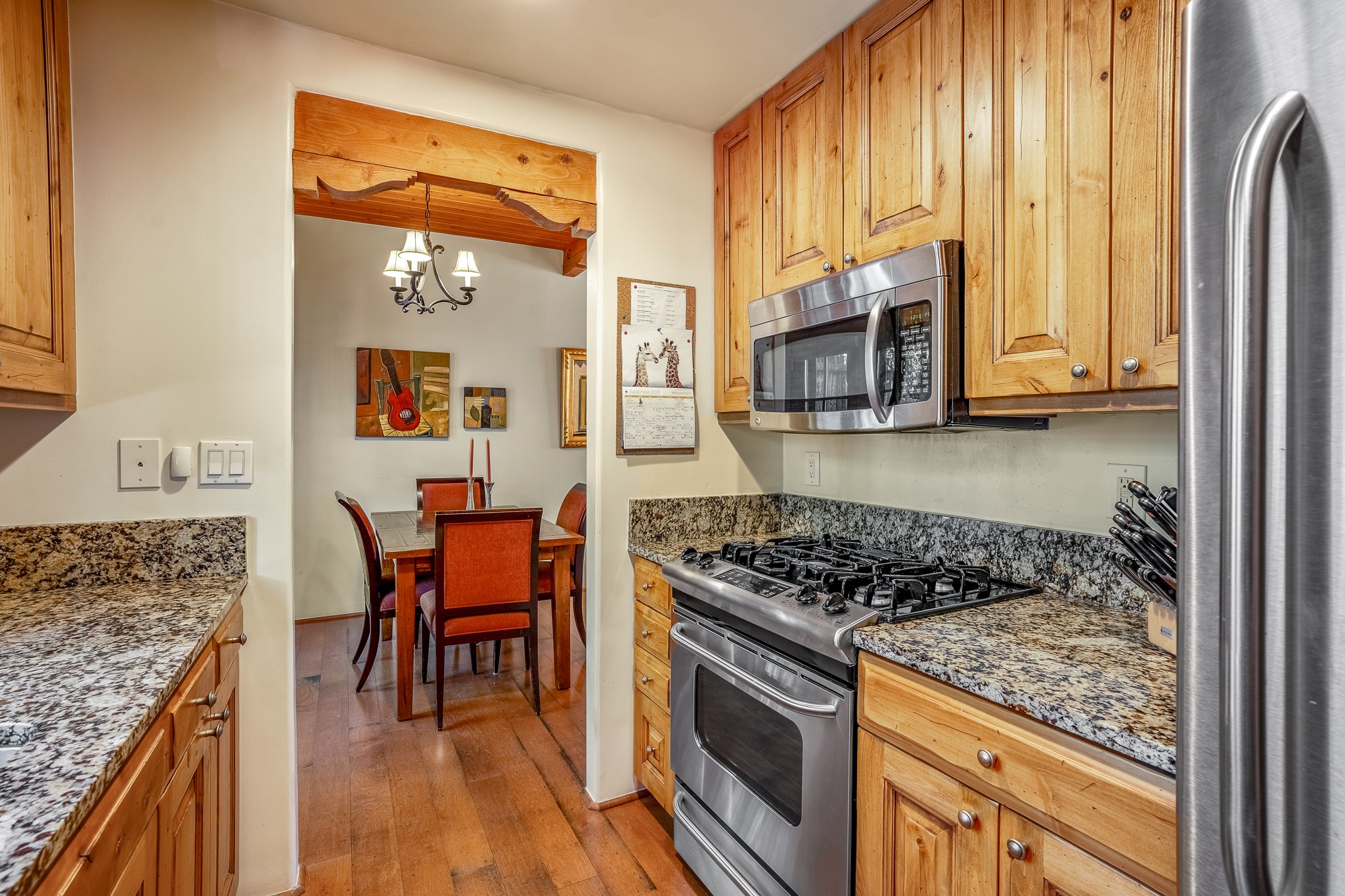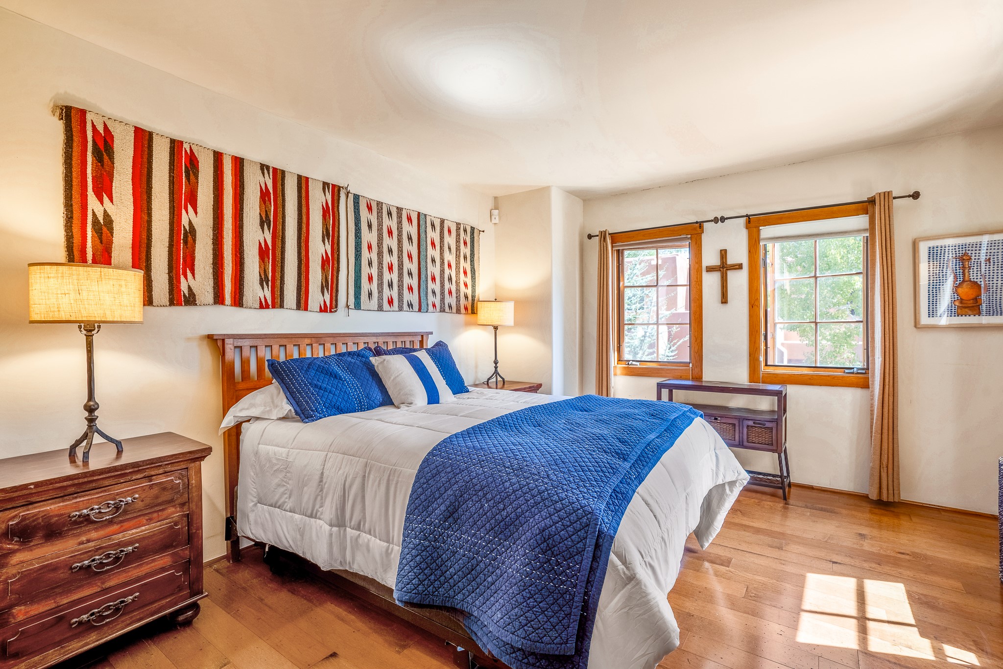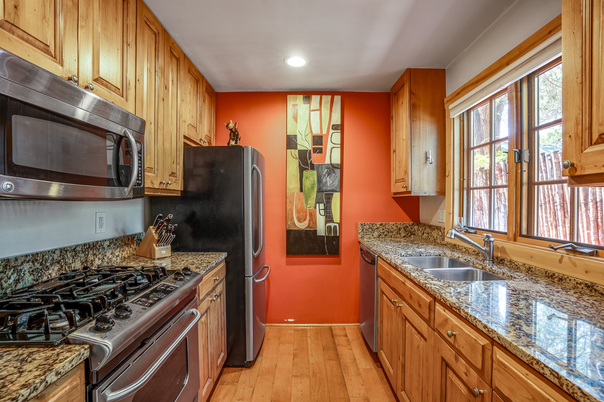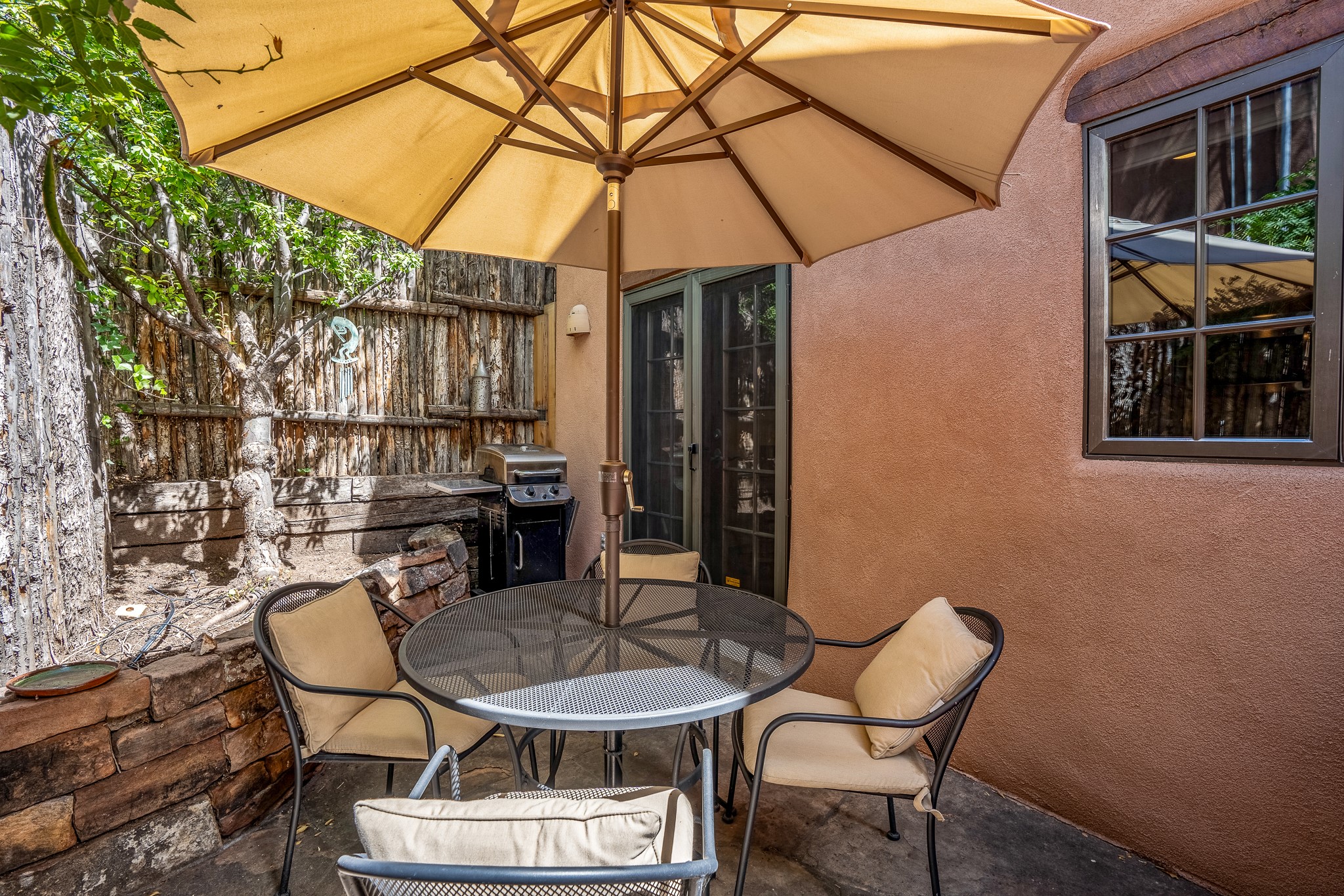 Close to the Santa Fe Plaza, you say? Welcome to the Muralla Compound, a peaceful enclave just off Rosario and a few blocks from the City Different's finest dining and shopping establishments. This modern, stylish condo offers a well-appointed two bedroom, one-and-a-half bathroom layout, complete with a one-car garage in a tranquil compound where convenience is key. Step through a landscaped entry and portal into an open living and dining space. The condo boasts updated, beautiful wood flooring throughout, high ceilings with vigas, a charming wood-burning kiva fireplace and an abundance of natural light. French doors from the dining room lead you onto the secluded rear patio-- an ideal setting for outdoor dining, a cozy seating area, raised garden beds, and a grill. The kitchen has undergone a tasteful transformation featuring a stainless steel appliance package including a four-burner gas range, granite counter tops and back splash. Adjacent to the front entry, there is a convenient powder room for the comfort of your guests. Upstairs, you'll find two nicely proportioned bedrooms with ample storage space, accompanied by a full-bathroom with double vanities. Tucked discreetly into a hallway closet, you'll find a stackable washer and dryer for added convenience.This 1,183 square foot gem has radiant heat and mini-splits to ensure year-round comfort. The entire complex has a new TPO roof, recent stucco work, new chimney liners, and the condo association covers exterior maintenance and common areas. Furthermore, its Commercial zoning permits 7 day+ short term rentals, subject to the necessary permits and approvals. A furniture package can be negotiated if interested. Schedule your visit today and make this condo your Santa Fe get-away or care-free, full-time residence.