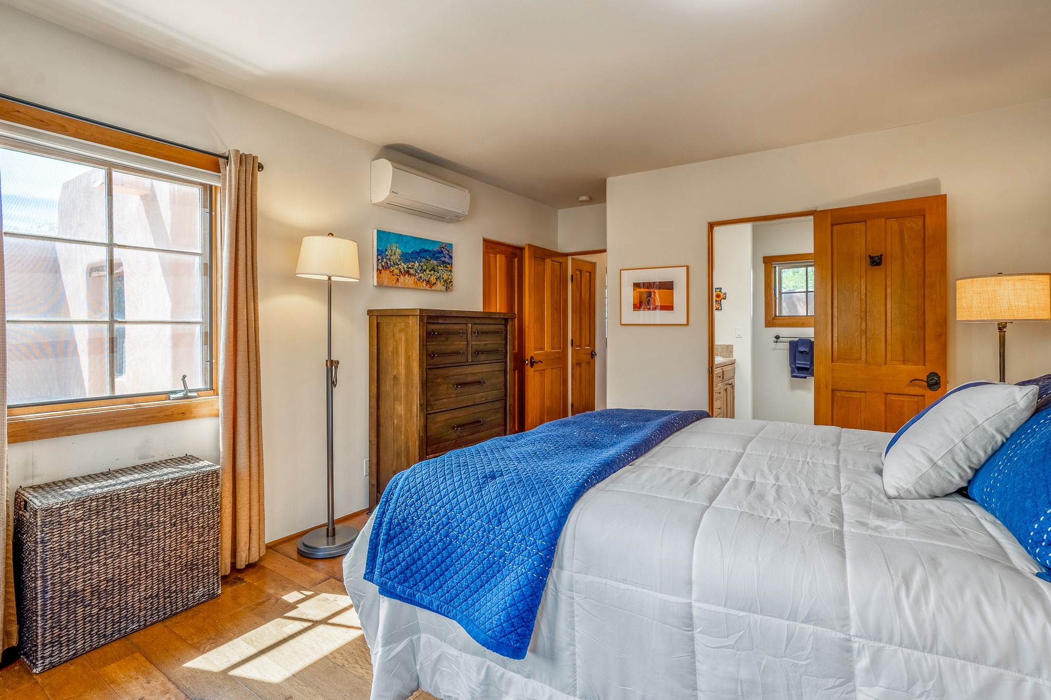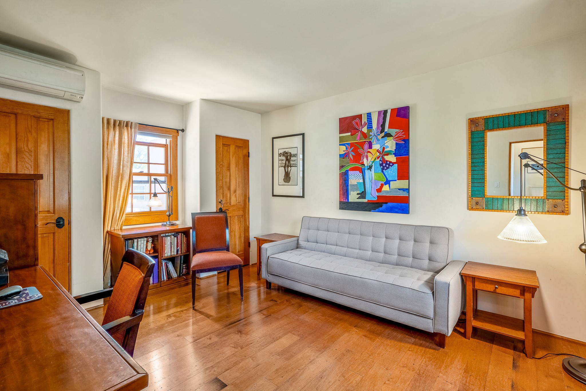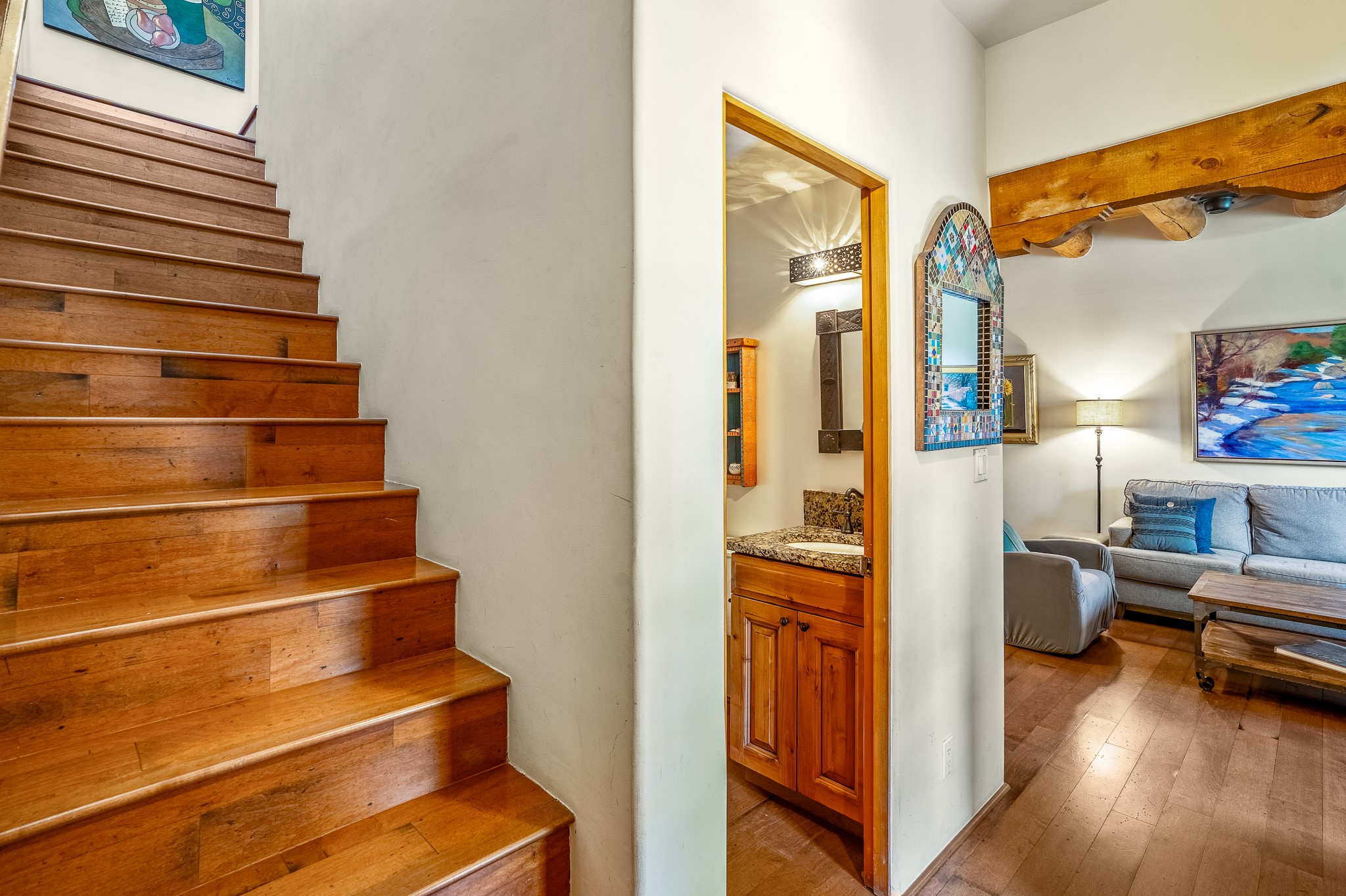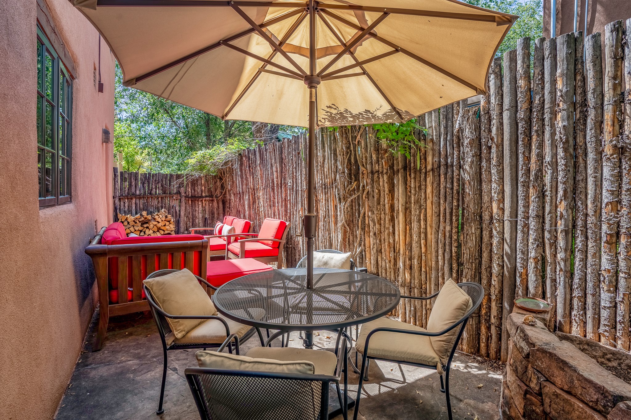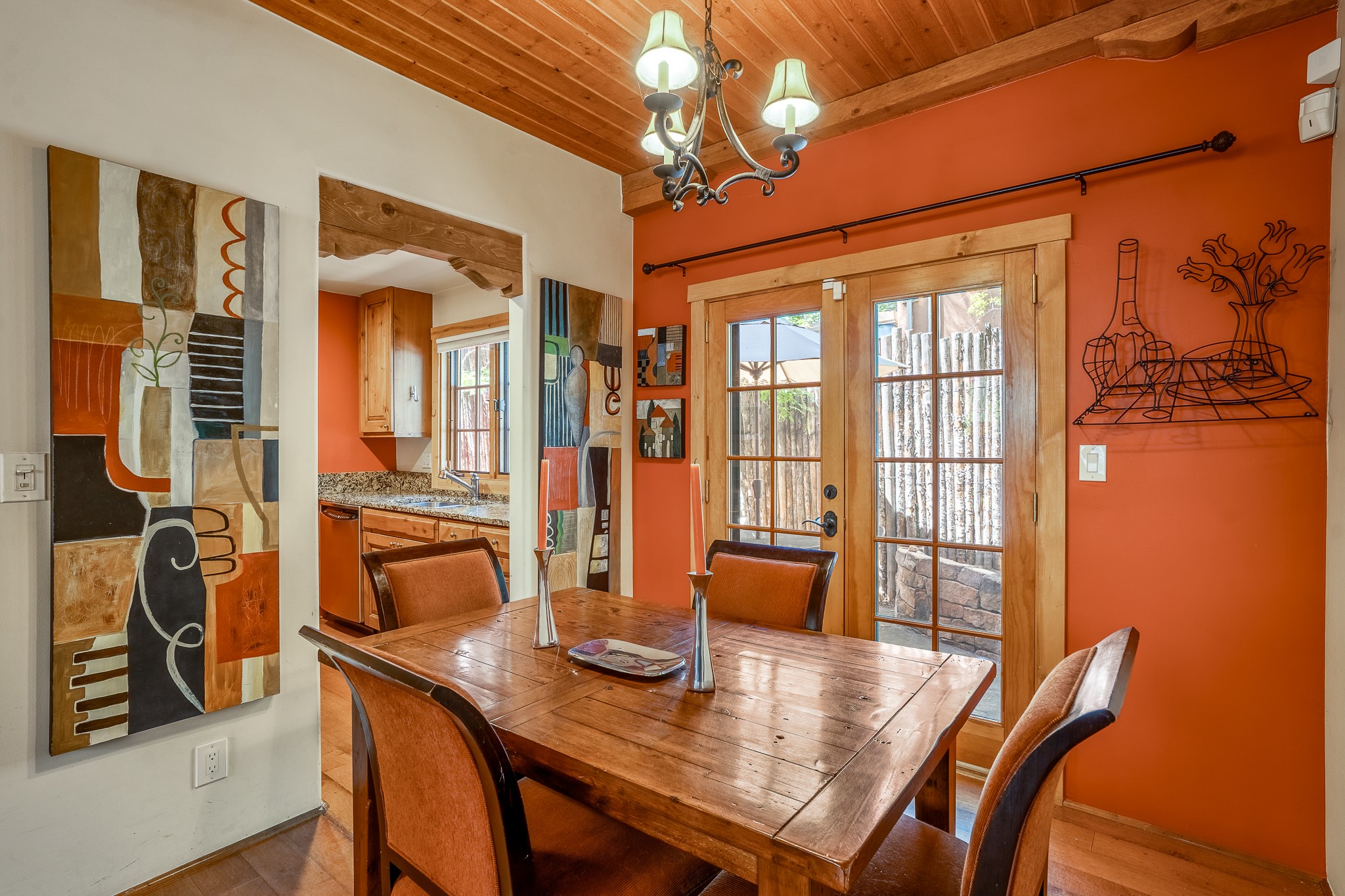 Close to the Santa Fe Plaza, you say? Welcome to the Muralla Compound, a peaceful enclave just off Rosario and a few blocks from the City Different's finest dining and shopping establishments. This modern, stylish condo offers a well-appointed two bedroom, one-and-a-half bathroom layout, complete with a one-car garage in a tranquil compound where convenience is key. Step through a landscaped entry and portal into an open living and dining space. The condo boasts updated, beautiful wood flooring throughout, high ceilings with vigas, a charming wood-burning kiva fireplace and an abundance of natural light. French doors from the dining room lead you onto the secluded rear patio-- an ideal setting for outdoor dining, a cozy seating area, raised garden beds, and a grill. The kitchen has undergone a tasteful transformation featuring a stainless steel appliance package including a four-burner gas range, granite counter tops and back splash. Adjacent to the front entry, there is a convenient powder room for the comfort of your guests. Upstairs, you'll find two nicely proportioned bedrooms with ample storage space, accompanied by a full-bathroom with double vanities. Tucked discreetly into a hallway closet, you'll find a stackable washer and dryer for added convenience.This 1,183 square foot gem has radiant heat and mini-splits to ensure year-round comfort. The entire complex has a new TPO roof, recent stucco work, new chimney liners, and the condo association covers exterior maintenance and common areas. Furthermore, its Commercial zoning permits 7 day+ short term rentals, subject to the necessary permits and approvals. A furniture package can be negotiated if interested. Schedule your visit today and make this condo your Santa Fe get-away or care-free, full-time residence.
