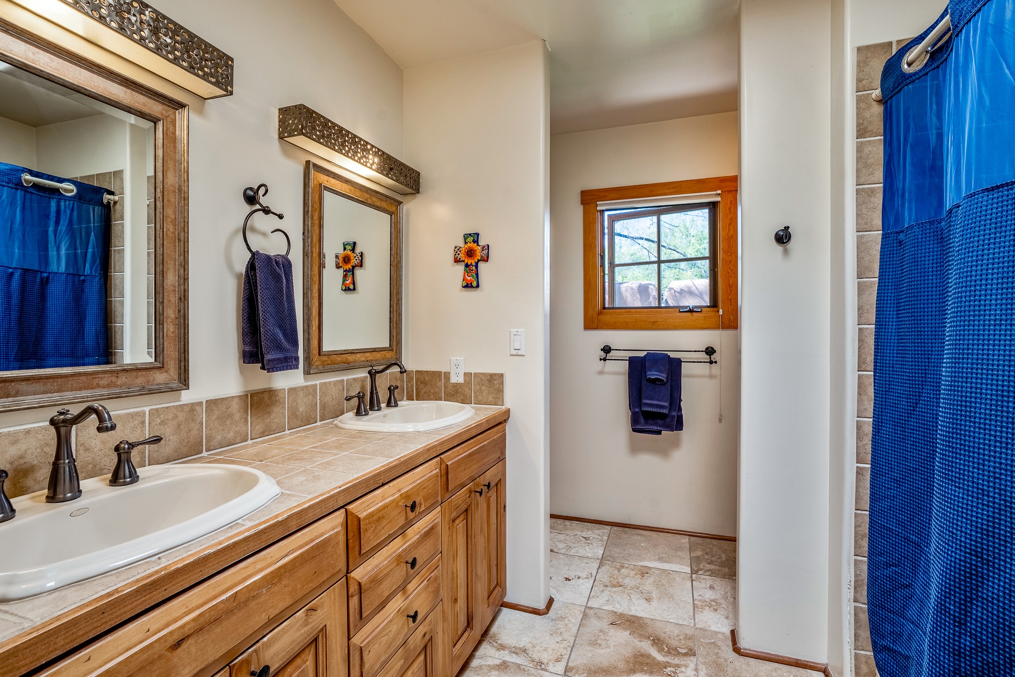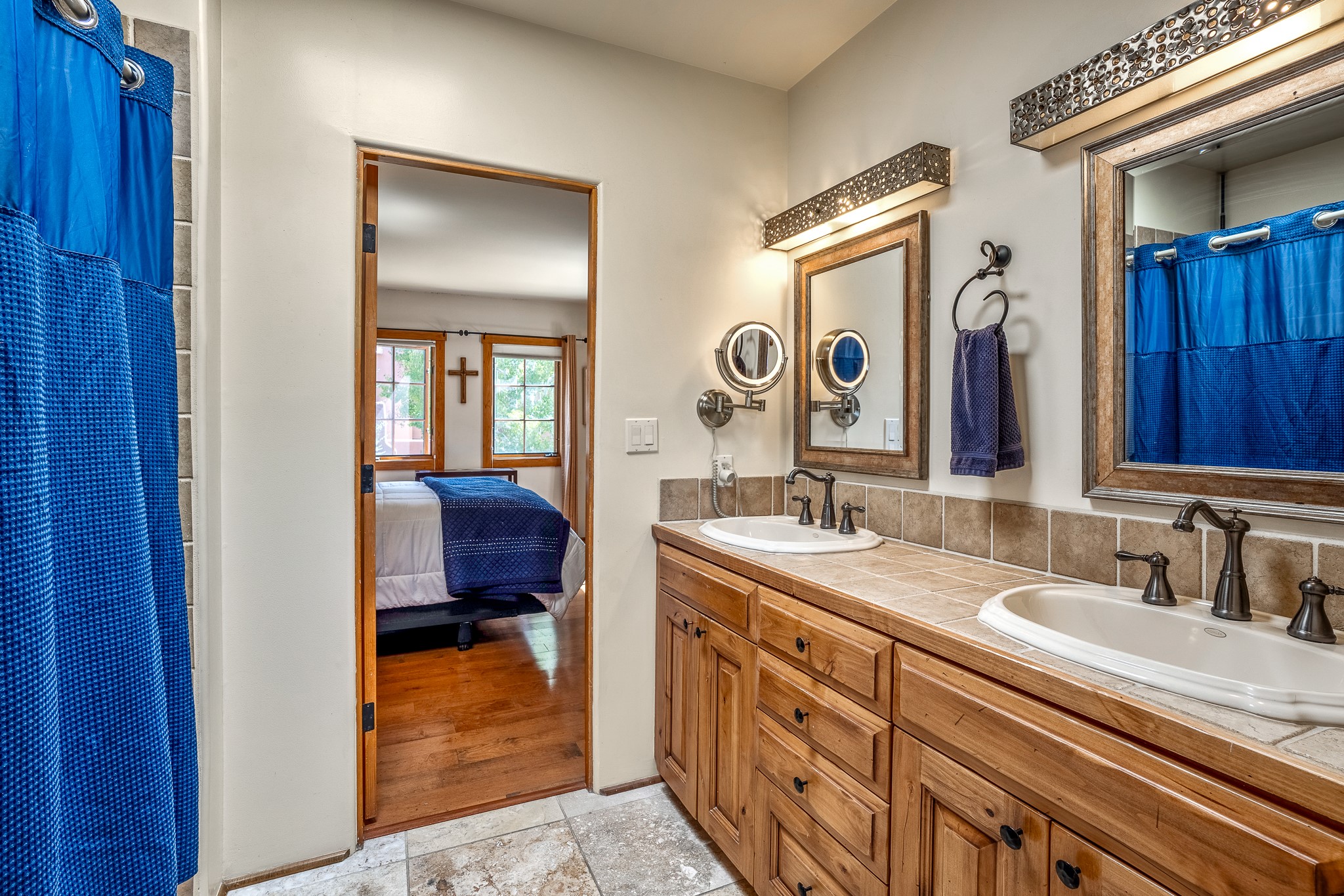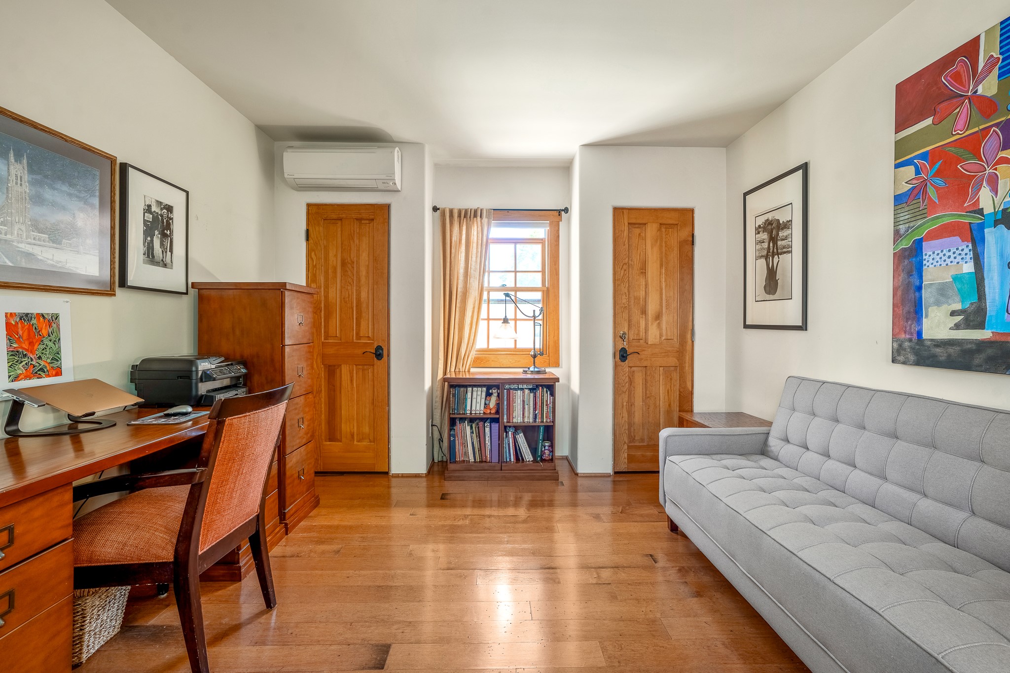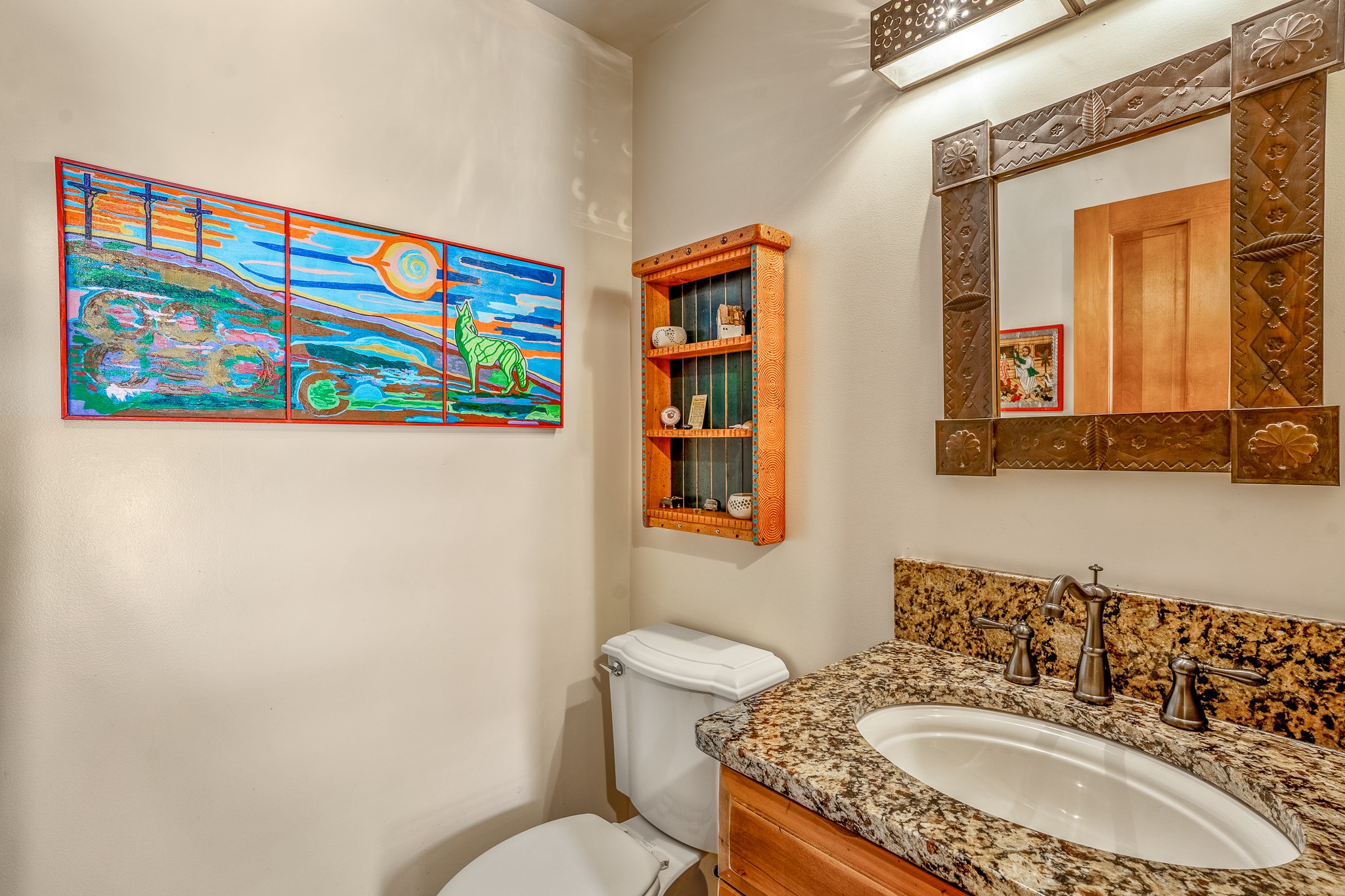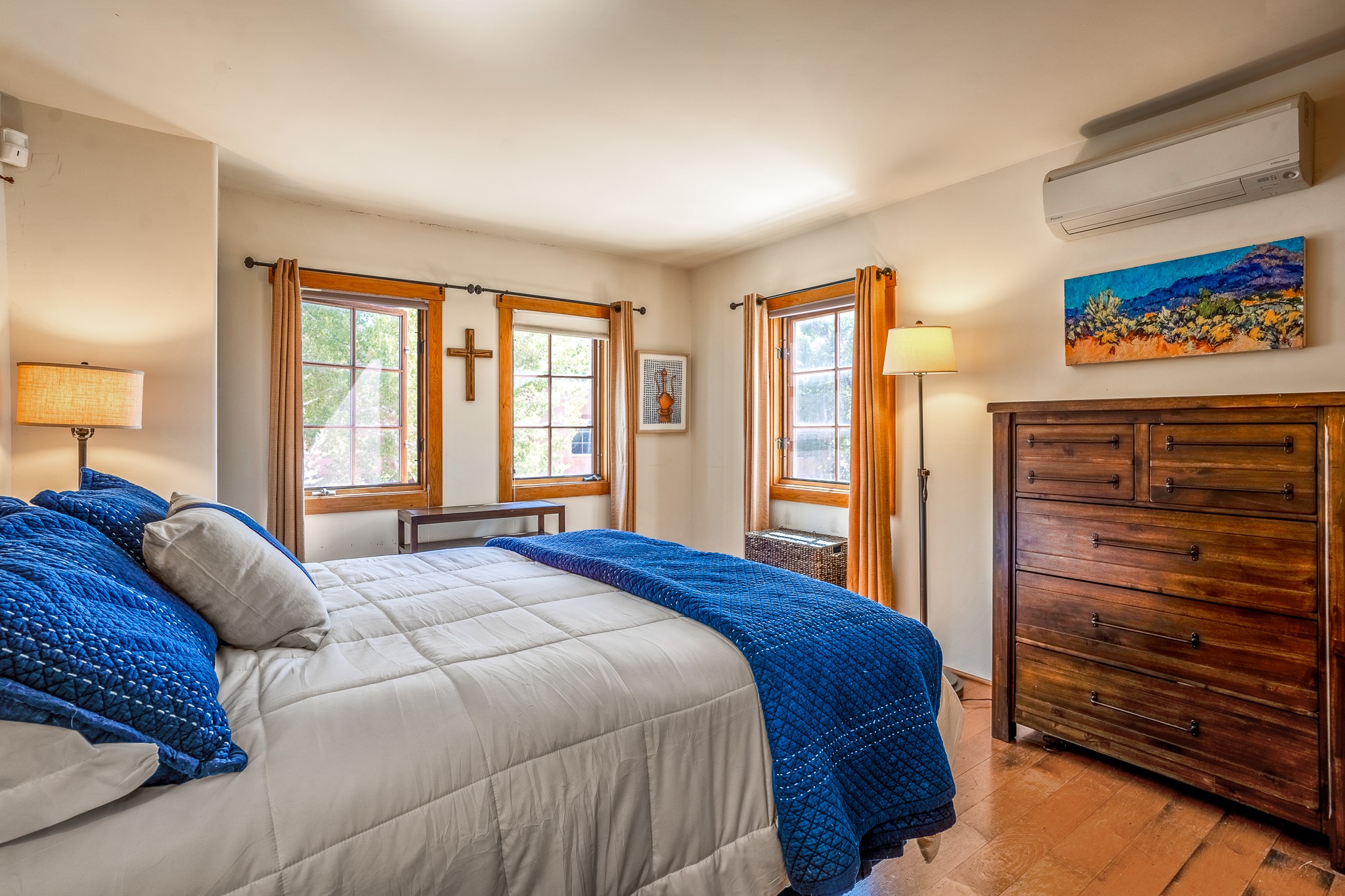 Close to the Santa Fe Plaza, you say? Welcome to the Muralla Compound, a peaceful enclave just off Rosario and a few blocks from the City Different's finest dining and shopping establishments. This modern, stylish condo offers a well-appointed two bedroom, one-and-a-half bathroom layout, complete with a one-car garage in a tranquil compound where convenience is key. Step through a landscaped entry and portal into an open living and dining space. The condo boasts updated, beautiful wood flooring throughout, high ceilings with vigas, a charming wood-burning kiva fireplace and an abundance of natural light. French doors from the dining room lead you onto the secluded rear patio-- an ideal setting for outdoor dining, a cozy seating area, raised garden beds, and a grill. The kitchen has undergone a tasteful transformation featuring a stainless steel appliance package including a four-burner gas range, granite counter tops and back splash. Adjacent to the front entry, there is a convenient powder room for the comfort of your guests. Upstairs, you'll find two nicely proportioned bedrooms with ample storage space, accompanied by a full-bathroom with double vanities. Tucked discreetly into a hallway closet, you'll find a stackable washer and dryer for added convenience.This 1,183 square foot gem has radiant heat and mini-splits to ensure year-round comfort. The entire complex has a new TPO roof, recent stucco work, new chimney liners, and the condo association covers exterior maintenance and common areas. Furthermore, its Commercial zoning permits 7 day+ short term rentals, subject to the necessary permits and approvals. A furniture package can be negotiated if interested. Schedule your visit today and make this condo your Santa Fe get-away or care-free, full-time residence.