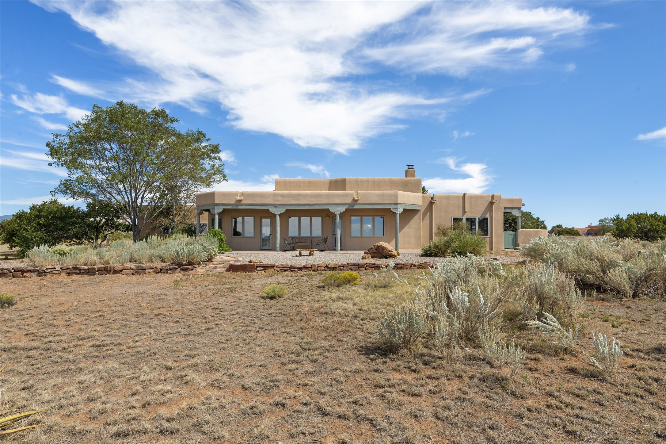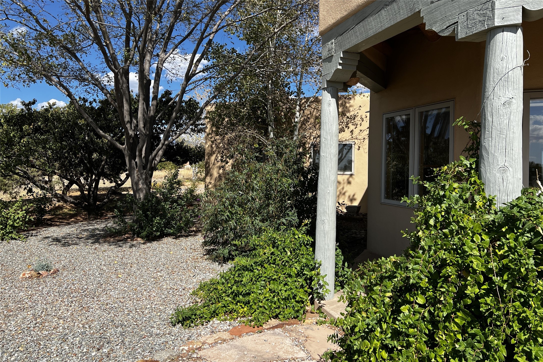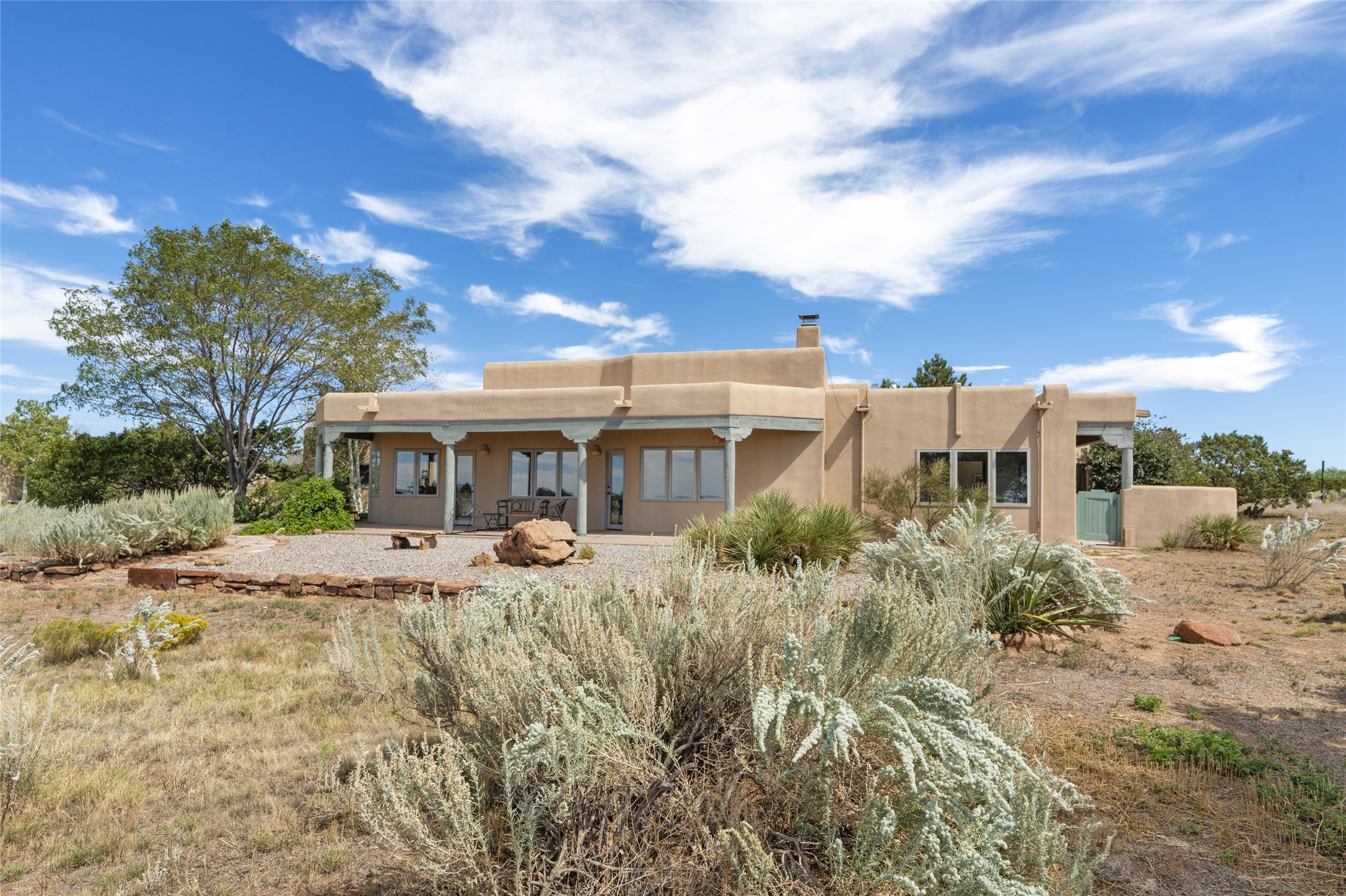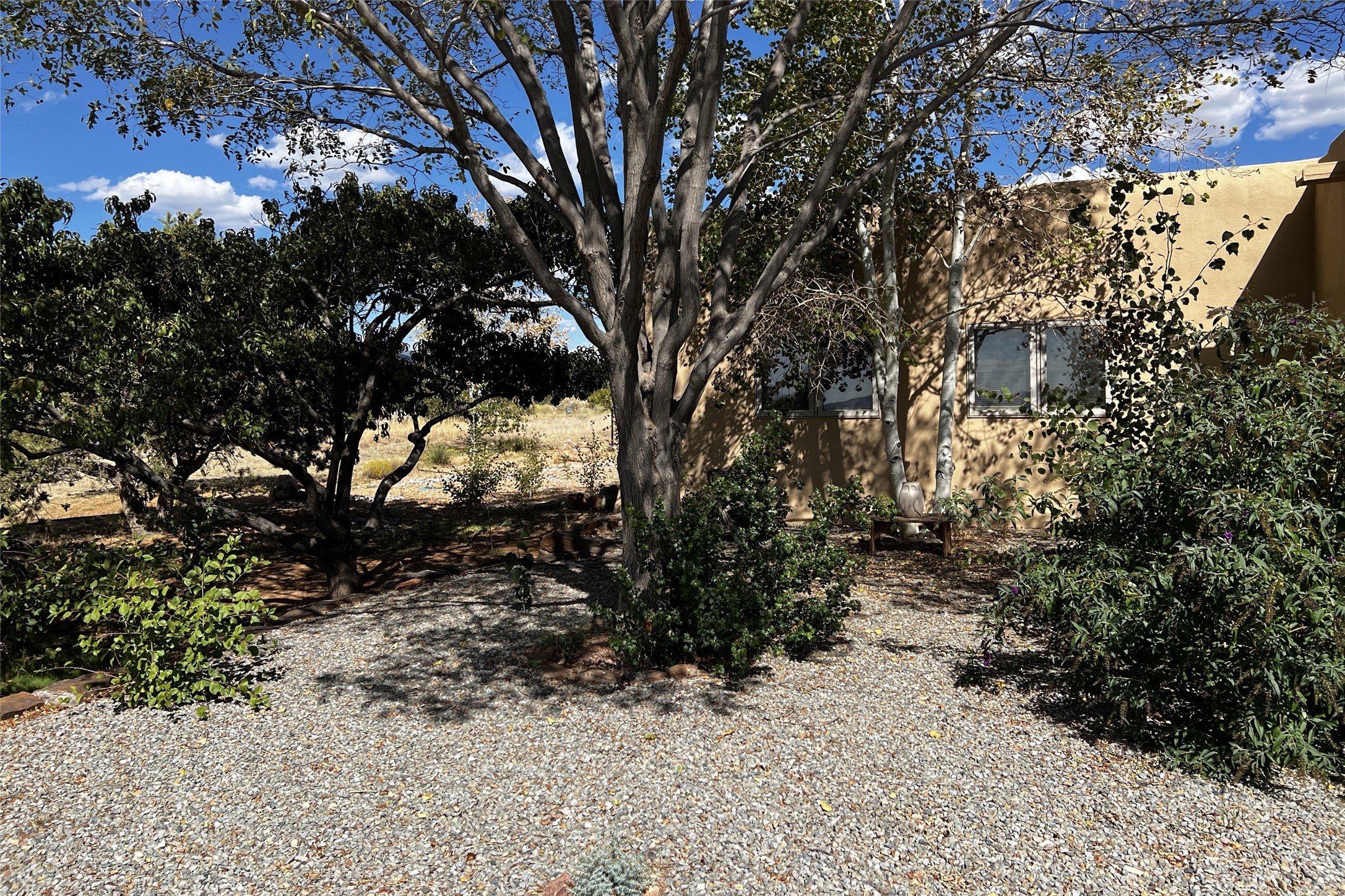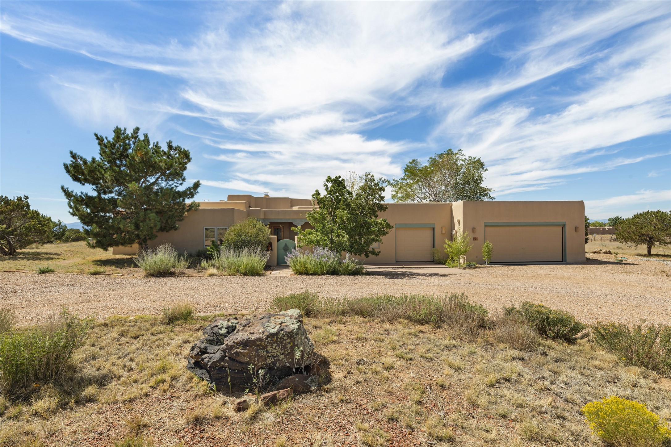 High desert sanctuary. Enjoy spectacular sunsets and dramatic mountain views from this 2453 square foot soft contemporary pueblo-style home. Enter through a colorful and lush courtyard into an elegant foyer and spacious, light-filled living/dining area with tiled floors, fireplace, and high ceilings with vigas. The large, updated eat-in kitchen features slab granite counter tops and an island, slide-out cupboard shelving, stainless steel appliances and pantry. Both the kitchen and the great room share stunning views and access to the portal that opens out to the high desert landscape and vistas of the Ortiz, Sandia, and Jemez mountains, creating an inviting space for hosting family and friends. The owner's bedroom has tile floors and a private, tree-shaded courtyard. A large bathroom completes the owner's suite with a jetted tub, separate shower, water closet, double sinks, and a generous walk-in closet which includes one of the home's 19 skylights. Two additional bedrooms and a full bath are accessed from a hallway with an entrance from the front courtyard. At the other side of the house is a library or office space, also with access from the front courtyard, and a third garage bay or art studio plus an approximately 700 sq ft finished over-sized two car garage. Off the kitchen, the convenient laundry room has plenty of cabinets, a large closet and a sink. The gas-fired in-floor radiant heating and the four mini-split units for cooling and additional heating ensure comfortable living year-round. Another lovely feature of this 1.21 acre property are the mature aspens, pines and other shade trees. The home, which was reroofed in 2019, is located only two doors off-pavement and is adjacent to the Rail Trail which runs between Lamy Village and Santa Fe proper, offering miles of hiking and biking.