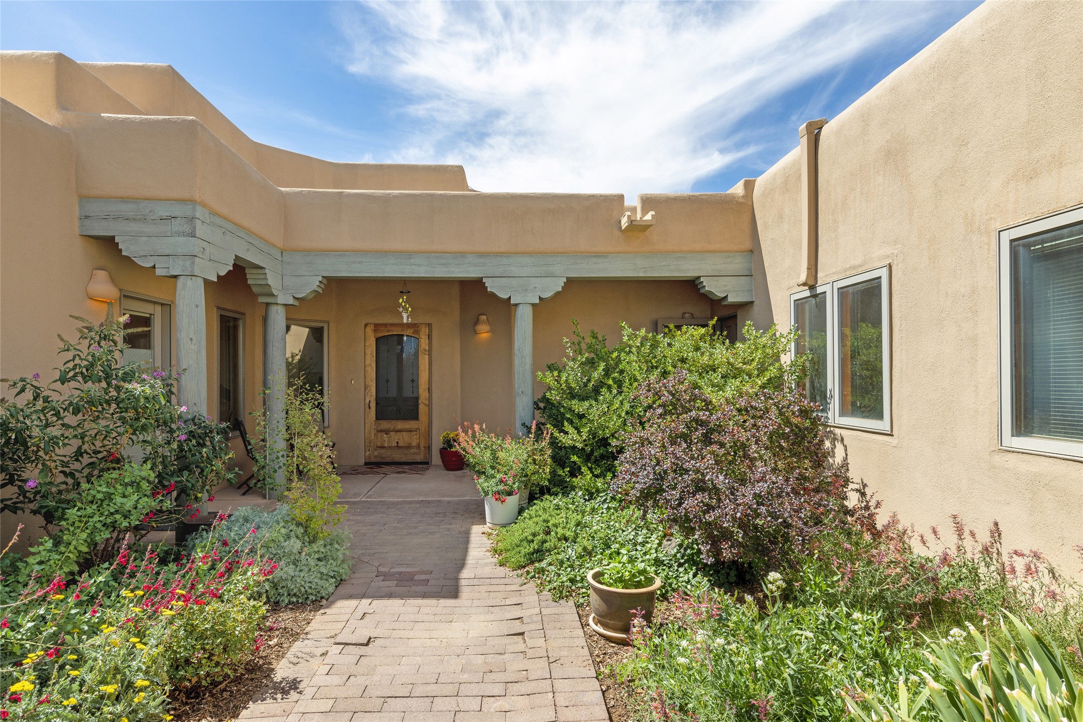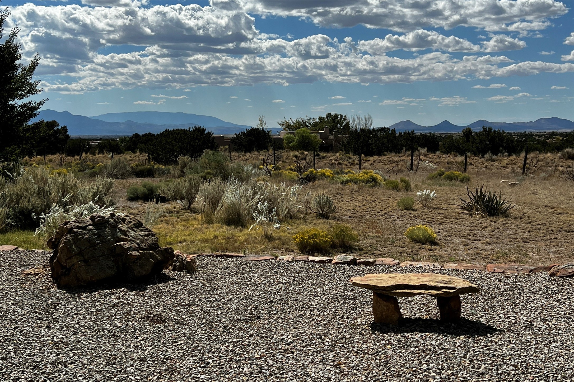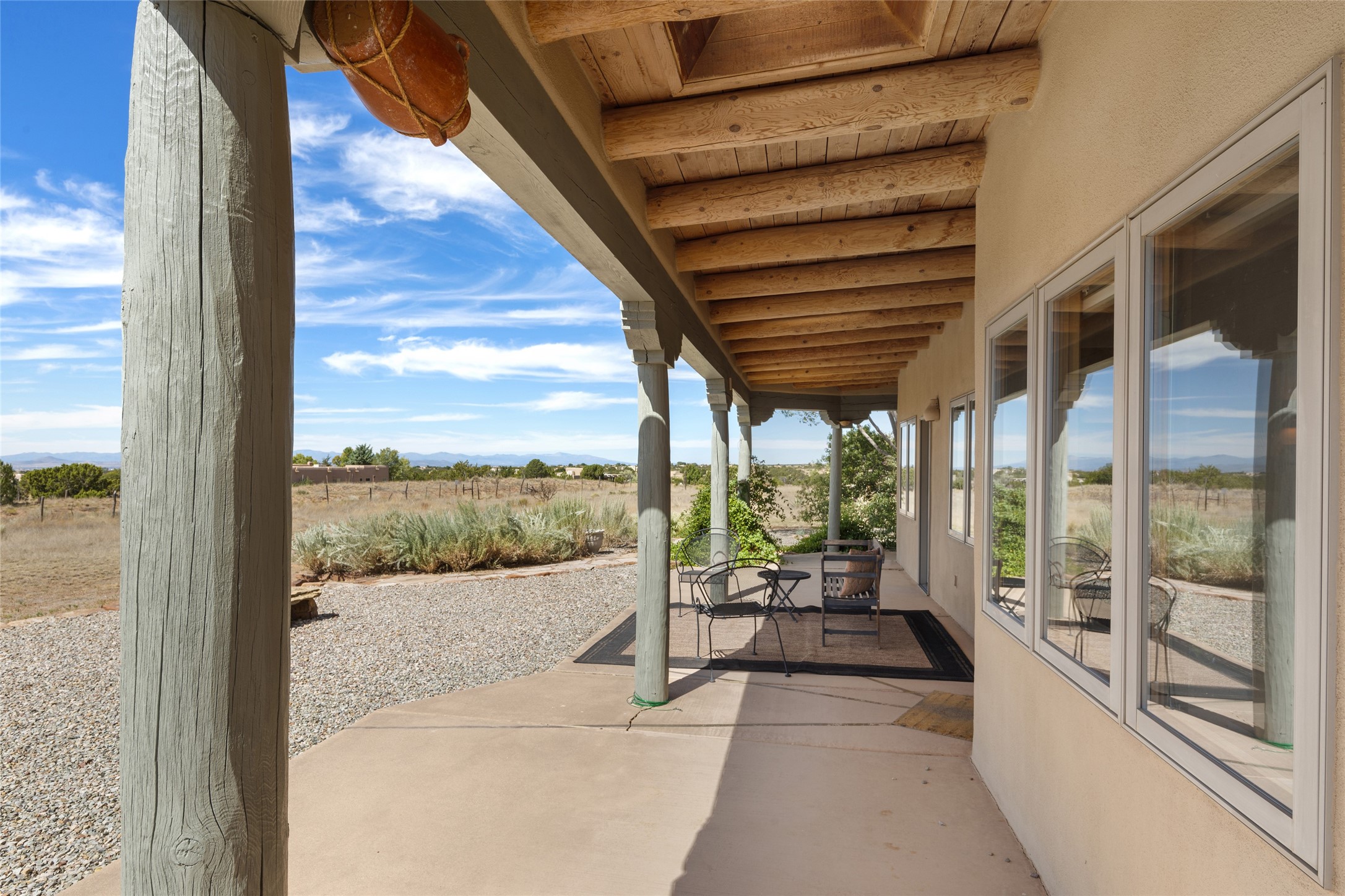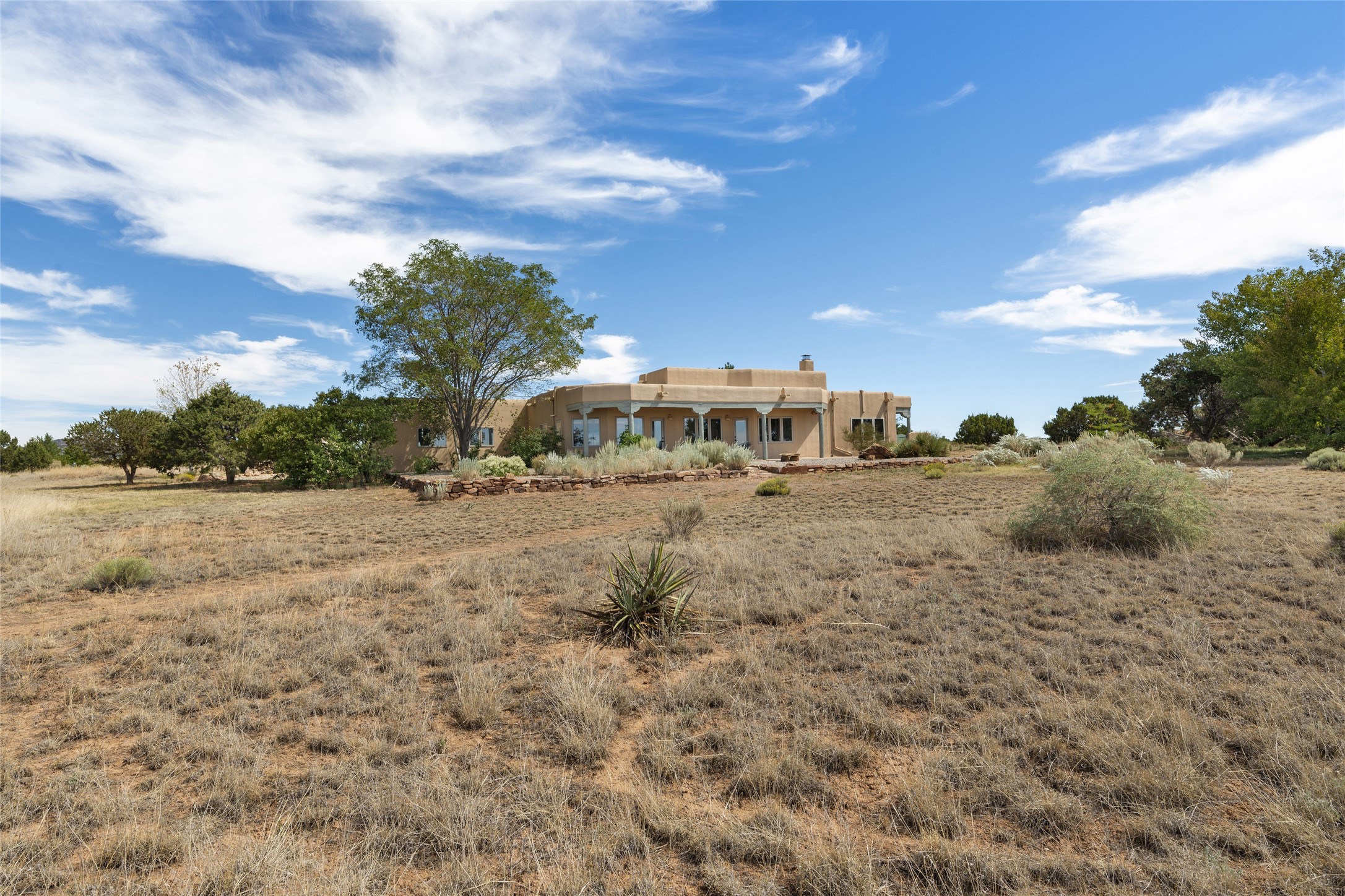 High desert sanctuary. Enjoy spectacular sunsets and dramatic mountain views from this 2453 square foot soft contemporary pueblo-style home. Enter through a colorful and lush courtyard into an elegant foyer and spacious, light-filled living/dining area with tiled floors, fireplace, and high ceilings with vigas. The large, updated eat-in kitchen features slab granite counter tops and an island, slide-out cupboard shelving, stainless steel appliances and pantry. Both the kitchen and the great room share stunning views and access to the portal that opens out to the high desert landscape and vistas of the Ortiz, Sandia, and Jemez mountains, creating an inviting space for hosting family and friends. The owner's bedroom has tile floors and a private, tree-shaded courtyard. A large bathroom completes the owner's suite with a jetted tub, separate shower, water closet, double sinks, and a generous walk-in closet which includes one of the home's 19 skylights. Two additional bedrooms and a full bath are accessed from a hallway with an entrance from the front courtyard. At the other side of the house is a library or office space, also with access from the front courtyard, and a third garage bay or art studio plus an approximately 700 sq ft finished over-sized two car garage. Off the kitchen, the convenient laundry room has plenty of cabinets, a large closet and a sink. The gas-fired in-floor radiant heating and the four mini-split units for cooling and additional heating ensure comfortable living year-round. Another lovely feature of this 1.21 acre property are the mature aspens, pines and other shade trees. The home, which was reroofed in 2019, is located only two doors off-pavement and is adjacent to the Rail Trail which runs between Lamy Village and Santa Fe proper, offering miles of hiking and biking.