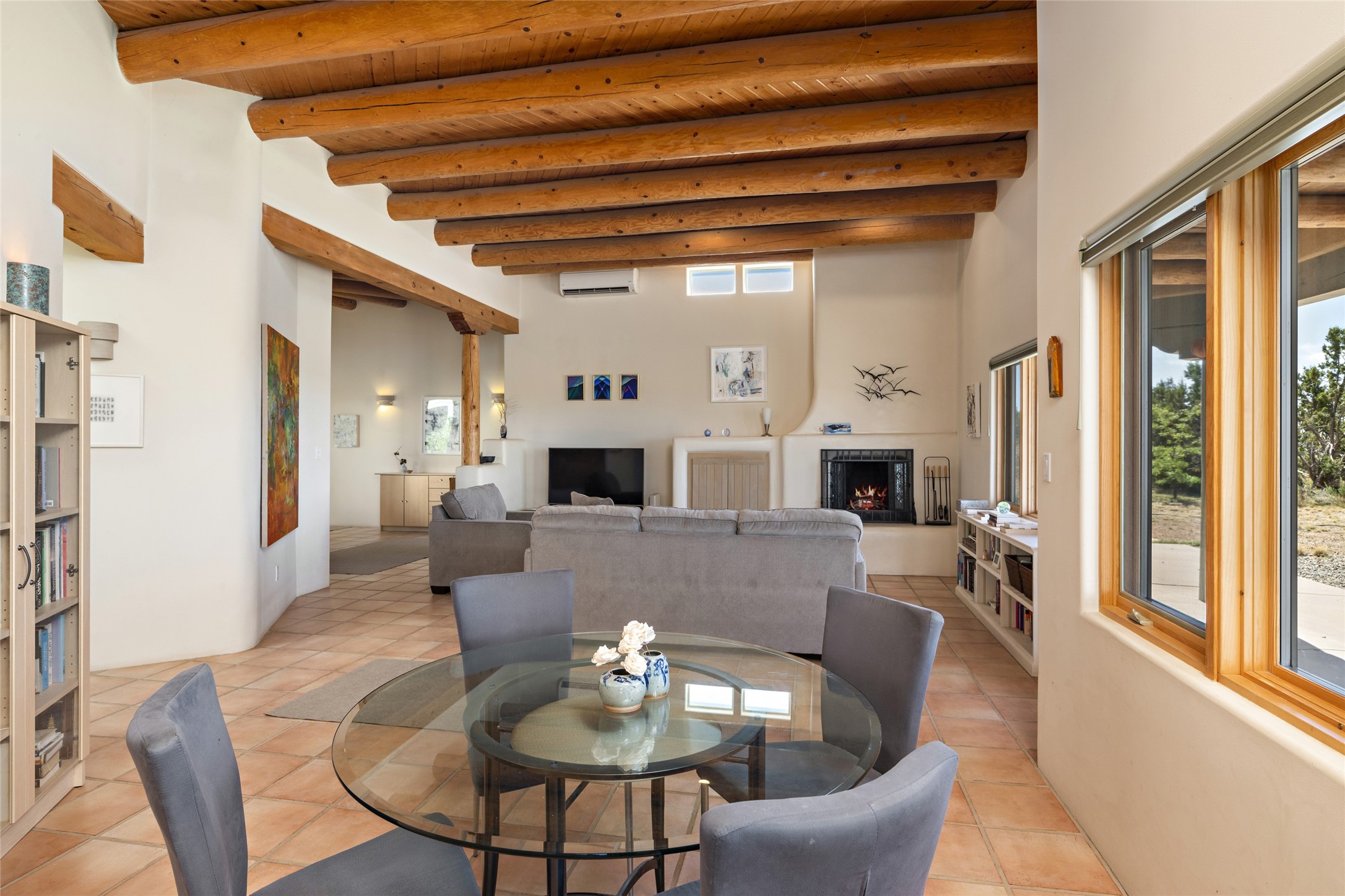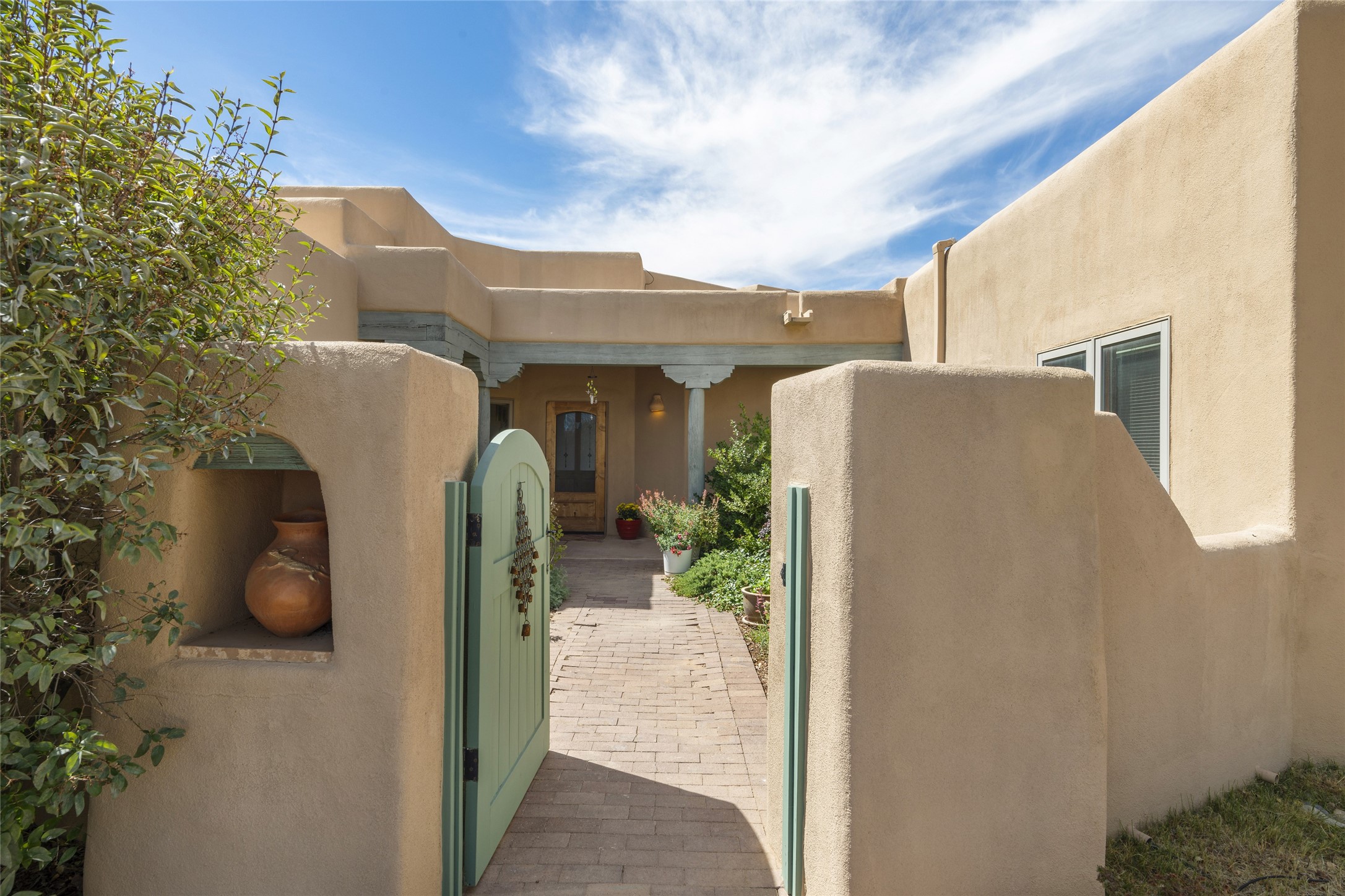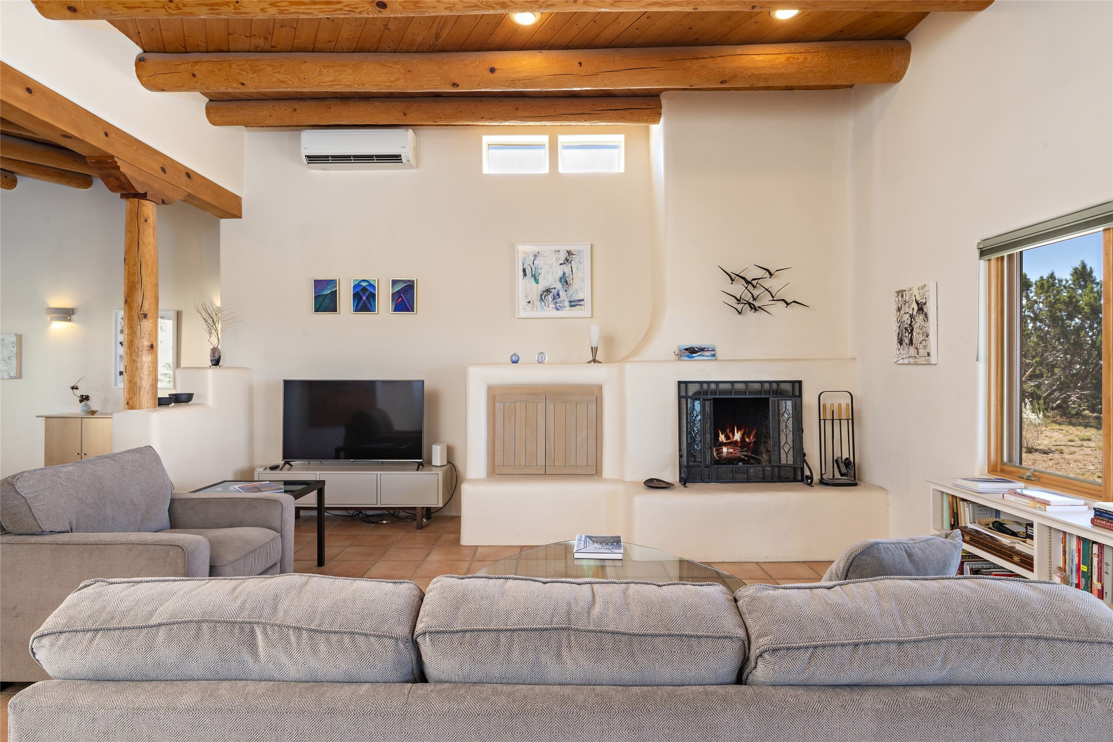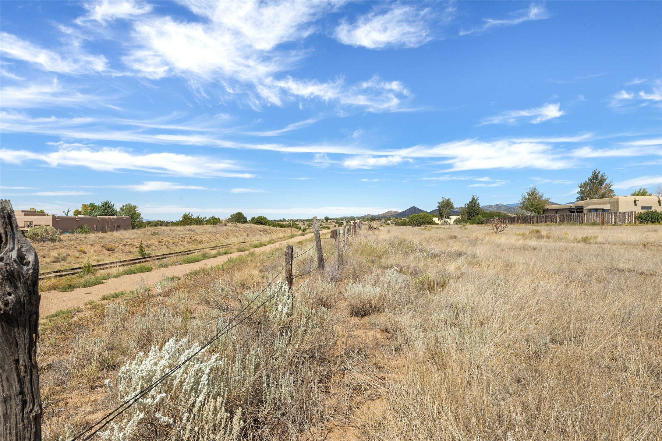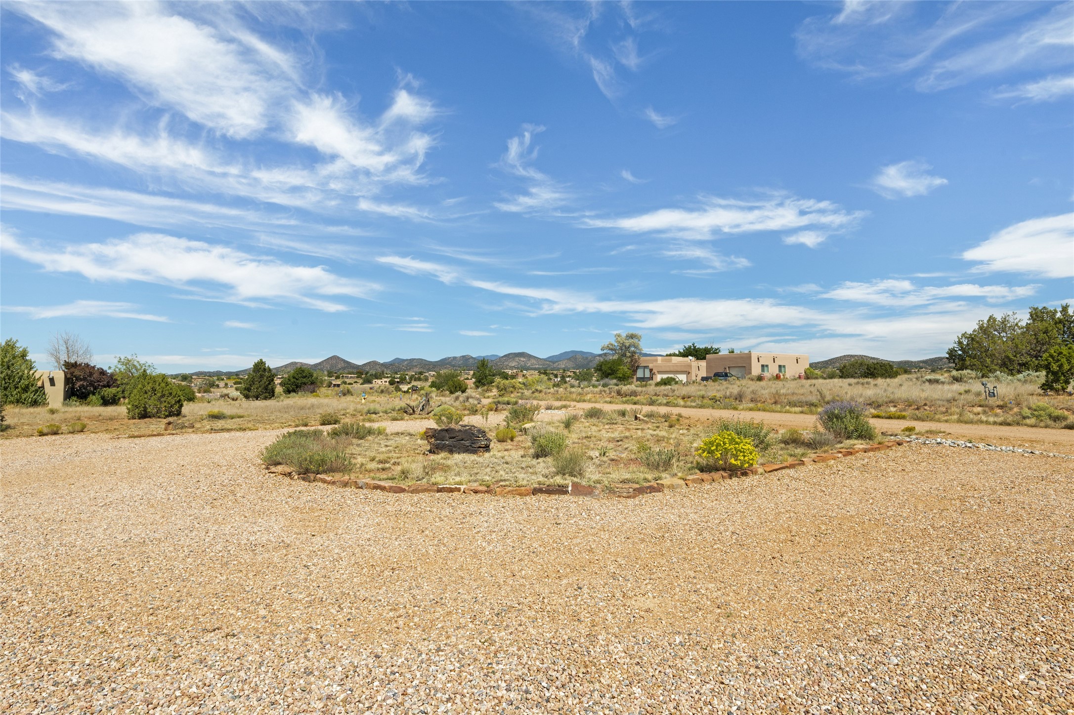 High desert sanctuary. Enjoy spectacular sunsets and dramatic mountain views from this 2453 square foot soft contemporary pueblo-style home. Enter through a colorful and lush courtyard into an elegant foyer and spacious, light-filled living/dining area with tiled floors, fireplace, and high ceilings with vigas. The large, updated eat-in kitchen features slab granite counter tops and an island, slide-out cupboard shelving, stainless steel appliances and pantry. Both the kitchen and the great room share stunning views and access to the portal that opens out to the high desert landscape and vistas of the Ortiz, Sandia, and Jemez mountains, creating an inviting space for hosting family and friends. The owner's bedroom has tile floors and a private, tree-shaded courtyard. A large bathroom completes the owner's suite with a jetted tub, separate shower, water closet, double sinks, and a generous walk-in closet which includes one of the home's 19 skylights. Two additional bedrooms and a full bath are accessed from a hallway with an entrance from the front courtyard. At the other side of the house is a library or office space, also with access from the front courtyard, and a third garage bay or art studio plus an approximately 700 sq ft finished over-sized two car garage. Off the kitchen, the convenient laundry room has plenty of cabinets, a large closet and a sink. The gas-fired in-floor radiant heating and the four mini-split units for cooling and additional heating ensure comfortable living year-round. Another lovely feature of this 1.21 acre property are the mature aspens, pines and other shade trees. The home, which was reroofed in 2019, is located only two doors off-pavement and is adjacent to the Rail Trail which runs between Lamy Village and Santa Fe proper, offering miles of hiking and biking.