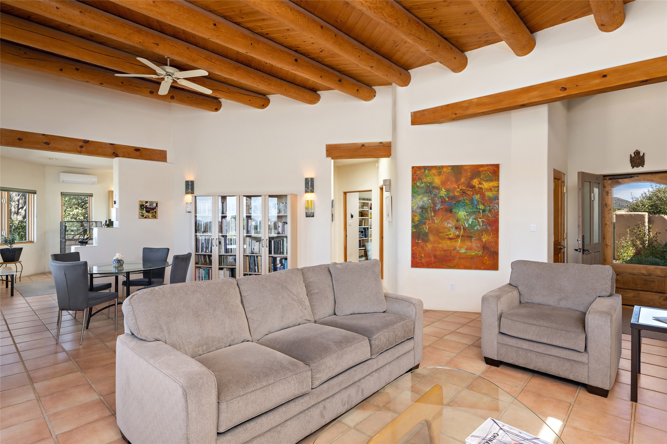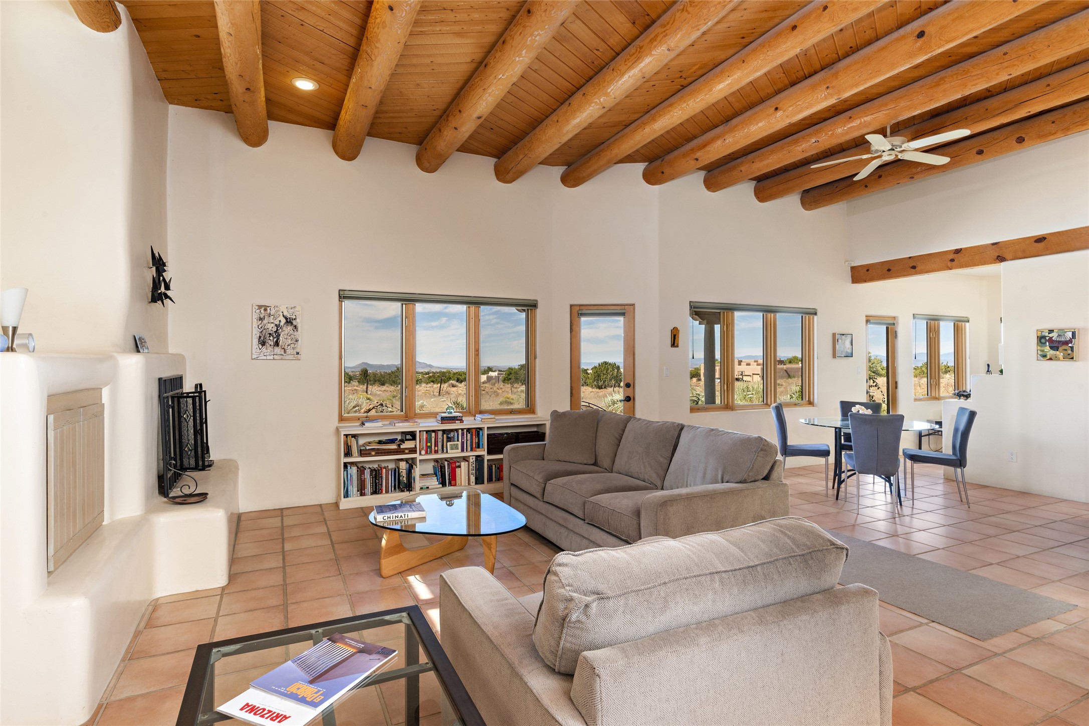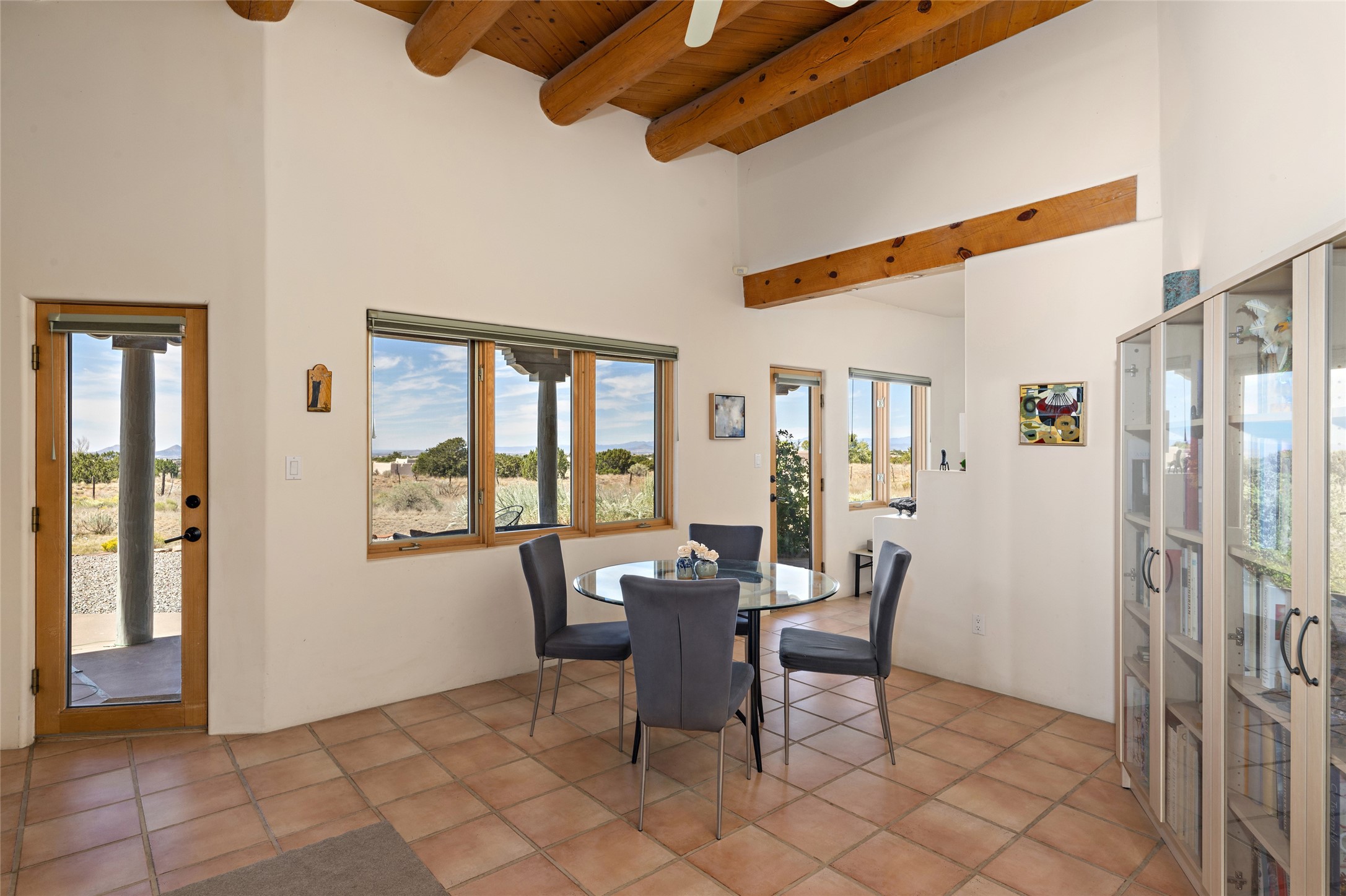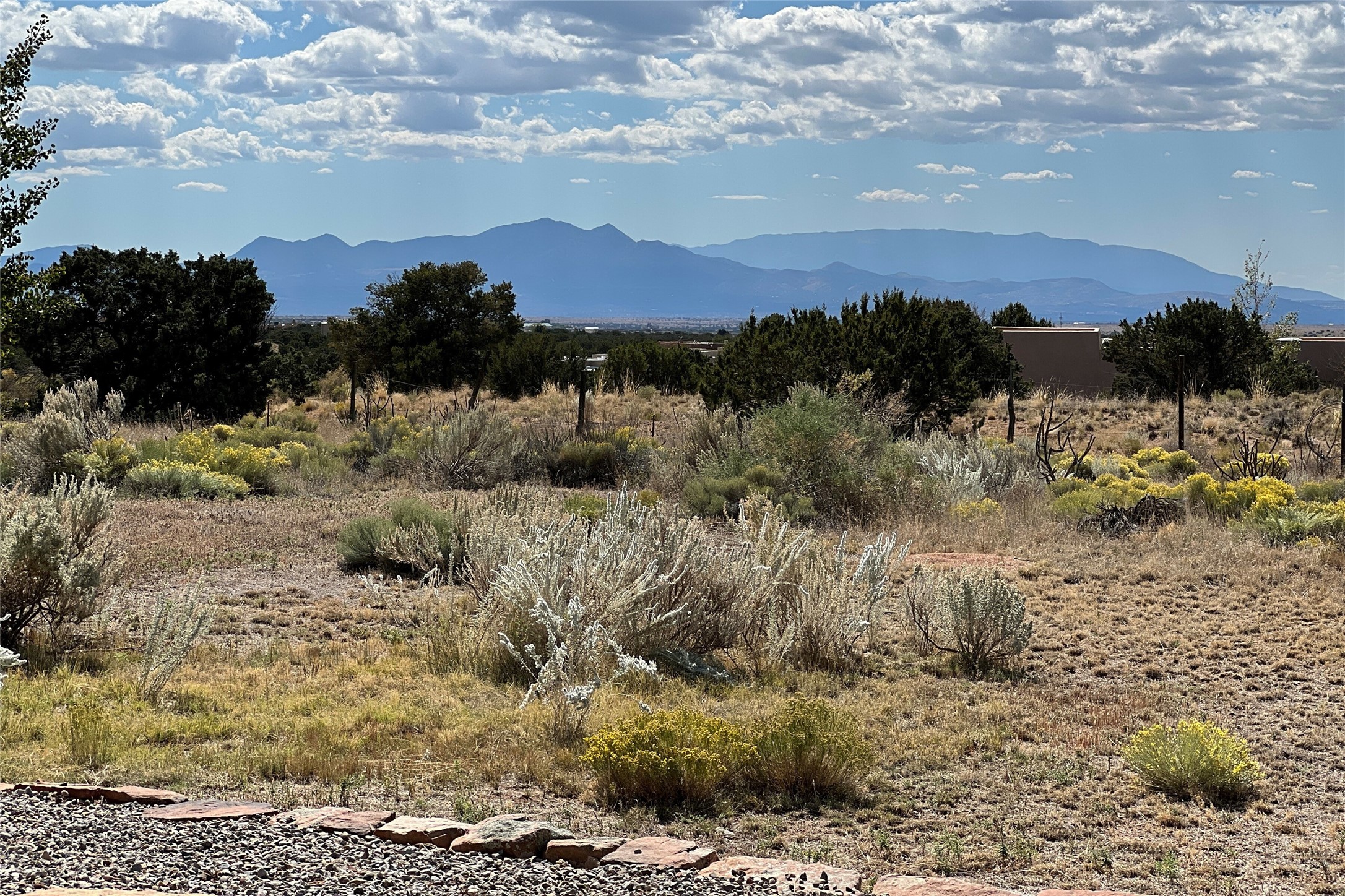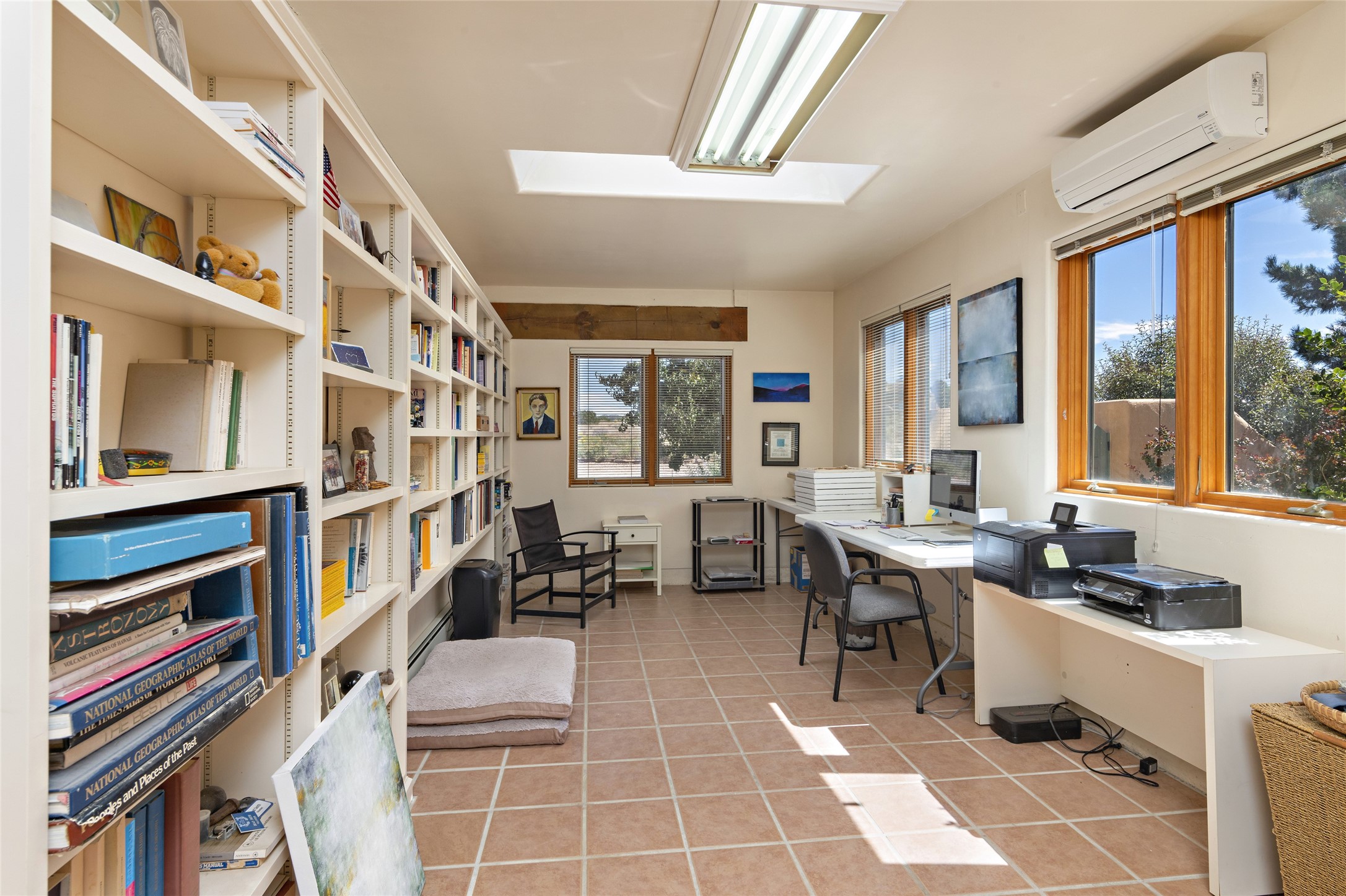 High desert sanctuary. Enjoy spectacular sunsets and dramatic mountain views from this 2453 square foot soft contemporary pueblo-style home. Enter through a colorful and lush courtyard into an elegant foyer and spacious, light-filled living/dining area with tiled floors, fireplace, and high ceilings with vigas. The large, updated eat-in kitchen features slab granite counter tops and an island, slide-out cupboard shelving, stainless steel appliances and pantry. Both the kitchen and the great room share stunning views and access to the portal that opens out to the high desert landscape and vistas of the Ortiz, Sandia, and Jemez mountains, creating an inviting space for hosting family and friends. The owner's bedroom has tile floors and a private, tree-shaded courtyard. A large bathroom completes the owner's suite with a jetted tub, separate shower, water closet, double sinks, and a generous walk-in closet which includes one of the home's 19 skylights. Two additional bedrooms and a full bath are accessed from a hallway with an entrance from the front courtyard. At the other side of the house is a library or office space, also with access from the front courtyard, and a third garage bay or art studio plus an approximately 700 sq ft finished over-sized two car garage. Off the kitchen, the convenient laundry room has plenty of cabinets, a large closet and a sink. The gas-fired in-floor radiant heating and the four mini-split units for cooling and additional heating ensure comfortable living year-round. Another lovely feature of this 1.21 acre property are the mature aspens, pines and other shade trees. The home, which was reroofed in 2019, is located only two doors off-pavement and is adjacent to the Rail Trail which runs between Lamy Village and Santa Fe proper, offering miles of hiking and biking.