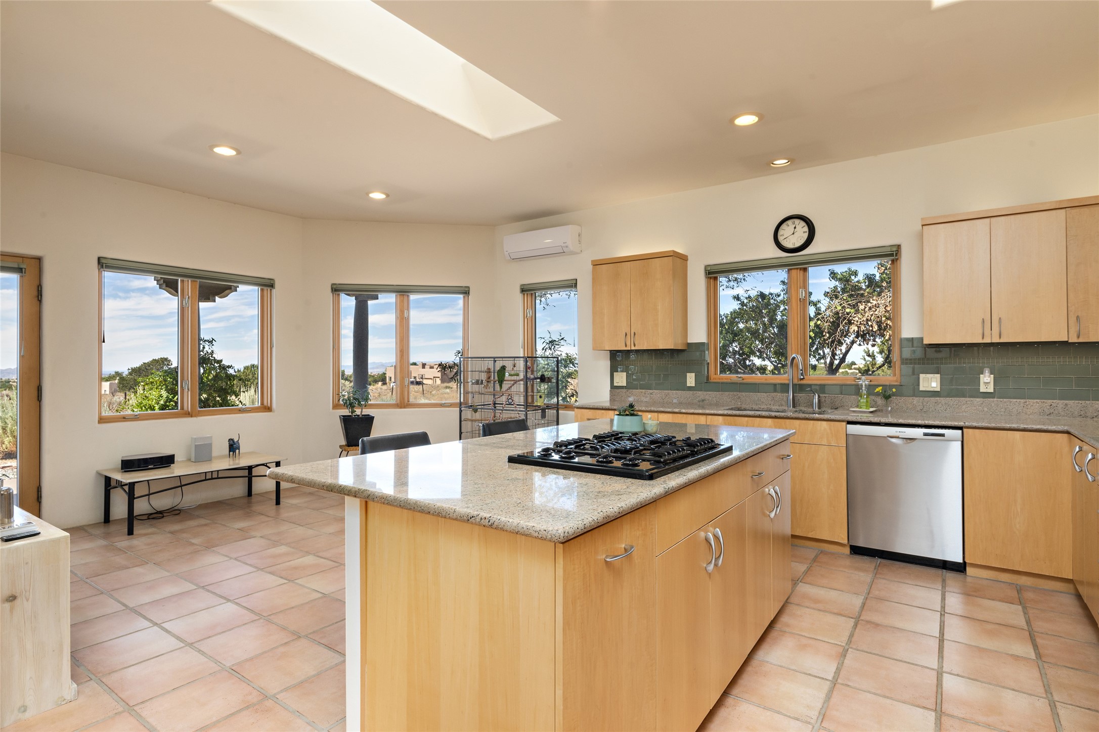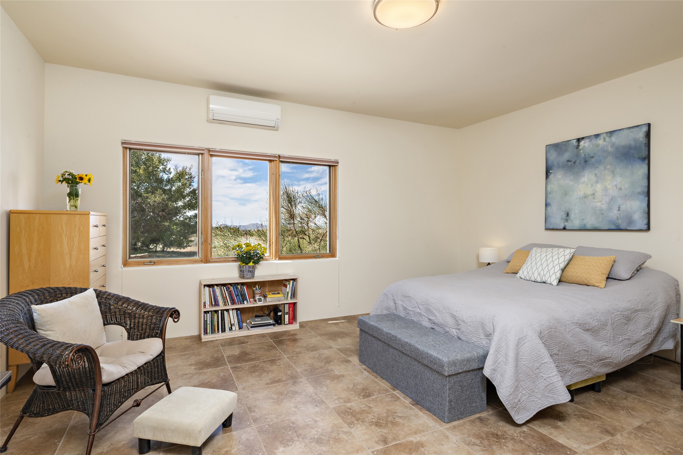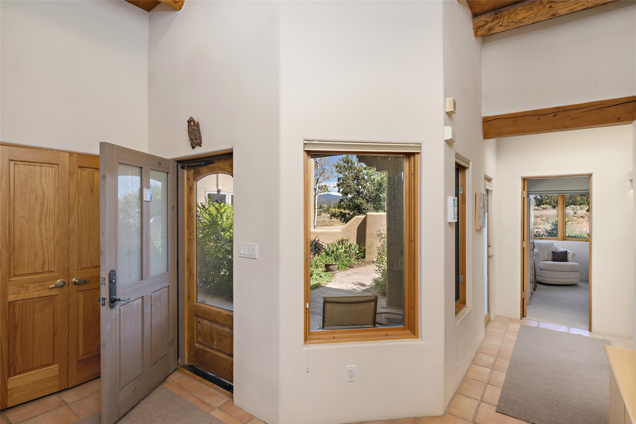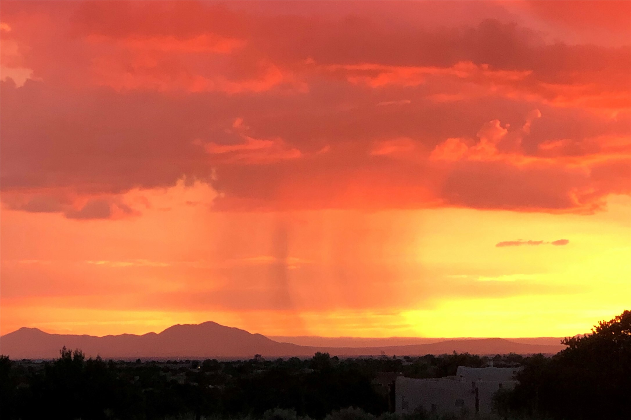 High desert sanctuary. Enjoy spectacular sunsets and dramatic mountain views from this 2453 square foot soft contemporary pueblo-style home. Enter through a colorful and lush courtyard into an elegant foyer and spacious, light-filled living/dining area with tiled floors, fireplace, and high ceilings with vigas. The large, updated eat-in kitchen features slab granite counter tops and an island, slide-out cupboard shelving, stainless steel appliances and pantry. Both the kitchen and the great room share stunning views and access to the portal that opens out to the high desert landscape and vistas of the Ortiz, Sandia, and Jemez mountains, creating an inviting space for hosting family and friends. The owner's bedroom has tile floors and a private, tree-shaded courtyard. A large bathroom completes the owner's suite with a jetted tub, separate shower, water closet, double sinks, and a generous walk-in closet which includes one of the home's 19 skylights. Two additional bedrooms and a full bath are accessed from a hallway with an entrance from the front courtyard. At the other side of the house is a library or office space, also with access from the front courtyard, and a third garage bay or art studio plus an approximately 700 sq ft finished over-sized two car garage. Off the kitchen, the convenient laundry room has plenty of cabinets, a large closet and a sink. The gas-fired in-floor radiant heating and the four mini-split units for cooling and additional heating ensure comfortable living year-round. Another lovely feature of this 1.21 acre property are the mature aspens, pines and other shade trees. The home, which was reroofed in 2019, is located only two doors off-pavement and is adjacent to the Rail Trail which runs between Lamy Village and Santa Fe proper, offering miles of hiking and biking.