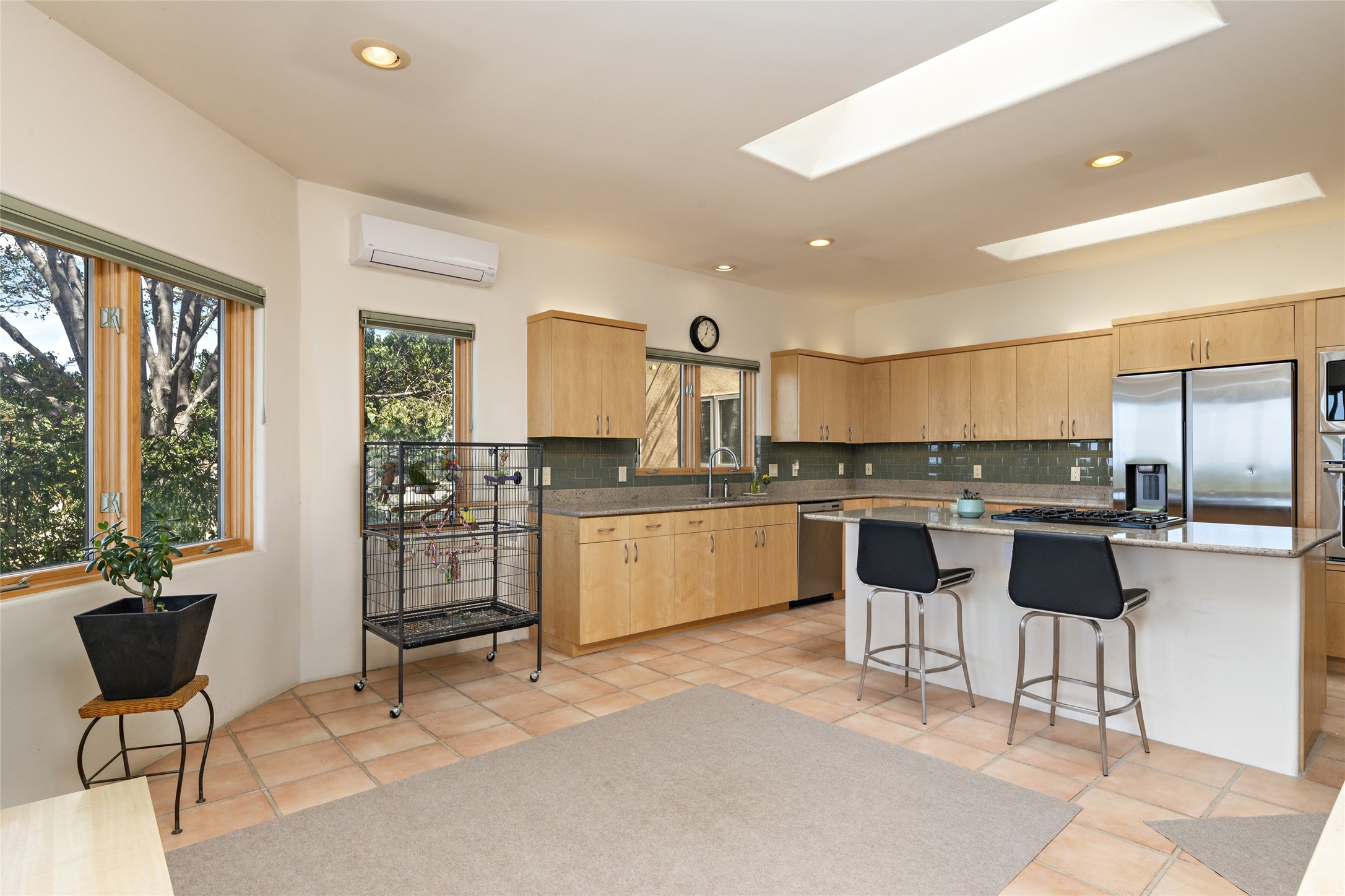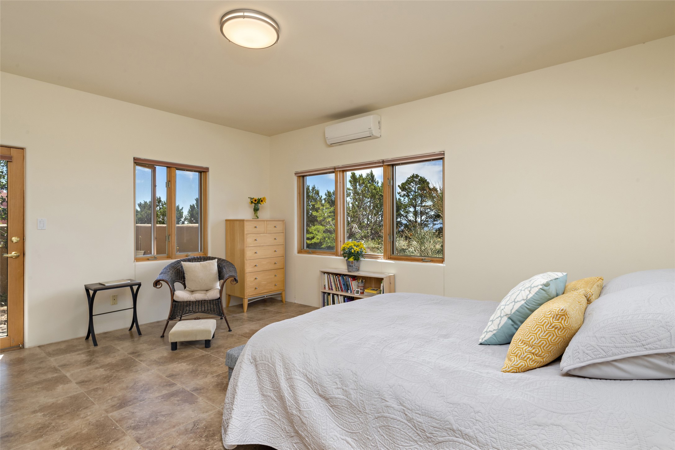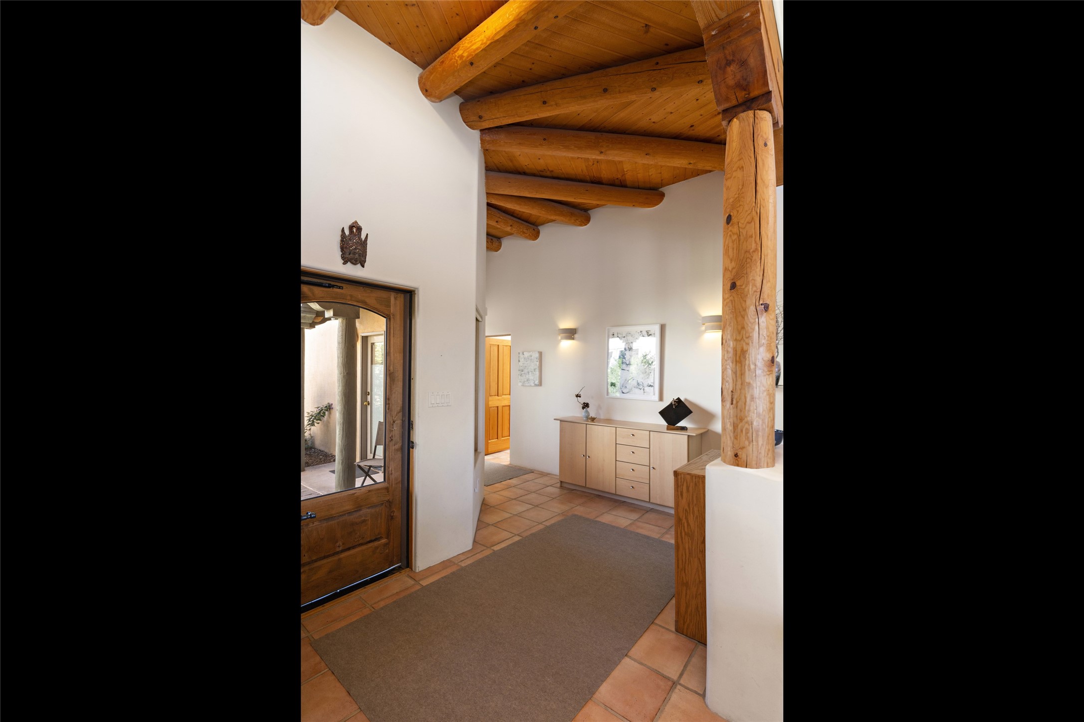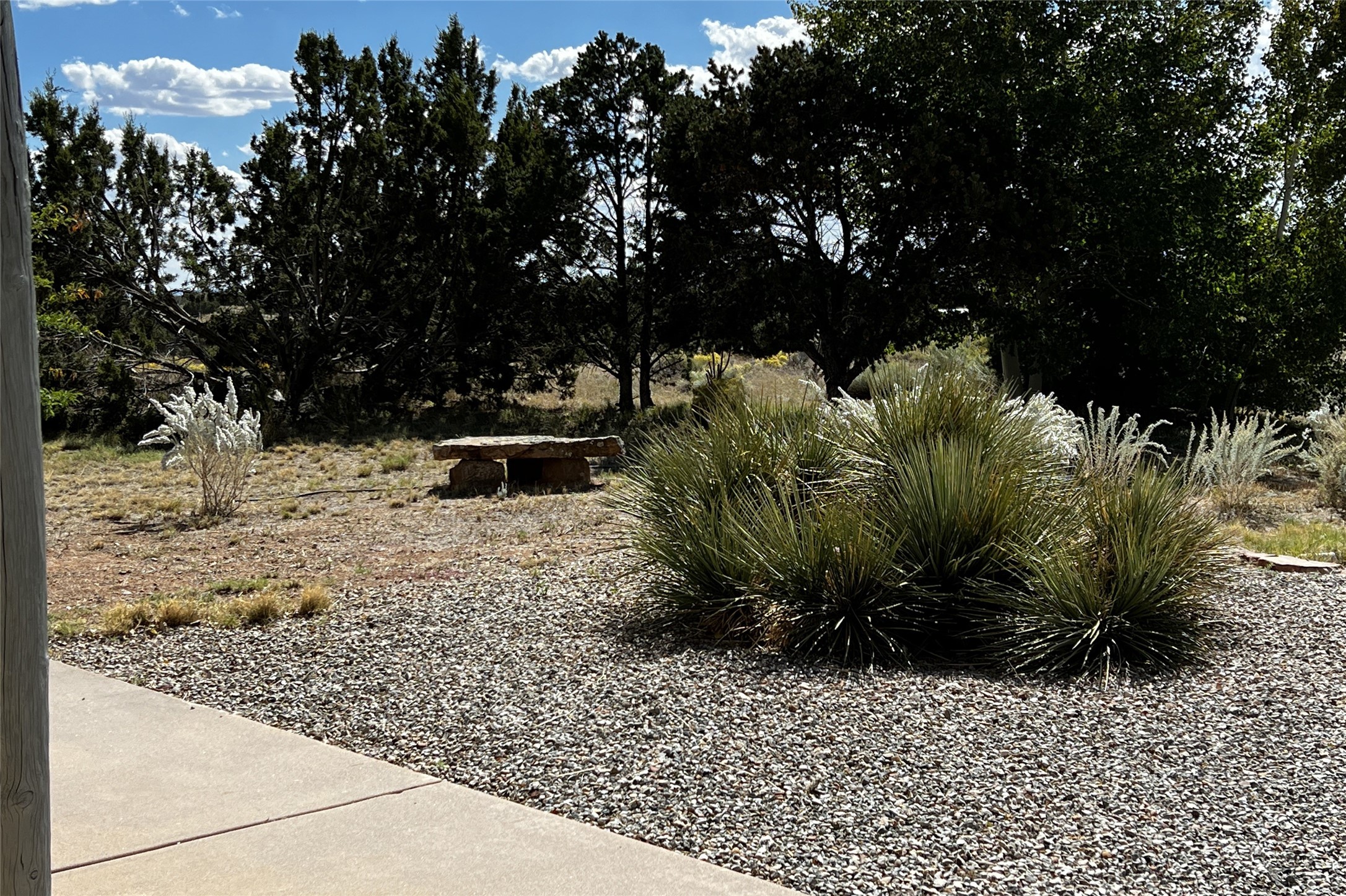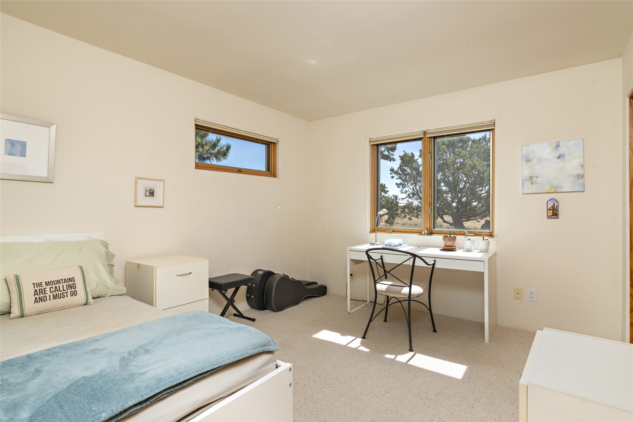 High desert sanctuary. Enjoy spectacular sunsets and dramatic mountain views from this 2453 square foot soft contemporary pueblo-style home. Enter through a colorful and lush courtyard into an elegant foyer and spacious, light-filled living/dining area with tiled floors, fireplace, and high ceilings with vigas. The large, updated eat-in kitchen features slab granite counter tops and an island, slide-out cupboard shelving, stainless steel appliances and pantry. Both the kitchen and the great room share stunning views and access to the portal that opens out to the high desert landscape and vistas of the Ortiz, Sandia, and Jemez mountains, creating an inviting space for hosting family and friends. The owner's bedroom has tile floors and a private, tree-shaded courtyard. A large bathroom completes the owner's suite with a jetted tub, separate shower, water closet, double sinks, and a generous walk-in closet which includes one of the home's 19 skylights. Two additional bedrooms and a full bath are accessed from a hallway with an entrance from the front courtyard. At the other side of the house is a library or office space, also with access from the front courtyard, and a third garage bay or art studio plus an approximately 700 sq ft finished over-sized two car garage. Off the kitchen, the convenient laundry room has plenty of cabinets, a large closet and a sink. The gas-fired in-floor radiant heating and the four mini-split units for cooling and additional heating ensure comfortable living year-round. Another lovely feature of this 1.21 acre property are the mature aspens, pines and other shade trees. The home, which was reroofed in 2019, is located only two doors off-pavement and is adjacent to the Rail Trail which runs between Lamy Village and Santa Fe proper, offering miles of hiking and biking.