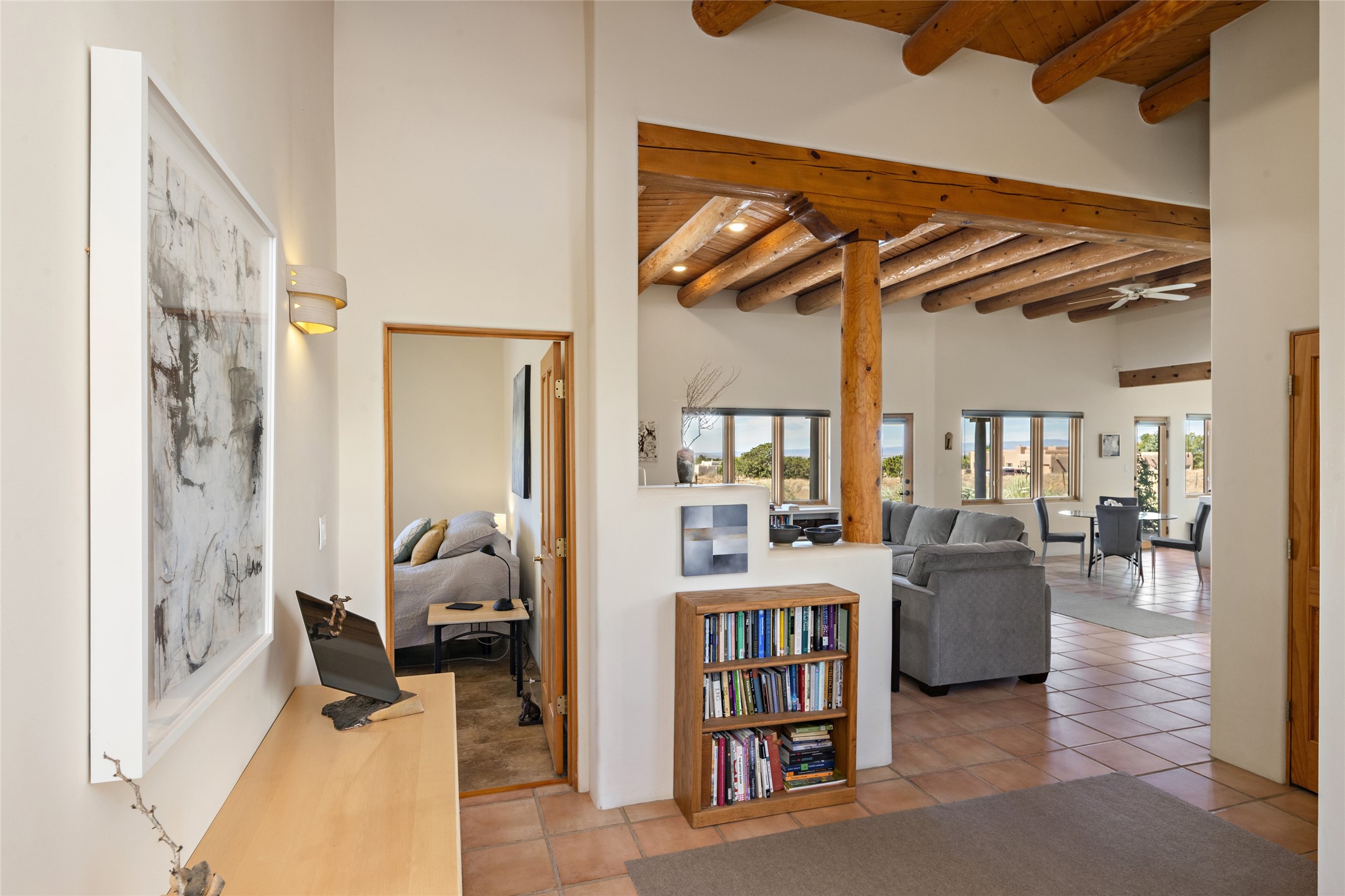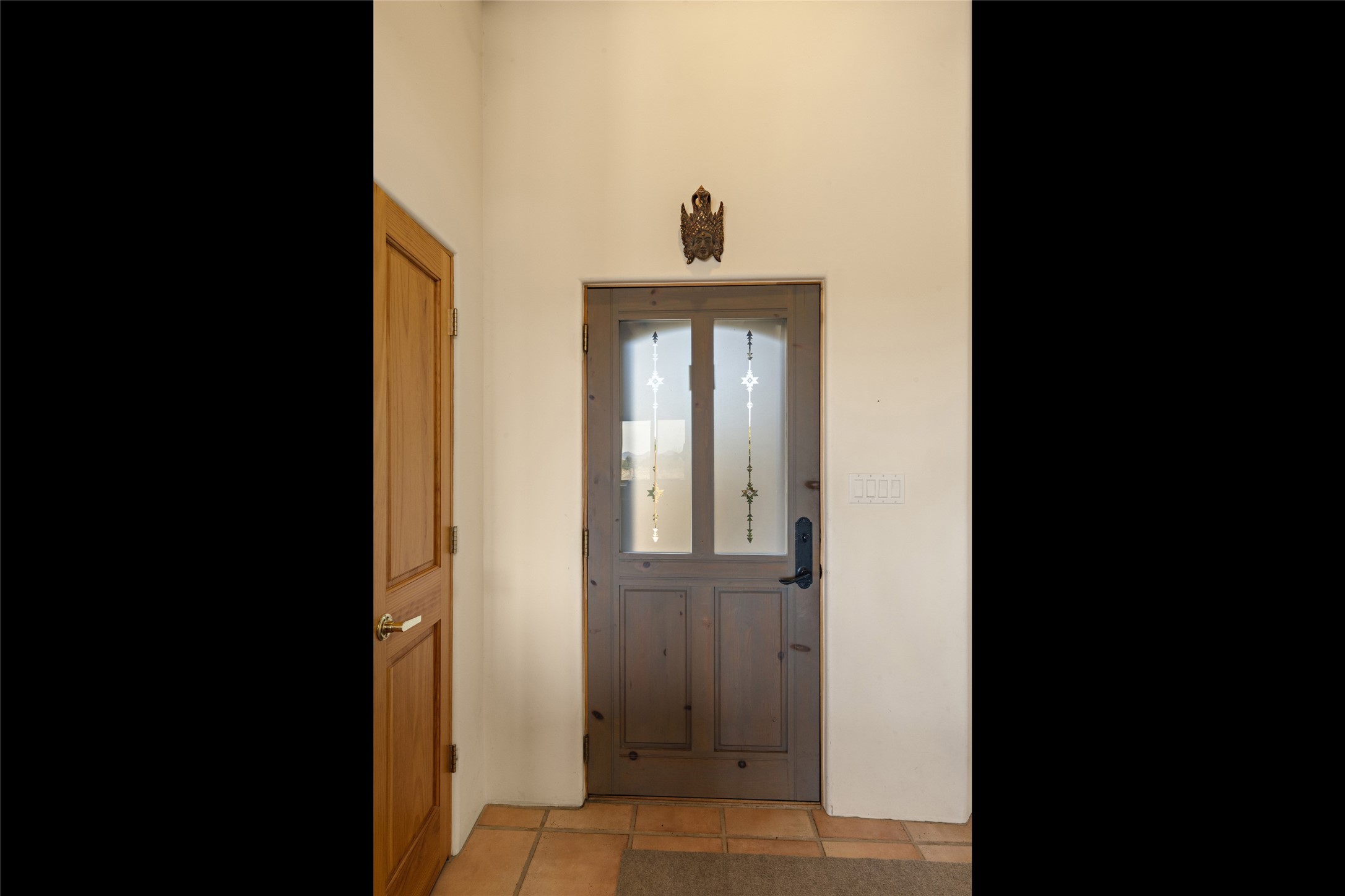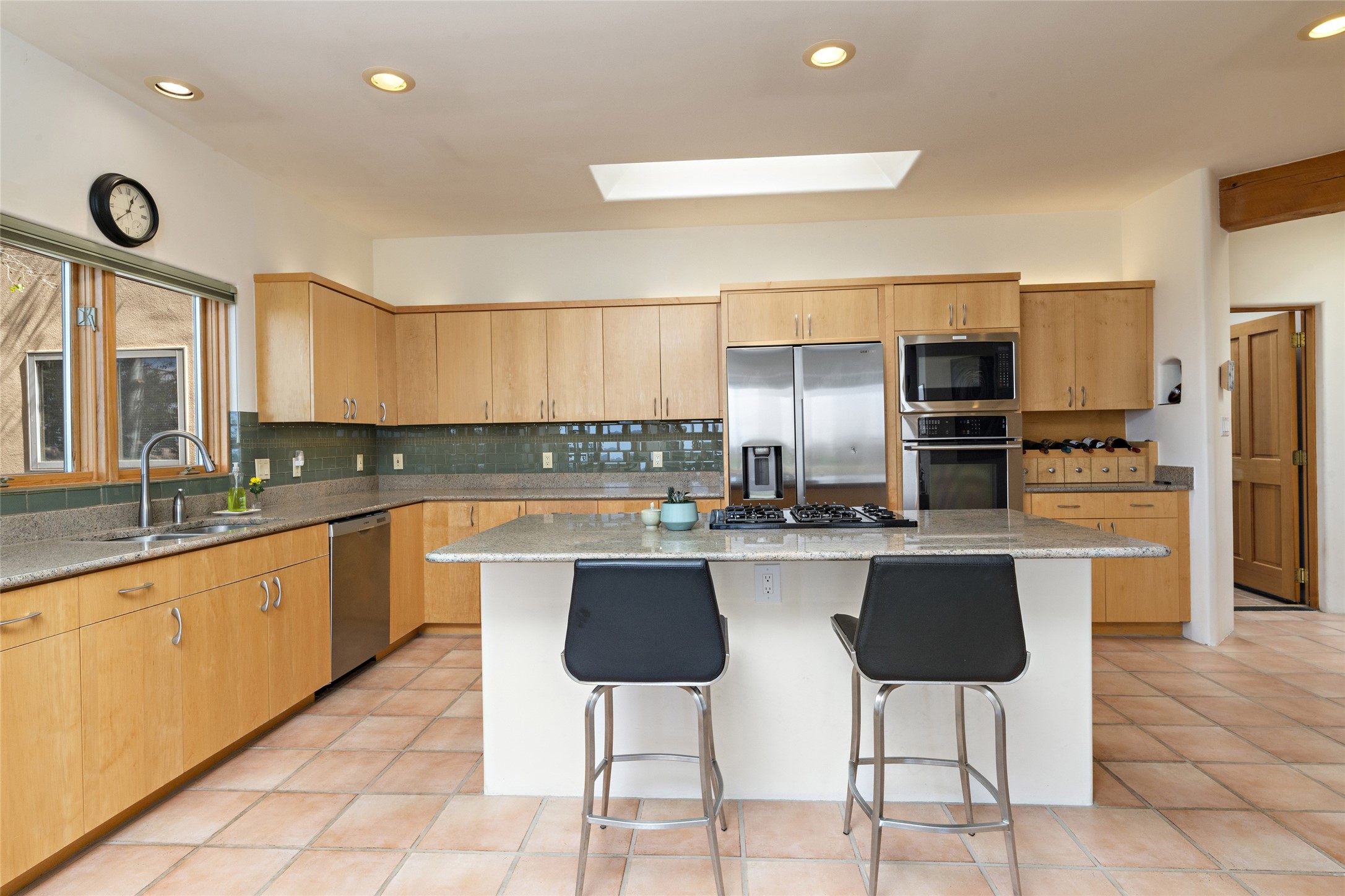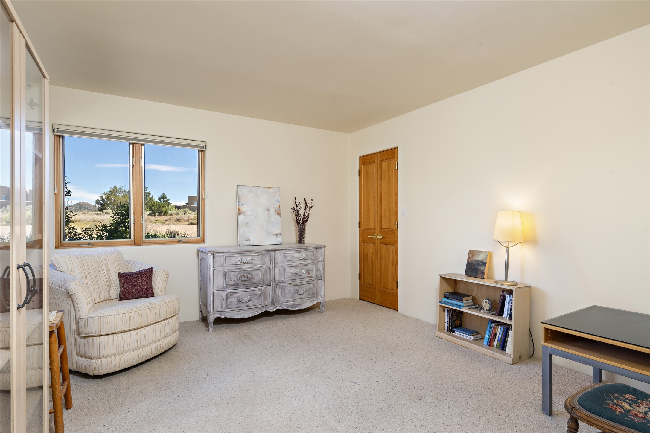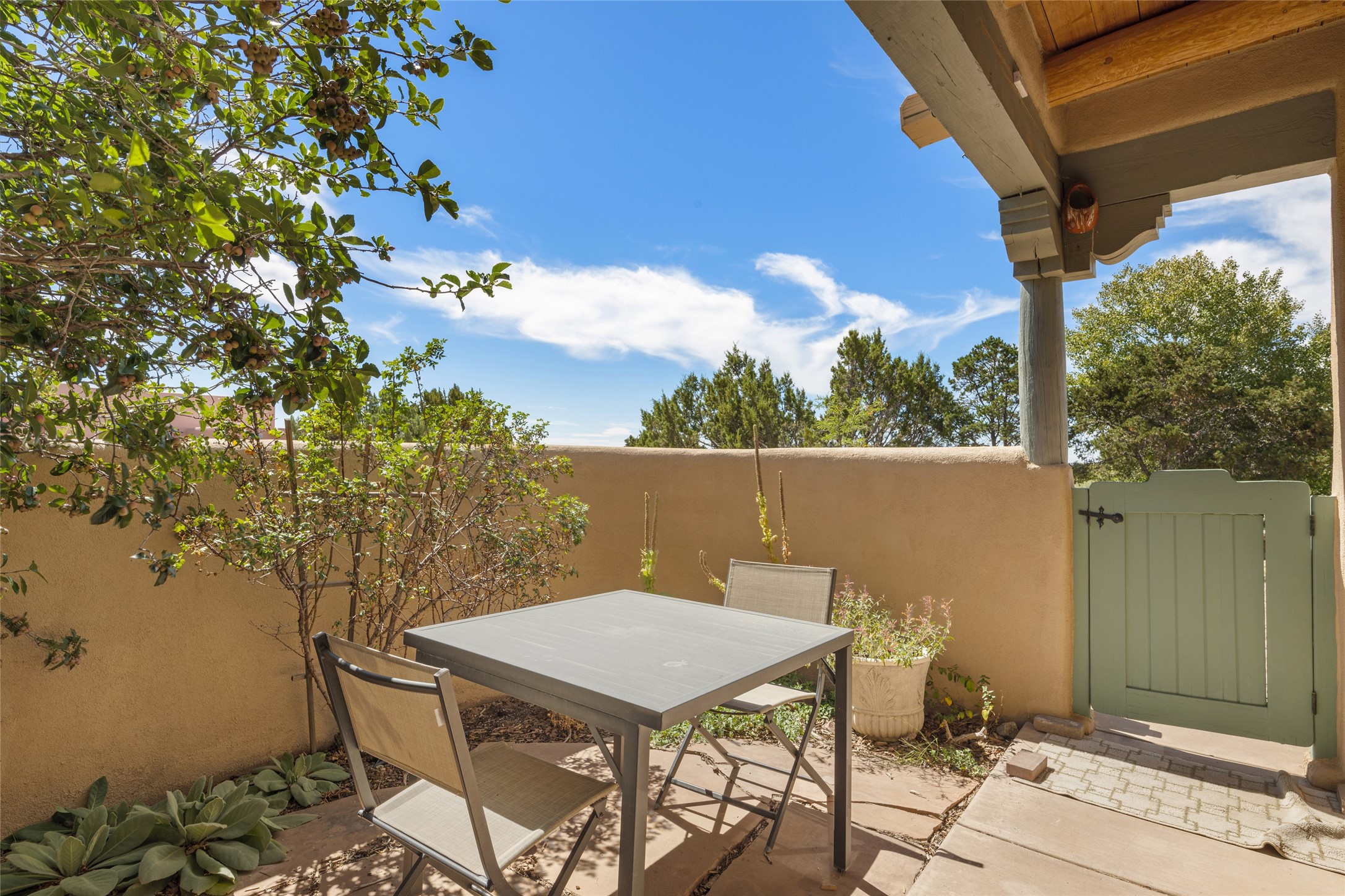 High desert sanctuary. Enjoy spectacular sunsets and dramatic mountain views from this 2453 square foot soft contemporary pueblo-style home. Enter through a colorful and lush courtyard into an elegant foyer and spacious, light-filled living/dining area with tiled floors, fireplace, and high ceilings with vigas. The large, updated eat-in kitchen features slab granite counter tops and an island, slide-out cupboard shelving, stainless steel appliances and pantry. Both the kitchen and the great room share stunning views and access to the portal that opens out to the high desert landscape and vistas of the Ortiz, Sandia, and Jemez mountains, creating an inviting space for hosting family and friends. The owner's bedroom has tile floors and a private, tree-shaded courtyard. A large bathroom completes the owner's suite with a jetted tub, separate shower, water closet, double sinks, and a generous walk-in closet which includes one of the home's 19 skylights. Two additional bedrooms and a full bath are accessed from a hallway with an entrance from the front courtyard. At the other side of the house is a library or office space, also with access from the front courtyard, and a third garage bay or art studio plus an approximately 700 sq ft finished over-sized two car garage. Off the kitchen, the convenient laundry room has plenty of cabinets, a large closet and a sink. The gas-fired in-floor radiant heating and the four mini-split units for cooling and additional heating ensure comfortable living year-round. Another lovely feature of this 1.21 acre property are the mature aspens, pines and other shade trees. The home, which was reroofed in 2019, is located only two doors off-pavement and is adjacent to the Rail Trail which runs between Lamy Village and Santa Fe proper, offering miles of hiking and biking.