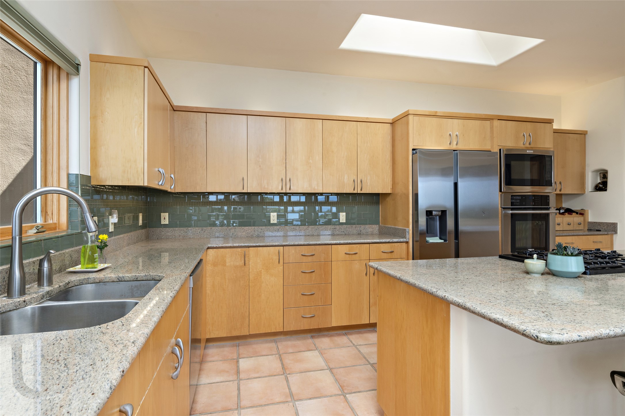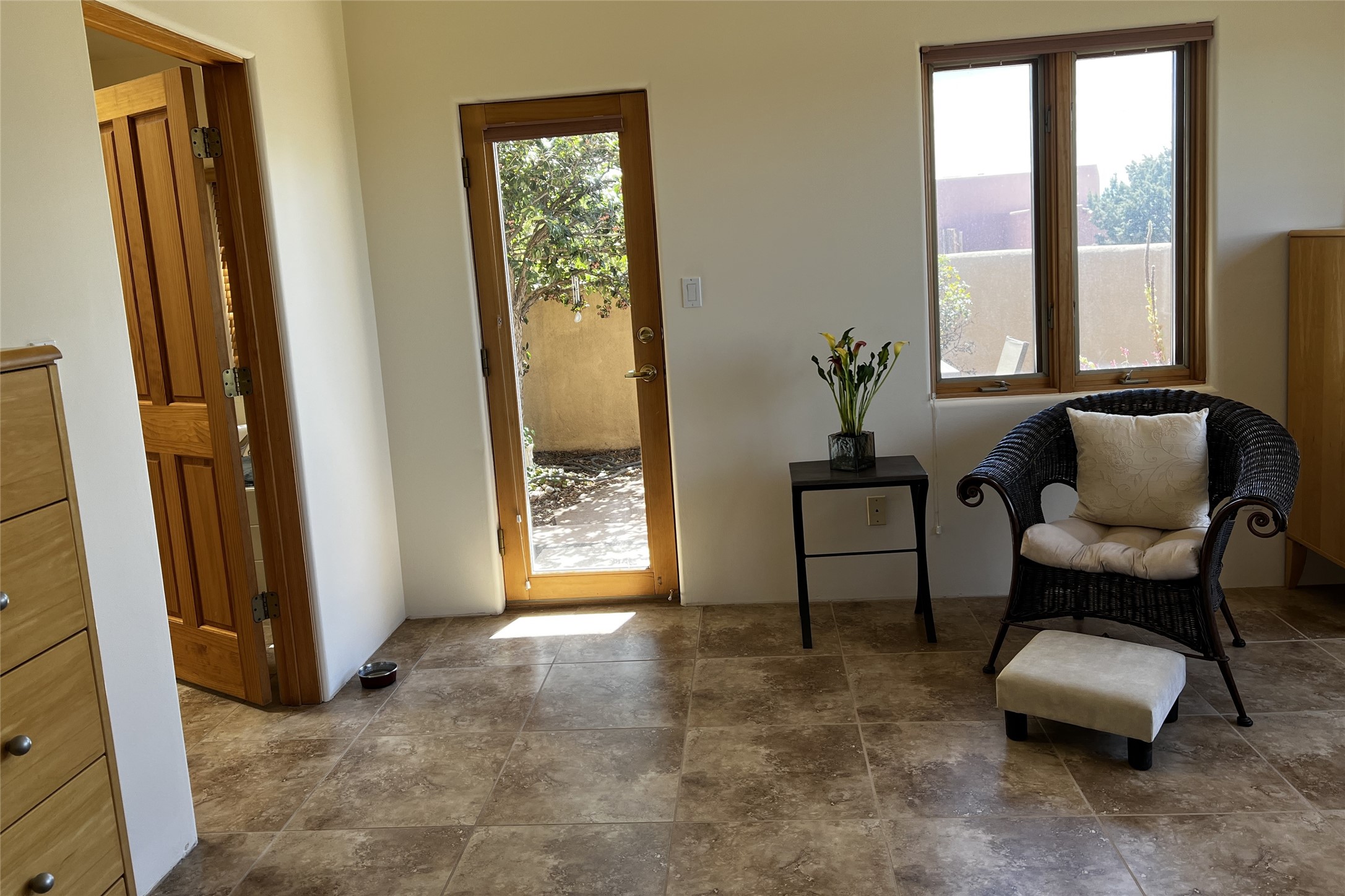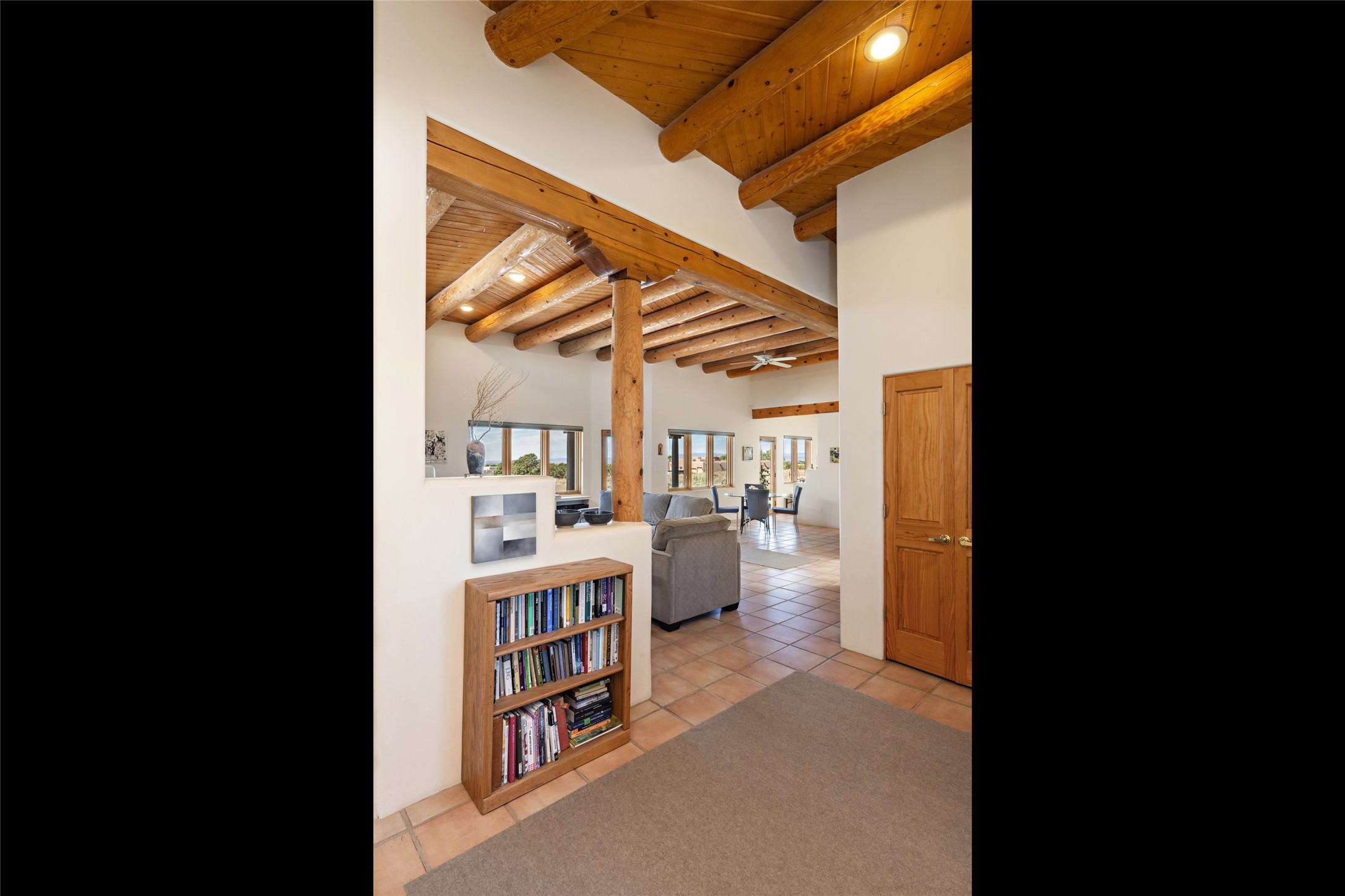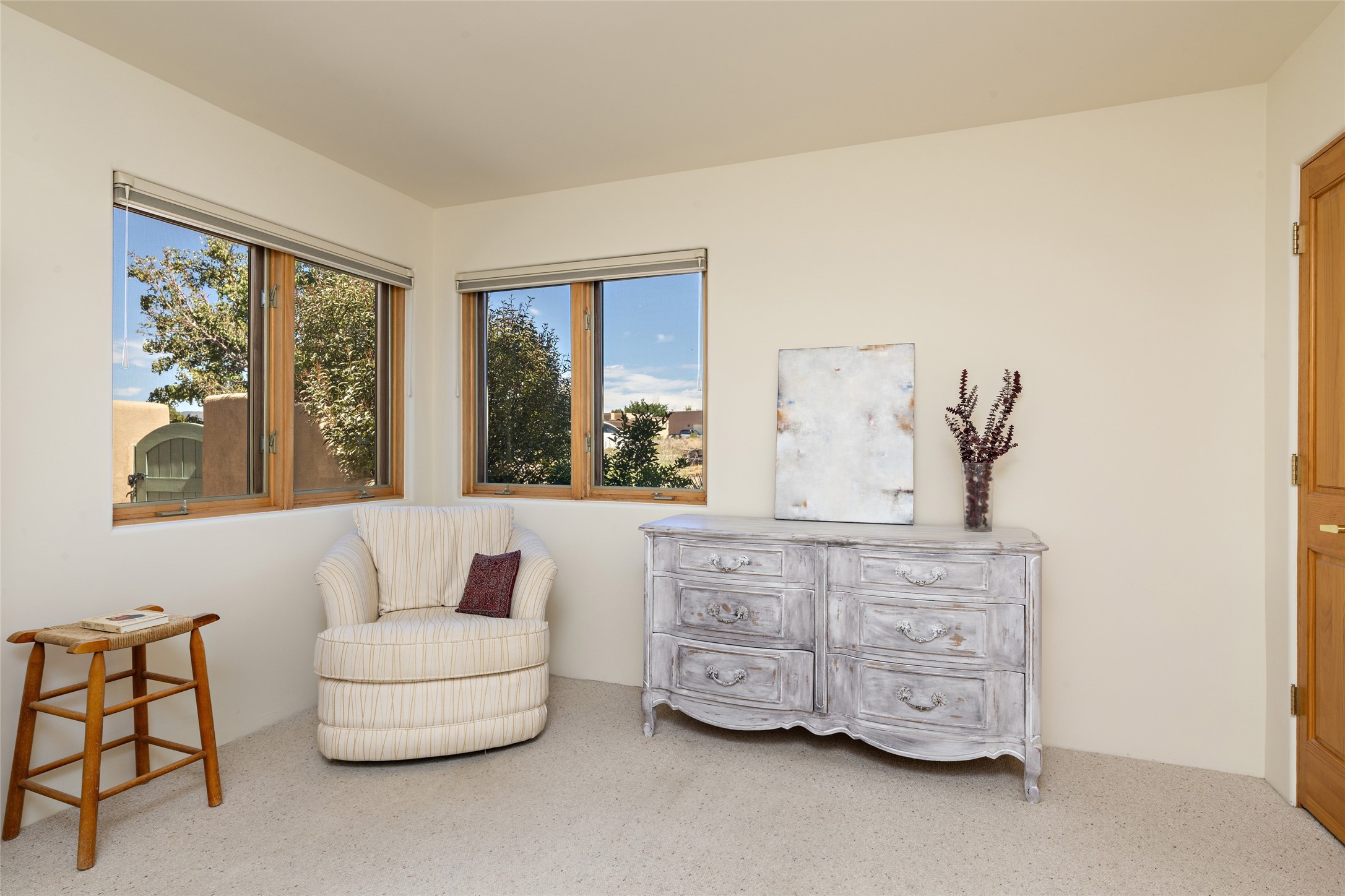 High desert sanctuary. Enjoy spectacular sunsets and dramatic mountain views from this 2453 square foot soft contemporary pueblo-style home. Enter through a colorful and lush courtyard into an elegant foyer and spacious, light-filled living/dining area with tiled floors, fireplace, and high ceilings with vigas. The large, updated eat-in kitchen features slab granite counter tops and an island, slide-out cupboard shelving, stainless steel appliances and pantry. Both the kitchen and the great room share stunning views and access to the portal that opens out to the high desert landscape and vistas of the Ortiz, Sandia, and Jemez mountains, creating an inviting space for hosting family and friends. The owner's bedroom has tile floors and a private, tree-shaded courtyard. A large bathroom completes the owner's suite with a jetted tub, separate shower, water closet, double sinks, and a generous walk-in closet which includes one of the home's 19 skylights. Two additional bedrooms and a full bath are accessed from a hallway with an entrance from the front courtyard. At the other side of the house is a library or office space, also with access from the front courtyard, and a third garage bay or art studio plus an approximately 700 sq ft finished over-sized two car garage. Off the kitchen, the convenient laundry room has plenty of cabinets, a large closet and a sink. The gas-fired in-floor radiant heating and the four mini-split units for cooling and additional heating ensure comfortable living year-round. Another lovely feature of this 1.21 acre property are the mature aspens, pines and other shade trees. The home, which was reroofed in 2019, is located only two doors off-pavement and is adjacent to the Rail Trail which runs between Lamy Village and Santa Fe proper, offering miles of hiking and biking.