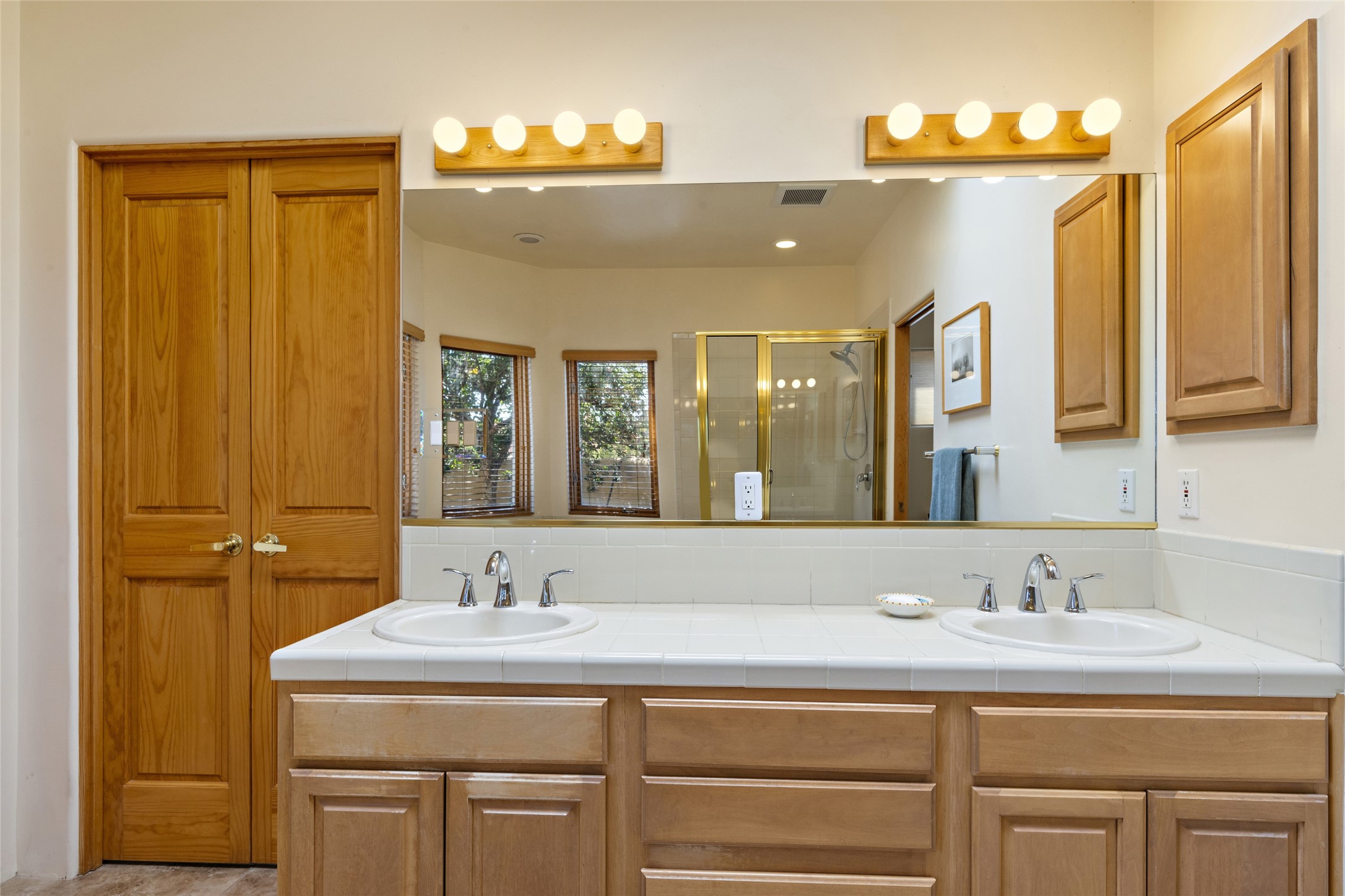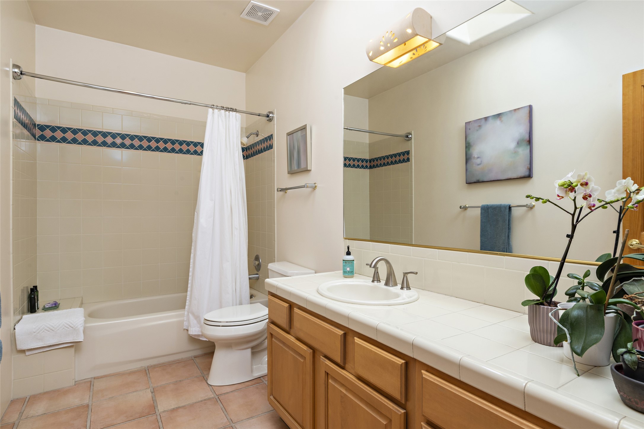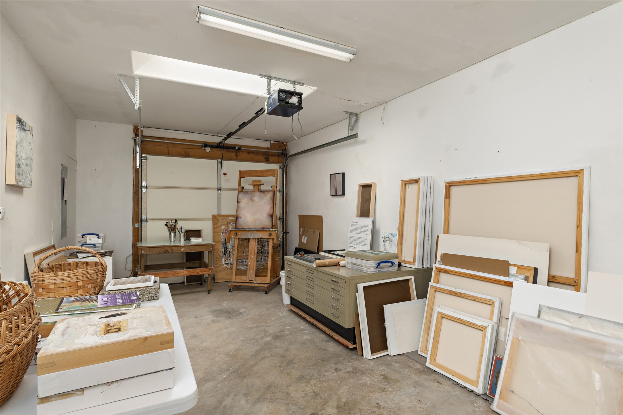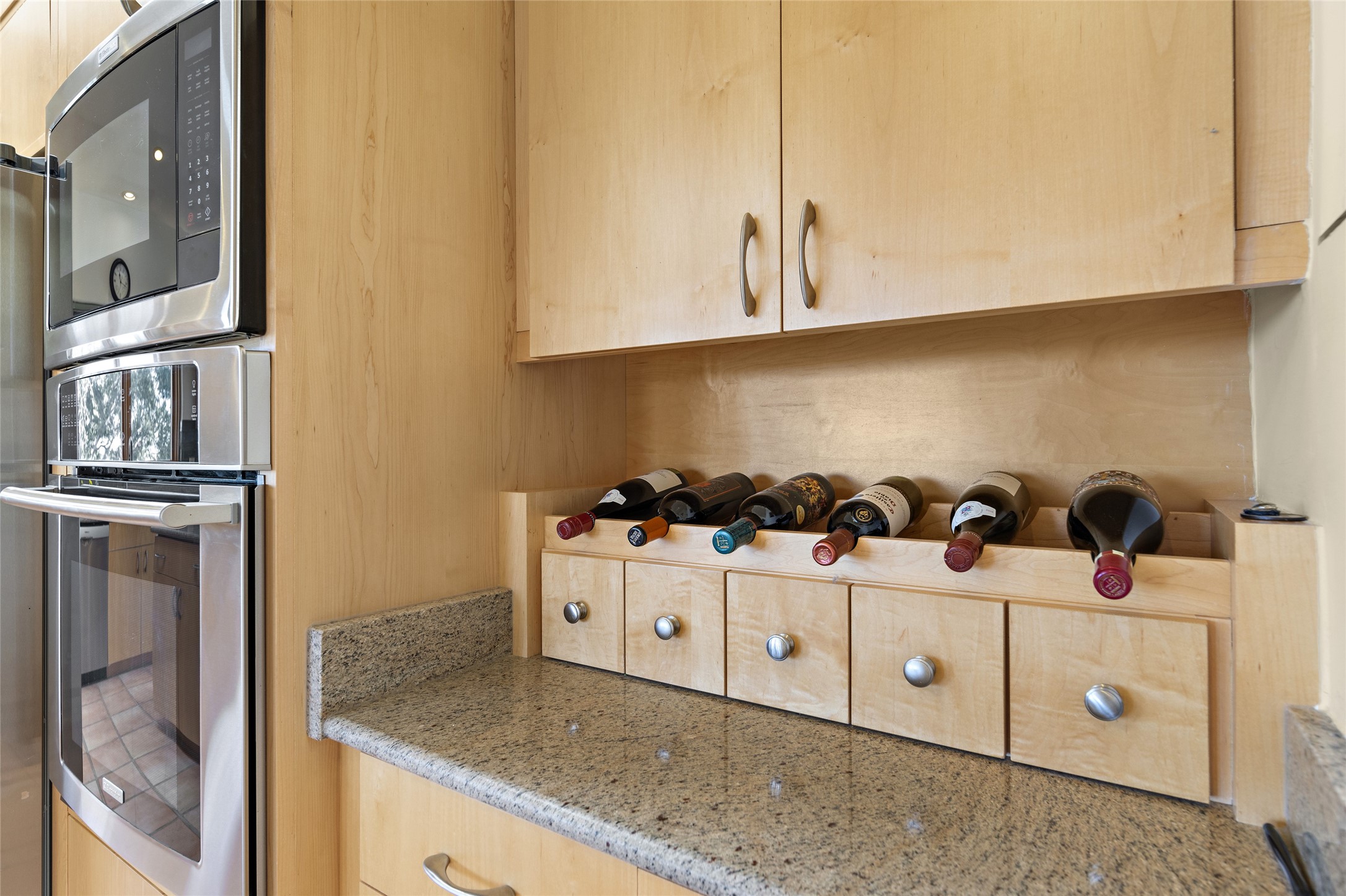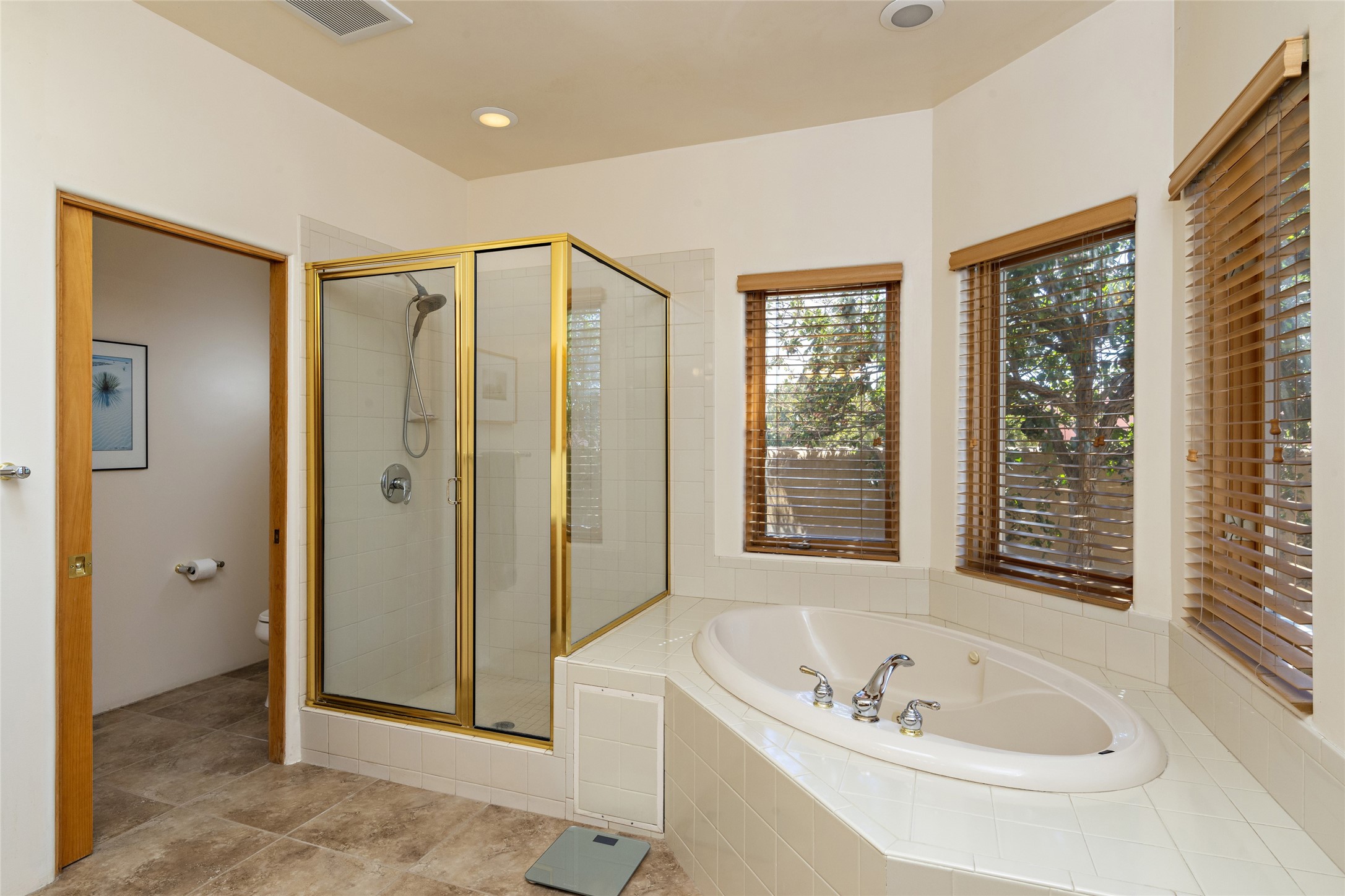 High desert sanctuary. Enjoy spectacular sunsets and dramatic mountain views from this 2453 square foot soft contemporary pueblo-style home. Enter through a colorful and lush courtyard into an elegant foyer and spacious, light-filled living/dining area with tiled floors, fireplace, and high ceilings with vigas. The large, updated eat-in kitchen features slab granite counter tops and an island, slide-out cupboard shelving, stainless steel appliances and pantry. Both the kitchen and the great room share stunning views and access to the portal that opens out to the high desert landscape and vistas of the Ortiz, Sandia, and Jemez mountains, creating an inviting space for hosting family and friends. The owner's bedroom has tile floors and a private, tree-shaded courtyard. A large bathroom completes the owner's suite with a jetted tub, separate shower, water closet, double sinks, and a generous walk-in closet which includes one of the home's 19 skylights. Two additional bedrooms and a full bath are accessed from a hallway with an entrance from the front courtyard. At the other side of the house is a library or office space, also with access from the front courtyard, and a third garage bay or art studio plus an approximately 700 sq ft finished over-sized two car garage. Off the kitchen, the convenient laundry room has plenty of cabinets, a large closet and a sink. The gas-fired in-floor radiant heating and the four mini-split units for cooling and additional heating ensure comfortable living year-round. Another lovely feature of this 1.21 acre property are the mature aspens, pines and other shade trees. The home, which was reroofed in 2019, is located only two doors off-pavement and is adjacent to the Rail Trail which runs between Lamy Village and Santa Fe proper, offering miles of hiking and biking.