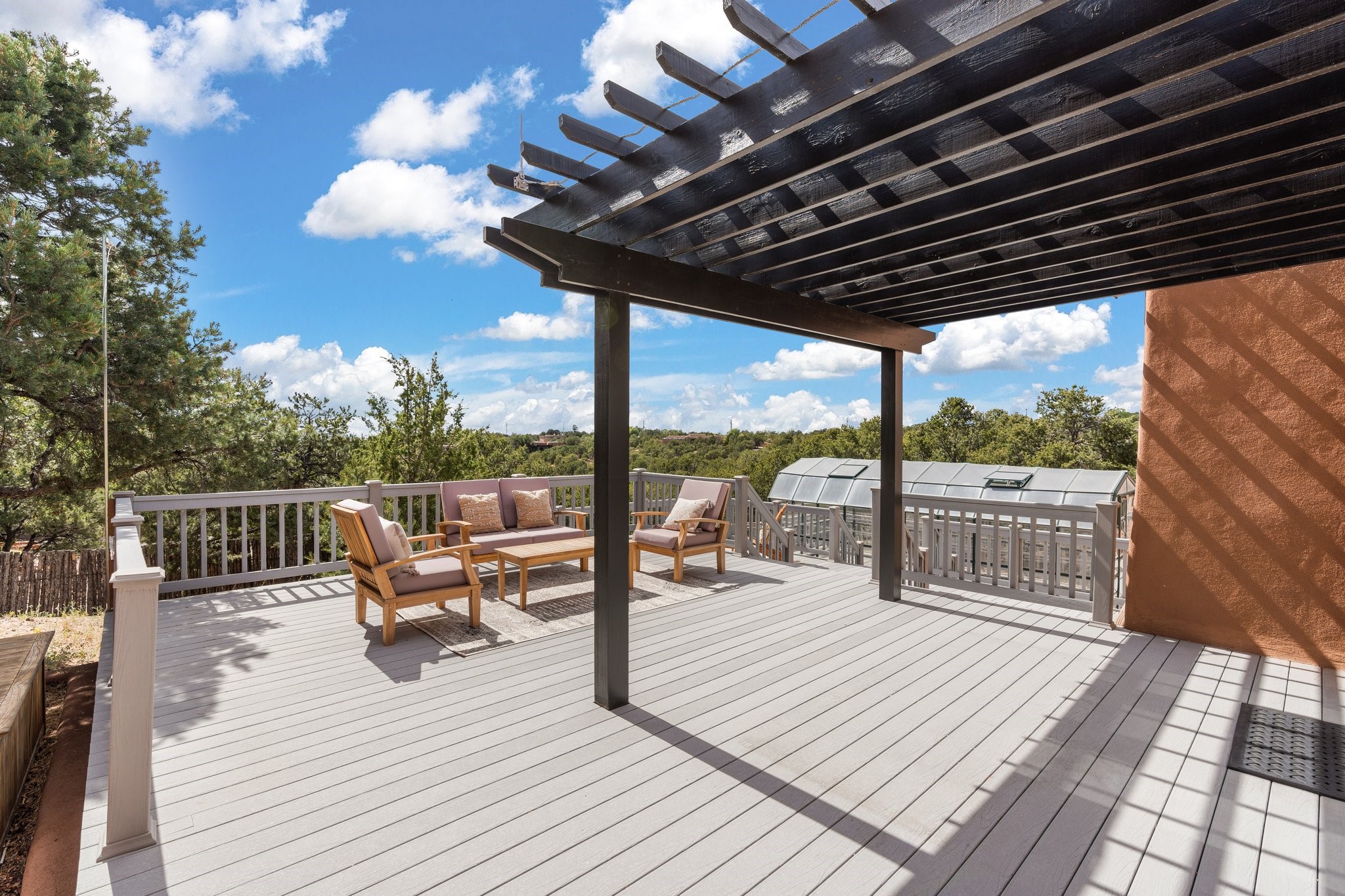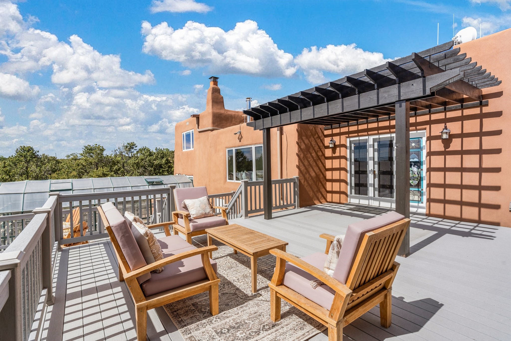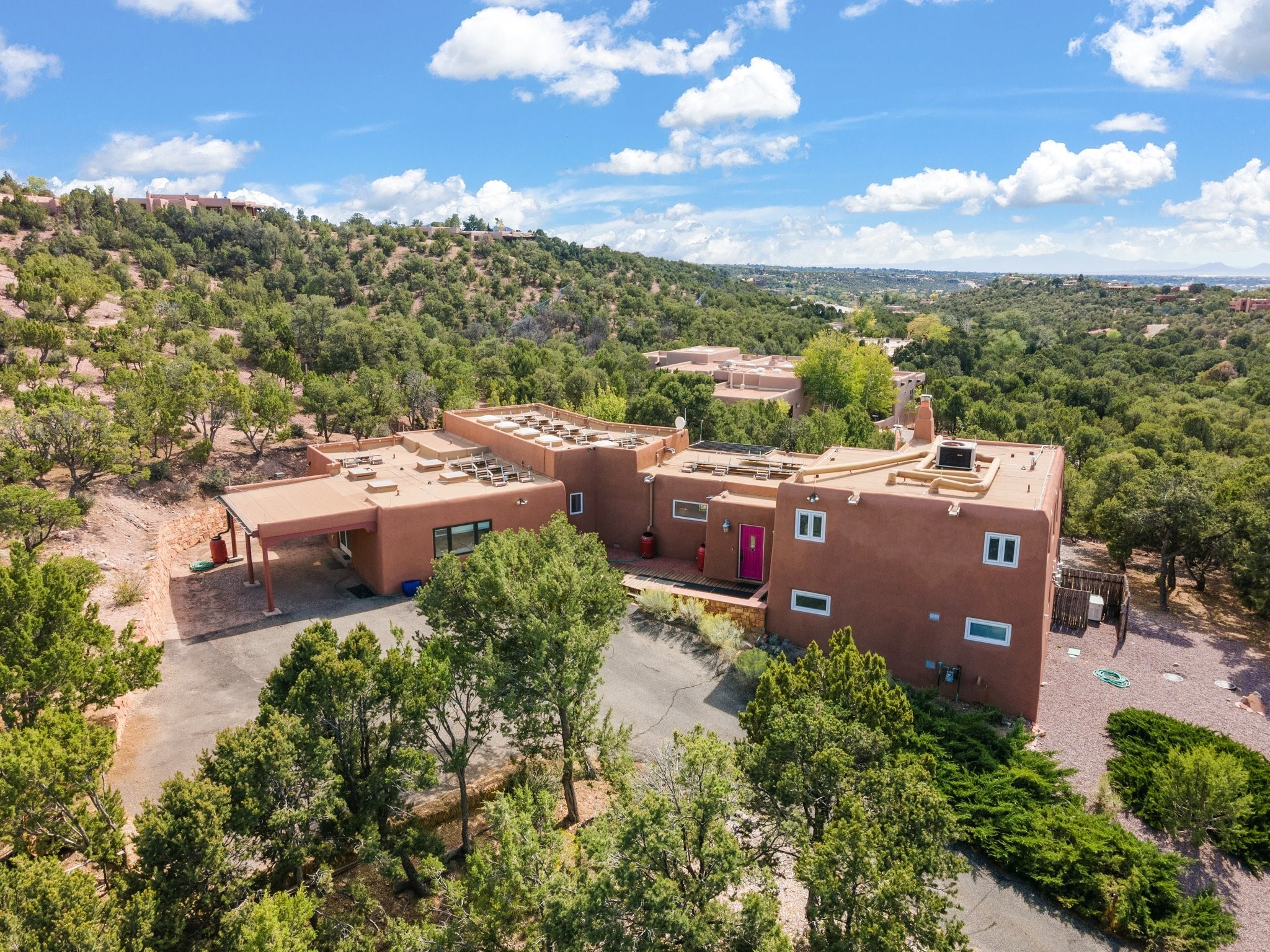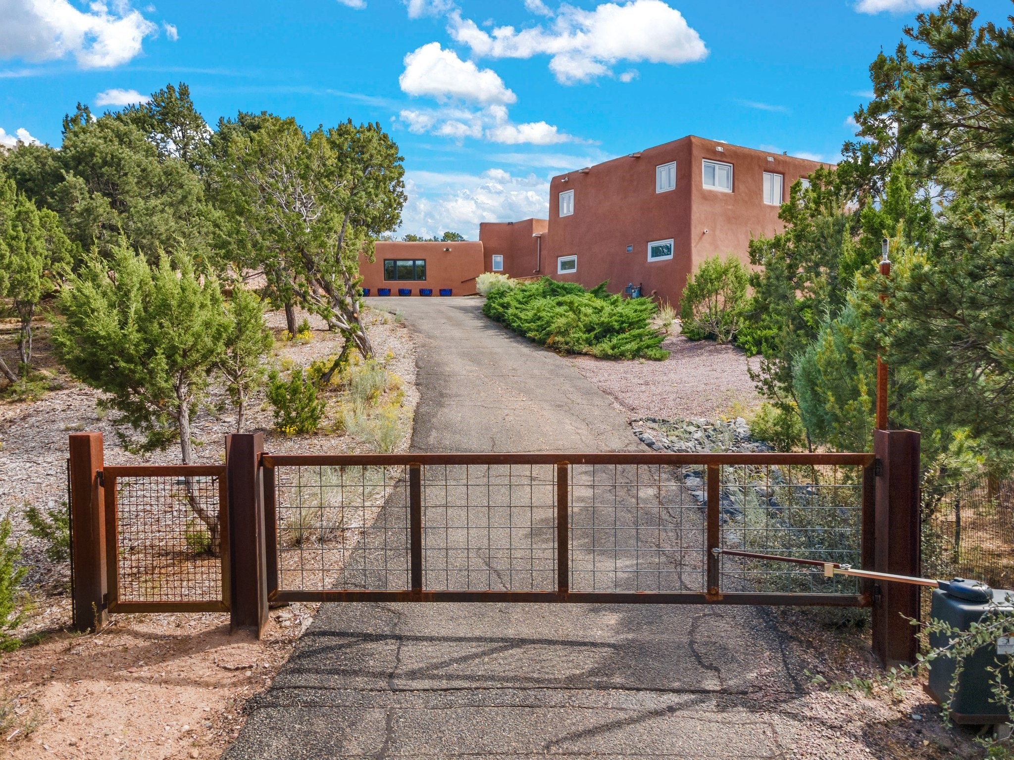 This stunning 4,000 +/- sq. ft home boasts 2 full bedroom suites, each with its own bathroom and sitting room. The upstairs suite additionally has an office while the downstairs bedroom suite with direct entry from the outside has a kitchenette. Nestled in the serene Santa Fe mountains and surrounded by magnificent views, this meticulously maintained home sitting on 1.9 acres is but minutes from downtown Santa Fe and its many amenities. Ideal for year-round entertaining, the generous great-room (living, dining, kitchen), offers easy access to the 900 sq. ft. Trex deck from which to enjoy amazing sunset views. The bespoke chef's-kitchen boasts a full range of top-of-the-line, Energy-Star, stainless steel appliances -- two stove tops, one electric with downdraft, and one gas; three ovens, one electric and two gas; two dishwashers, a wine cooler, microwave, a Viking fridge/freezer combo as well as a separate upright freezer, two sinks, and a very generous island. Quartz countertops and custom cabinetry complete the kitchen. The adjoining studio with storage for paintings can double as a family room or be built out into a stunning main bedroom suite. A 20 x 8 ft greenhouse and a garden shed allow you to give flight to all your gardening dreams. Paid off solar panels on the roof keep the electric bills to a minimum. A composite roof slopes gently to allow for drainage. The house is protected with lightning rods around the perimeter of the roof. This home offers so many more extras that it is impossible to list them all here. Please see additional info in document section of listing. All measurements are estimates and if of material interest, Buyer to independently verify. Neither Seller nor Listing Broker warrant house or lot size.