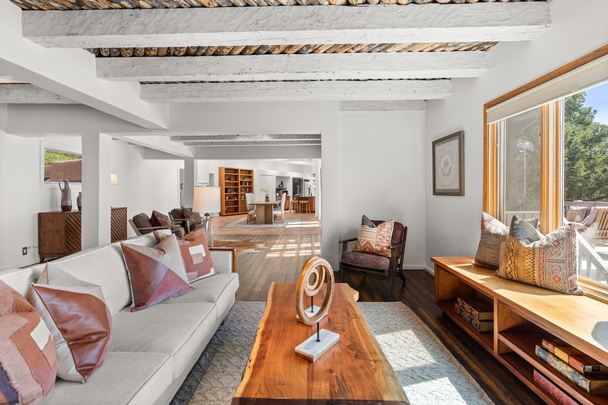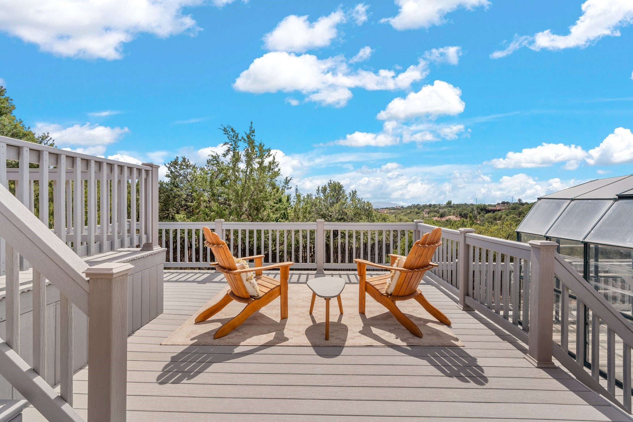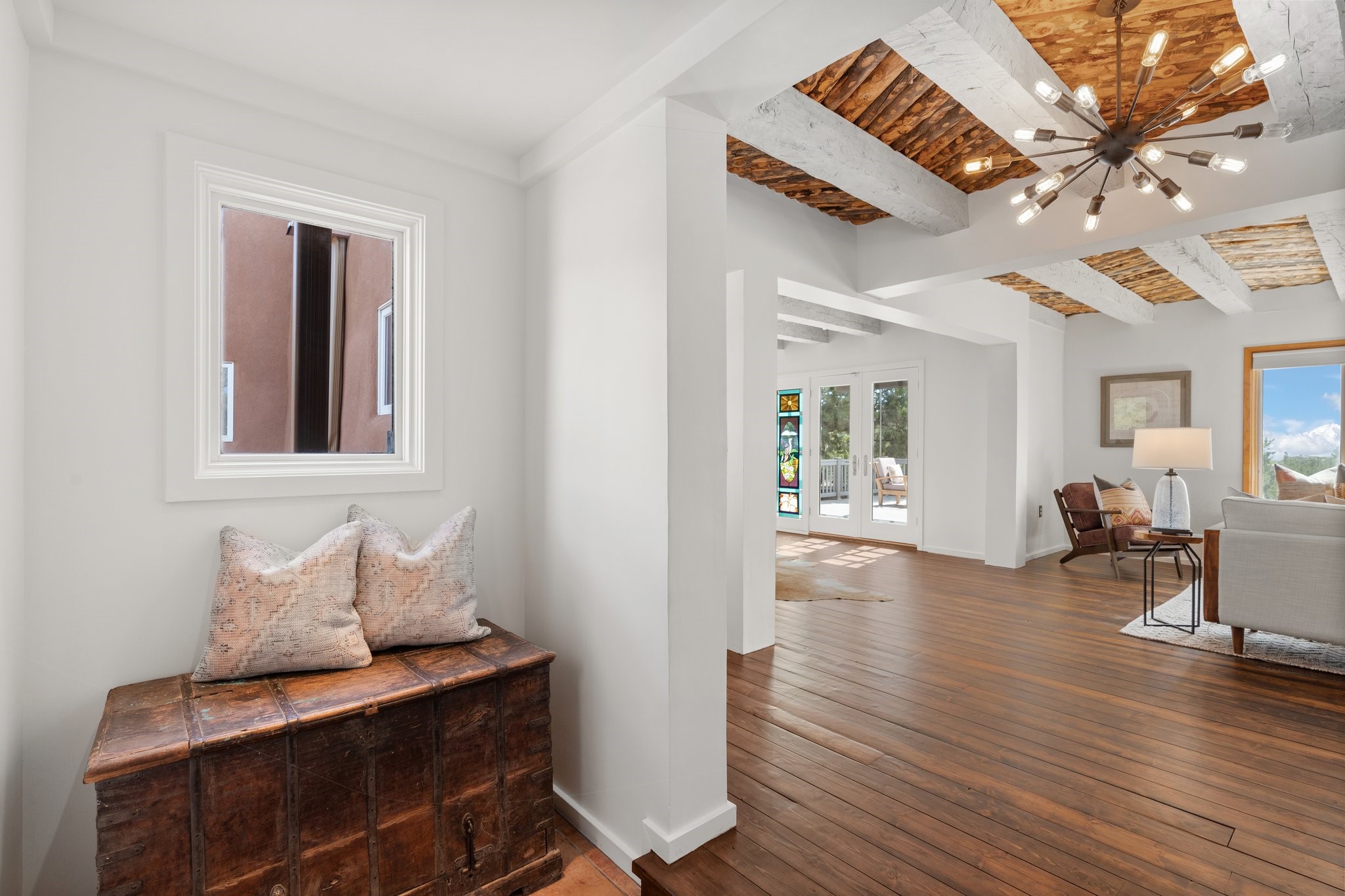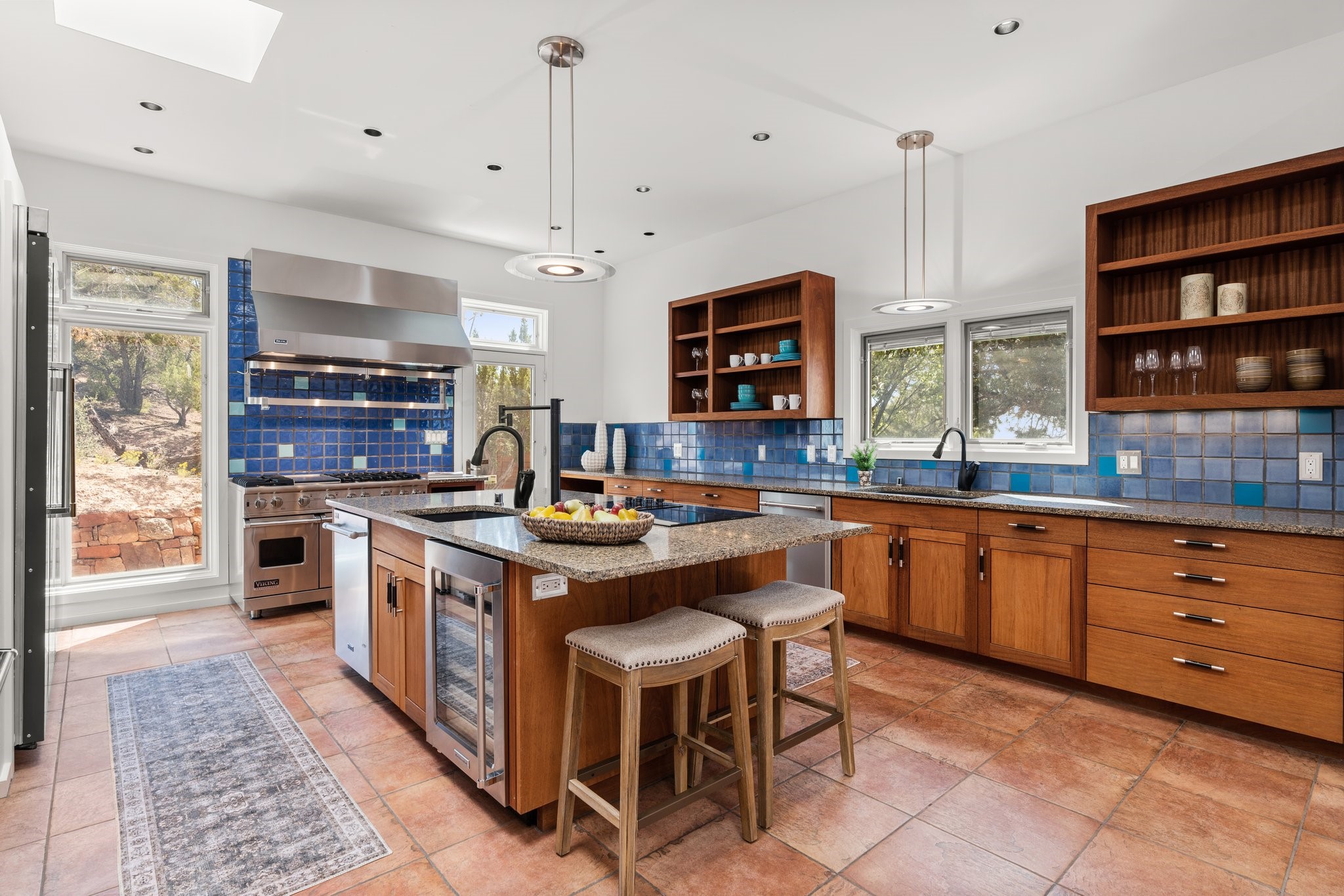 This stunning 4,000 +/- sq. ft home boasts 2 full bedroom suites, each with its own bathroom and sitting room. The upstairs suite additionally has an office while the downstairs bedroom suite with direct entry from the outside has a kitchenette. Nestled in the serene Santa Fe mountains and surrounded by magnificent views, this meticulously maintained home sitting on 1.9 acres is but minutes from downtown Santa Fe and its many amenities. Ideal for year-round entertaining, the generous great-room (living, dining, kitchen), offers easy access to the 900 sq. ft. Trex deck from which to enjoy amazing sunset views. The bespoke chef's-kitchen boasts a full range of top-of-the-line, Energy-Star, stainless steel appliances -- two stove tops, one electric with downdraft, and one gas; three ovens, one electric and two gas; two dishwashers, a wine cooler, microwave, a Viking fridge/freezer combo as well as a separate upright freezer, two sinks, and a very generous island. Quartz countertops and custom cabinetry complete the kitchen. The adjoining studio with storage for paintings can double as a family room or be built out into a stunning main bedroom suite. A 20 x 8 ft greenhouse and a garden shed allow you to give flight to all your gardening dreams. Paid off solar panels on the roof keep the electric bills to a minimum. A composite roof slopes gently to allow for drainage. The house is protected with lightning rods around the perimeter of the roof. This home offers so many more extras that it is impossible to list them all here. Please see additional info in document section of listing. All measurements are estimates and if of material interest, Buyer to independently verify. Neither Seller nor Listing Broker warrant house or lot size.