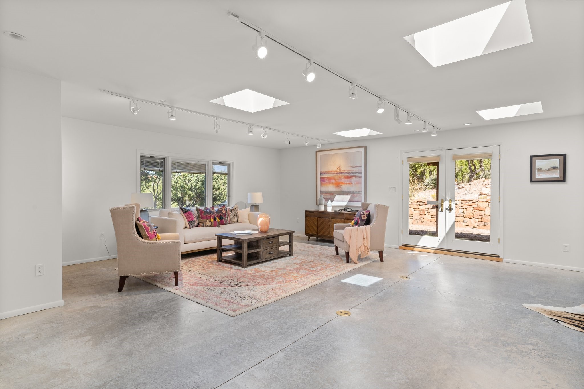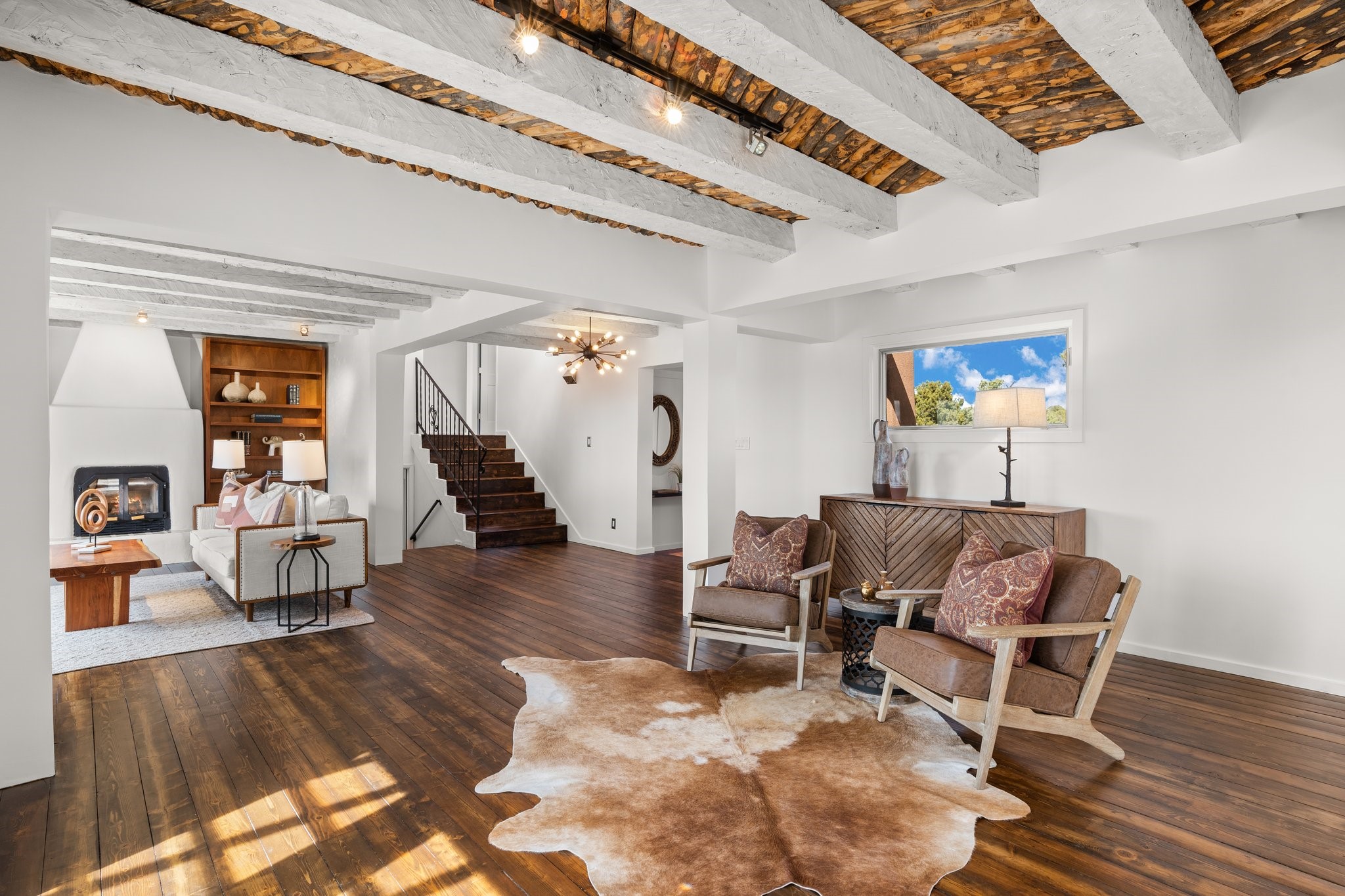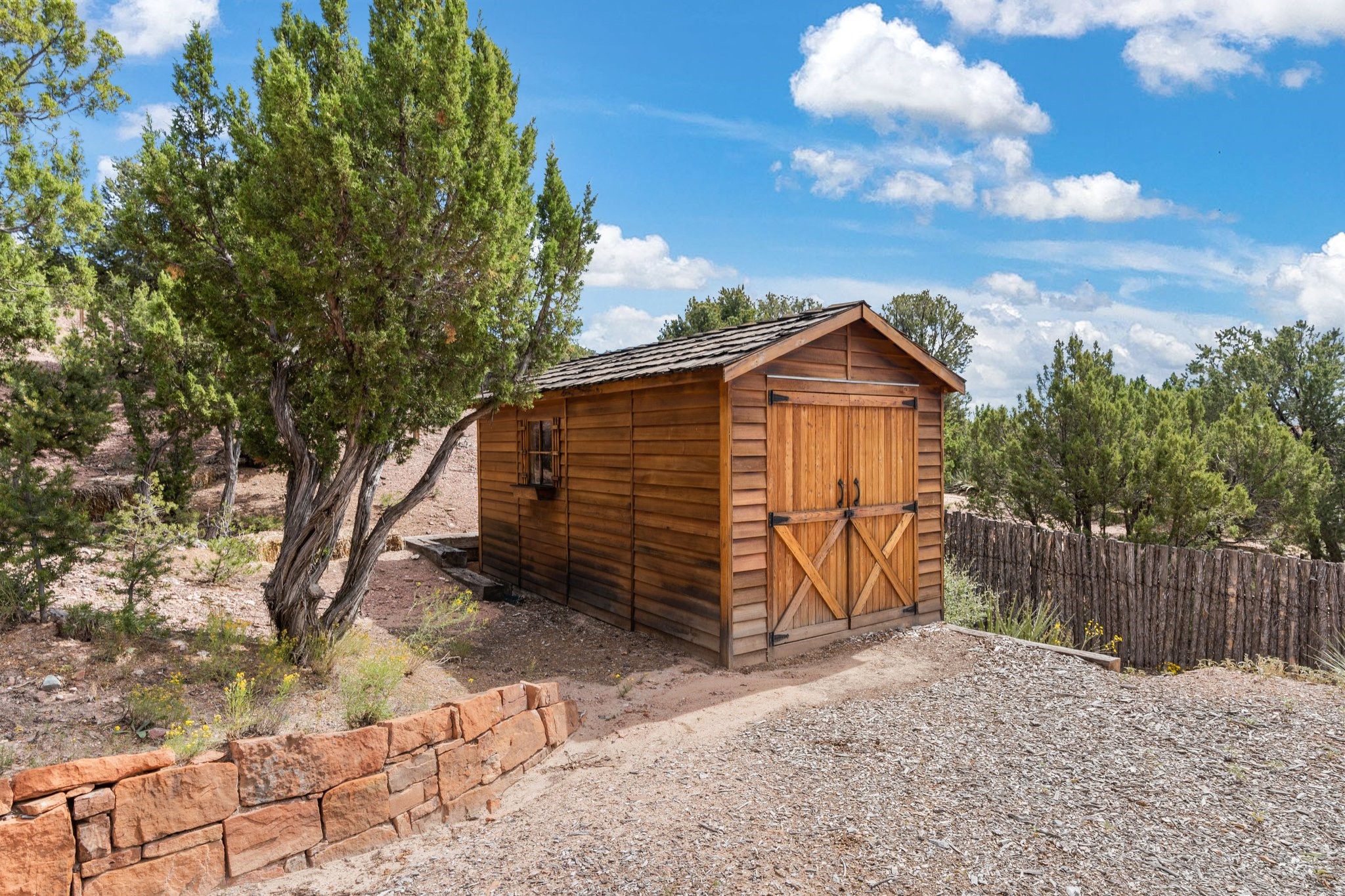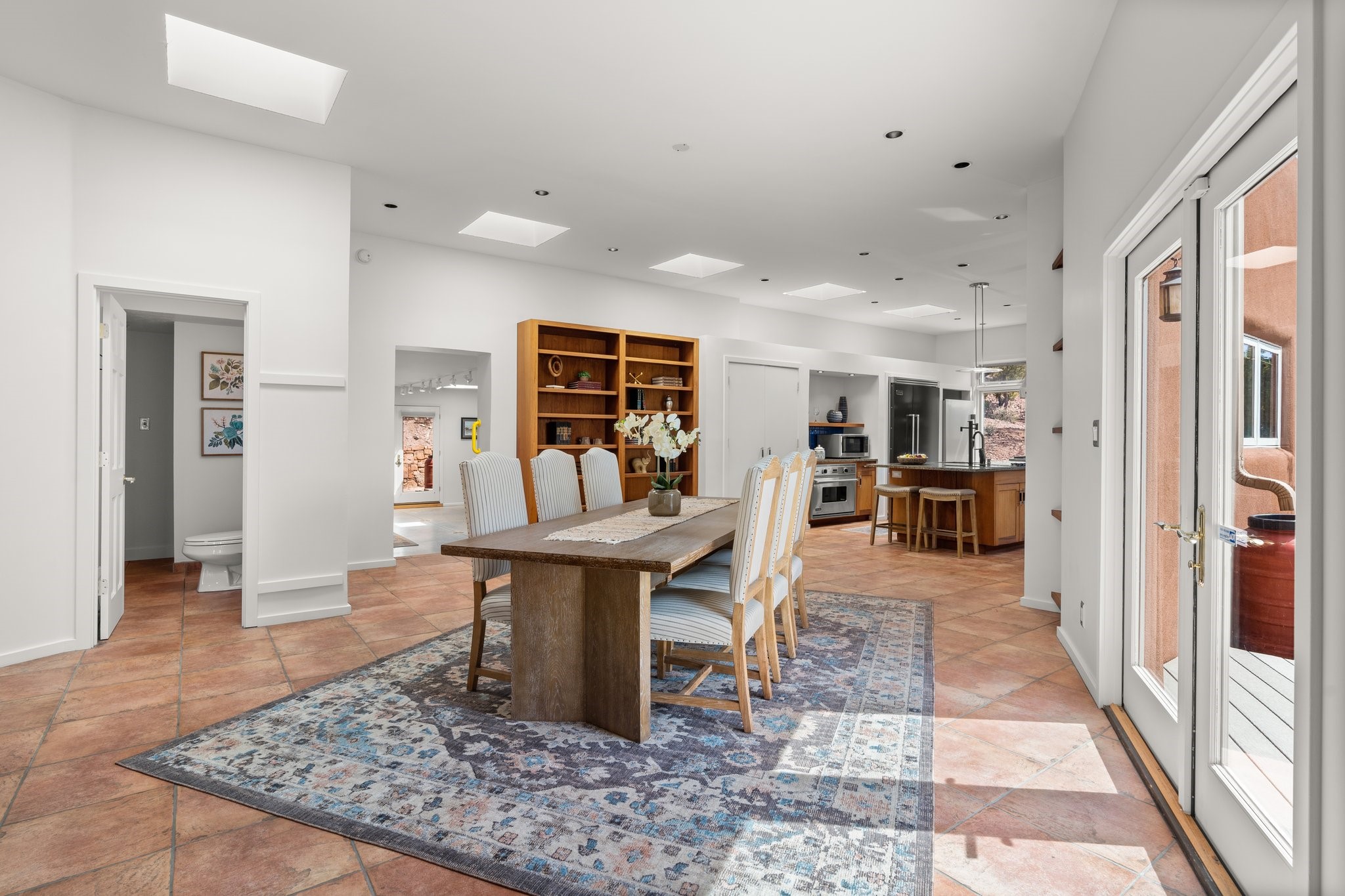 This stunning 4,000 +/- sq. ft home boasts 2 full bedroom suites, each with its own bathroom and sitting room. The upstairs suite additionally has an office while the downstairs bedroom suite with direct entry from the outside has a kitchenette. Nestled in the serene Santa Fe mountains and surrounded by magnificent views, this meticulously maintained home sitting on 1.9 acres is but minutes from downtown Santa Fe and its many amenities. Ideal for year-round entertaining, the generous great-room (living, dining, kitchen), offers easy access to the 900 sq. ft. Trex deck from which to enjoy amazing sunset views. The bespoke chef's-kitchen boasts a full range of top-of-the-line, Energy-Star, stainless steel appliances -- two stove tops, one electric with downdraft, and one gas; three ovens, one electric and two gas; two dishwashers, a wine cooler, microwave, a Viking fridge/freezer combo as well as a separate upright freezer, two sinks, and a very generous island. Quartz countertops and custom cabinetry complete the kitchen. The adjoining studio with storage for paintings can double as a family room or be built out into a stunning main bedroom suite. A 20 x 8 ft greenhouse and a garden shed allow you to give flight to all your gardening dreams. Paid off solar panels on the roof keep the electric bills to a minimum. A composite roof slopes gently to allow for drainage. The house is protected with lightning rods around the perimeter of the roof. This home offers so many more extras that it is impossible to list them all here. Please see additional info in document section of listing. All measurements are estimates and if of material interest, Buyer to independently verify. Neither Seller nor Listing Broker warrant house or lot size.
