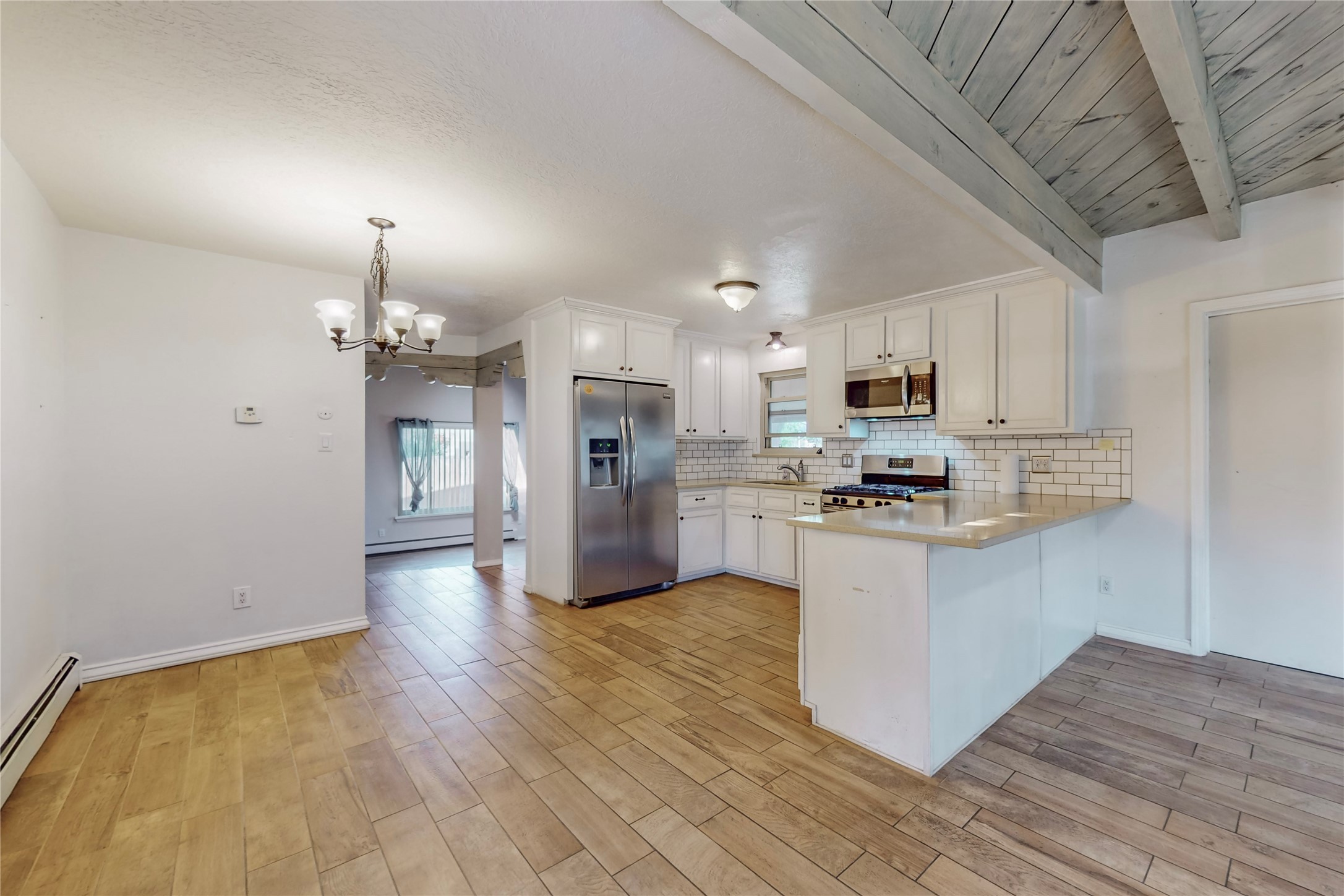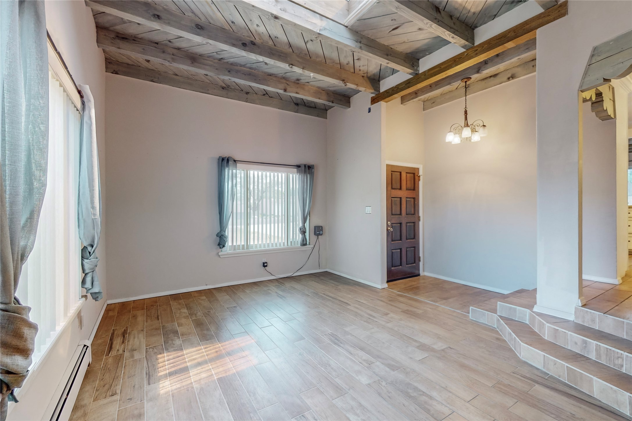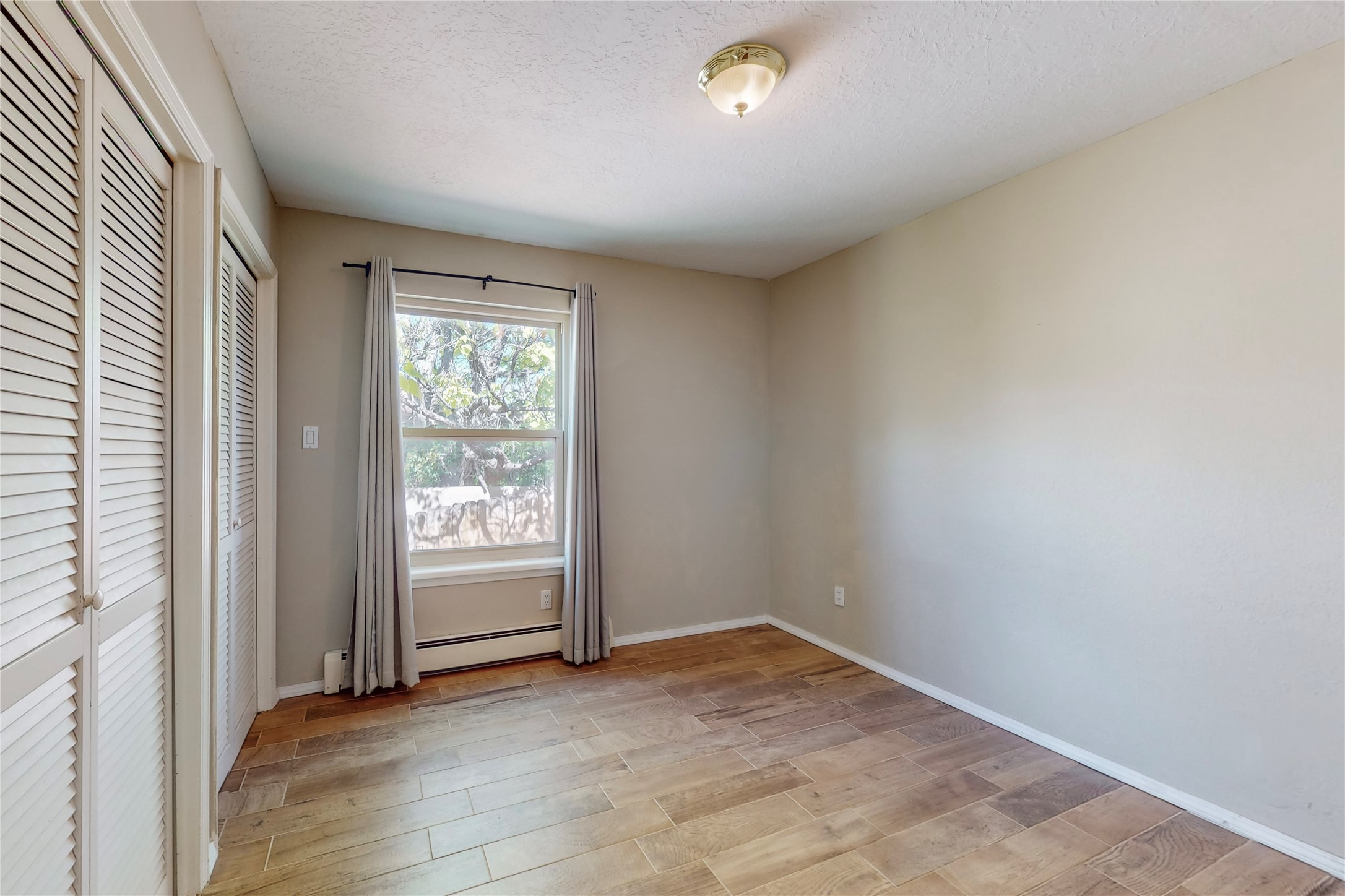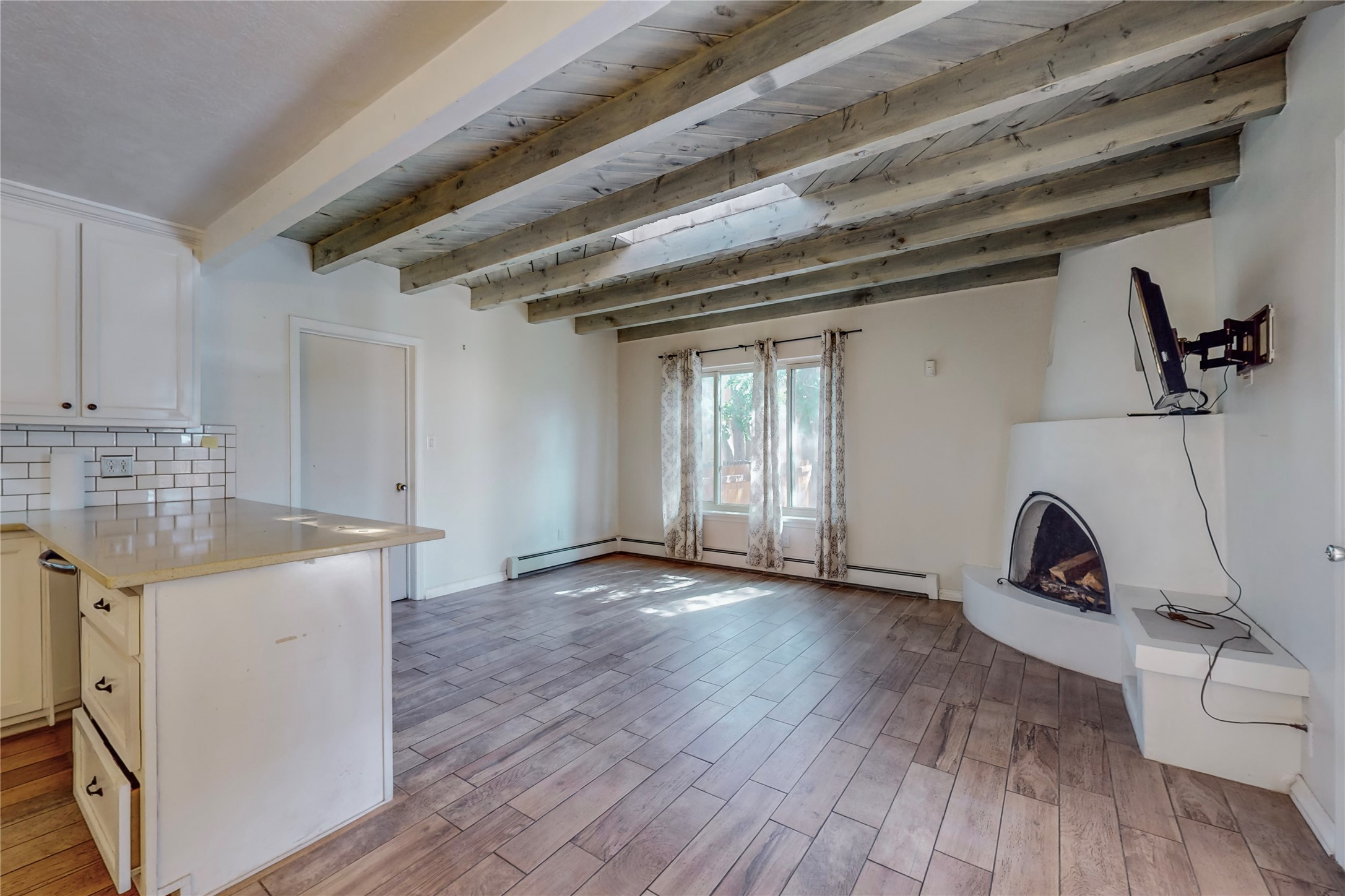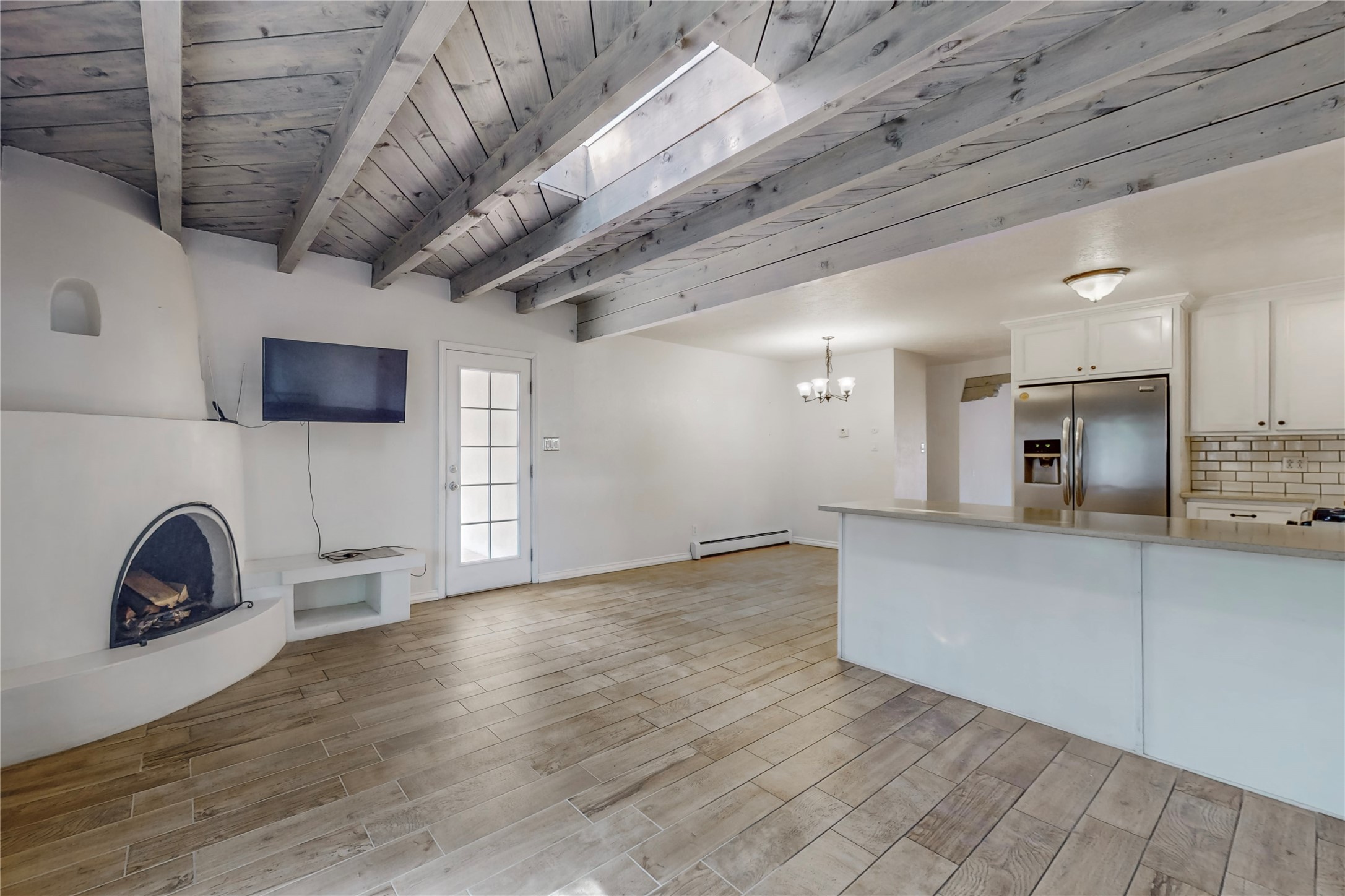 Surprisingly private location in Pueblos de Rodeo, a quiet backwater subdivision of Santa Fe. This lovely light home shaded by tall trees, has three bedrooms, two full baths with tile floors and lots of windows. There is a sunken den area separated from the main living area ideal for quiet meditation or reading. The family room with kiva fireplace for cheery winter nights is open to the kitchen and dining areas flows to an expansive deck and big privately fenced back yard. A large 2 car garage sits back off the road allowing for extra parking. It is conveniently close to recreation centers and lots of shopping areas, parks and trails.