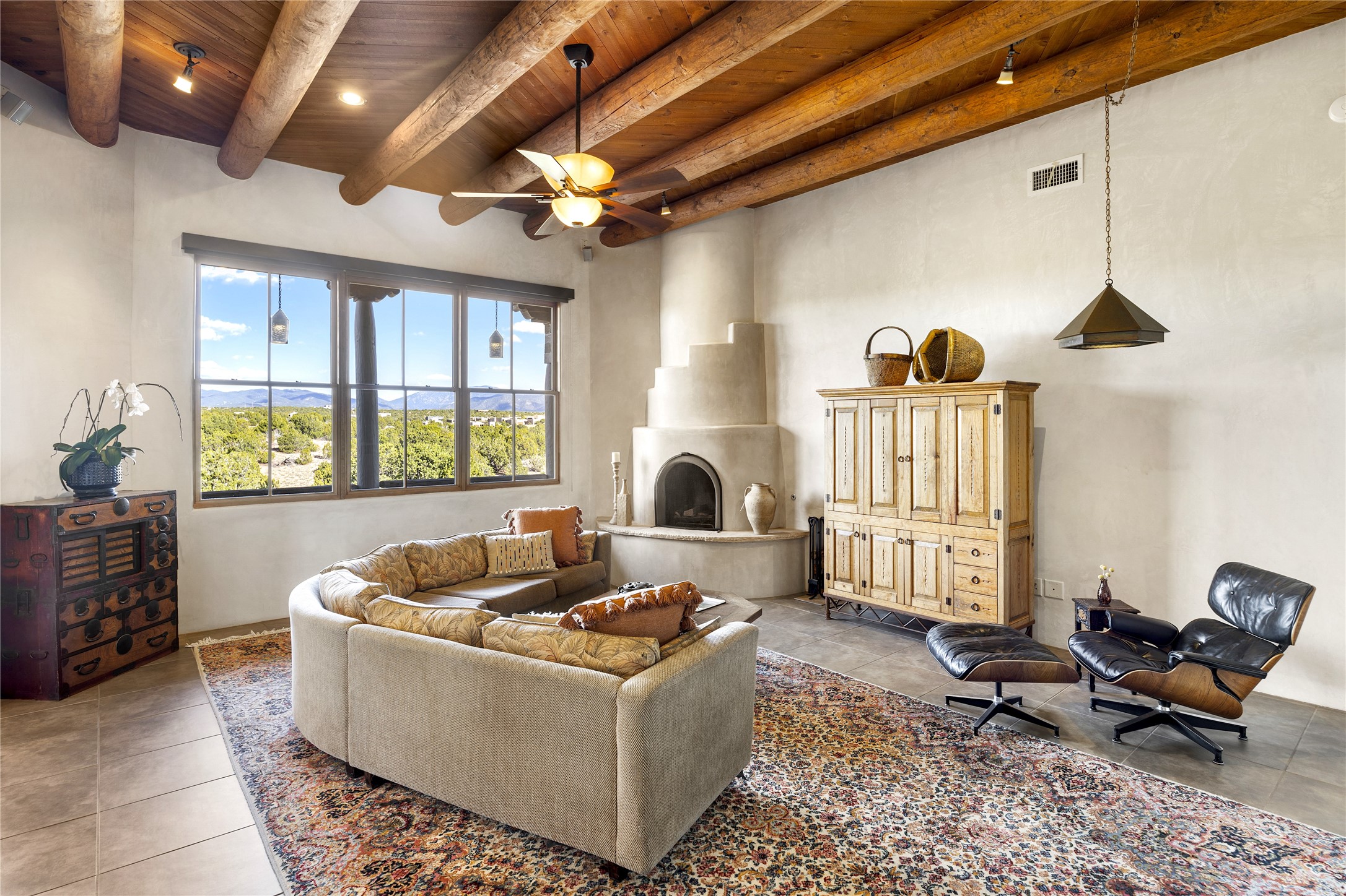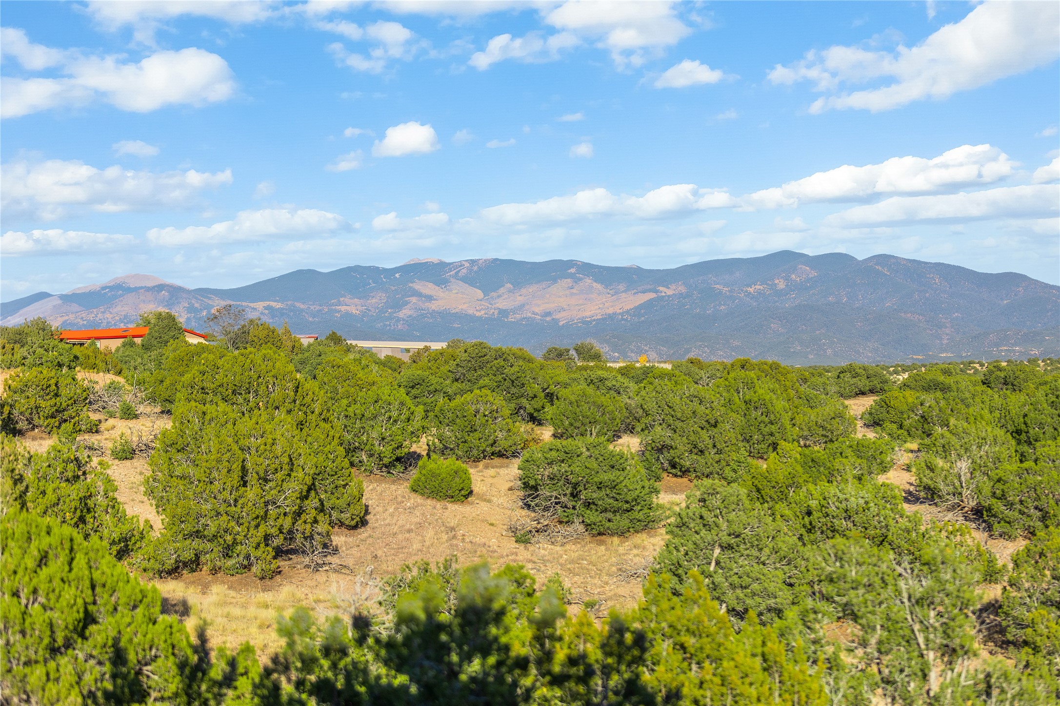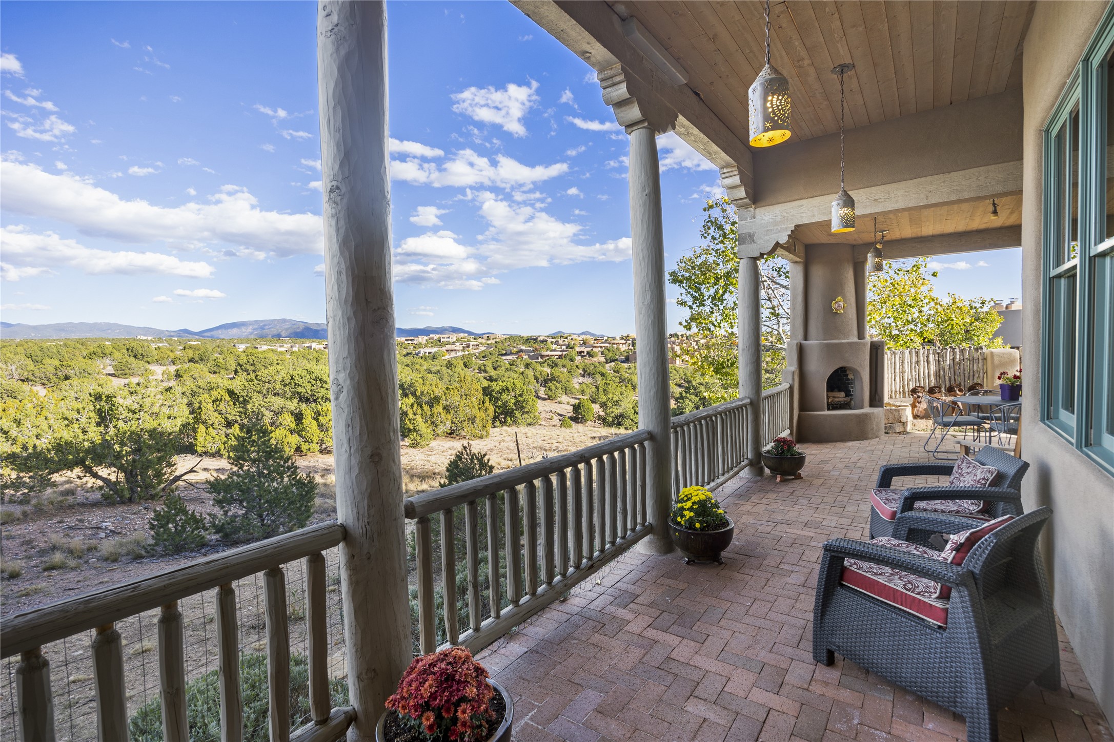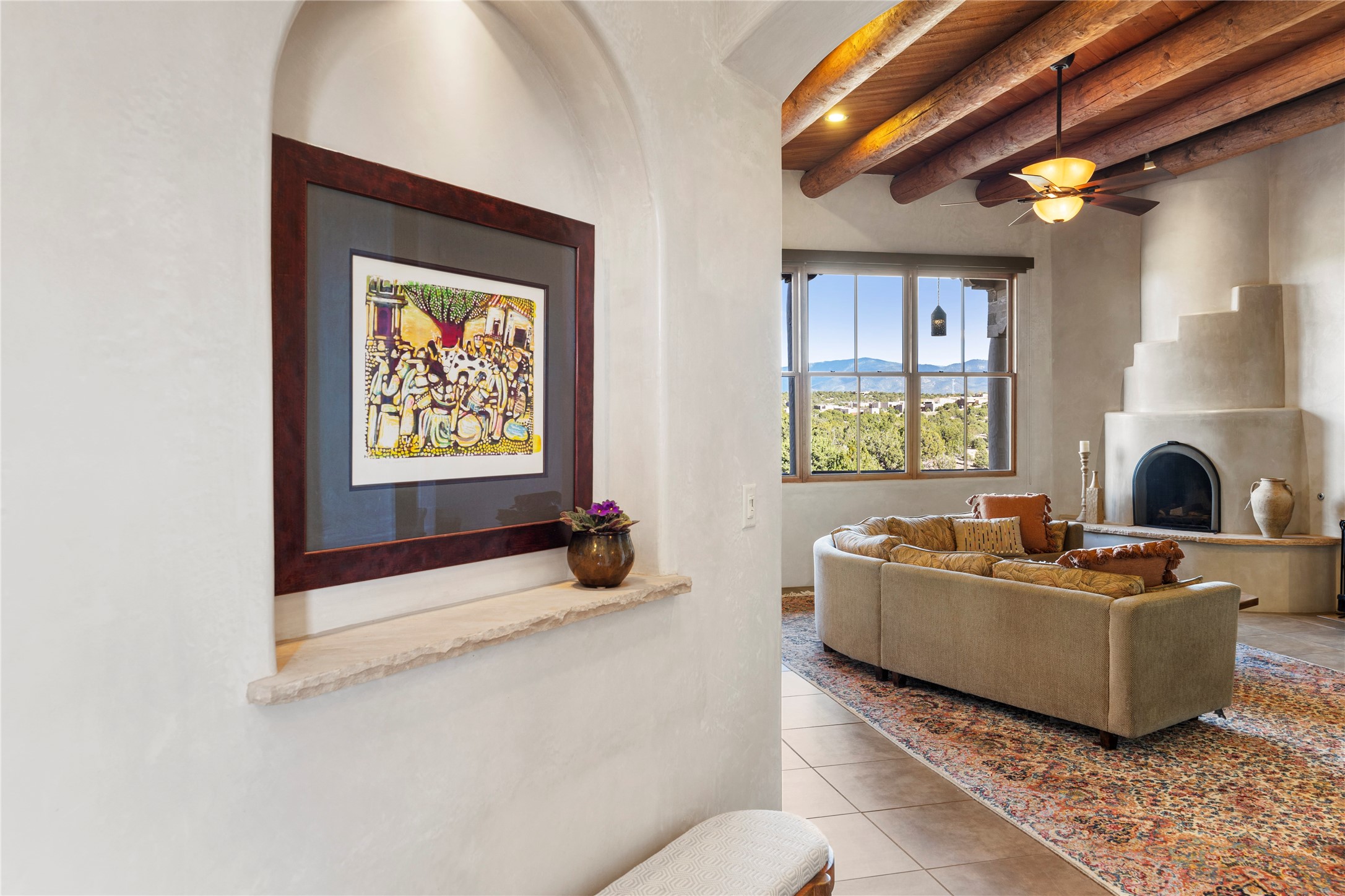 Vast views of the Sangre de Cristo Mountains are showcased throughout this single-level, one-owner, custom home. The gracious flow of the floor plan revolves around the open living spaces and provides separation between the primary and guest suites both with mountain views. The spacious & efficient kitchen enjoys warm wood cabinetry, a dedicated pantry and center island and other thoughtful details such as a raised dishwasher. Distinctive architectural finishes include arched doorways and nichos, wide hallways, plaster walls, beamed ceilings, and skylights. The primary suite includes a gas fireplace, dual vanity, walk-in shower, soaking tub, and large walk-in closet conveniently attached to the laundry room. The office/den functions as an overflow guest or third bedroom with its own private entrance and adjacent 3/4 bath. Delightful, low maintenance outdoor spaces encompass a west-facing landscaped courtyard, a view portal with a kiva fireplace, and an enclosed side yard for pets and gardening. A quiet, peaceful location within the wonderful community of Aldea offering tennis, pickle ball and basketball courts, along with miles of hiking trails through 200 acres of open space.