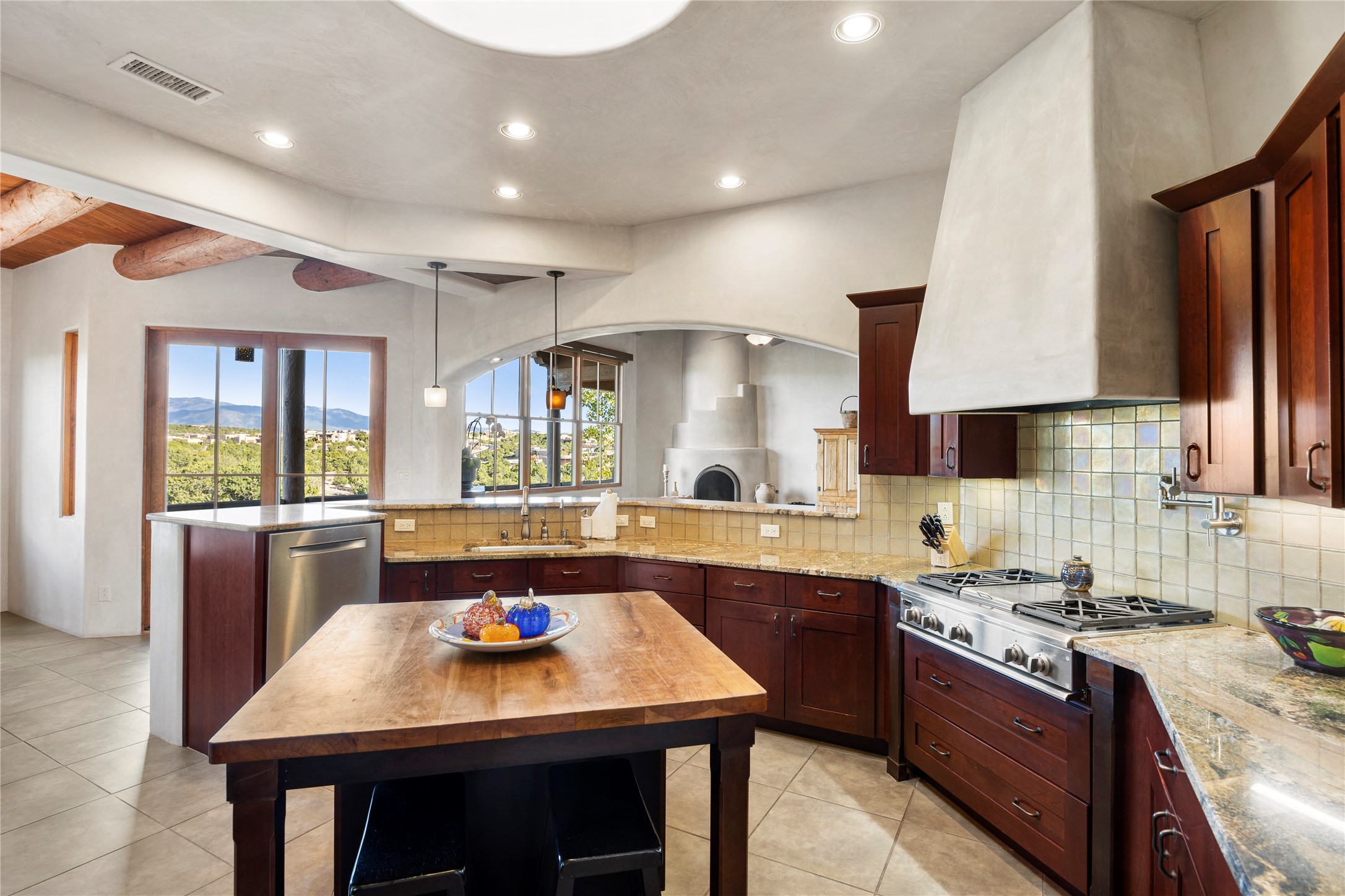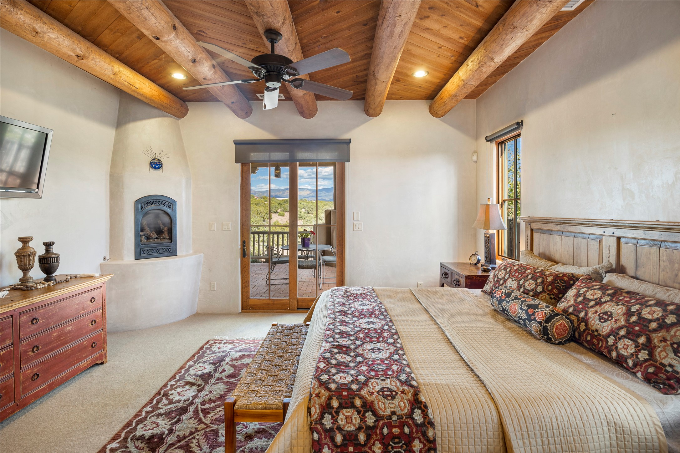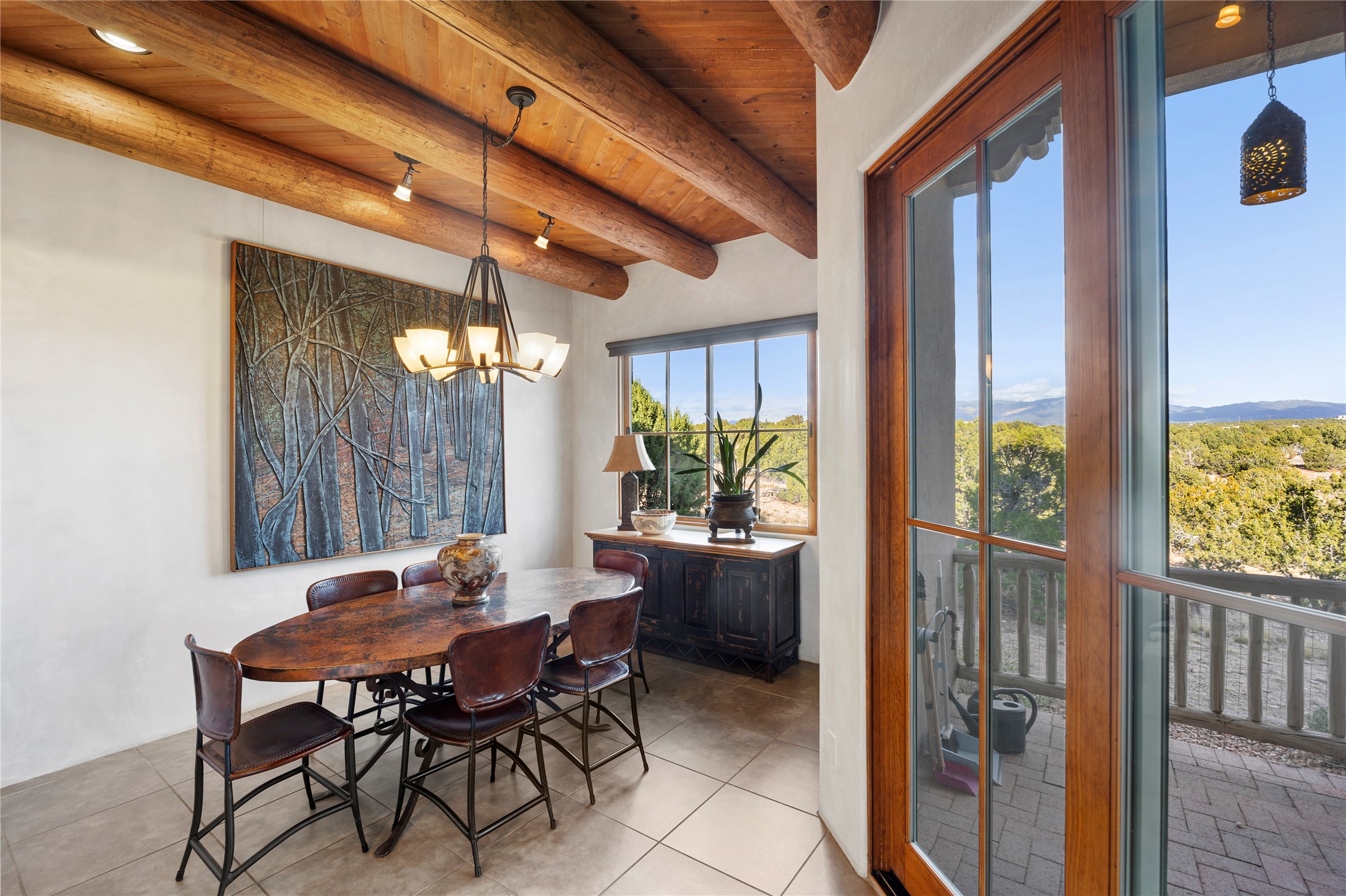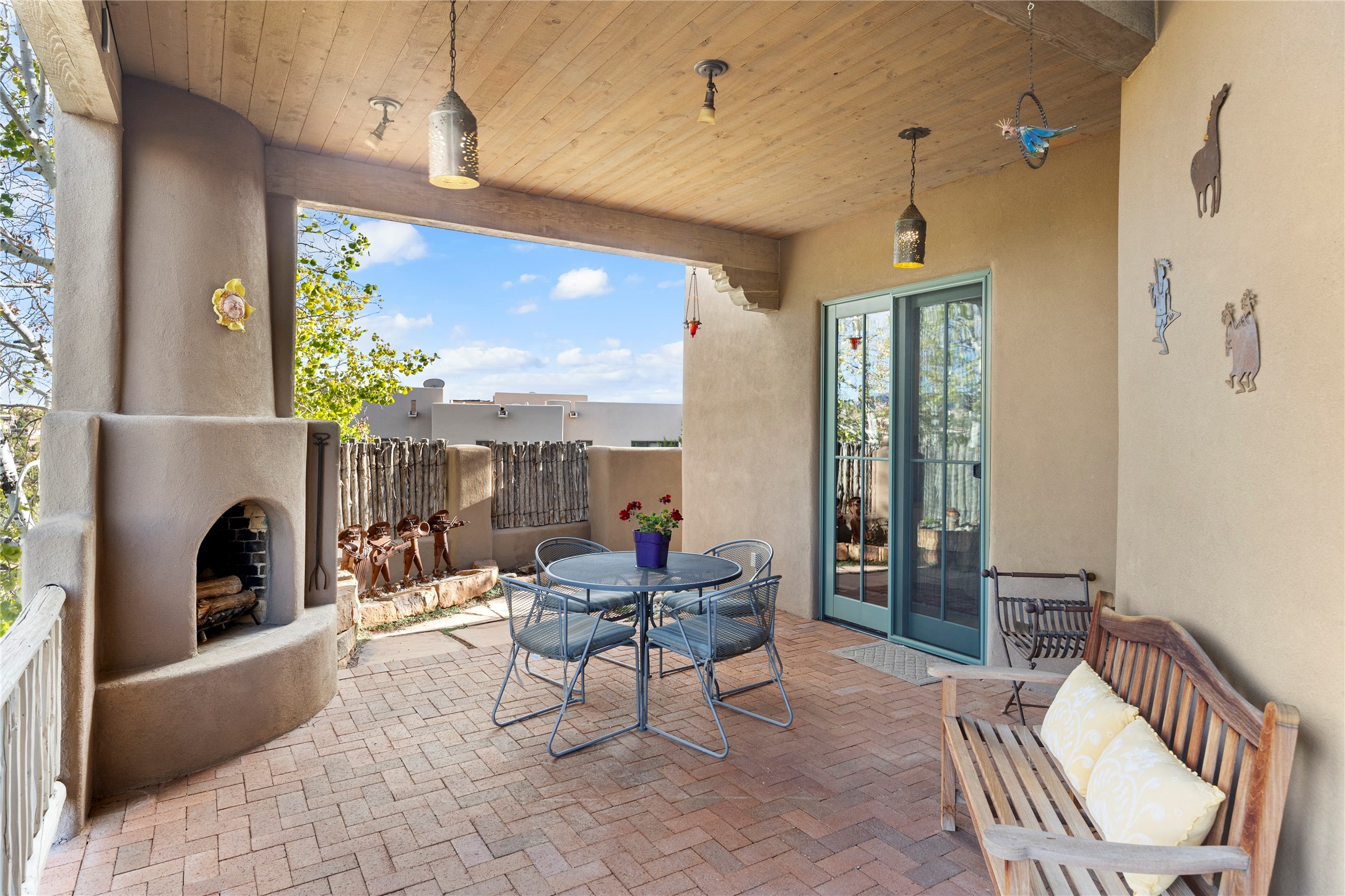 Vast views of the Sangre de Cristo Mountains are showcased throughout this single-level, one-owner, custom home. The gracious flow of the floor plan revolves around the open living spaces and provides separation between the primary and guest suites both with mountain views. The spacious & efficient kitchen enjoys warm wood cabinetry, a dedicated pantry and center island and other thoughtful details such as a raised dishwasher. Distinctive architectural finishes include arched doorways and nichos, wide hallways, plaster walls, beamed ceilings, and skylights. The primary suite includes a gas fireplace, dual vanity, walk-in shower, soaking tub, and large walk-in closet conveniently attached to the laundry room. The office/den functions as an overflow guest or third bedroom with its own private entrance and adjacent 3/4 bath. Delightful, low maintenance outdoor spaces encompass a west-facing landscaped courtyard, a view portal with a kiva fireplace, and an enclosed side yard for pets and gardening. A quiet, peaceful location within the wonderful community of Aldea offering tennis, pickle ball and basketball courts, along with miles of hiking trails through 200 acres of open space.