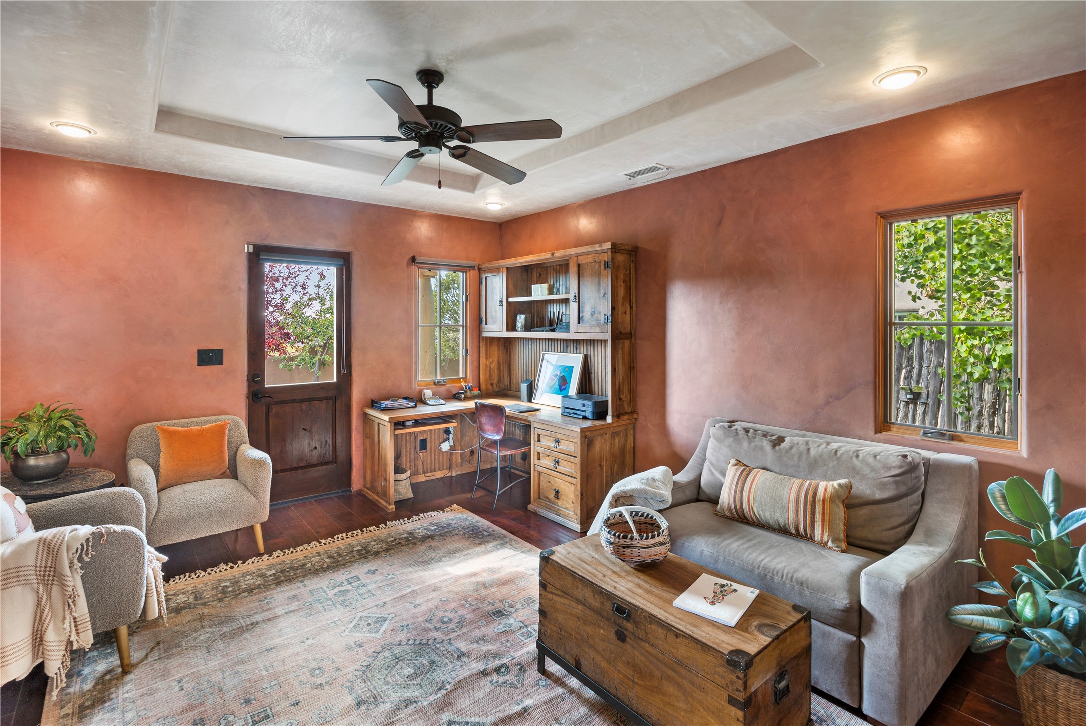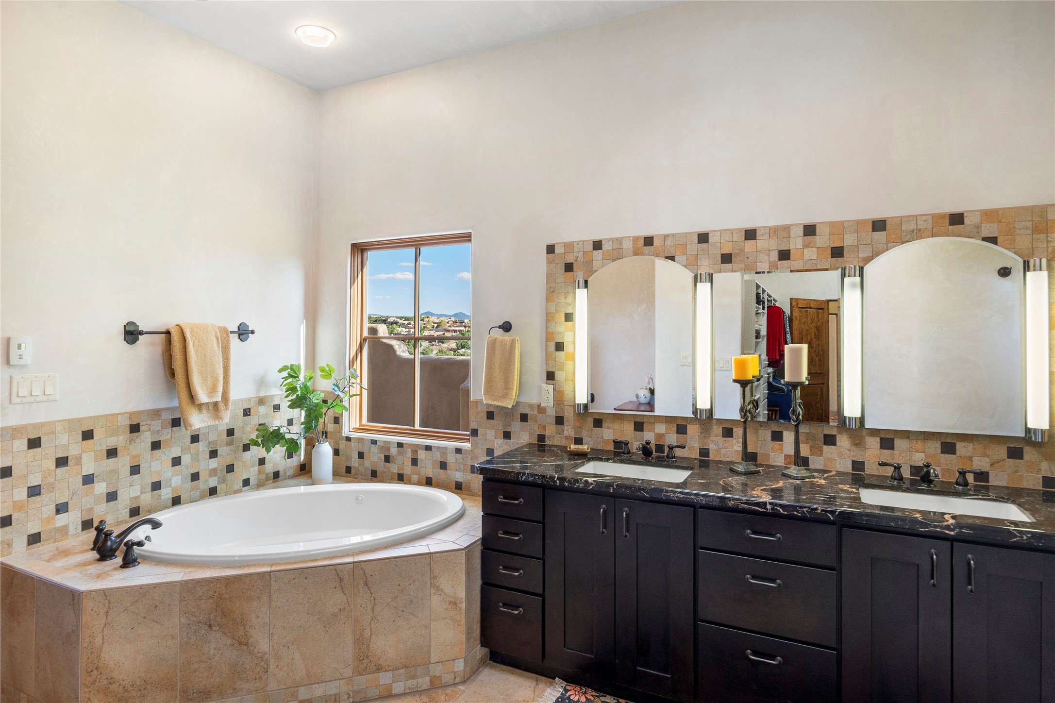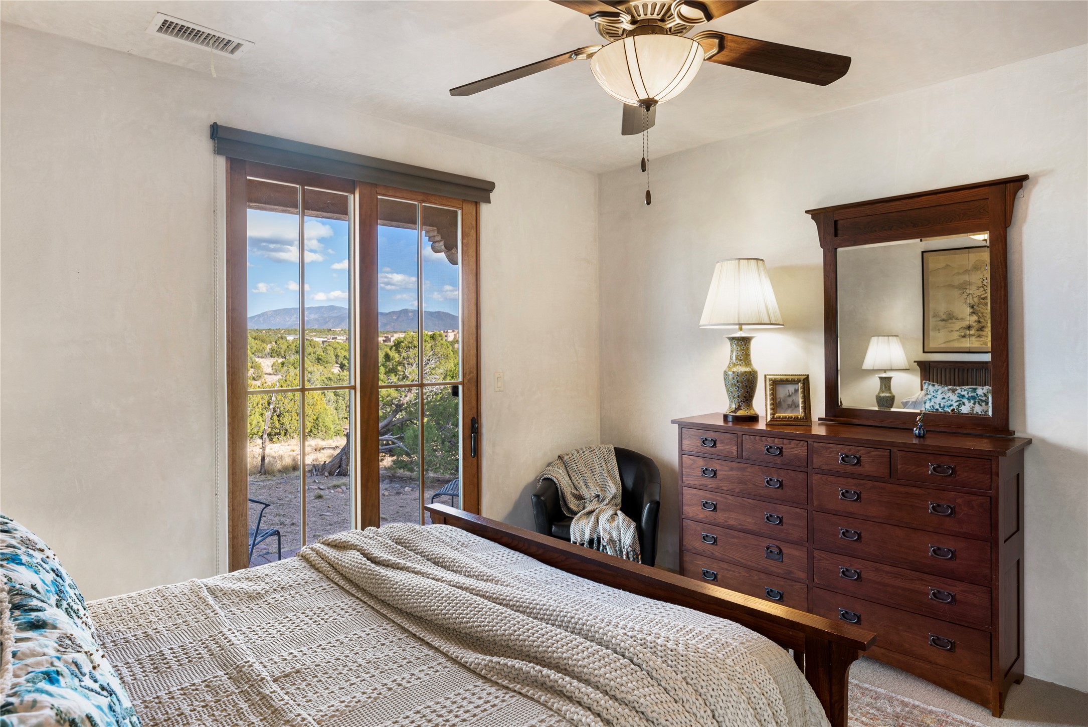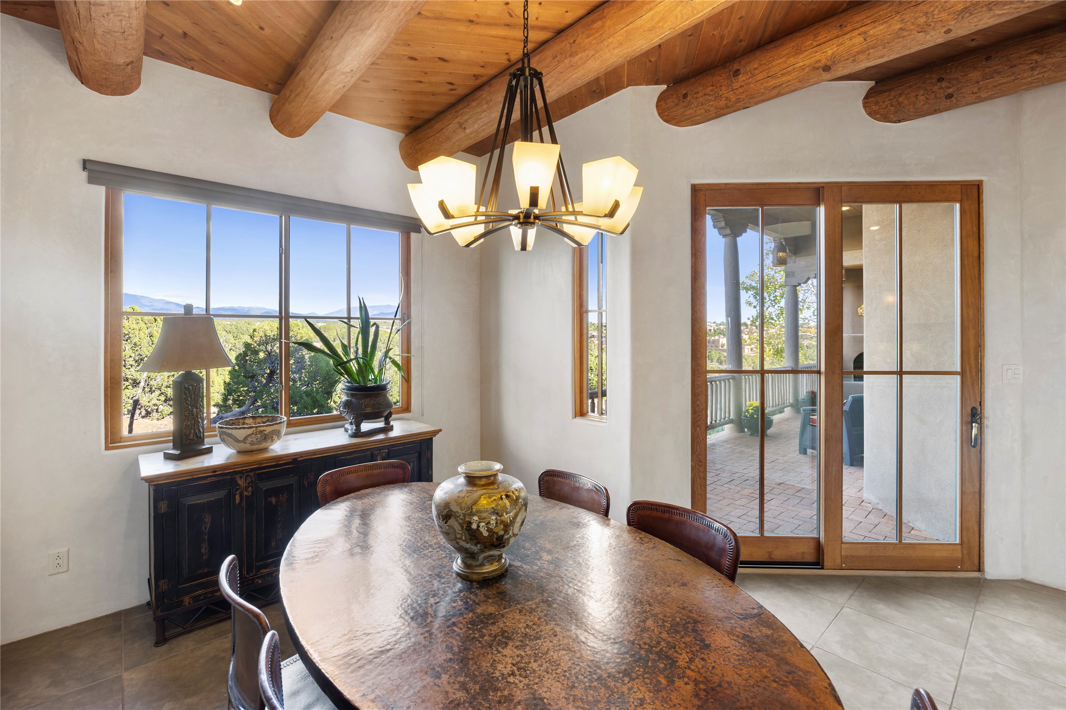 Vast views of the Sangre de Cristo Mountains are showcased throughout this single-level, one-owner, custom home. The gracious flow of the floor plan revolves around the open living spaces and provides separation between the primary and guest suites both with mountain views. The spacious & efficient kitchen enjoys warm wood cabinetry, a dedicated pantry and center island and other thoughtful details such as a raised dishwasher. Distinctive architectural finishes include arched doorways and nichos, wide hallways, plaster walls, beamed ceilings, and skylights. The primary suite includes a gas fireplace, dual vanity, walk-in shower, soaking tub, and large walk-in closet conveniently attached to the laundry room. The office/den functions as an overflow guest or third bedroom with its own private entrance and adjacent 3/4 bath. Delightful, low maintenance outdoor spaces encompass a west-facing landscaped courtyard, a view portal with a kiva fireplace, and an enclosed side yard for pets and gardening. A quiet, peaceful location within the wonderful community of Aldea offering tennis, pickle ball and basketball courts, along with miles of hiking trails through 200 acres of open space.