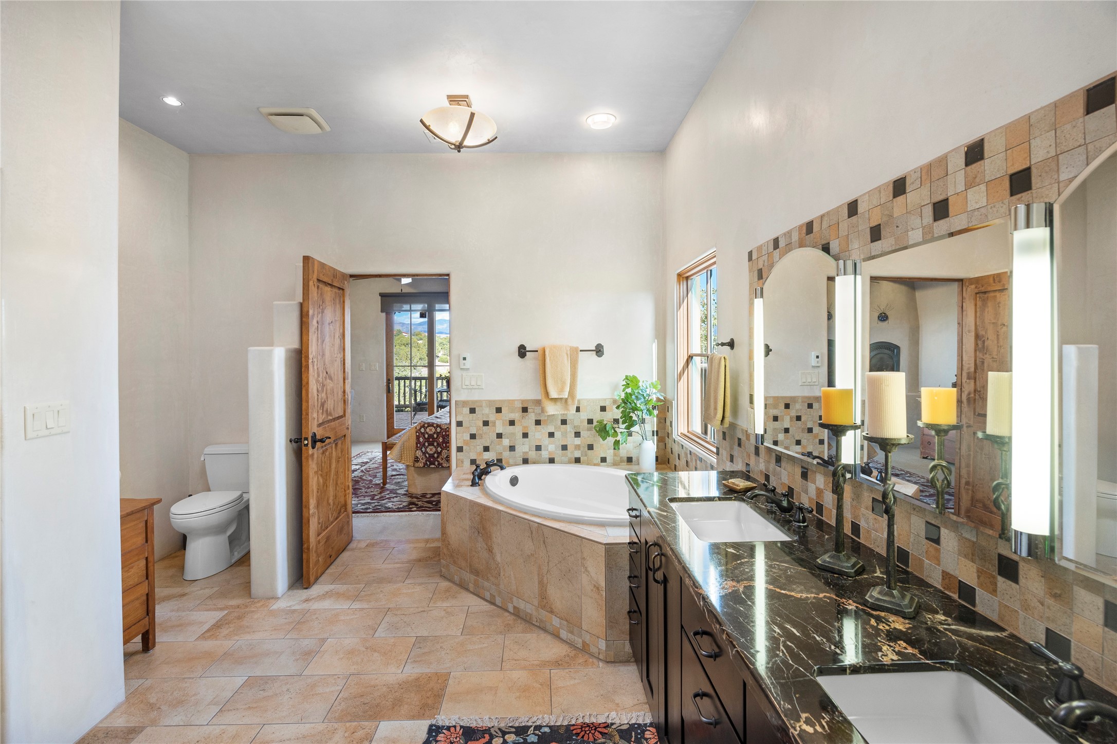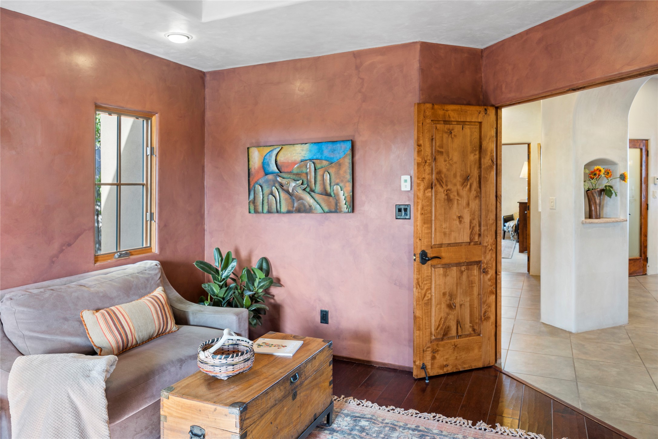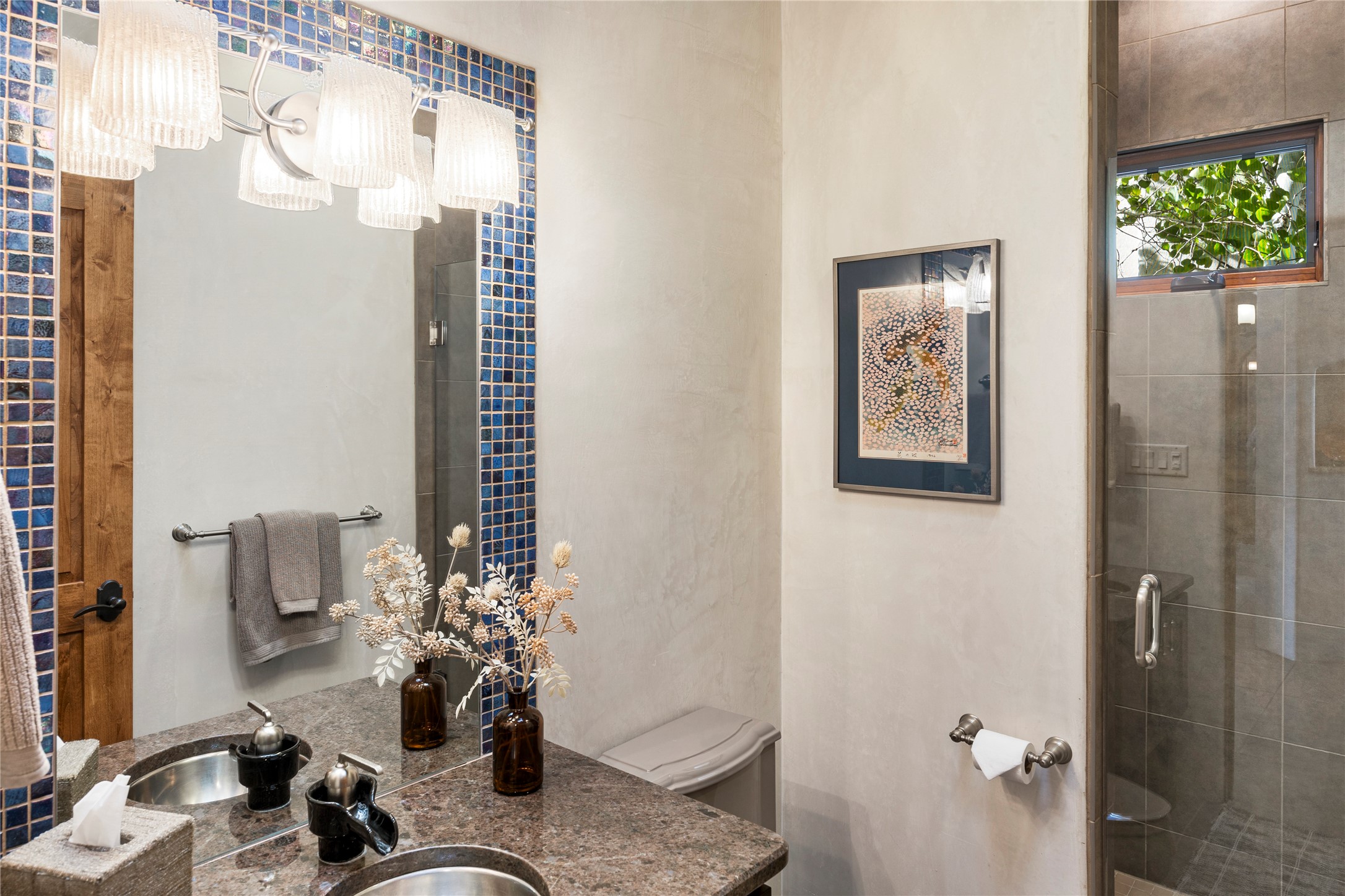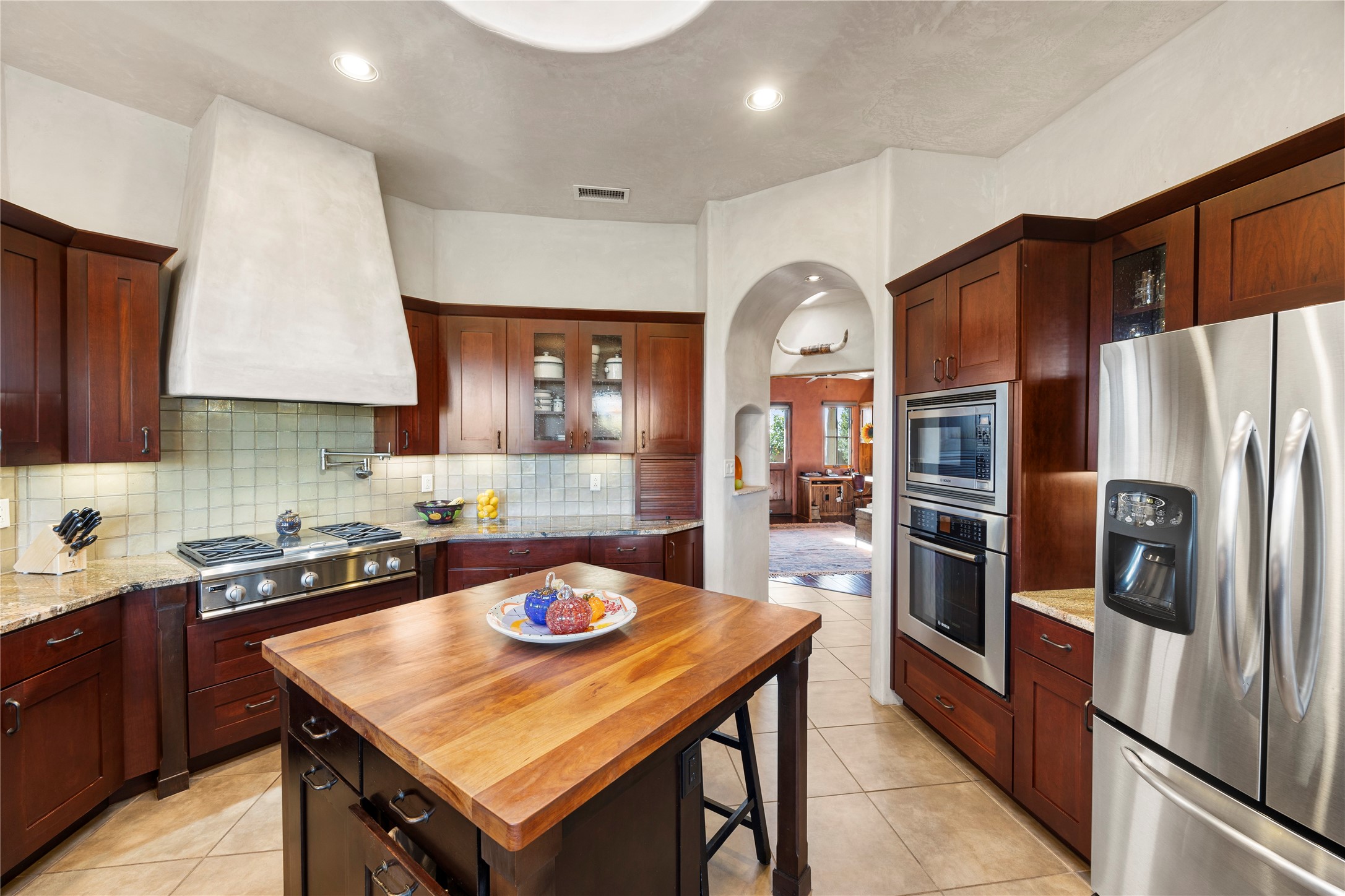 Vast views of the Sangre de Cristo Mountains are showcased throughout this single-level, one-owner, custom home. The gracious flow of the floor plan revolves around the open living spaces and provides separation between the primary and guest suites both with mountain views. The spacious & efficient kitchen enjoys warm wood cabinetry, a dedicated pantry and center island and other thoughtful details such as a raised dishwasher. Distinctive architectural finishes include arched doorways and nichos, wide hallways, plaster walls, beamed ceilings, and skylights. The primary suite includes a gas fireplace, dual vanity, walk-in shower, soaking tub, and large walk-in closet conveniently attached to the laundry room. The office/den functions as an overflow guest or third bedroom with its own private entrance and adjacent 3/4 bath. Delightful, low maintenance outdoor spaces encompass a west-facing landscaped courtyard, a view portal with a kiva fireplace, and an enclosed side yard for pets and gardening. A quiet, peaceful location within the wonderful community of Aldea offering tennis, pickle ball and basketball courts, along with miles of hiking trails through 200 acres of open space.