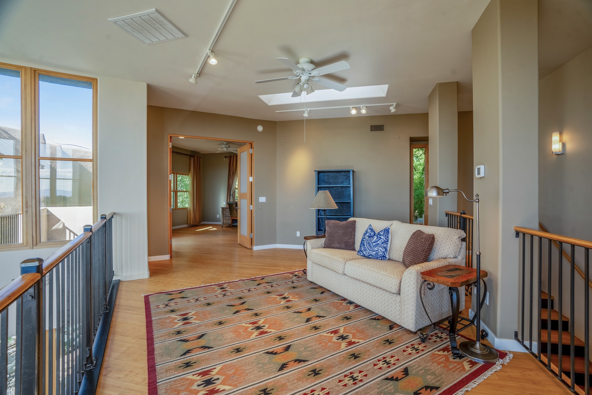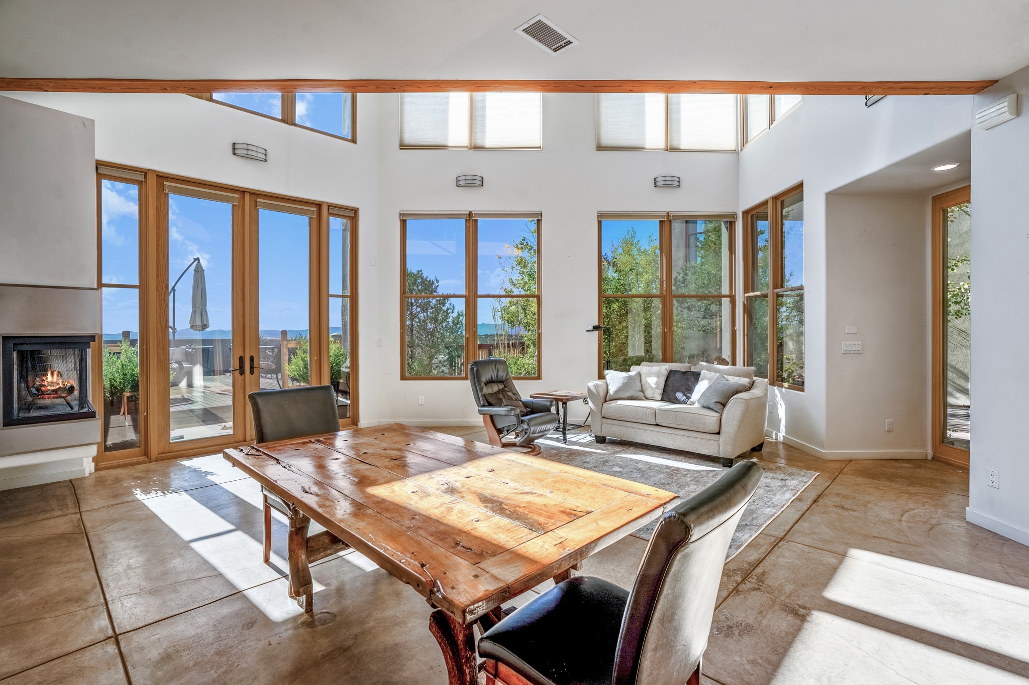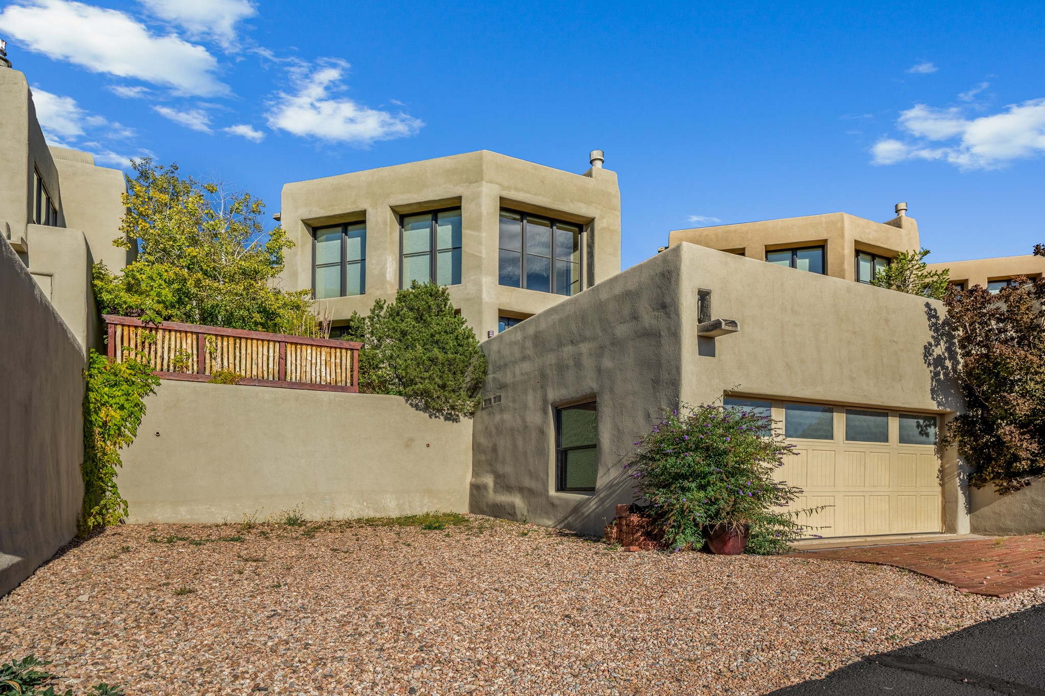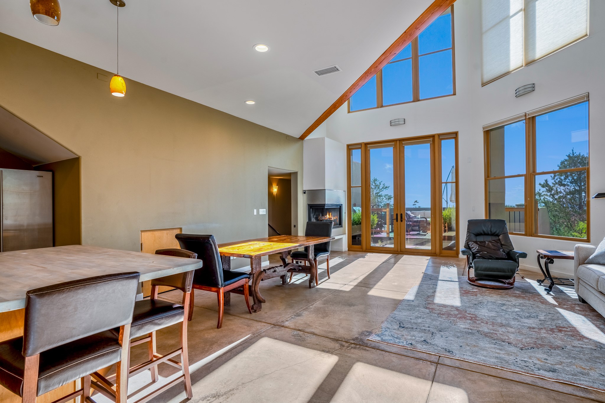 Located within the serene and picturesque community of Aldea De Santa Fe. This captivating residence offers unobstructed sunset views. The open-concept living space boasts soaring 20-foot ceilings, captivating the very best of a contemporary design. Earthy yet modern finishes throughout. Including, stone, bamboo and concrete floors and a gas burning fireplace. There are custom wood cabinets in the bathrooms that resemble a basket weave and floor to ceiling tile in the showers. The abundance of windows that allows for the New Mexico sun to pour in, creating a warm and inviting atmosphere. The living area is adjacent dining area and perfectly sized kitchen with Wolf range provide the perfect setting for culinary adventures. There is a Primary bedroom suite on the main floor with bamboo floors and a tasteful en-suite bathroom. The upstairs bedroom is generously sized with an en-suite bathroom and a loft area for relaxing and taking in Santa Fe's amazing desert views. In addition to the stylish interior, the home also offers outdoor spaces that are equally inviting. Enter from the street onto a private enclosed courtyard and you can enjoy entertaining on the deck off of the living room with those in your face views. The 2-car garage offers convenience and storage space, while the radiant heating and central air conditioning ensure year-round comfort. Aldea De Santa Fe offers a community center, parks, 13 miles of walking trails, and a strong sense of community. Enjoy the best of both worlds, with easy access to Santa Fe's vibrant cultural scene, shopping, dining, and outdoor recreation. Experience the harmony of modern living in a Southwestern setting. Don't miss the opportunity to make 87 Avenida Frijoles your new Santa Fe retreat.