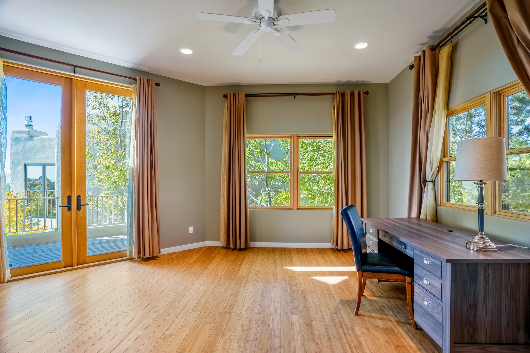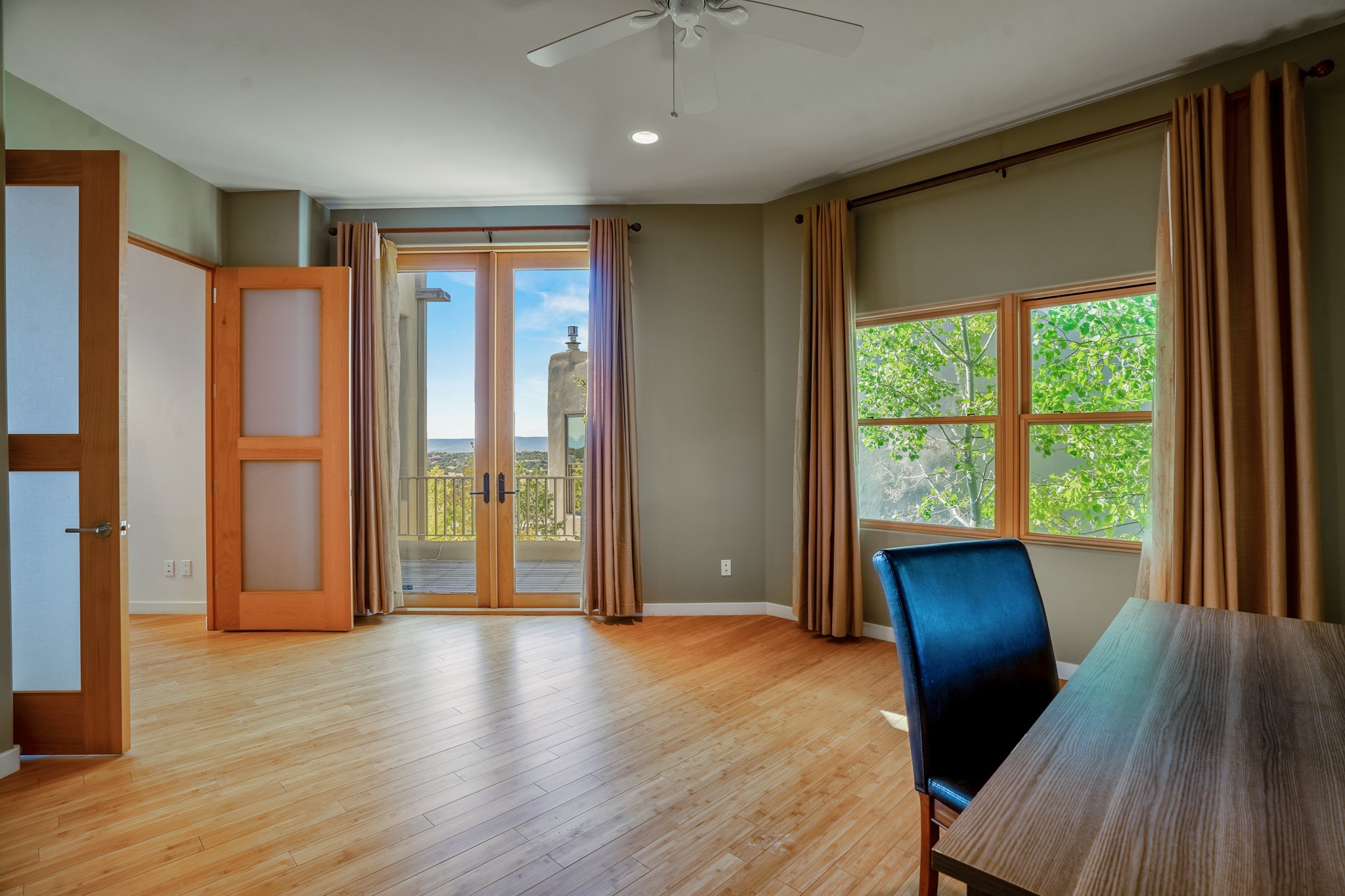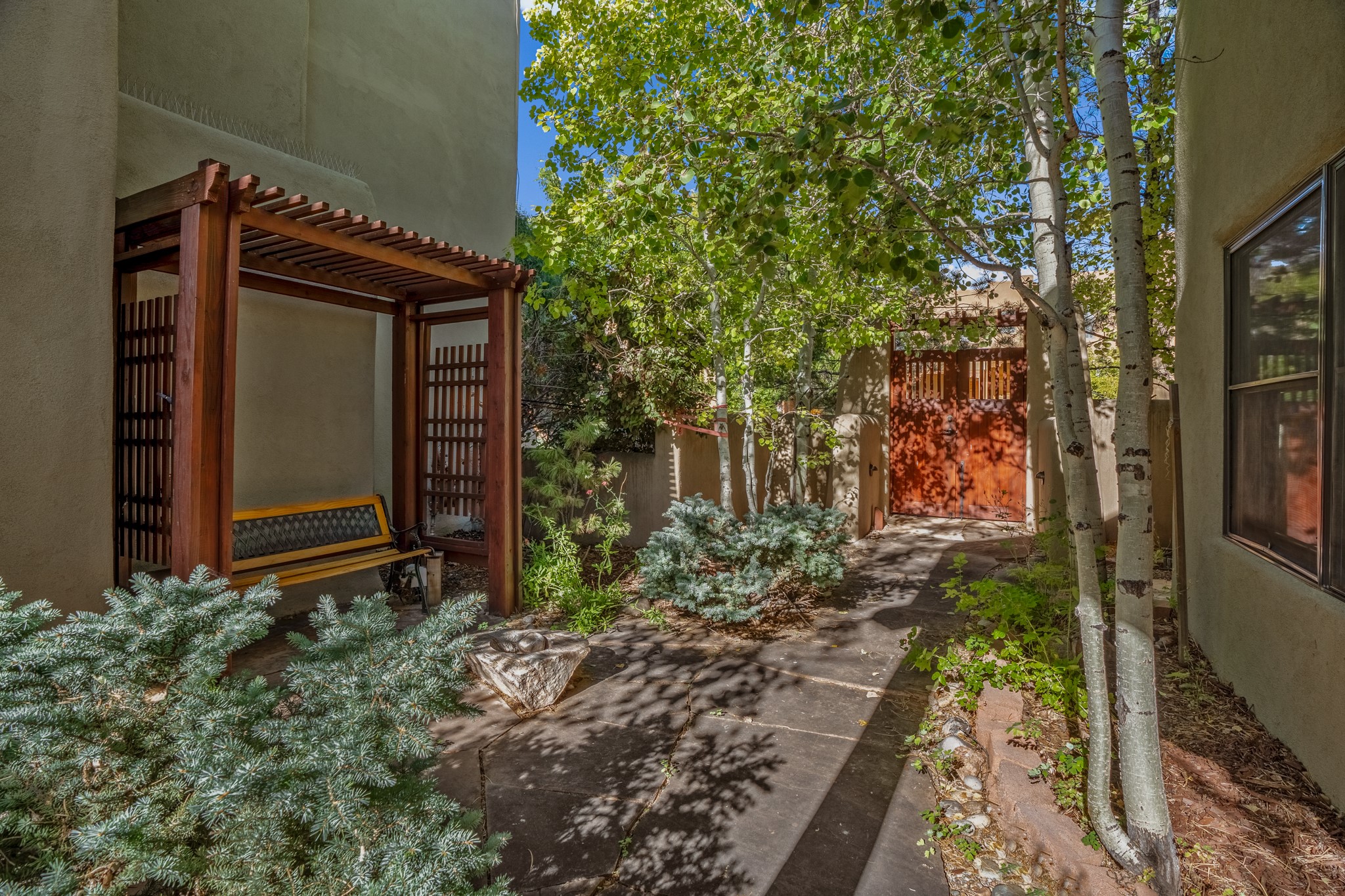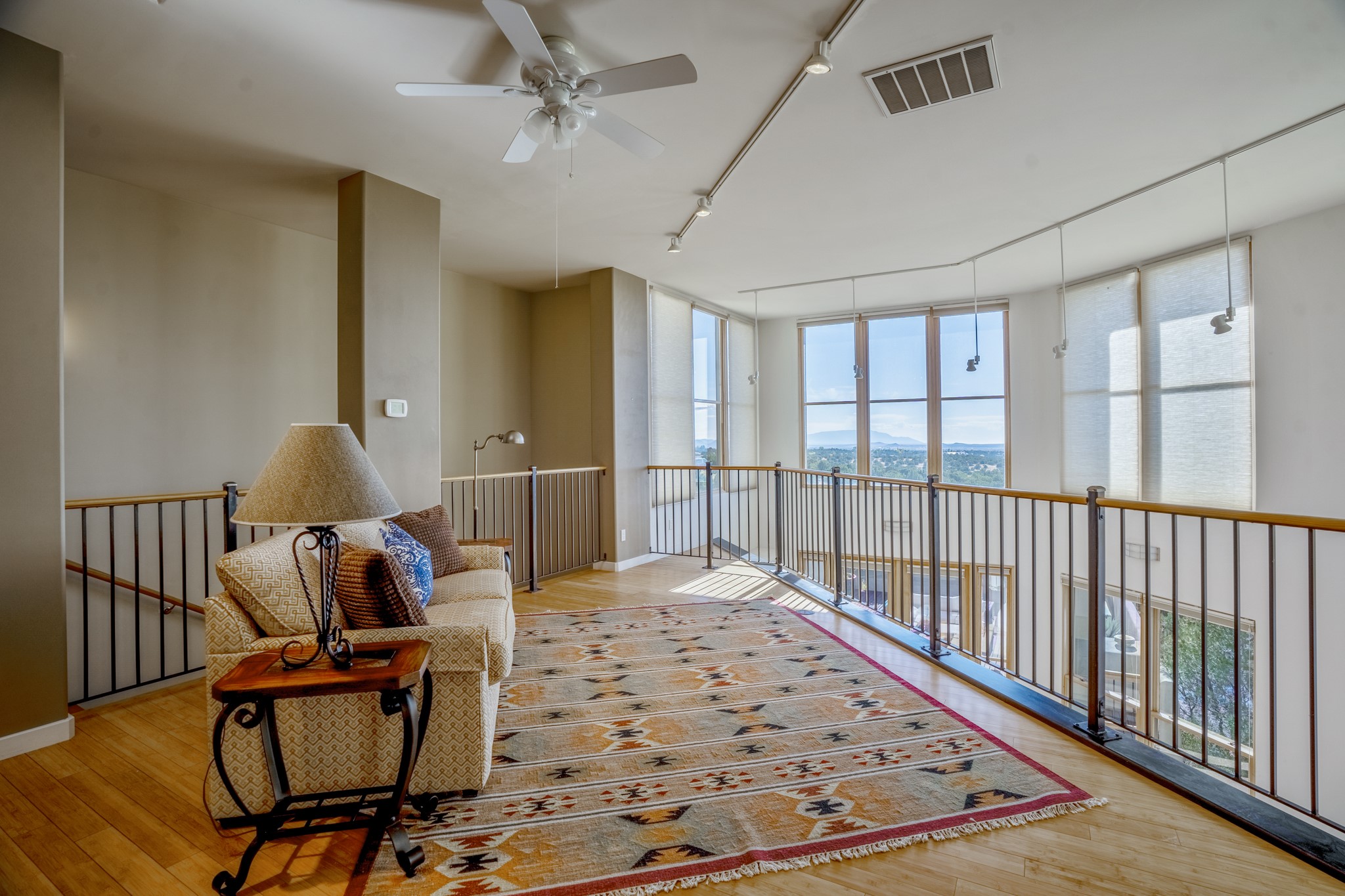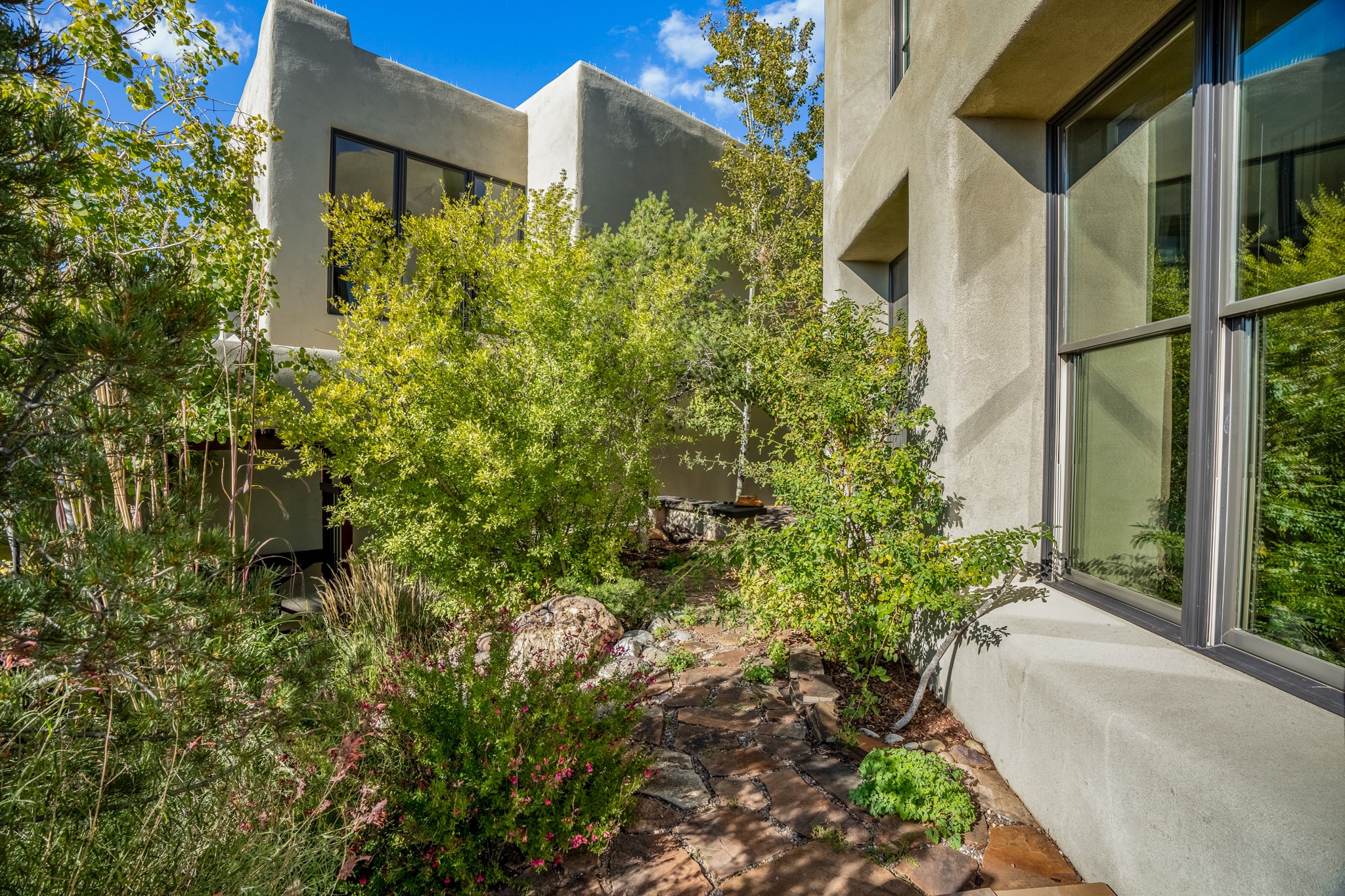 Located within the serene and picturesque community of Aldea De Santa Fe. This captivating residence offers unobstructed sunset views. The open-concept living space boasts soaring 20-foot ceilings, captivating the very best of a contemporary design. Earthy yet modern finishes throughout. Including, stone, bamboo and concrete floors and a gas burning fireplace. There are custom wood cabinets in the bathrooms that resemble a basket weave and floor to ceiling tile in the showers. The abundance of windows that allows for the New Mexico sun to pour in, creating a warm and inviting atmosphere. The living area is adjacent dining area and perfectly sized kitchen with Wolf range provide the perfect setting for culinary adventures. There is a Primary bedroom suite on the main floor with bamboo floors and a tasteful en-suite bathroom. The upstairs bedroom is generously sized with an en-suite bathroom and a loft area for relaxing and taking in Santa Fe's amazing desert views. In addition to the stylish interior, the home also offers outdoor spaces that are equally inviting. Enter from the street onto a private enclosed courtyard and you can enjoy entertaining on the deck off of the living room with those in your face views. The 2-car garage offers convenience and storage space, while the radiant heating and central air conditioning ensure year-round comfort. Aldea De Santa Fe offers a community center, parks, 13 miles of walking trails, and a strong sense of community. Enjoy the best of both worlds, with easy access to Santa Fe's vibrant cultural scene, shopping, dining, and outdoor recreation. Experience the harmony of modern living in a Southwestern setting. Don't miss the opportunity to make 87 Avenida Frijoles your new Santa Fe retreat.