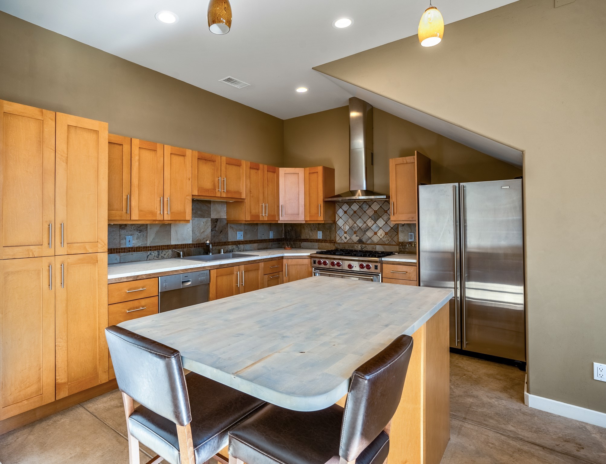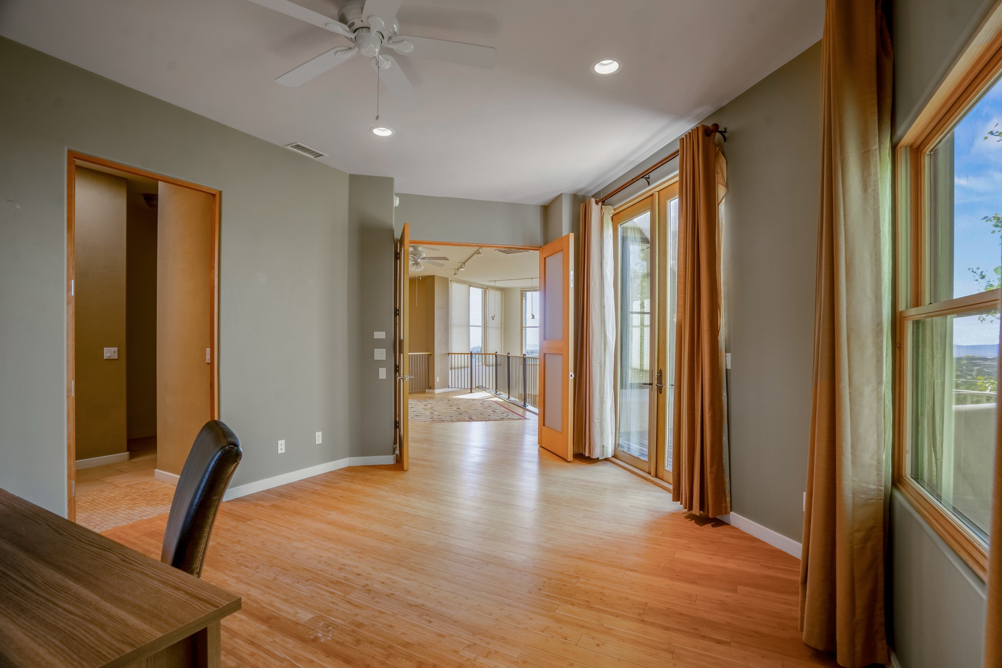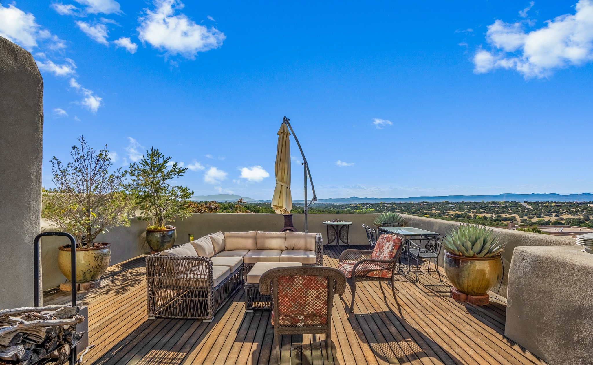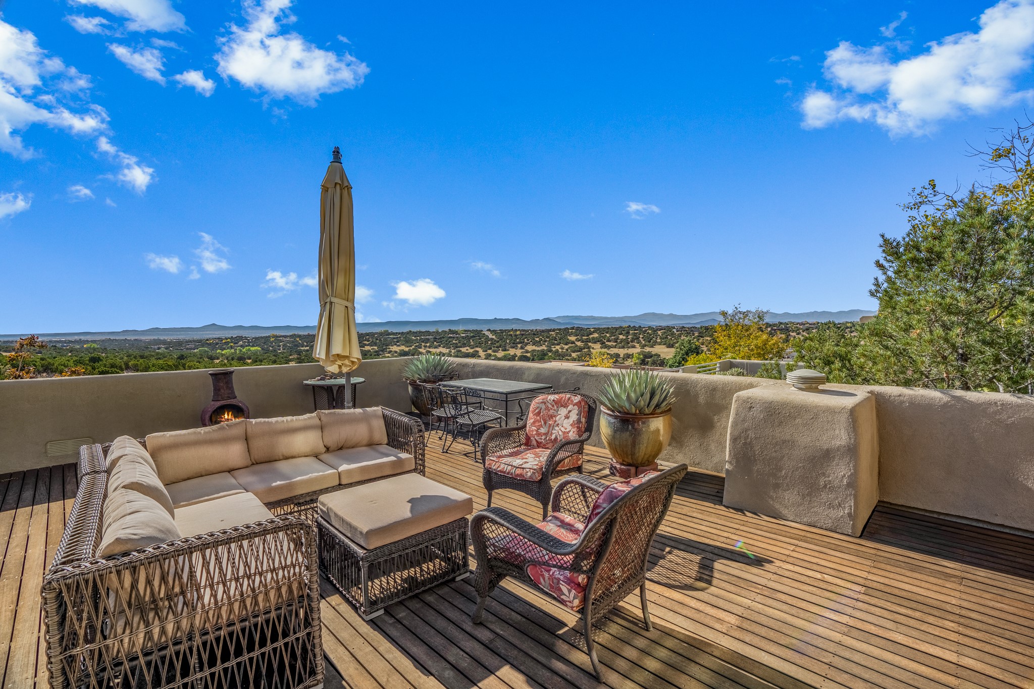 Located within the serene and picturesque community of Aldea De Santa Fe. This captivating residence offers unobstructed sunset views. The open-concept living space boasts soaring 20-foot ceilings, captivating the very best of a contemporary design. Earthy yet modern finishes throughout. Including, stone, bamboo and concrete floors and a gas burning fireplace. There are custom wood cabinets in the bathrooms that resemble a basket weave and floor to ceiling tile in the showers. The abundance of windows that allows for the New Mexico sun to pour in, creating a warm and inviting atmosphere. The living area is adjacent dining area and perfectly sized kitchen with Wolf range provide the perfect setting for culinary adventures. There is a Primary bedroom suite on the main floor with bamboo floors and a tasteful en-suite bathroom. The upstairs bedroom is generously sized with an en-suite bathroom and a loft area for relaxing and taking in Santa Fe's amazing desert views. In addition to the stylish interior, the home also offers outdoor spaces that are equally inviting. Enter from the street onto a private enclosed courtyard and you can enjoy entertaining on the deck off of the living room with those in your face views. The 2-car garage offers convenience and storage space, while the radiant heating and central air conditioning ensure year-round comfort. Aldea De Santa Fe offers a community center, parks, 13 miles of walking trails, and a strong sense of community. Enjoy the best of both worlds, with easy access to Santa Fe's vibrant cultural scene, shopping, dining, and outdoor recreation. Experience the harmony of modern living in a Southwestern setting. Don't miss the opportunity to make 87 Avenida Frijoles your new Santa Fe retreat.