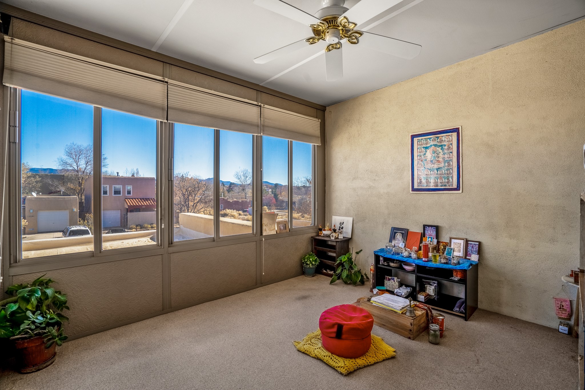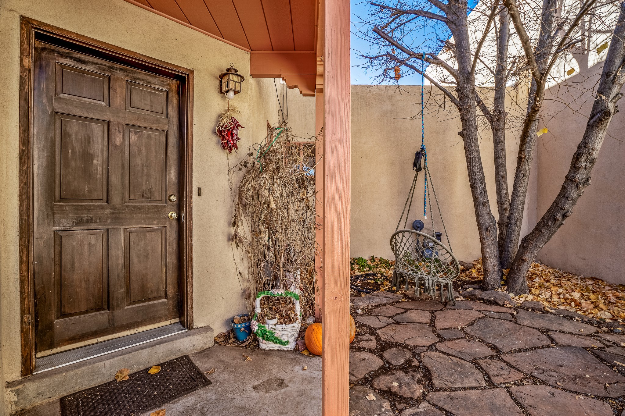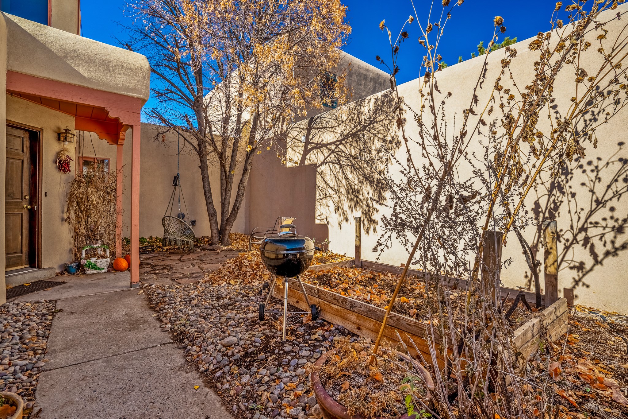 Sweet and charming 2 story, 2 bedroom, 2 bath, 1 car garage home in Plaza de Castillo with mountain views minutes from the Arroyo Chamisos Trail, close to the hospital, amenities and 15 minutes to the Santa Fe Plaza. Enter this gem of a home from the private enclosed and gated front courtyard. On the main level, you will find a bedroom with a full bath, saltillo tile and wood laminate flooring, kitchen with new range and dishwasher, breakfast bar, laundry room with washer and dryer and living room with wood burning fireplace. Upstairs, there is also a bedroom and full bath plus a versatile light and bright bonus room with mountain views perfect as an additional bedroom, office, study, playroom etc. From the living room you can access the cute rear patio with gardens, mature landscaping and sitting area. Features and amenities: Walk-in closet-Plenty of closets/storage-Forced air heat-Wood floor on the stairs-Ceiling fans-Transferrable roof coating warranty until January 2028 and more!